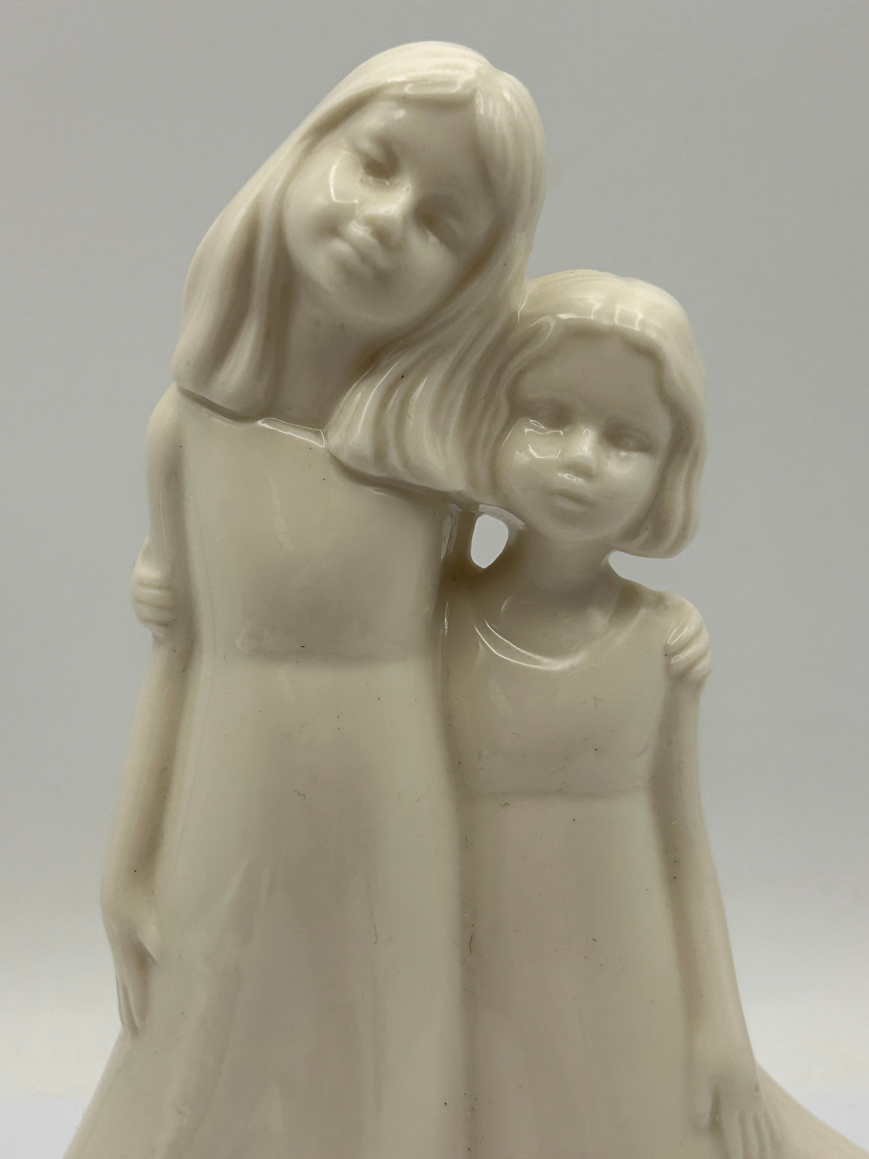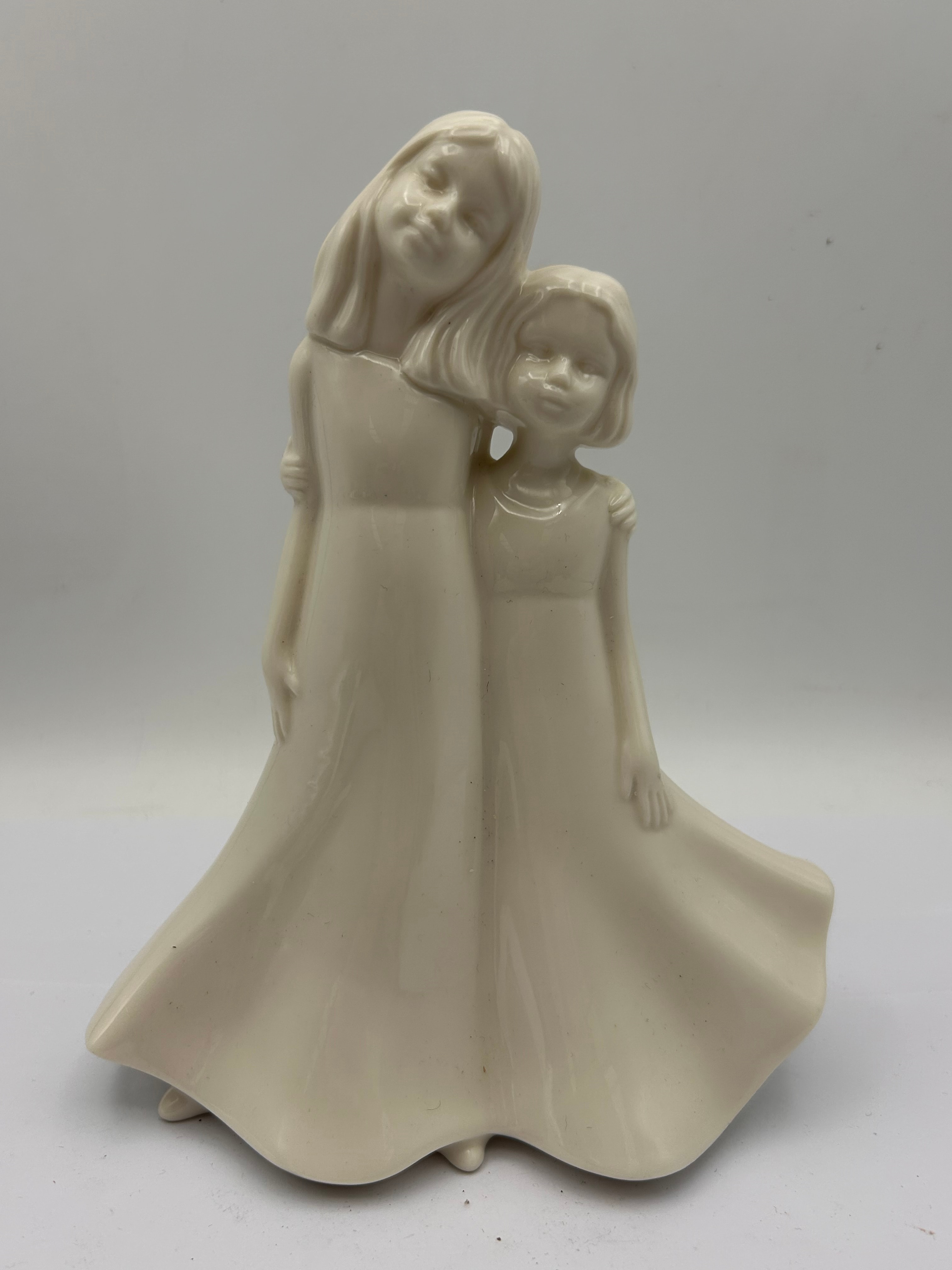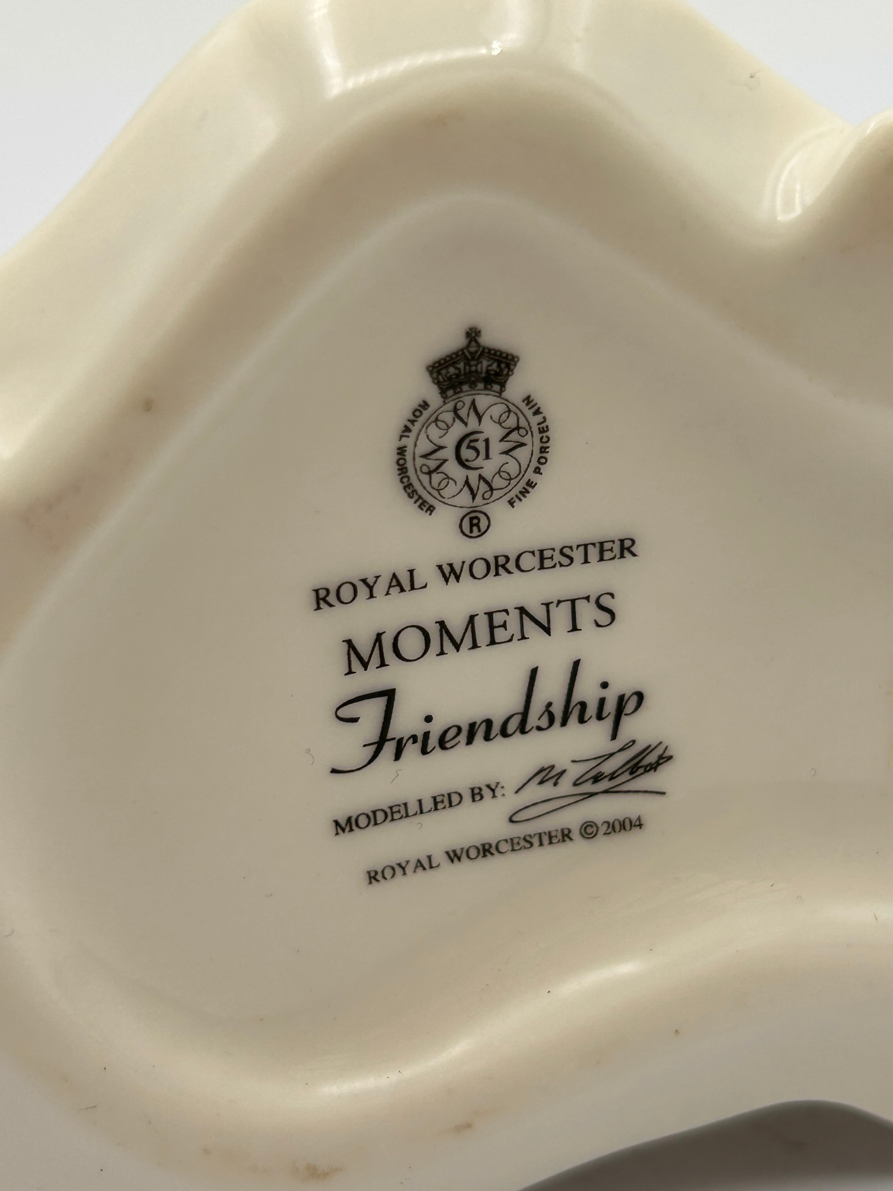 A Royal Worcester ‘Moments’ ‘Friendship’ porcelain figurine, dated 2004. This off-white or cream-colored fine porcelain figurine depicts two young female figures, one appearing slightly older, standing closely with arms around each other in a sentimental style. The base bears a Royal Worcester mark, including a crown logo with “ROYAL WORCESTER FINE PORCELAIN” and the number “61,” and is clearly marked “ROYAL WORCESTER MOMENTS Friendship,” and “MODELLED BY: M. Taltt” (likely M. Talbot).