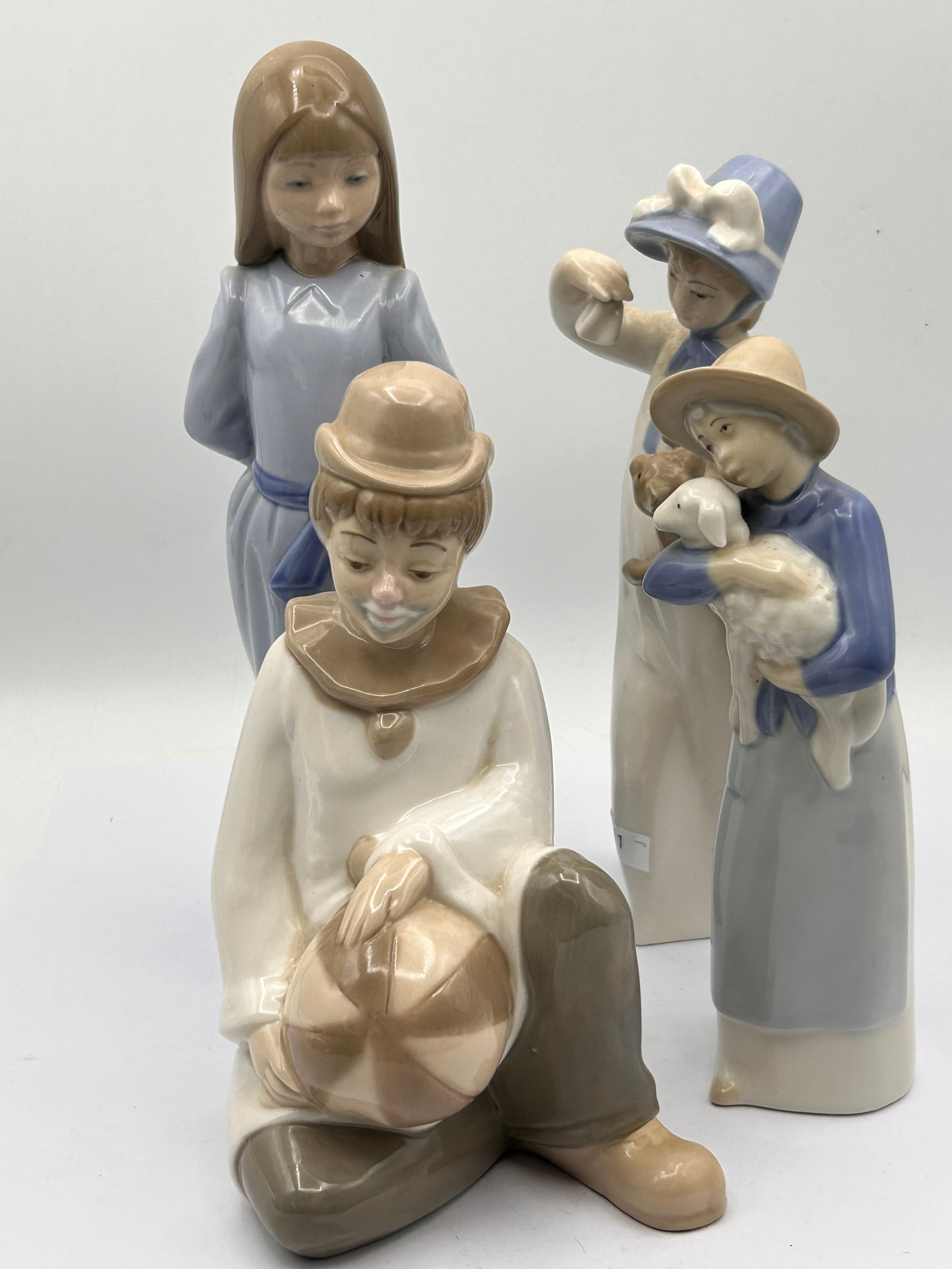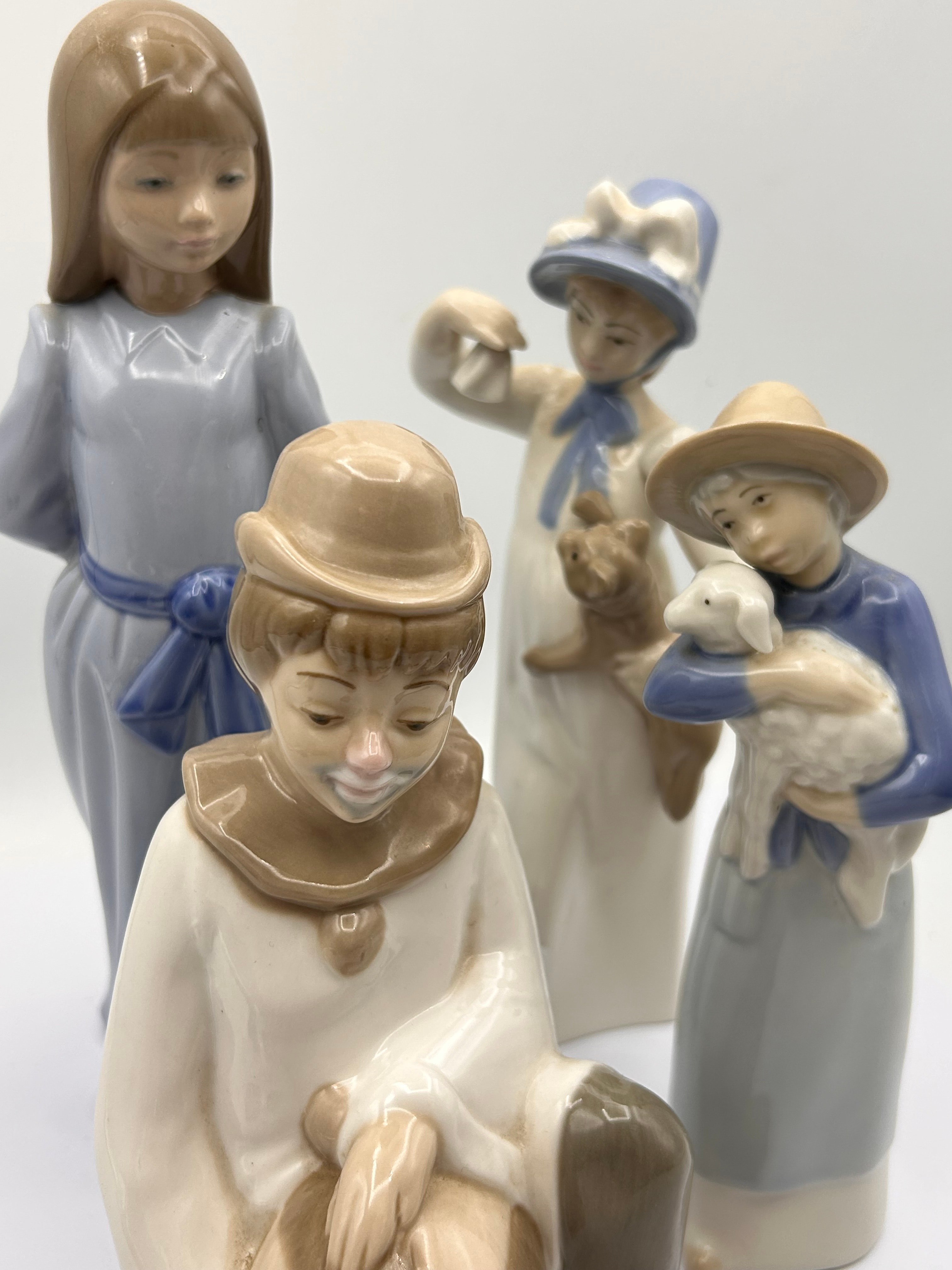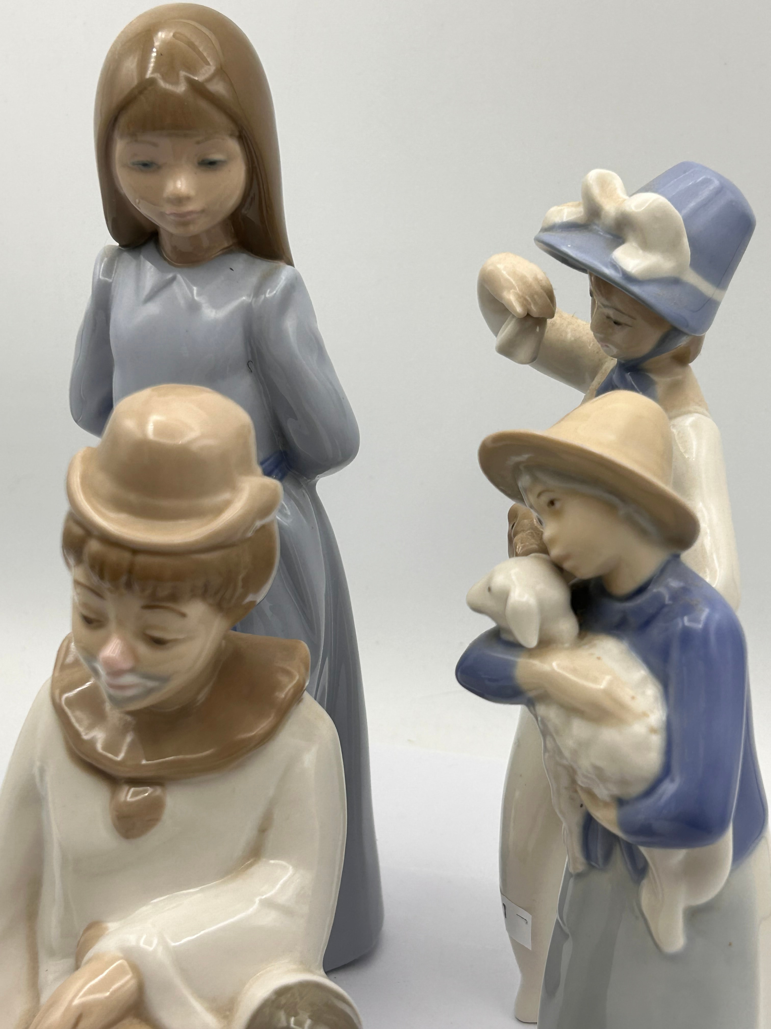 A group of four Spanish porcelain figurines, likely by Lladro or NAO, dating to the mid-to-late 20th century. The collection includes a standing young girl in a blue dress, a seated clown in cream and brown holding a striped ball, a girl in a hat holding a lamb, and another girl in a hat holding a small animal or object. They are characterized by a sentimental style with soft features and a pastel color palette.