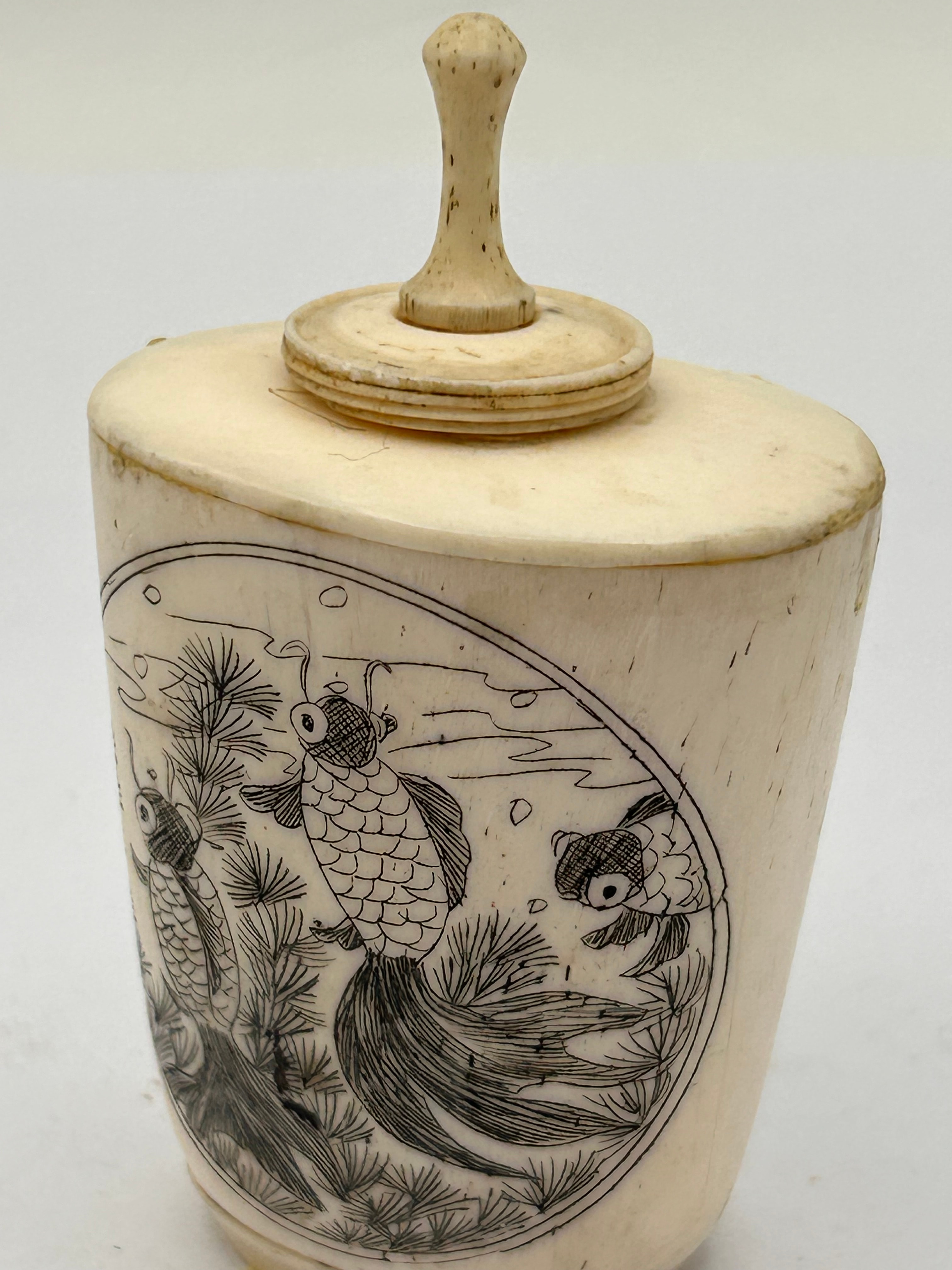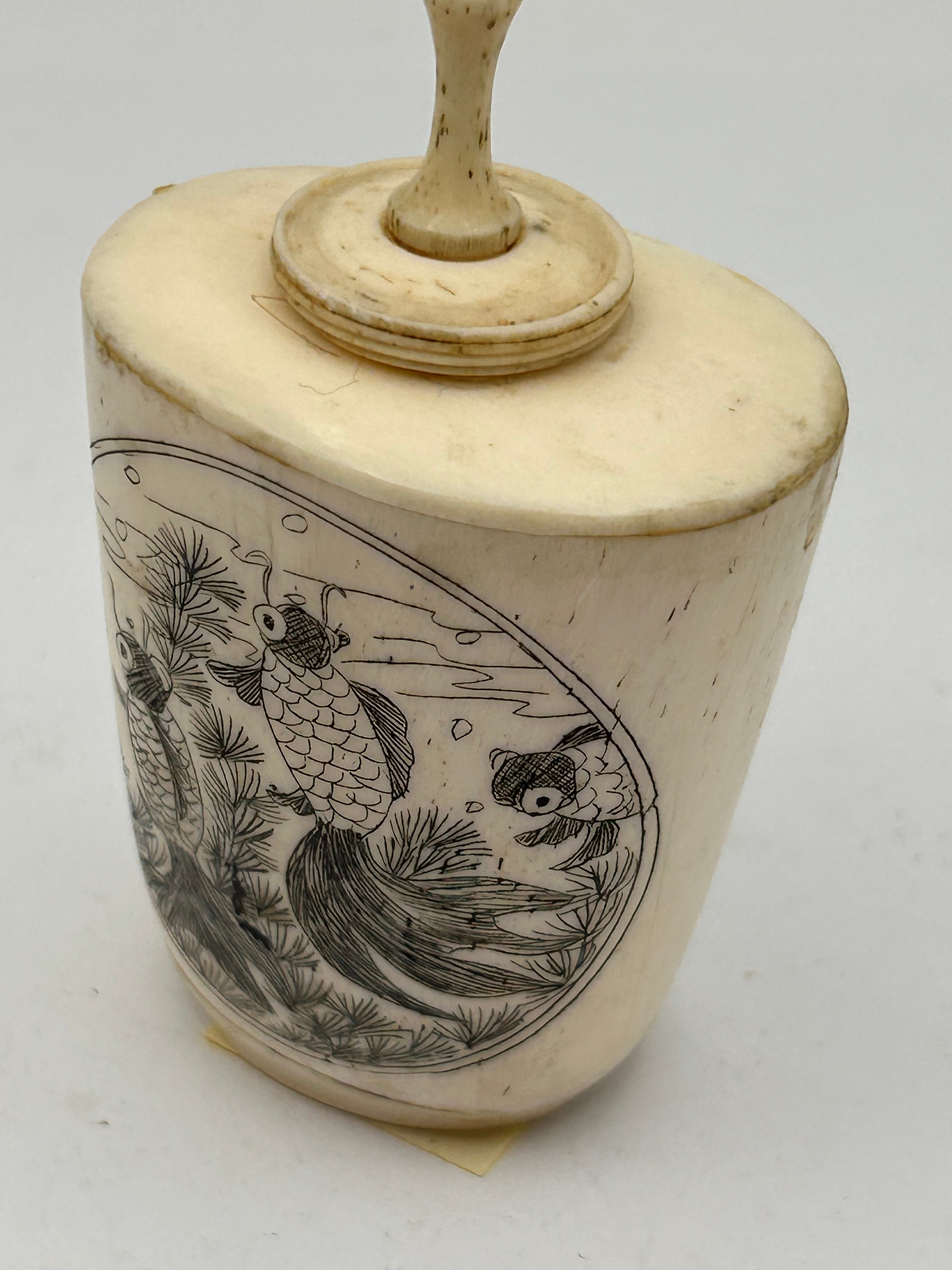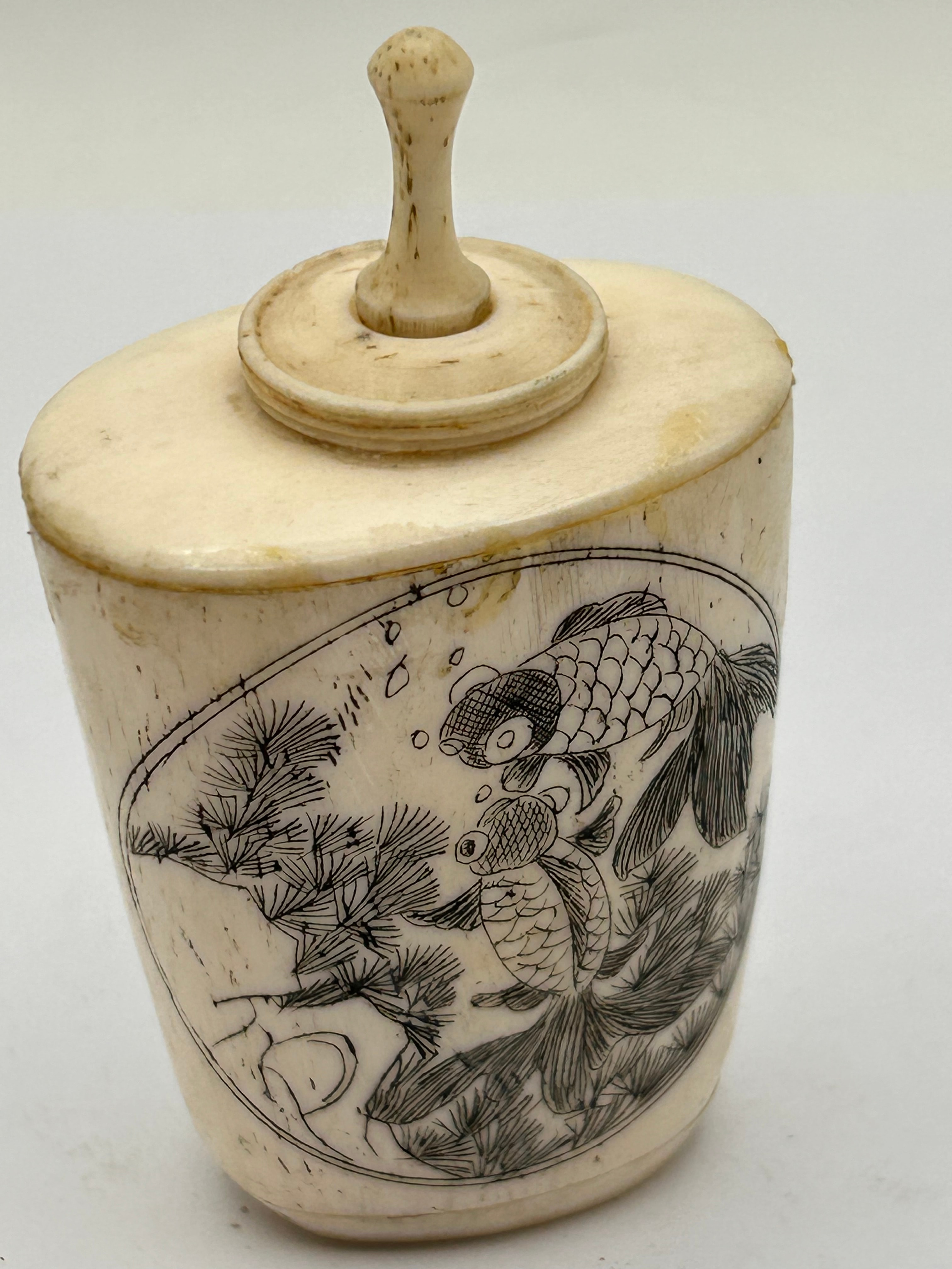 A 19th Century Chinese etched bone snuff bottle. This small, lidded container is crafted from bone and features a flattened, oval-shaped body with a fitted circular lid topped by a turned finial. The main body is decorated with an etched design within an oval reserve, depicting three goldfish swimming among aquatic plants, executed in a detailed East Asian style. There are no visible text or identifying markings.