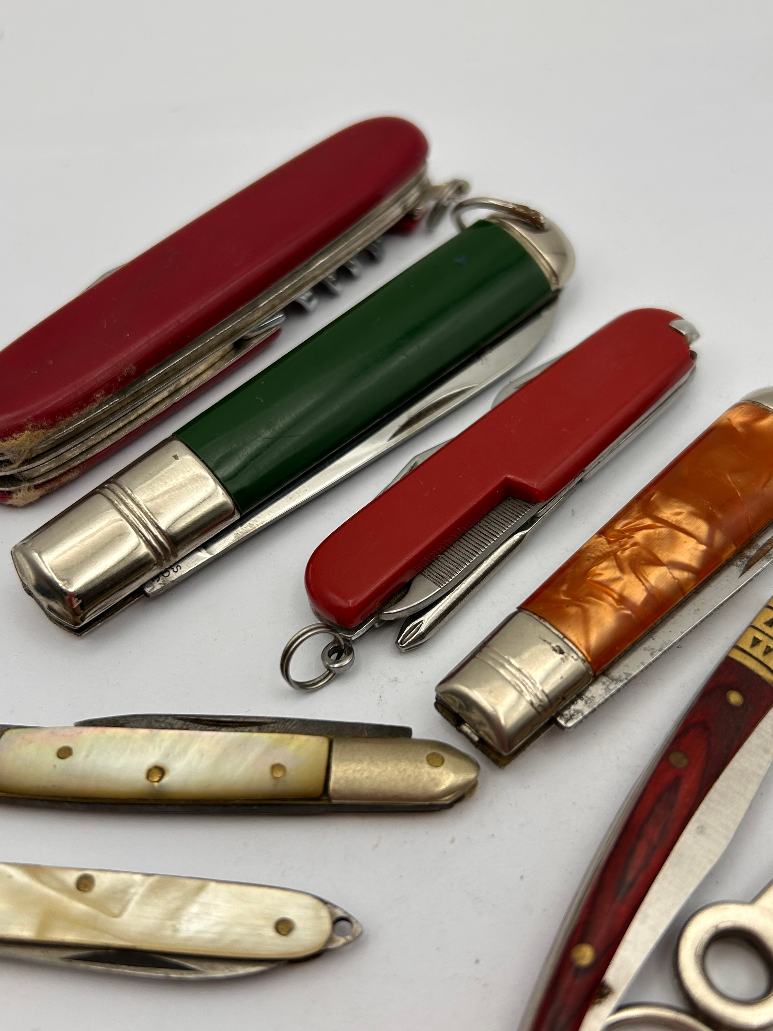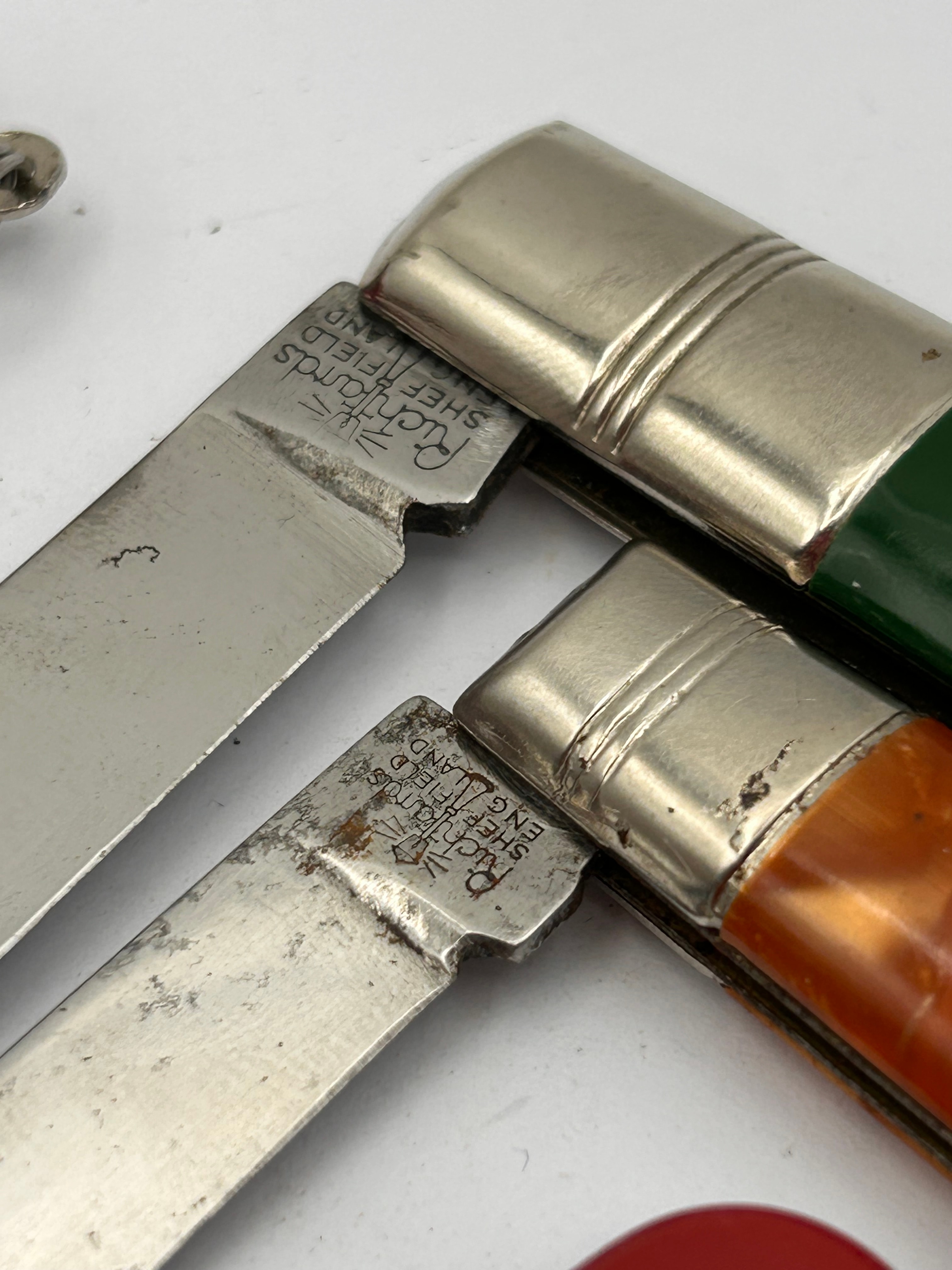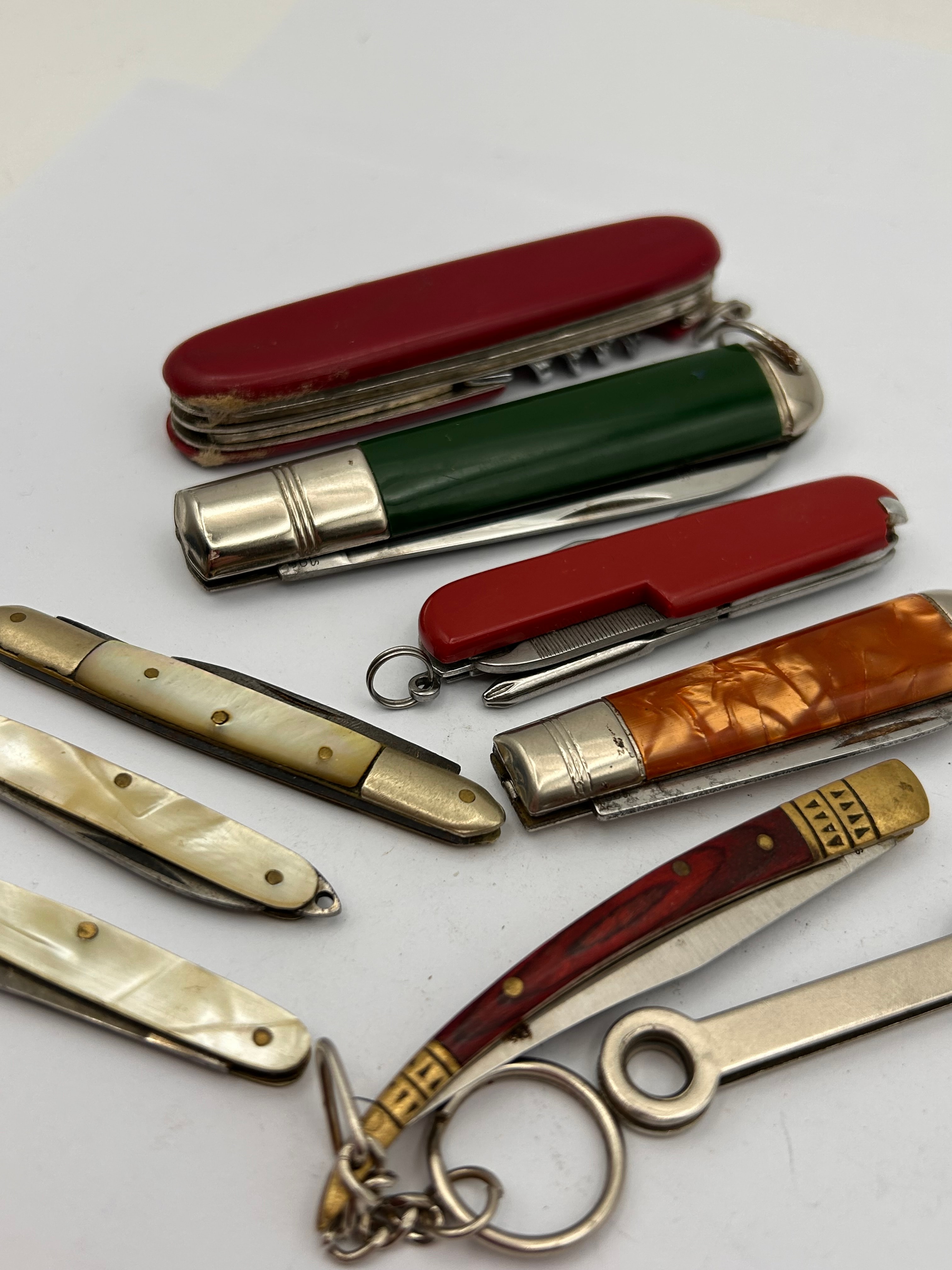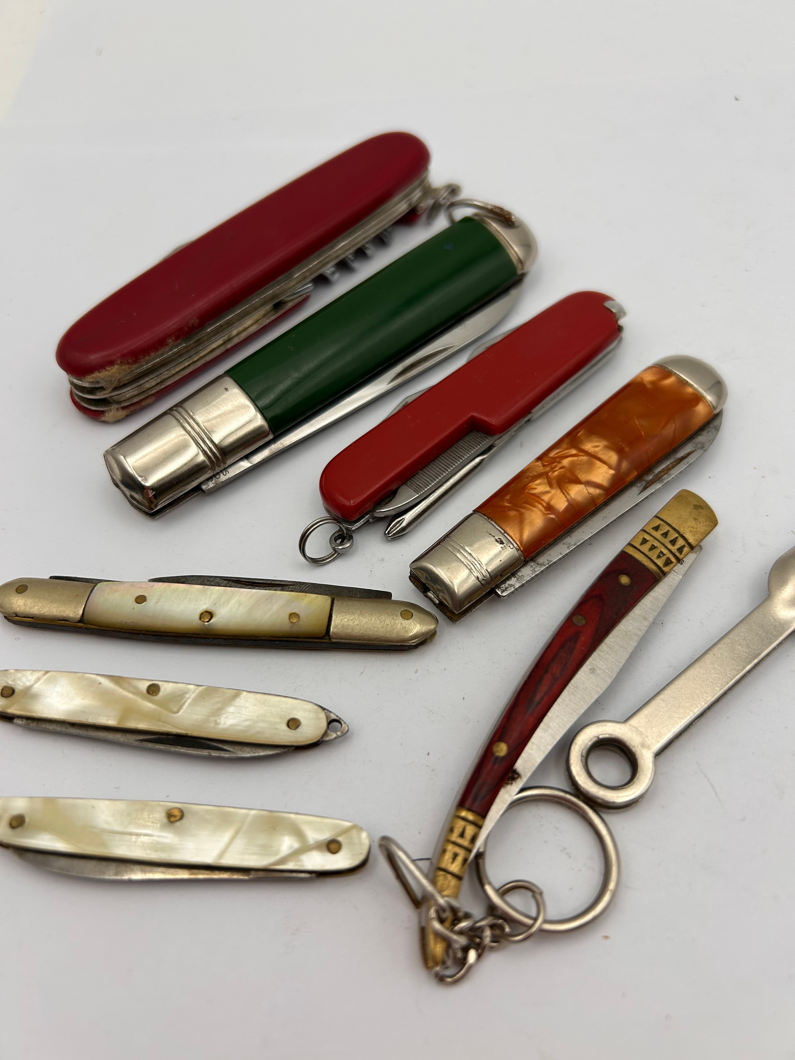 A collection of nine small, primarily folding knives and multi-tools. The group includes three multi-tool style knives with red and dark green plastic handles and metal bolsters, two of which are visibly marked “RICHARDS SHEFFIELD ENGLAND” on their blades. There are three smaller penknives featuring iridescent mother-of-pearl handles with brass-toned metal elements. Additionally, the collection includes one small folding knife with a reddish-brown wood handle, accented with brass-toned metal and attached to a metal keychain ring, and a separate small metal tool, possibly a nail file or pick, also linked to a key ring and chain.