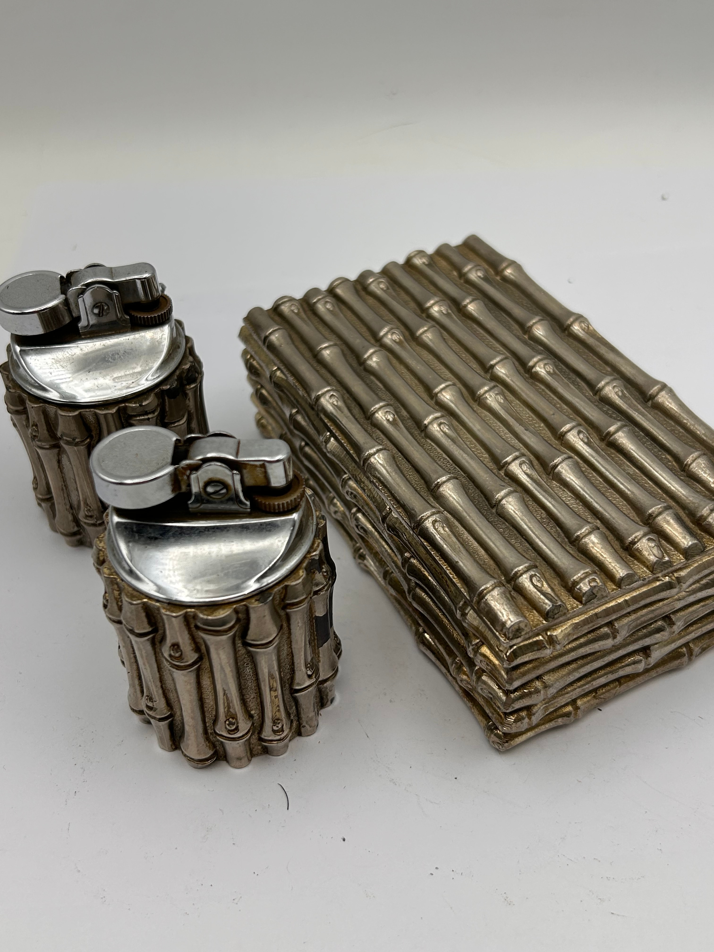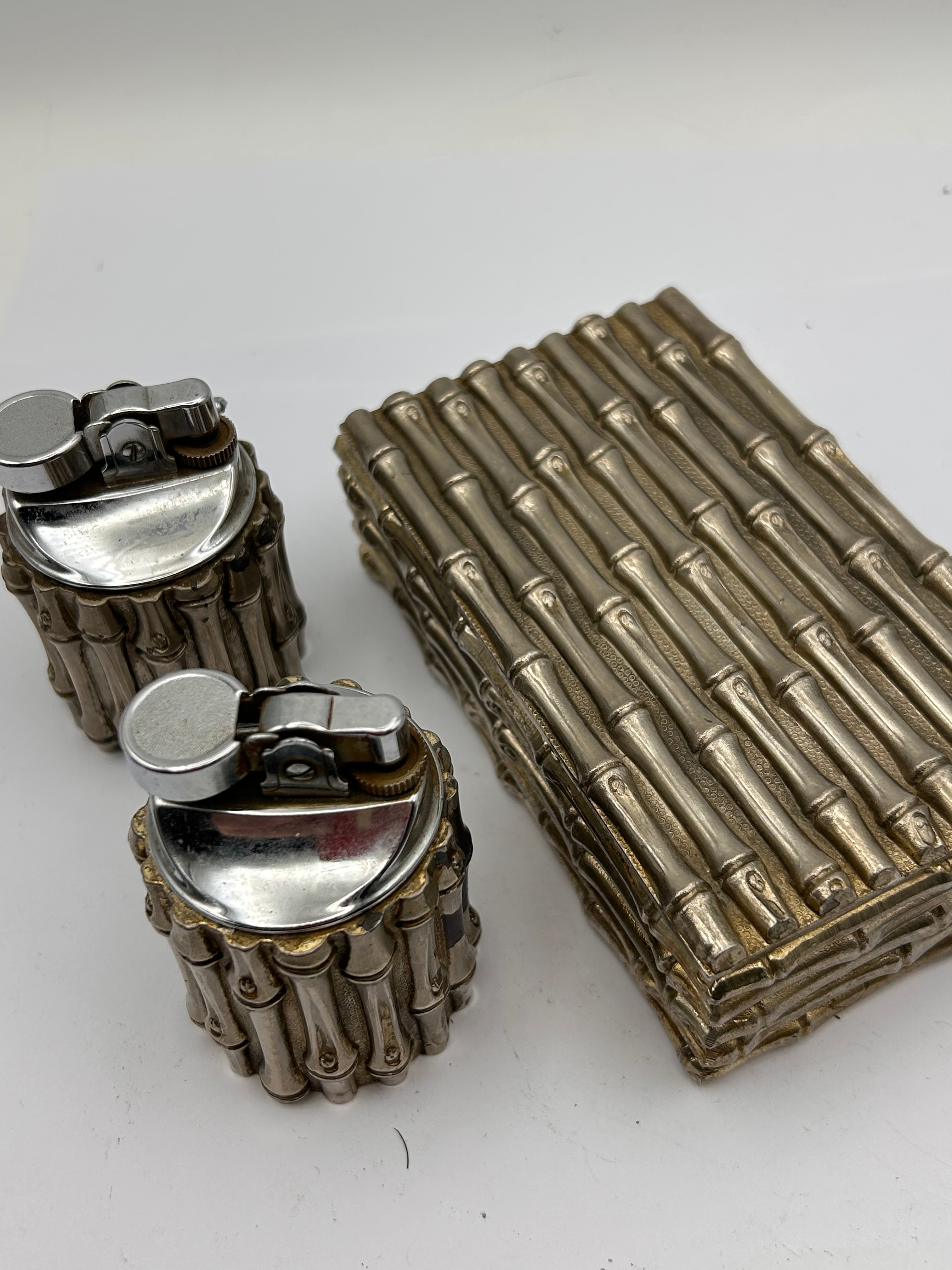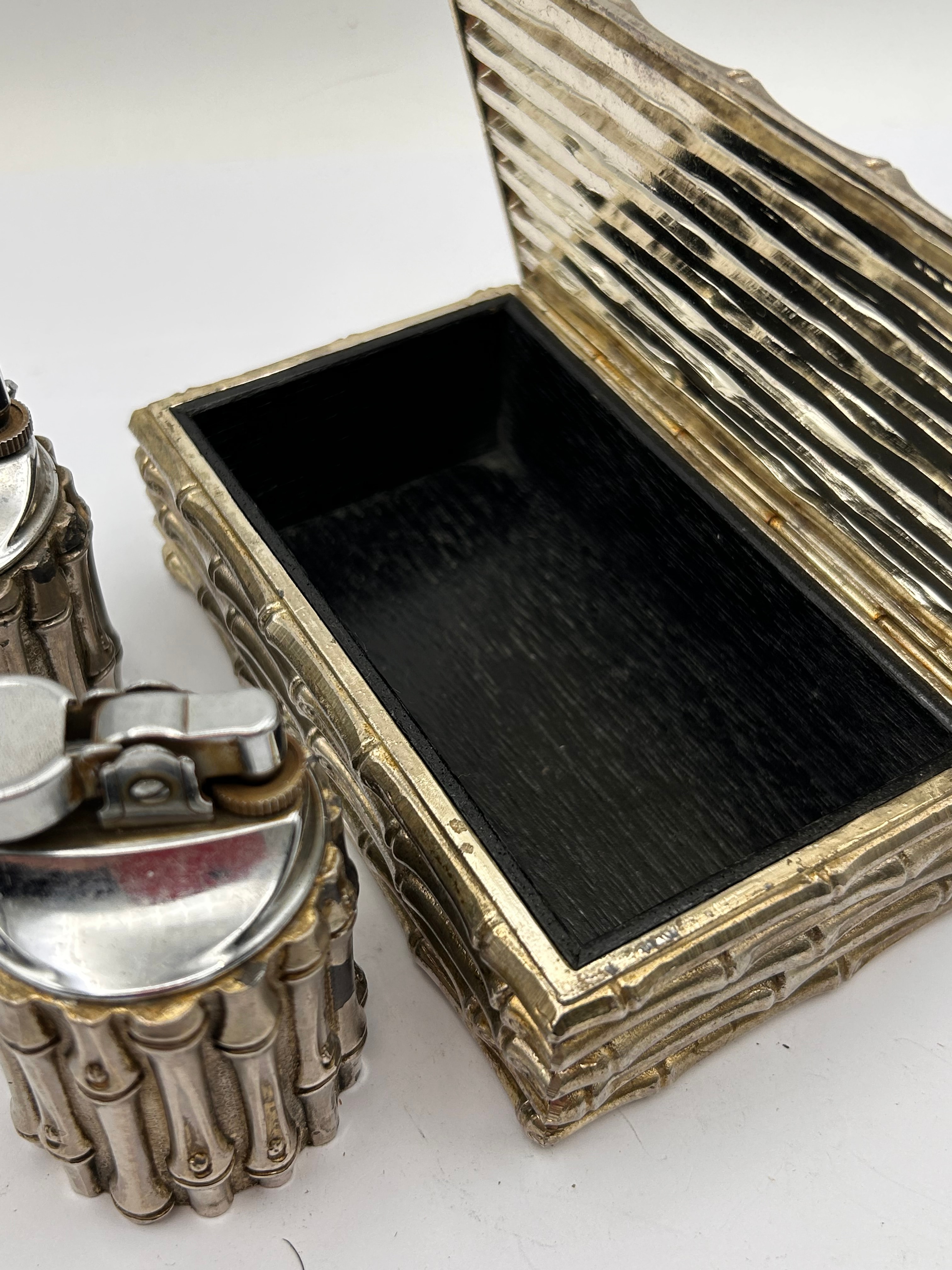 This lot presents a three-piece desk set, comprising two cylindrical table lighters and a rectangular hinged box, all uniformly decorated with an embossed or cast bamboo stalk motif. The items are constructed from silver-toned plated metal, with the lighters featuring chrome-plated mechanisms, while the box reveals a dark, likely painted wood interior. No manufacturer’s marks or inscriptions are discernable. The bamboo motif is reminiscent of designs by Maria Pergay for Maison Jansen or Tiffany & Co. bamboo collections, though these items are executed in plated metal.