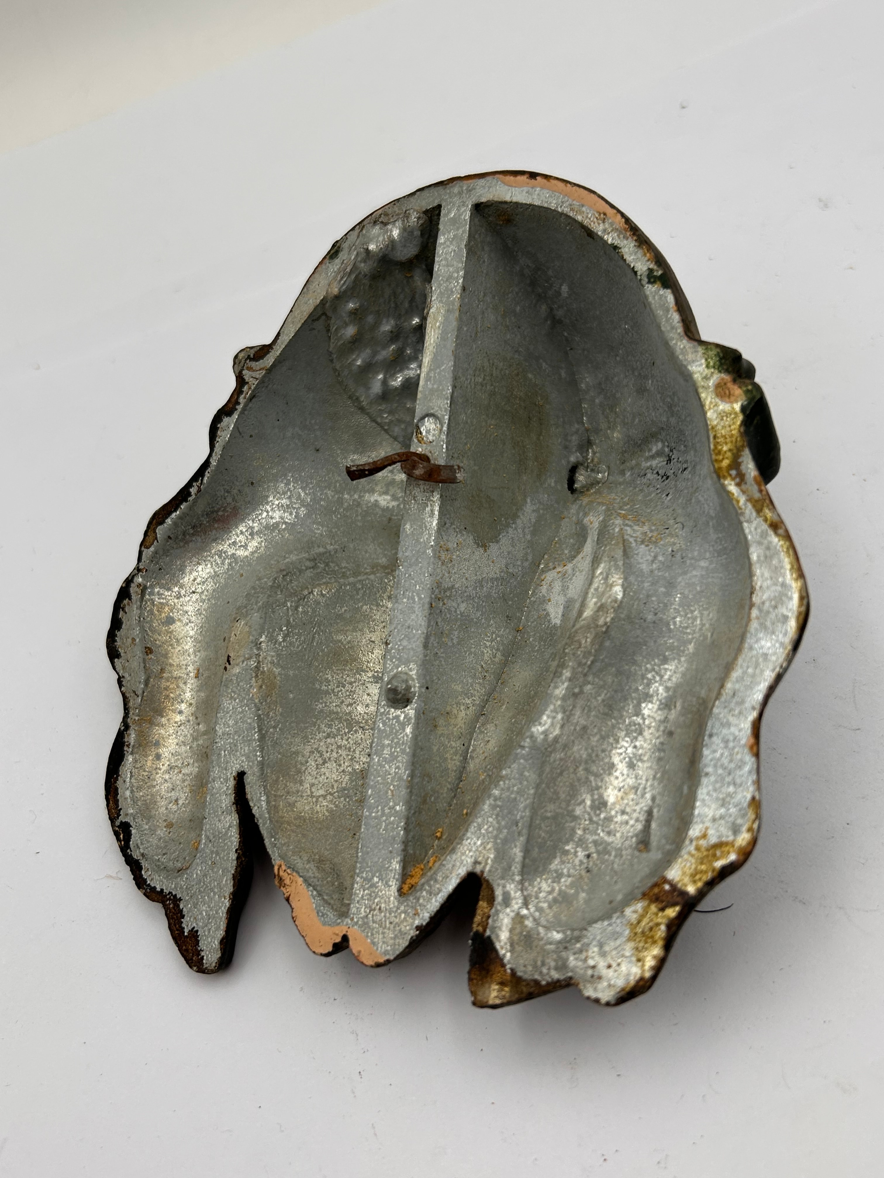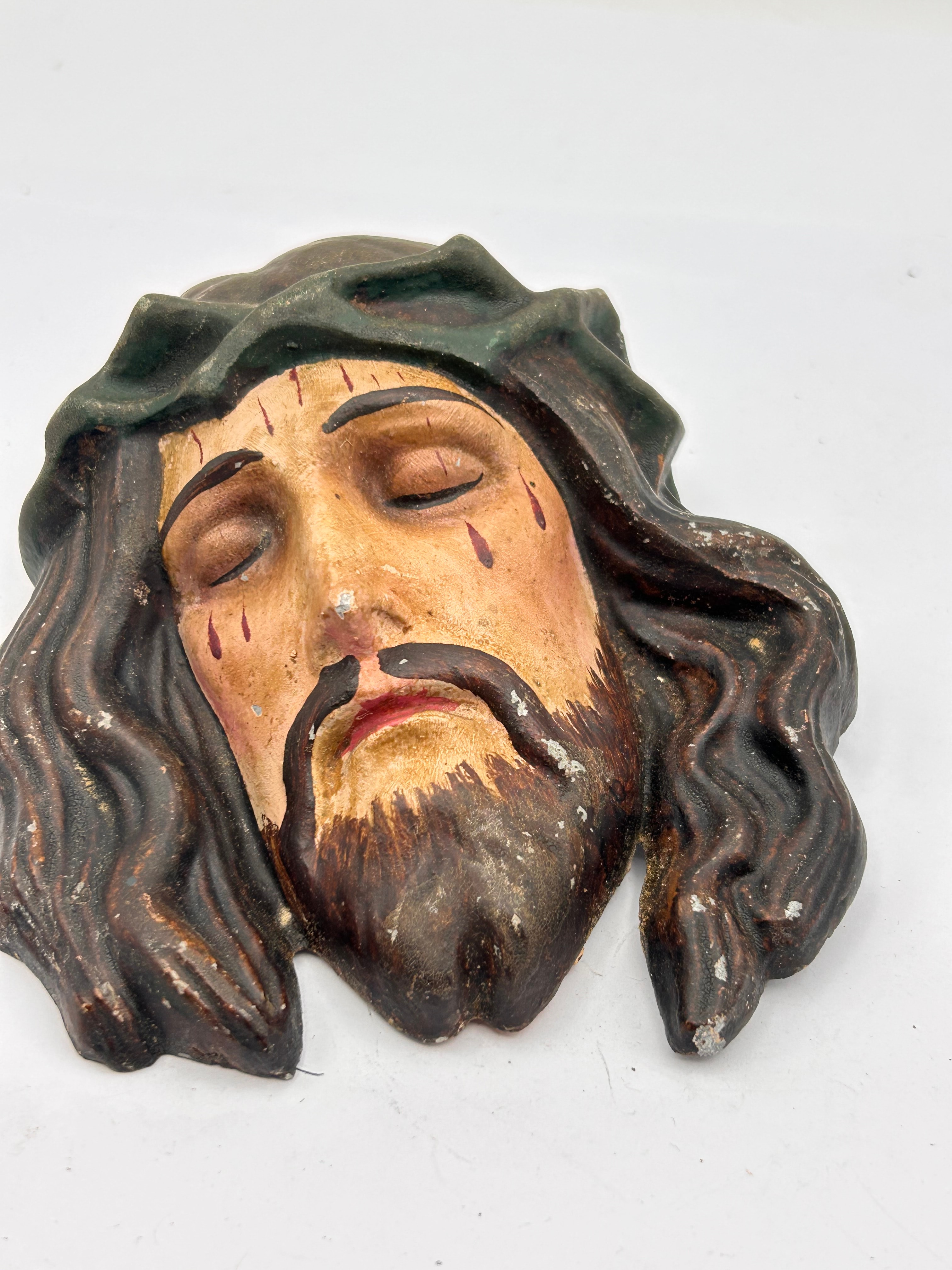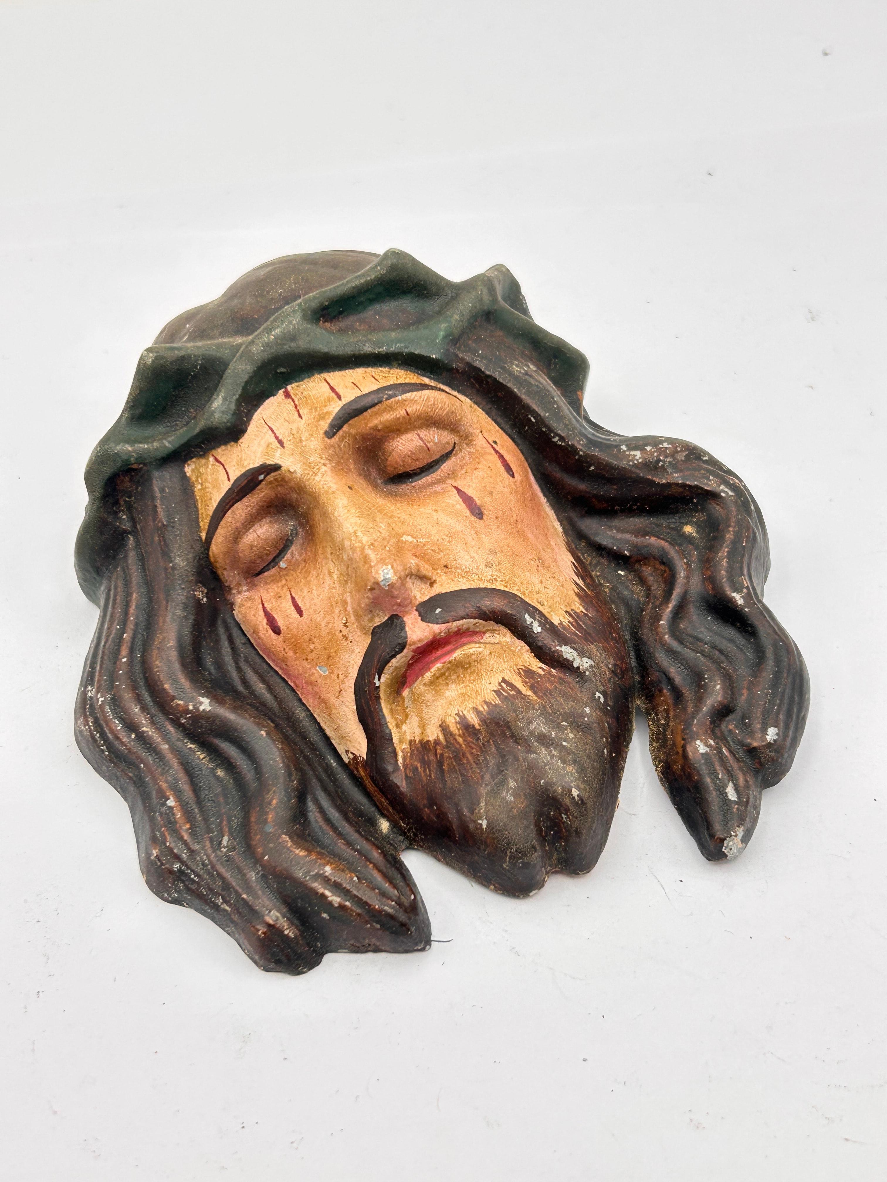 A vintage polychrome painted metal relief plaque depicting the head of Jesus Christ with a crown of thorns. The devotional imagery portrays the suffering Christ with closed eyes, a beard, and painted blood droplets on the forehead and face. This hollow-cast metal plaque features a simple hook or wire on the reverse for hanging.