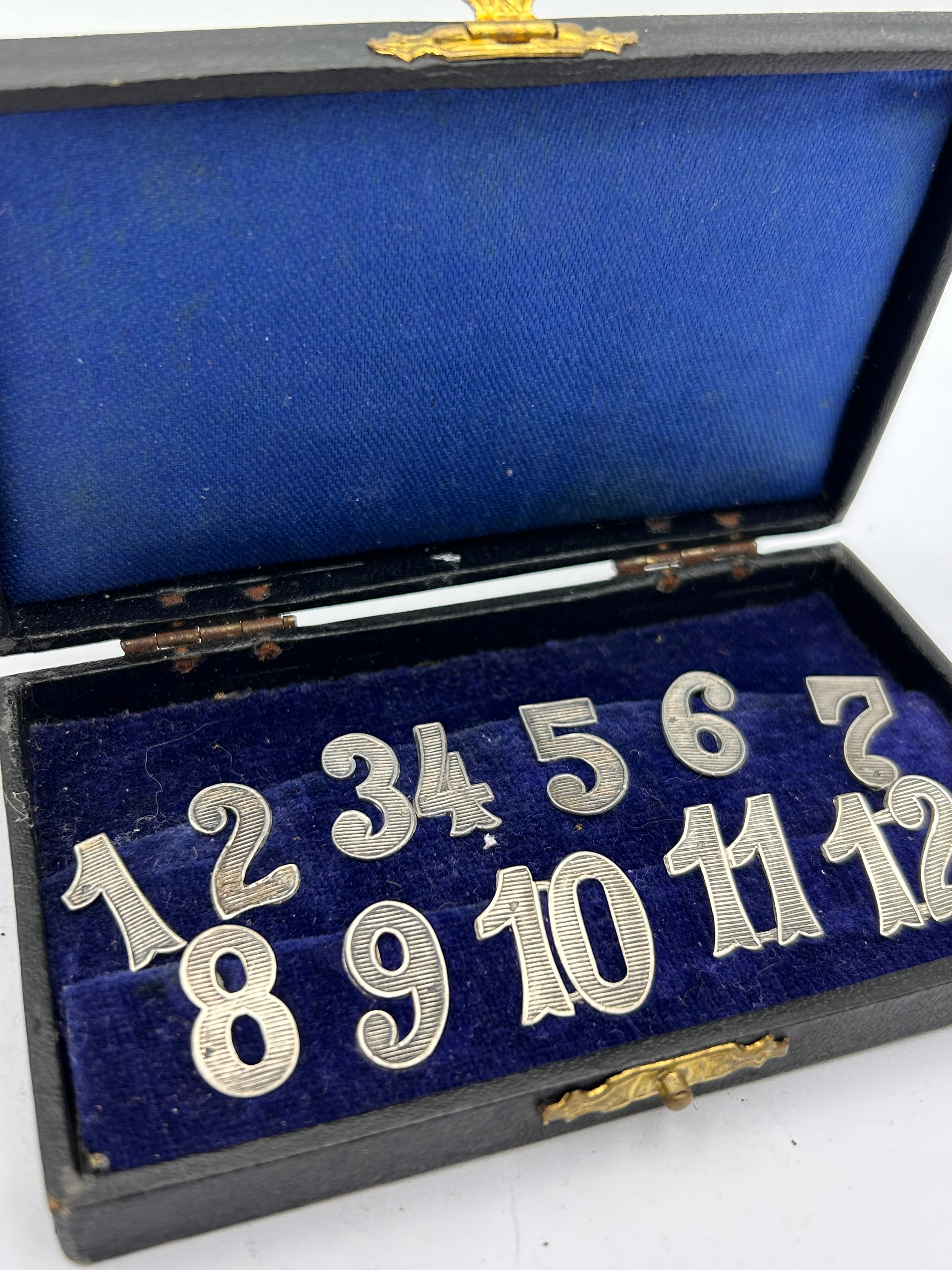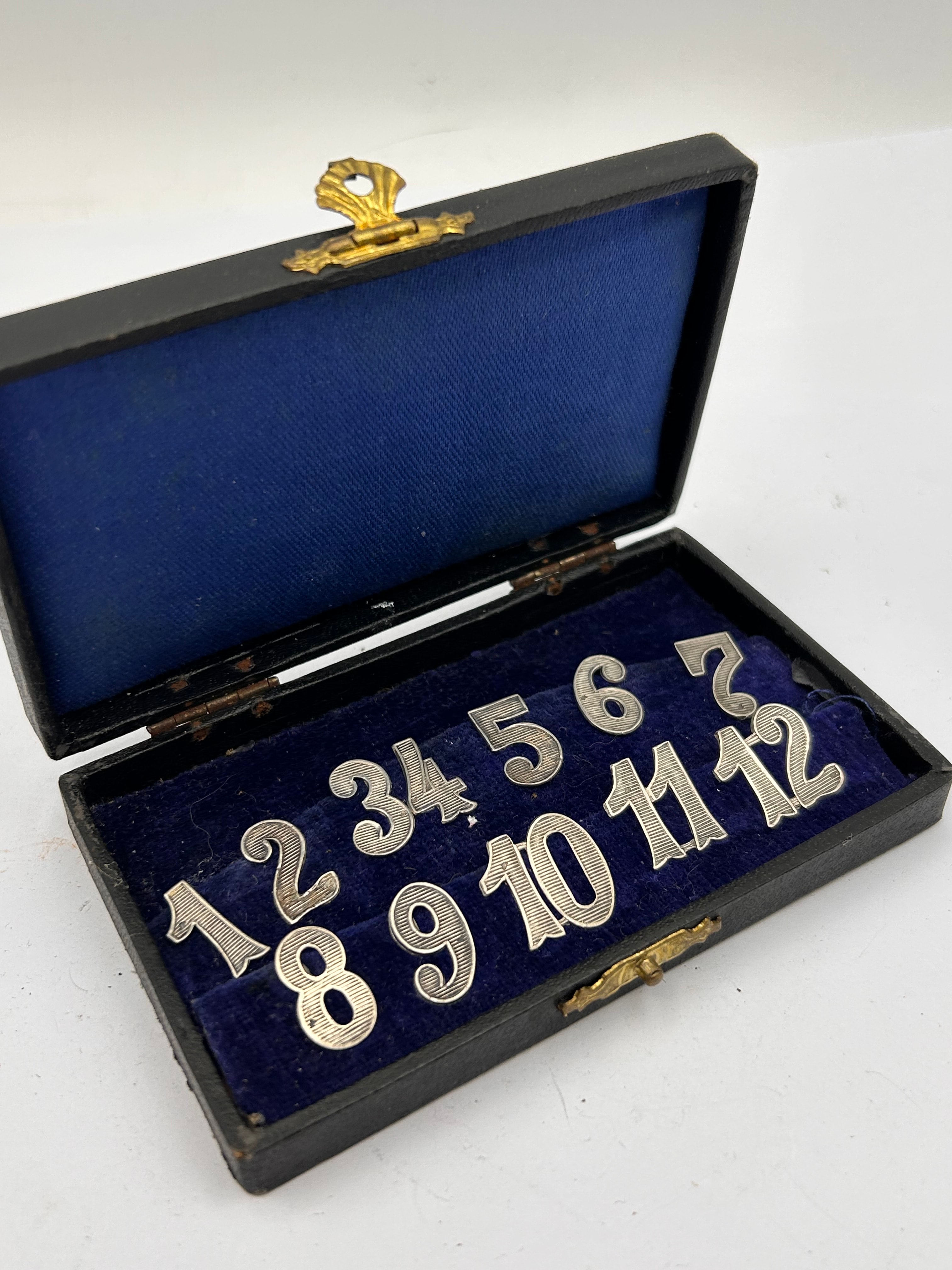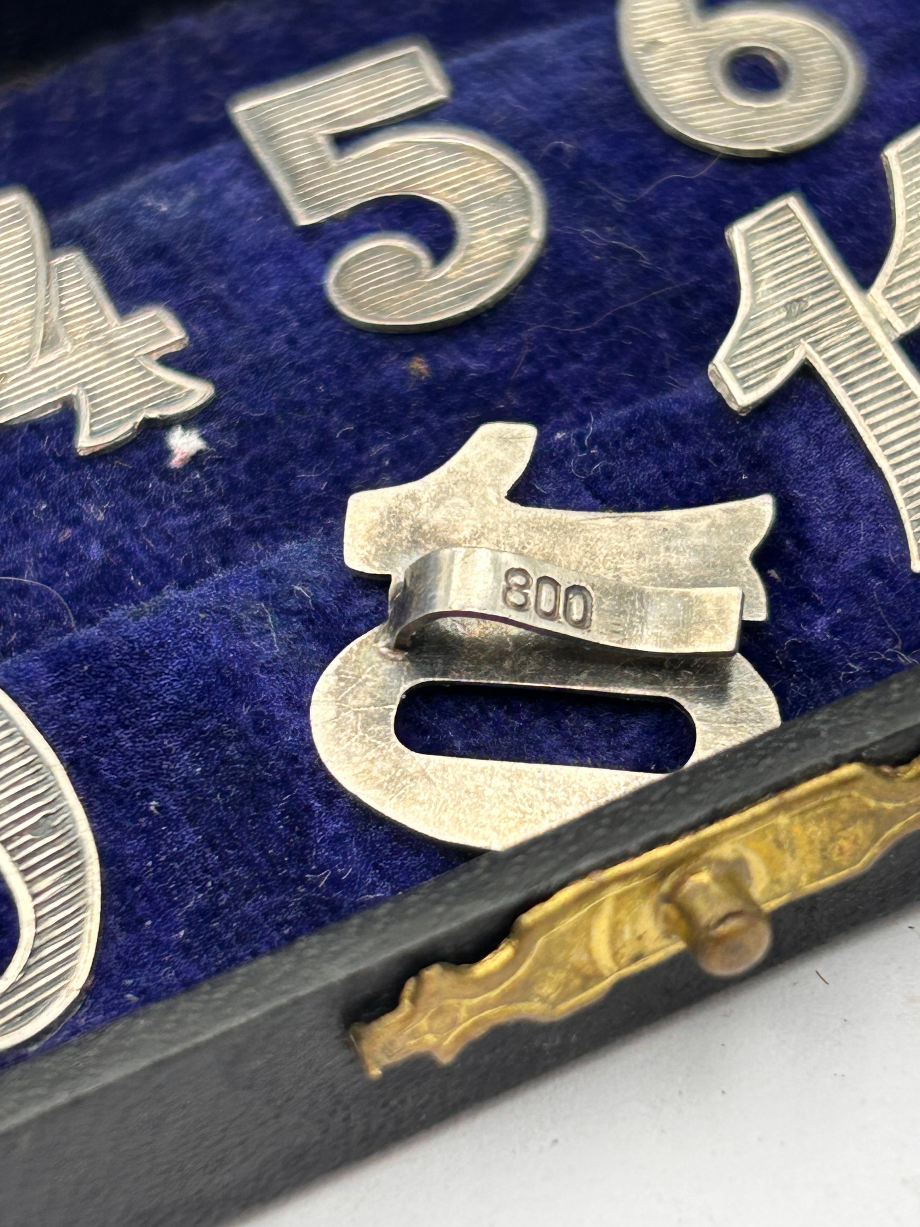 An Art Deco Continental 800 silver cased set of twelve place numbers / drink markers. The set comprises a complete collection of twelve individual silver-toned metallic numbers, “1” through “12”, each featuring a decorative striated design characteristic of the Art Deco period. A visible marking of “800” is present on the reverse of number “8”, confirming an 800 parts per thousand silver alloy. The numbers are designed for attachment, with a clip mechanism on the reverse of each. They are presented in a small, dark-colored rectangular case, likely wood or leatherette, with a gold-toned metal clasp and hinges, and lined with dark blue velvet-like fabric.