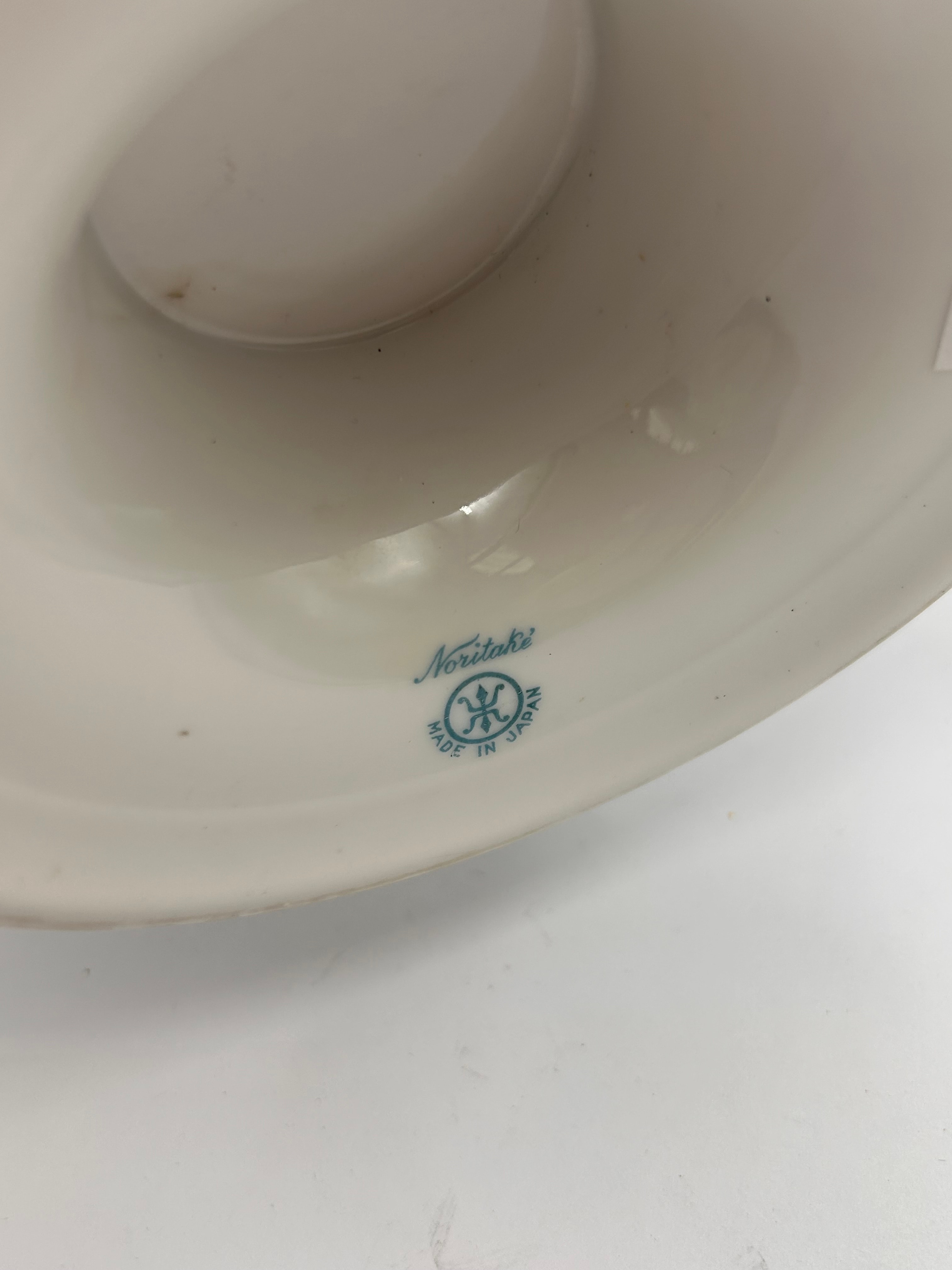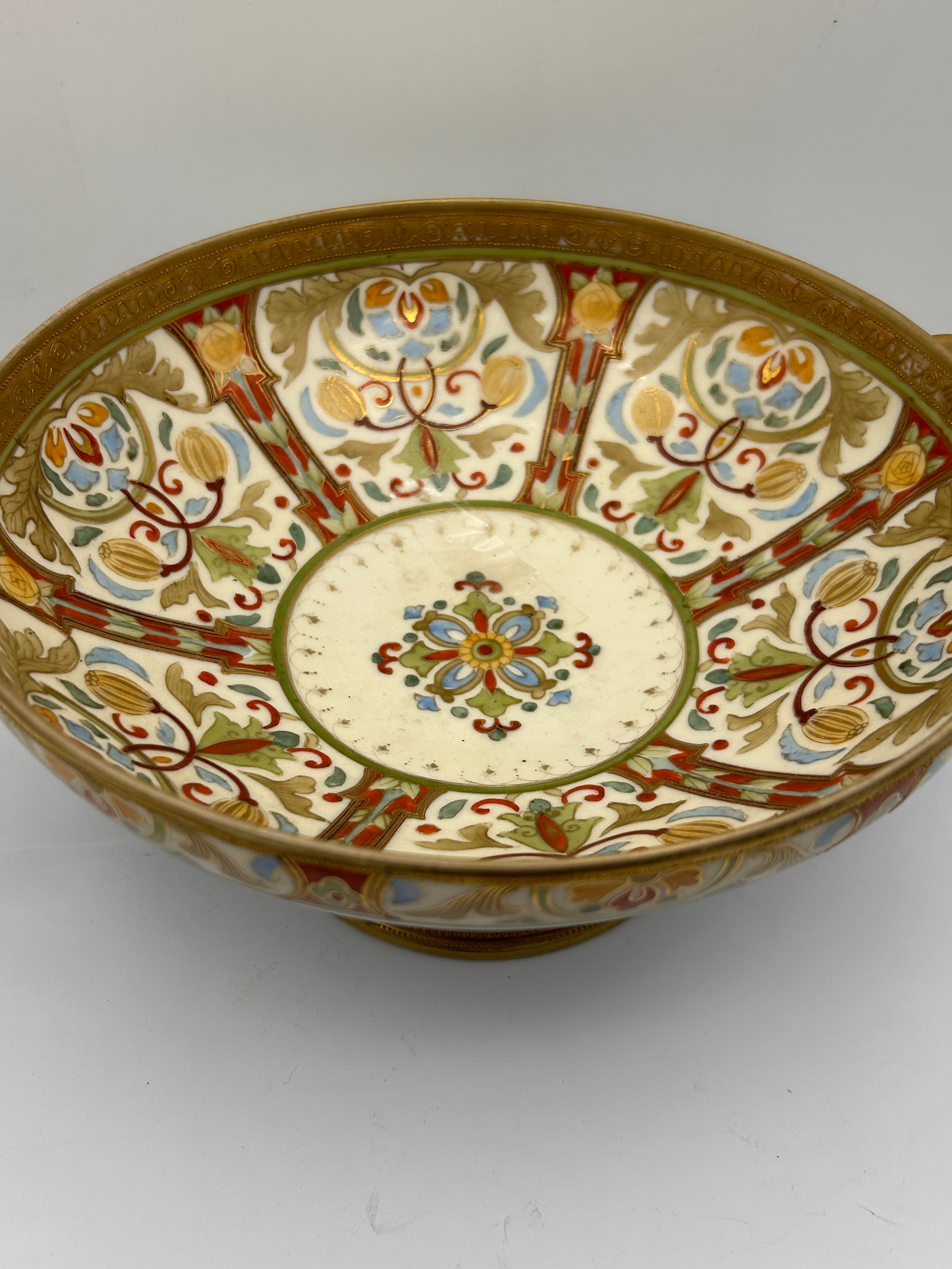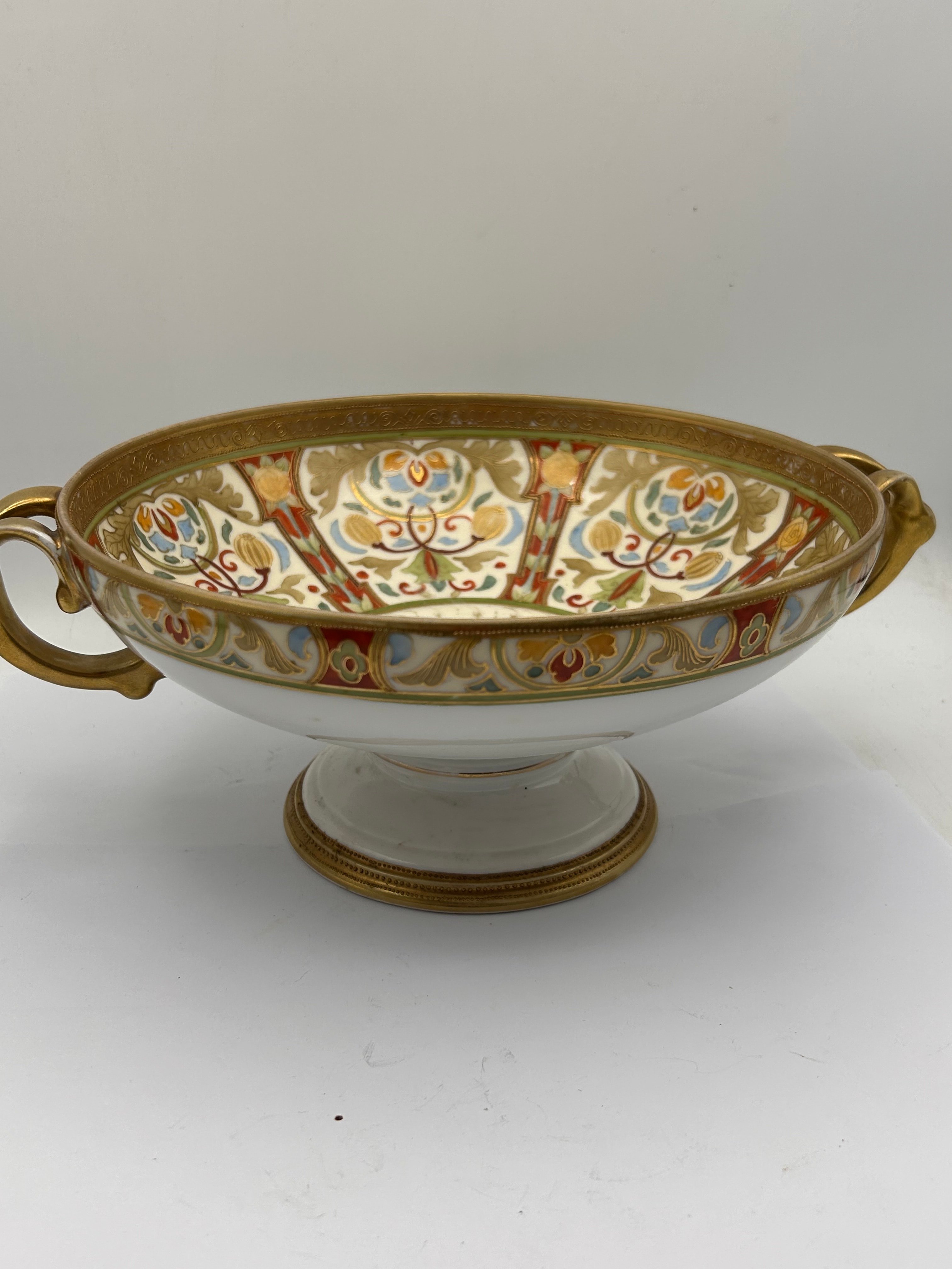 An ornate porcelain footed bowl by Noritake, featuring two gilt-finished handles and extensive polychrome enamel and gilt decoration. The design displays intricate scrolling foliate and floral motifs in a rich palette, characteristic of a late 19th or early 20th-century aesthetic. The base is marked with a blue printed stamp that reads “Noritake” in script above a stylized “M” within a wreath, and “MADE IN JAPAN” (English) below.