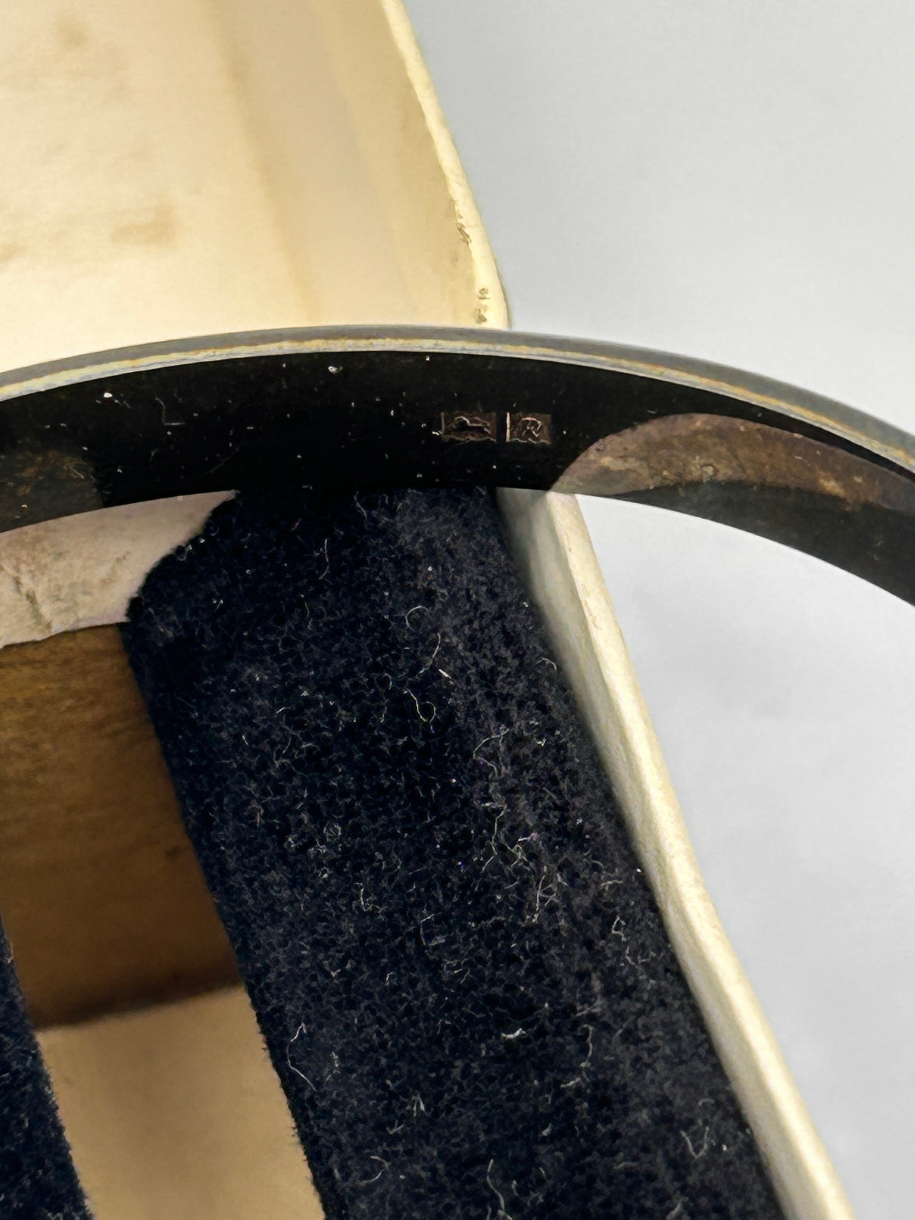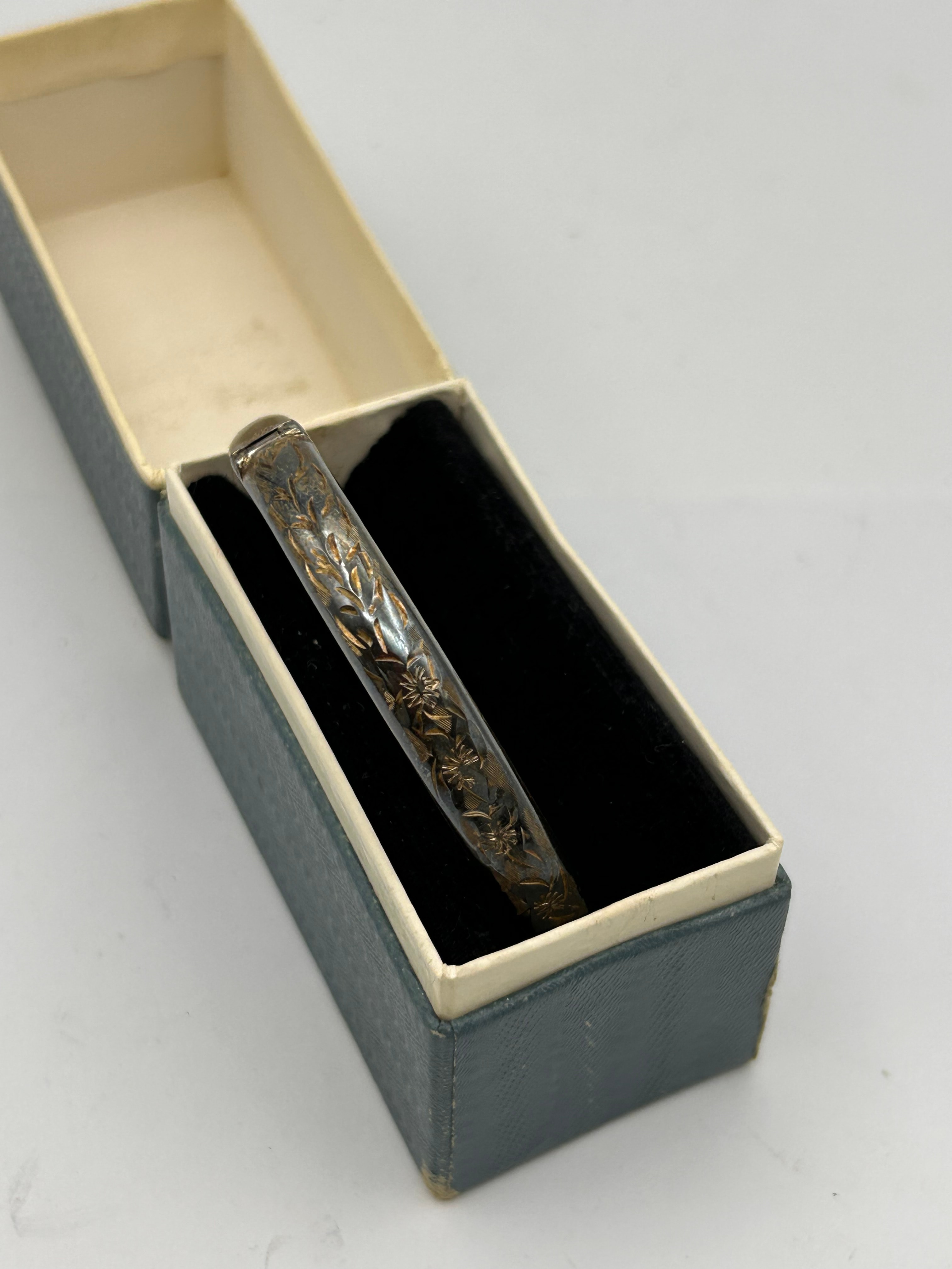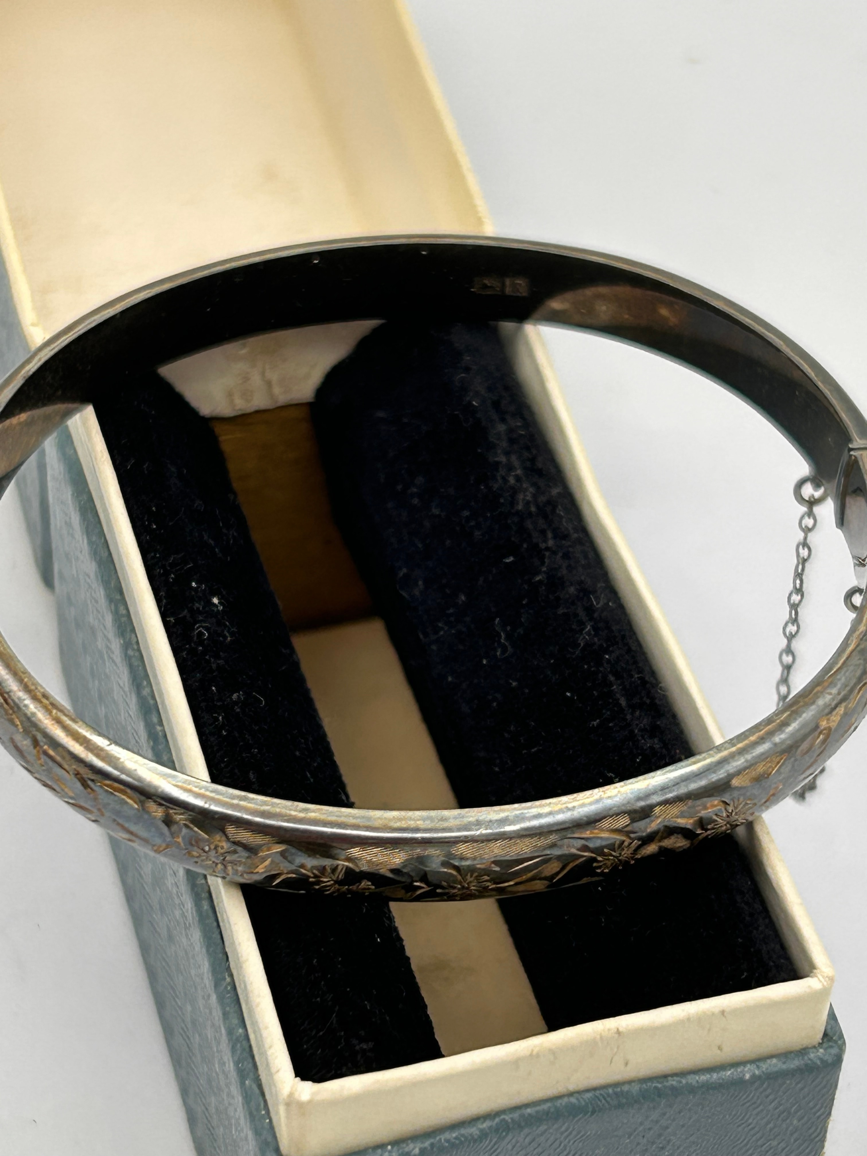 A vintage sterling silver hinged bangle bracelet, featuring an intricate floral and foliage design engraved or etched with a darkened background, possibly niello or patination, across its exterior. The bracelet is fitted with a safety chain. Visible hallmarks on its interior include “J.& R.” (maker’s mark), a lion passant (indicating sterling silver), an “R” within a shield (date letter), and another indistinct mark, suggesting British origin. The bracelet is presented within an aged, grey-blue cardboard box with a black velvet-like insert.
