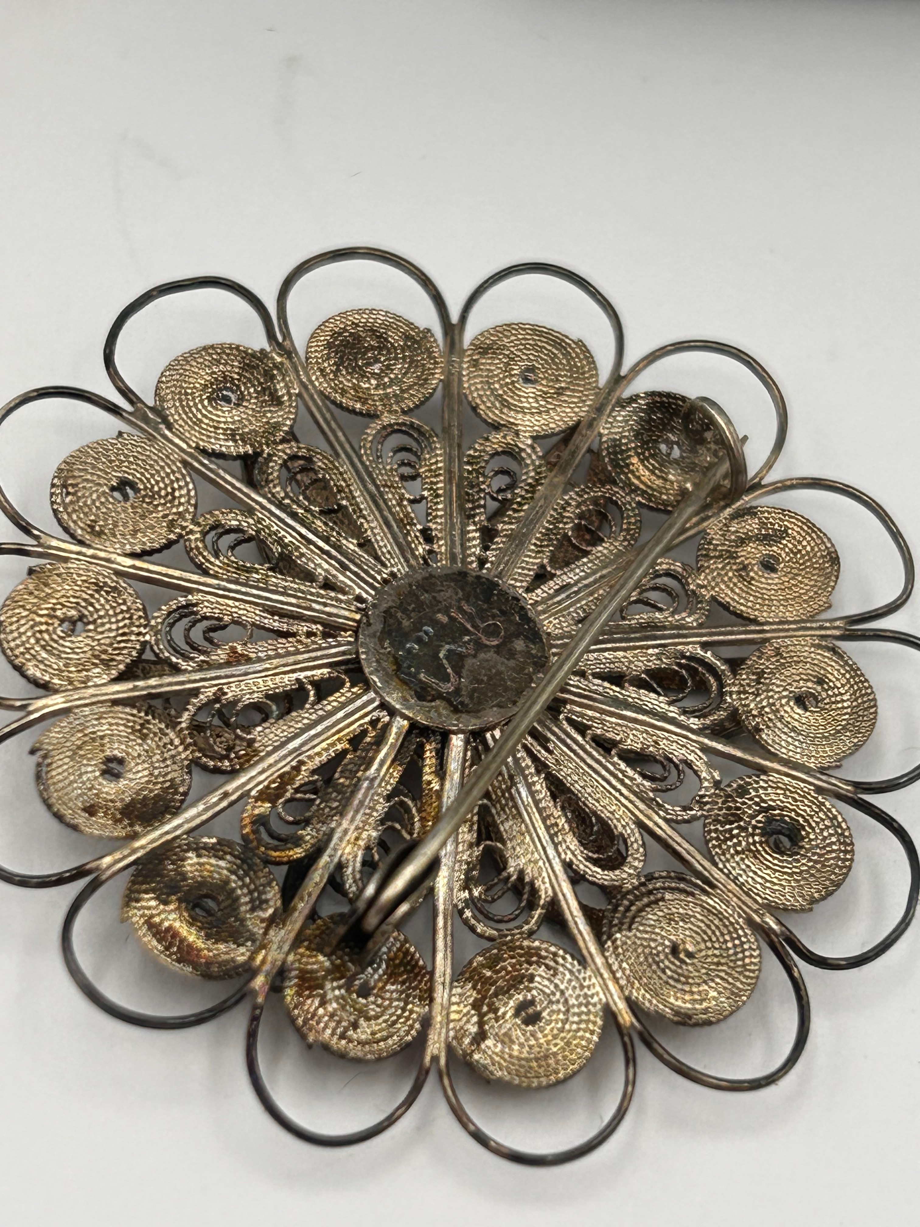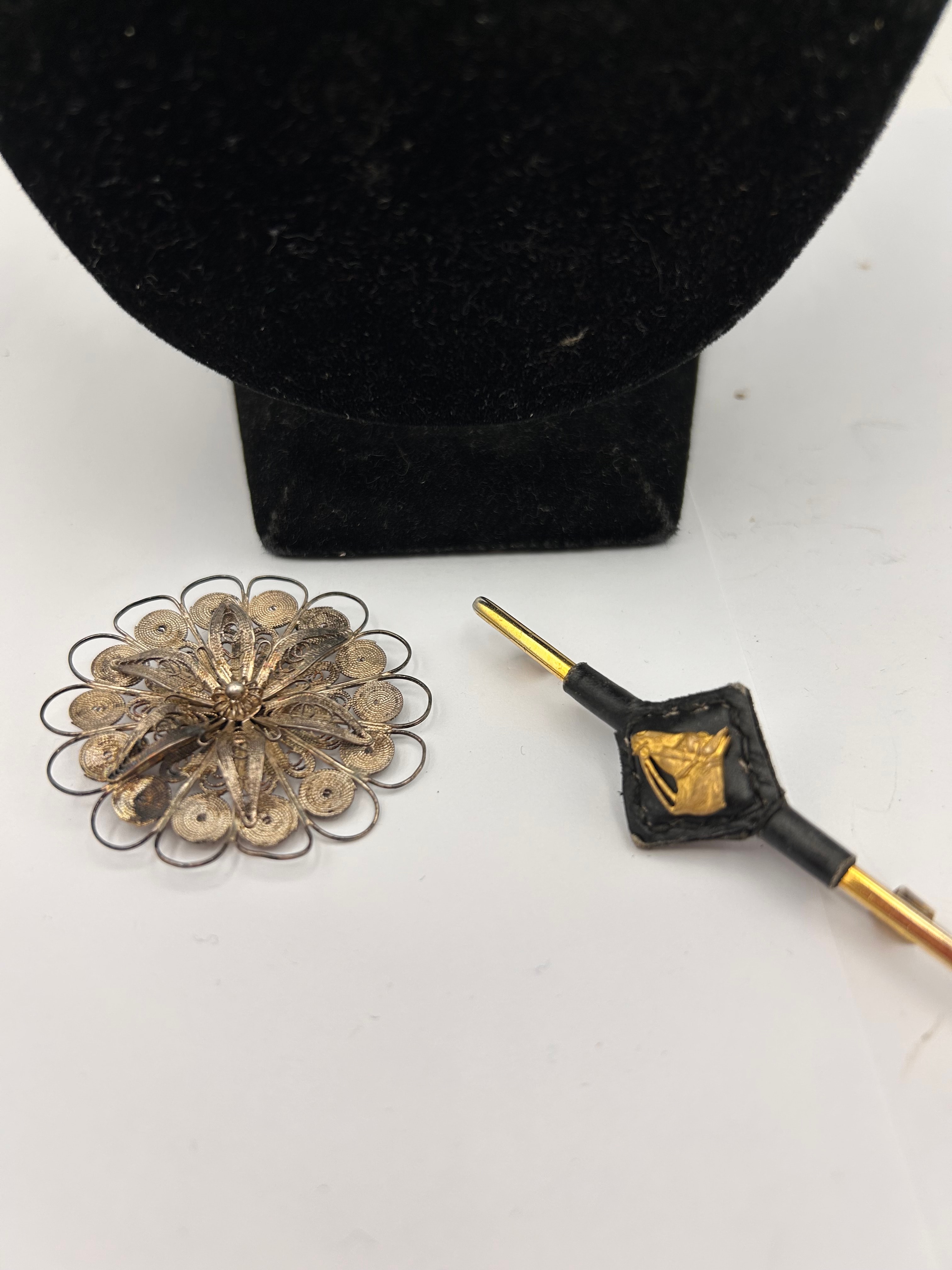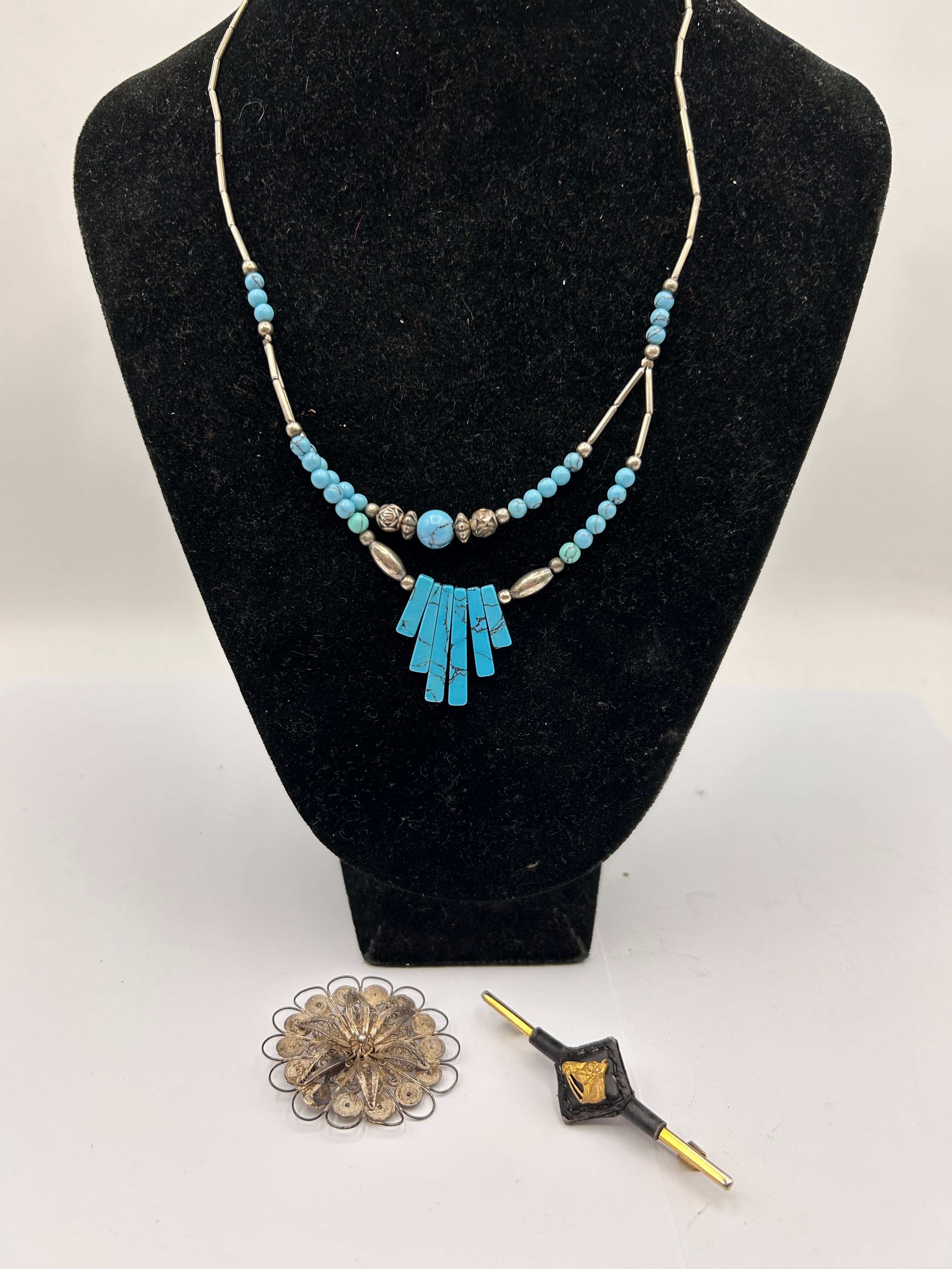 This lot comprises three distinct jewelry items. The first is a two-strand beaded necklace featuring silver-toned metal beads and various shapes of blue-green stones, including spherical, nugget-like, and a central cluster of five flat rectangular pieces, suggesting a Southwestern or Native American-inspired aesthetic. The second item is a circular filigree brooch, crafted from silver-toned metal, clearly marked “925” on its reverse, indicating sterling silver. The third item is a tie tack consisting of a gold-toned shaft, partially wrapped in black material, and an applied gold-toned harp emblem, a common Irish motif.
