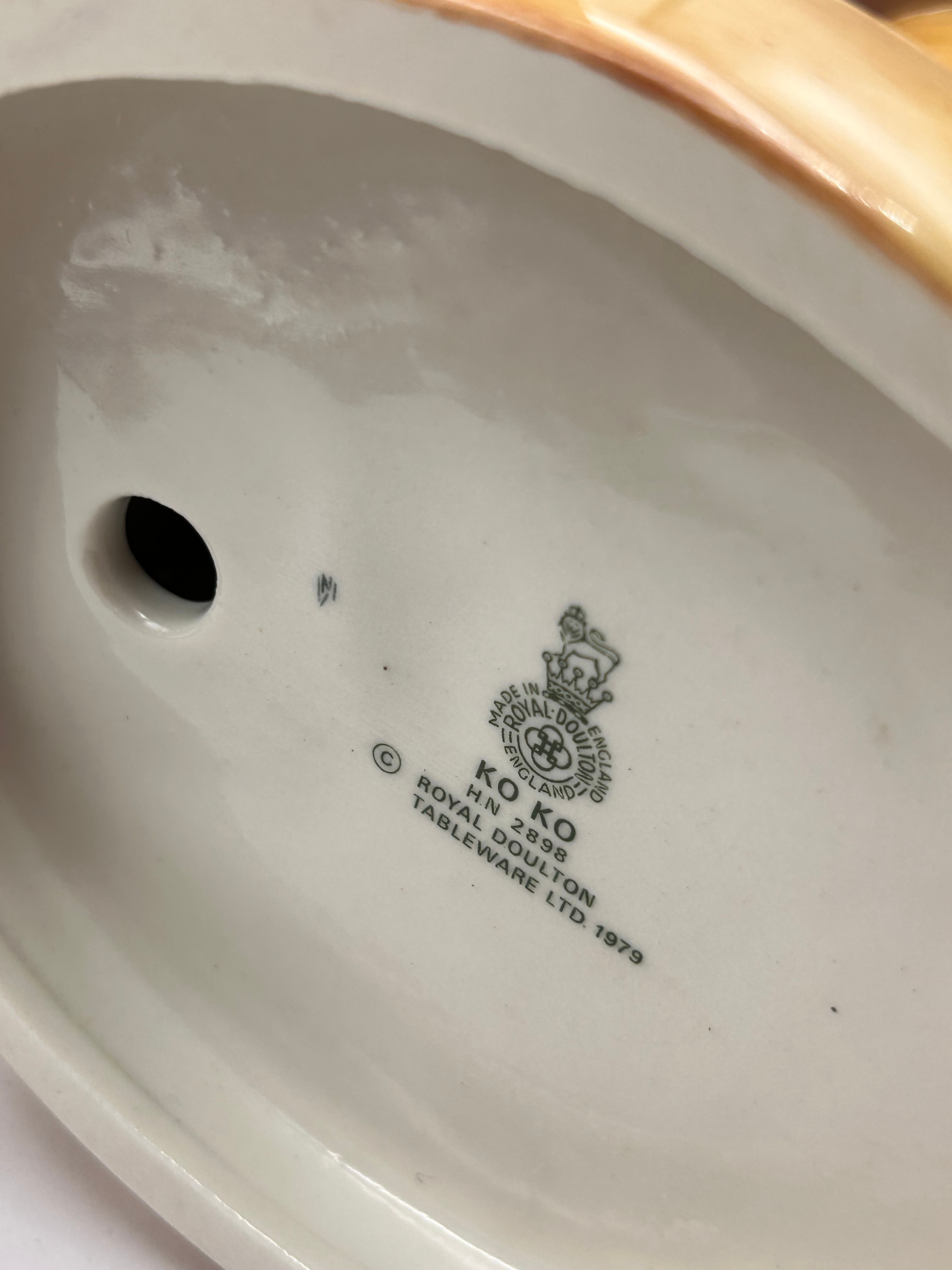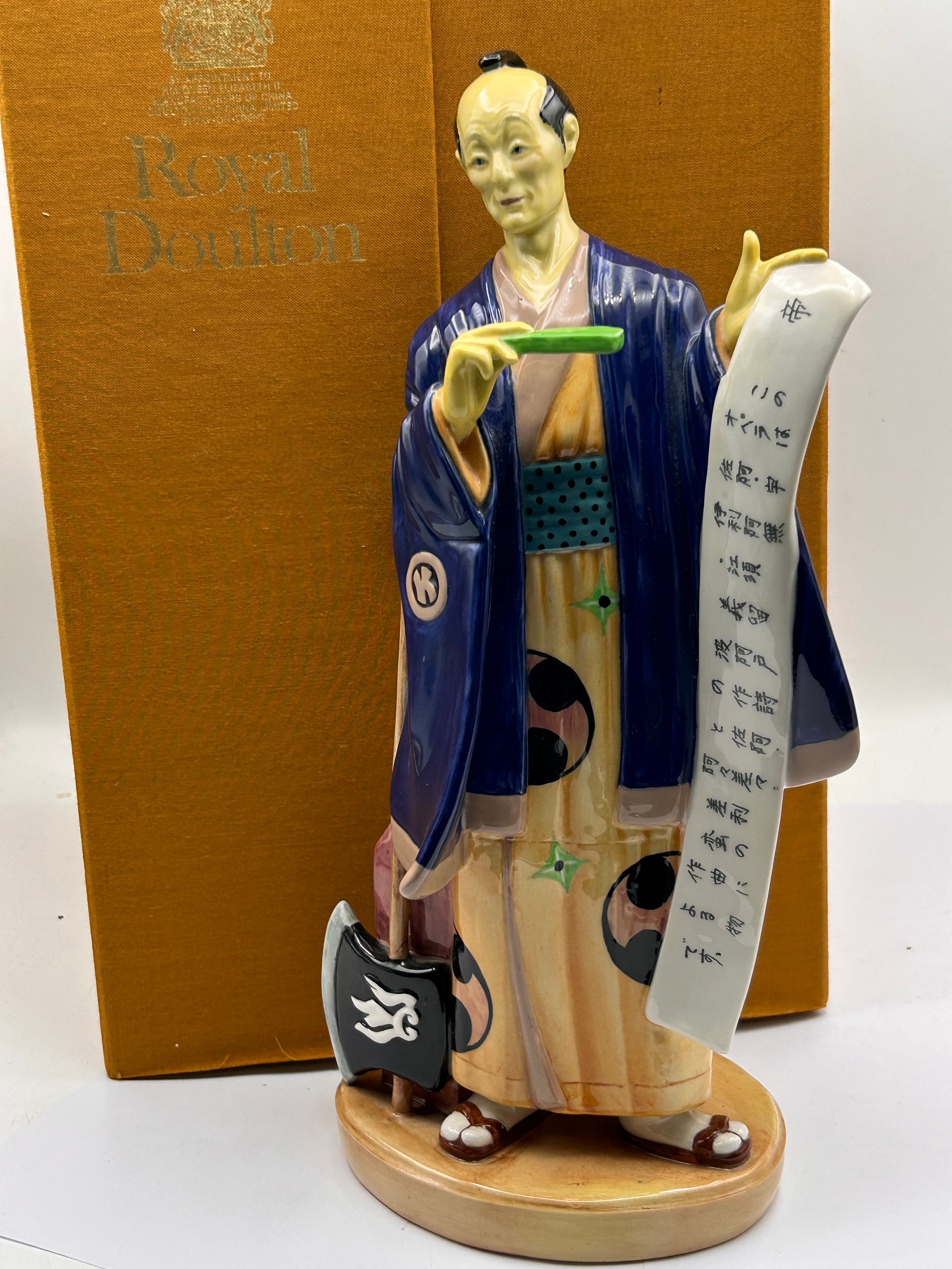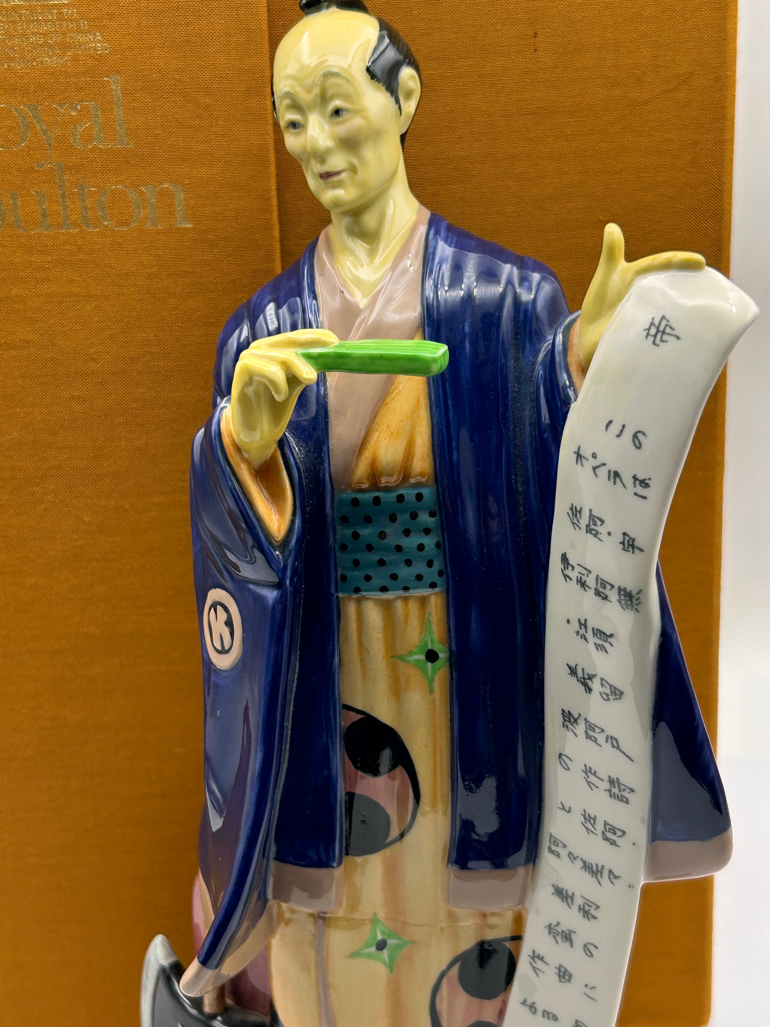A Royal Doulton glazed porcelain figurine, ‘Ko Ko’ (HN 2898), dated 1979. The piece depicts a male figure, styled in a Japanese manner, wearing a blue and beige kimono with black and white motifs, and a top knot hairstyle. He holds an unrolled scroll with vertical lines of Japanese calligraphy, which translates to “Wait, there’s a bird’s nest in this tree,” and a green implement in his other hand. The base is marked “MADE IN ENGLAND” with the Royal Doulton crown and lion logo. It is accompanied by its original Royal Doulton box.