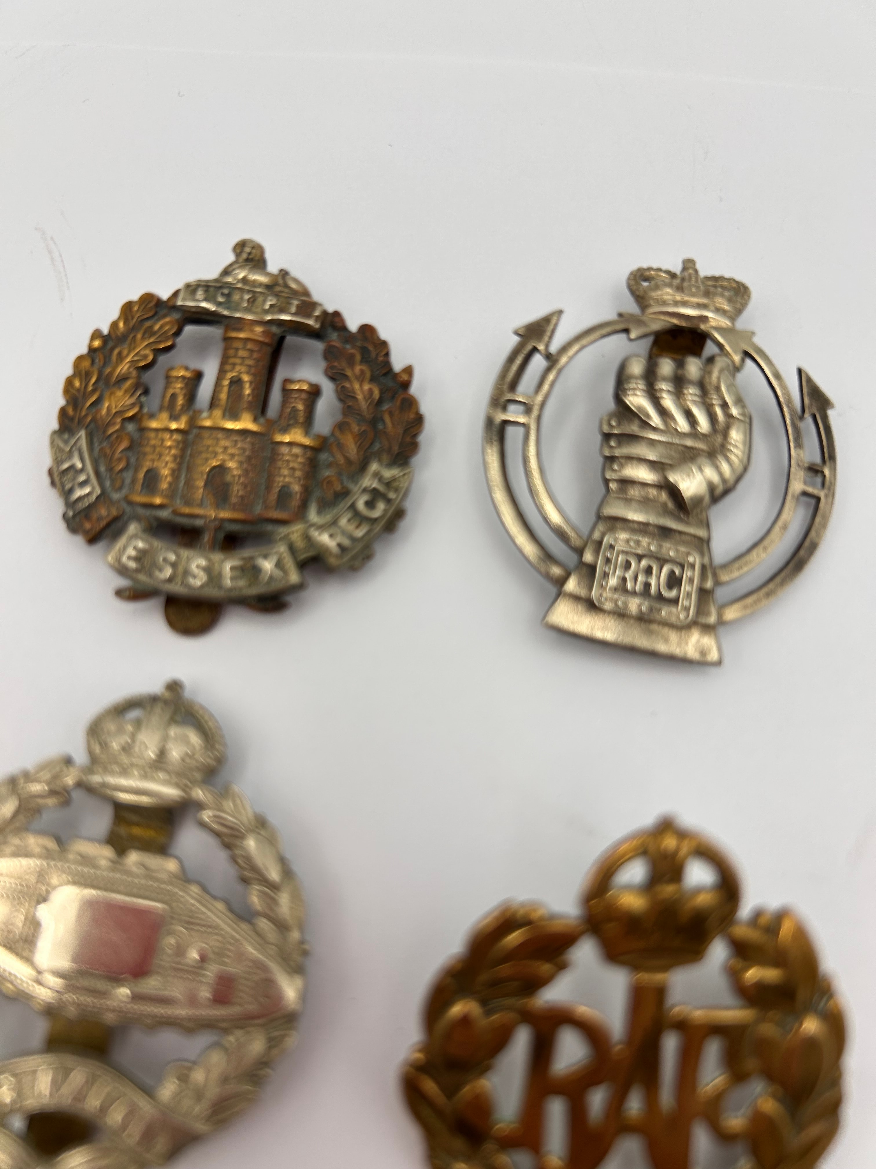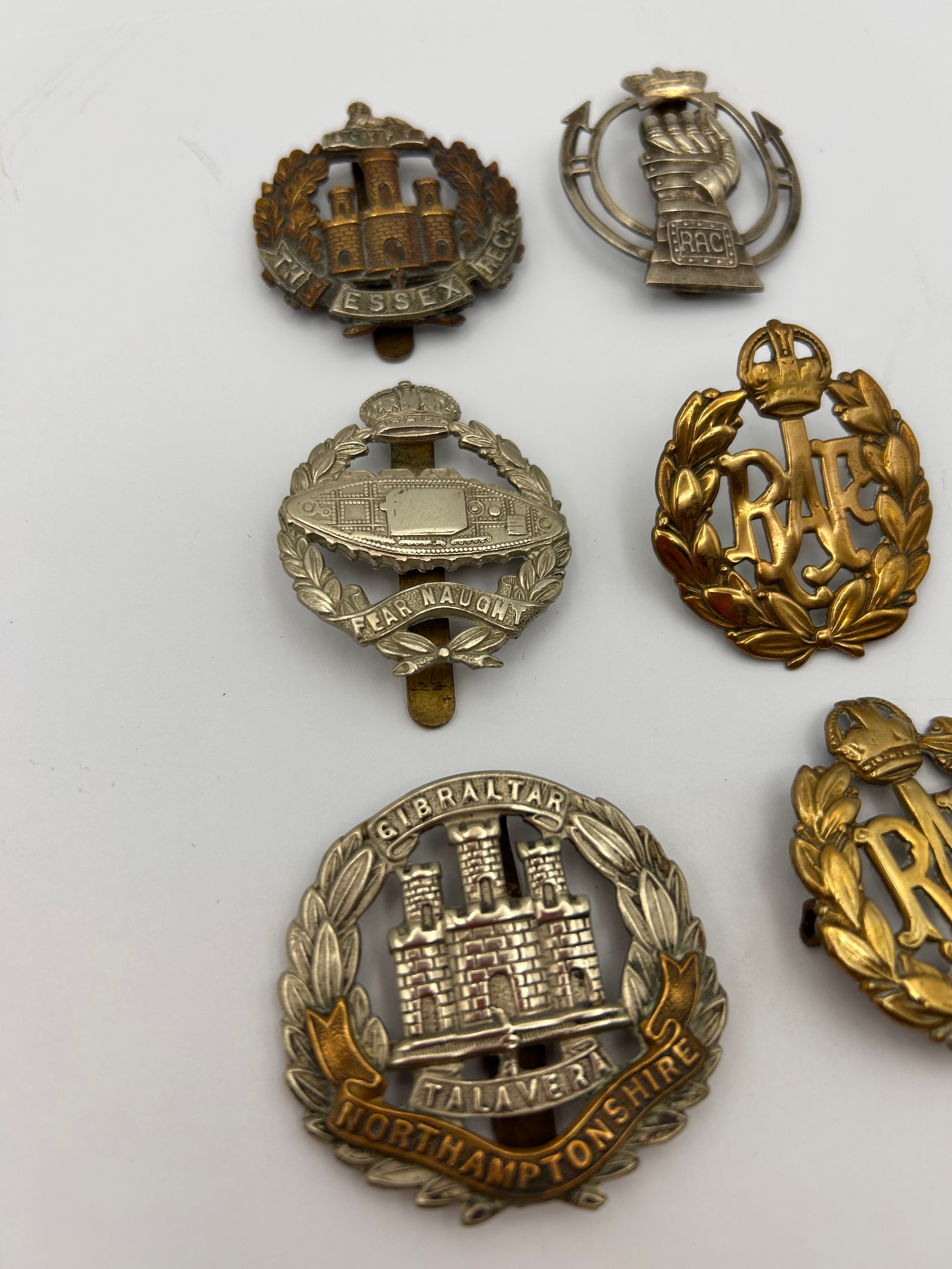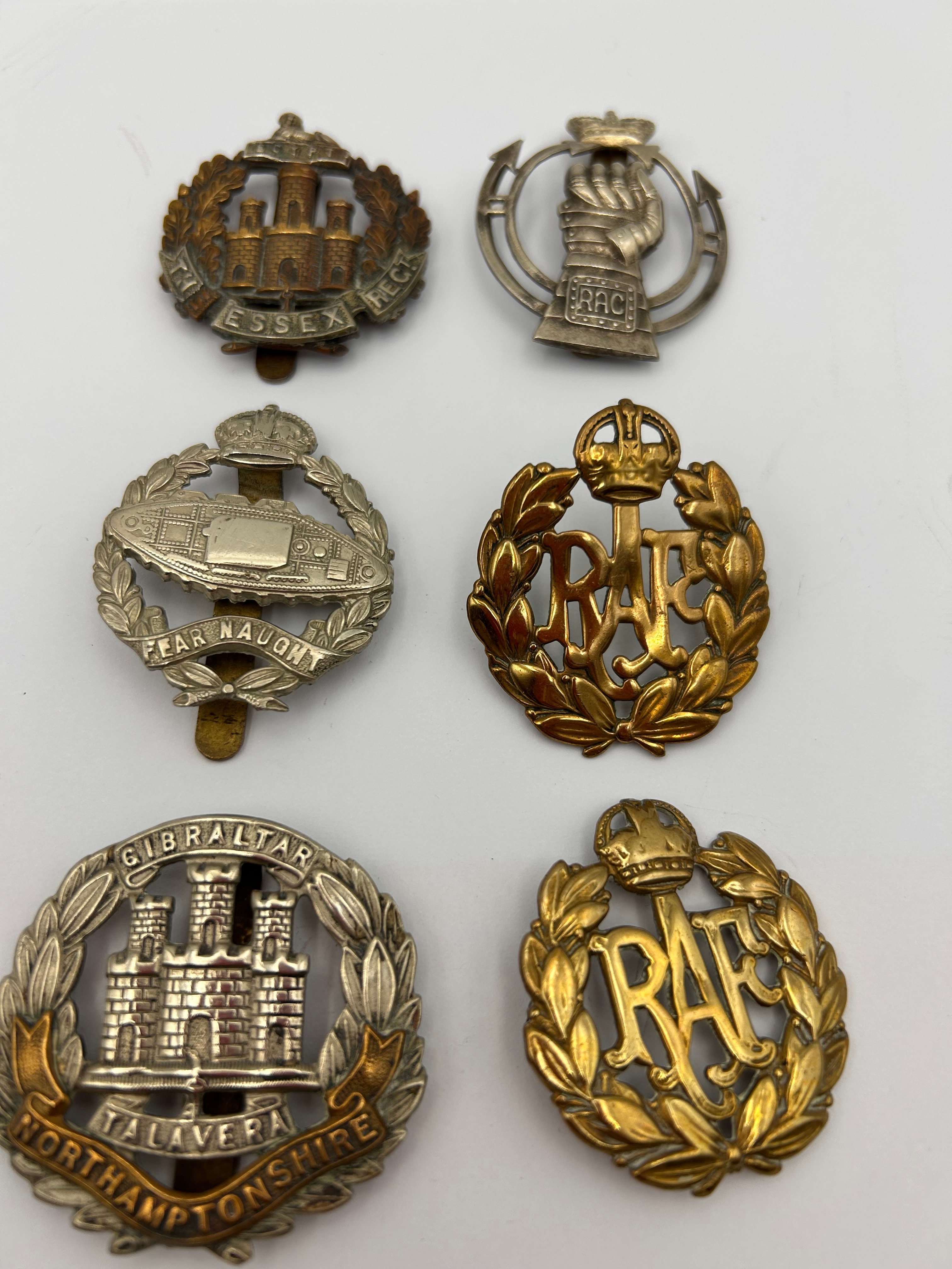 A collection of six 20th-century British military cap badges. The collection comprises two Royal Air Force (RAF) King’s Crown cap badges, each featuring the ‘RAF’ monogram within a laurel wreath and surmounted by a crown, consistent with examples from the WWII to circa 1950 period. Further examples include a bimetal regimental badge for ‘THE ESSEX REGT’ depicting a castle, and another bimetal regimental badge for ‘NORTHAMPTONSHIRE’ featuring a castle and battle honours ‘GIBRALTAR’ and ‘TALAVERA’. Also present are a monometal white metal badge with a tank and the motto ‘FEAR NAUGHT’, and a white metal badge for the Royal Armoured Corps (RAC) depicting a gauntlet. The badges are primarily of bimetal construction (brass/gilt and white metal) or monometal white metal/gilt.