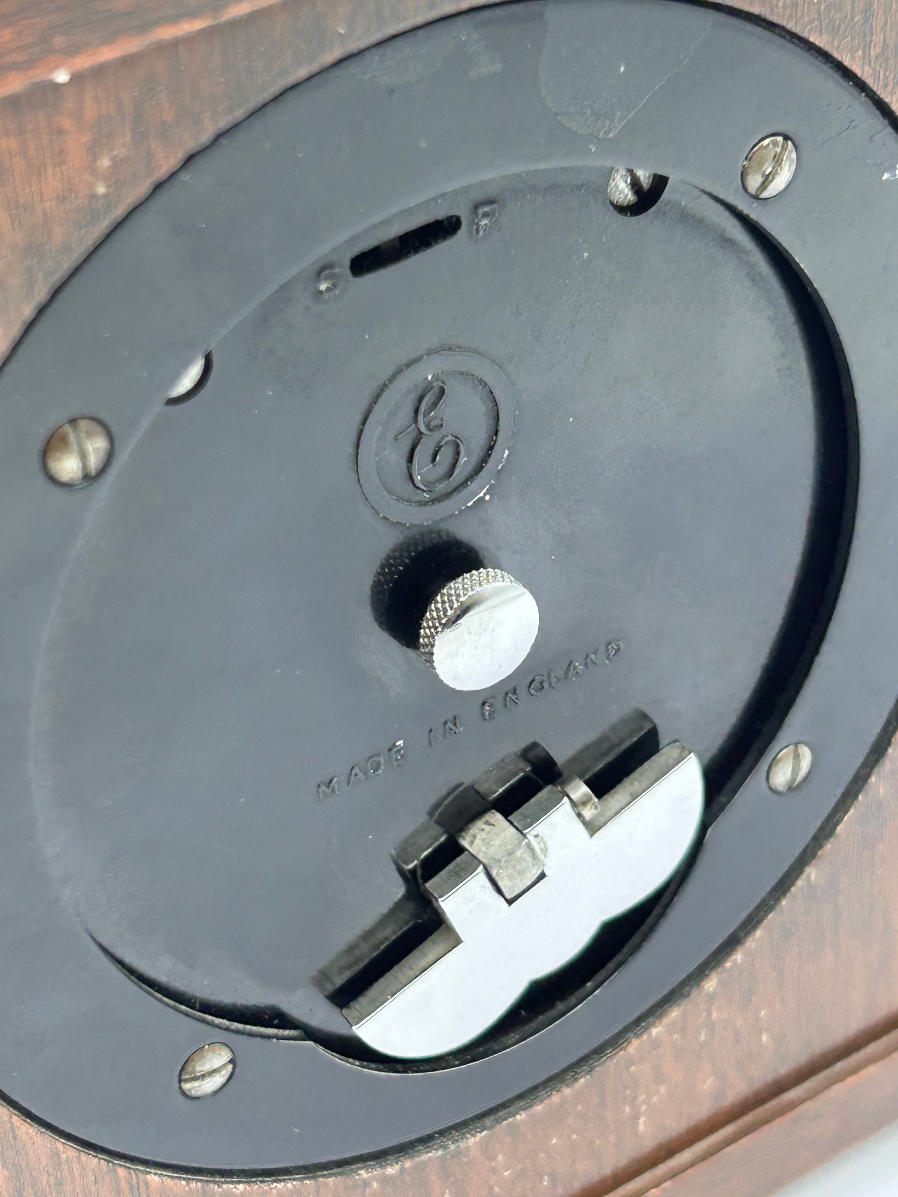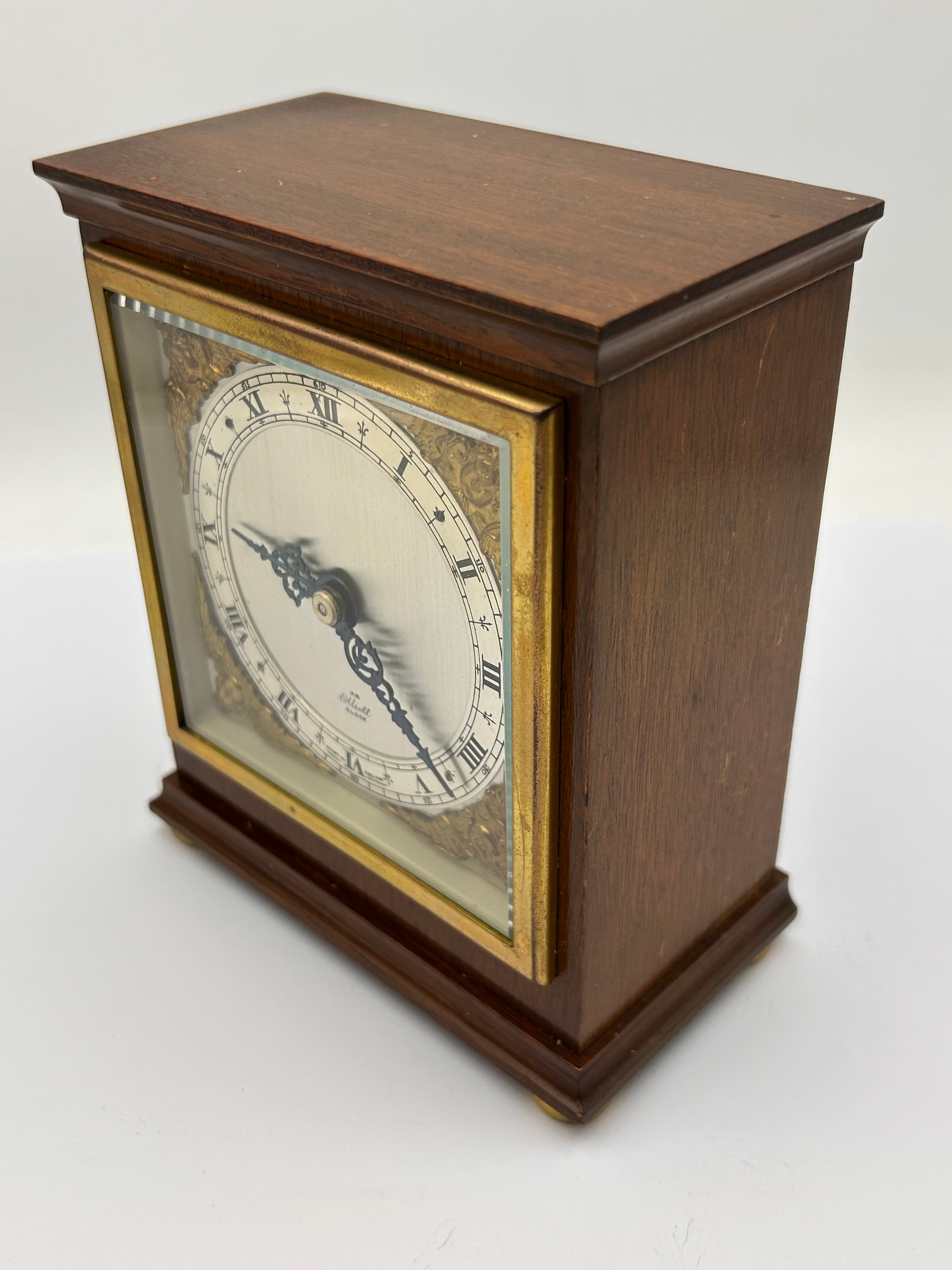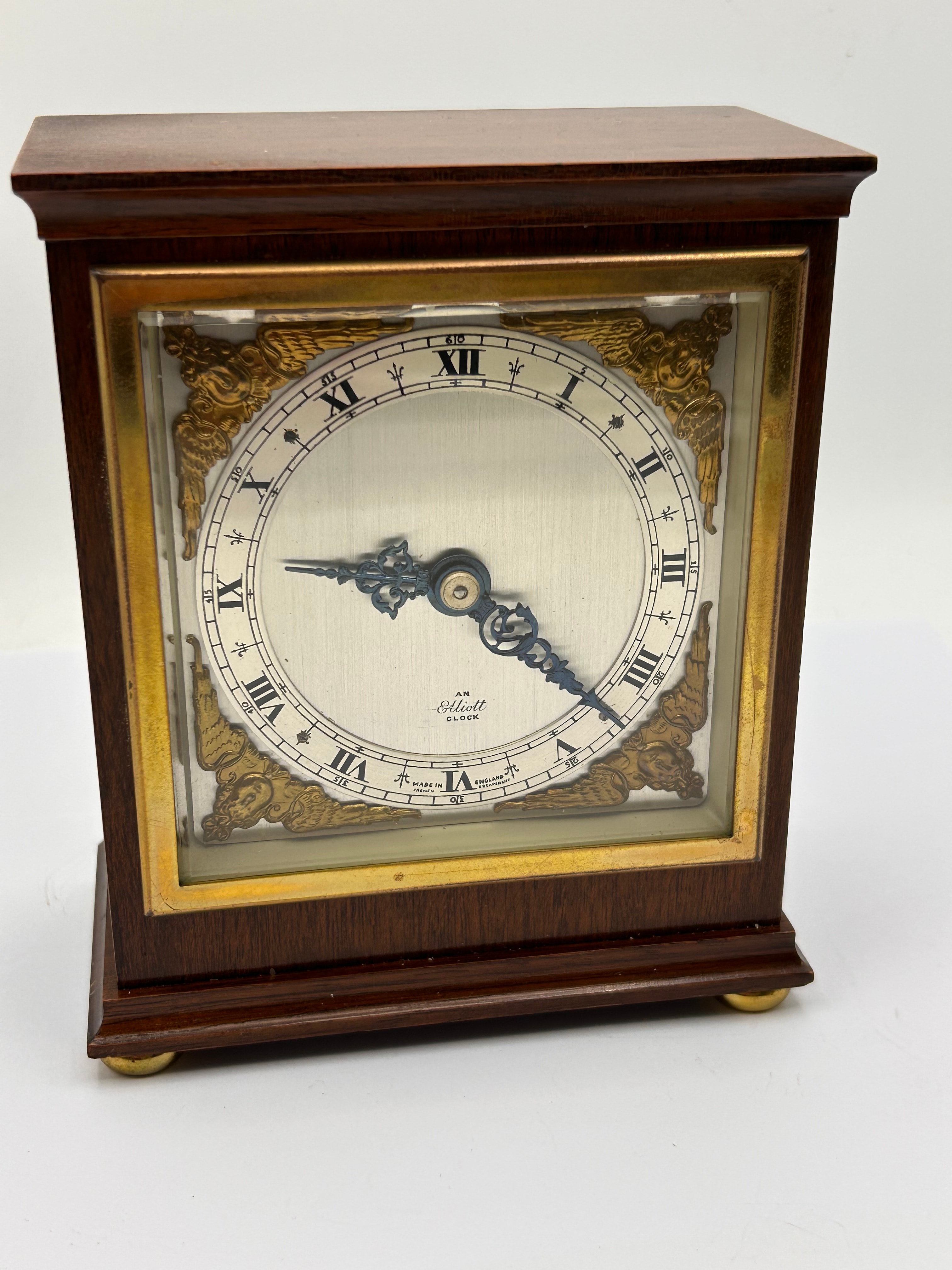 An English Elliott wooden cased mantel or desk clock. This traditional-style clock features a dark-stained rectangular wooden case resting on four brass-toned spherical feet. The front presents a glass-covered cream-colored dial framed by a brass-toned metal bezel and decorative spandrels, displaying Roman numeral hour markers and Arabic minute/second markers with ornate black hands. Visible text on the dial includes “THE SHETT CLOCK,” “MADE IN ENGLAND,” “FOREIGN PATS PENDING,” and “J.S.M.LTD.” The reverse side shows a black metal access panel further marked “MADE IN ENGLAND” and with a stylized ‘E’ logo.
