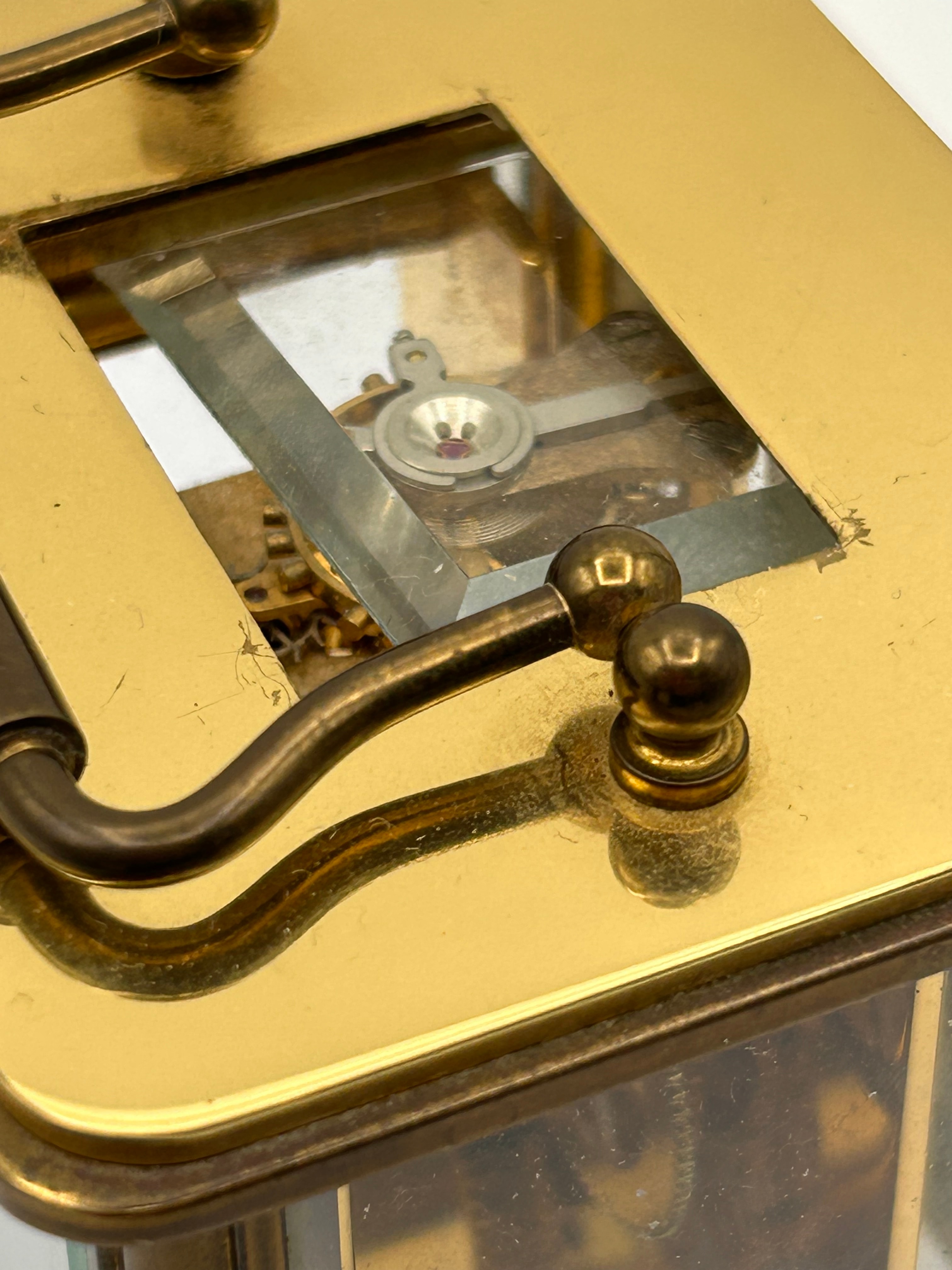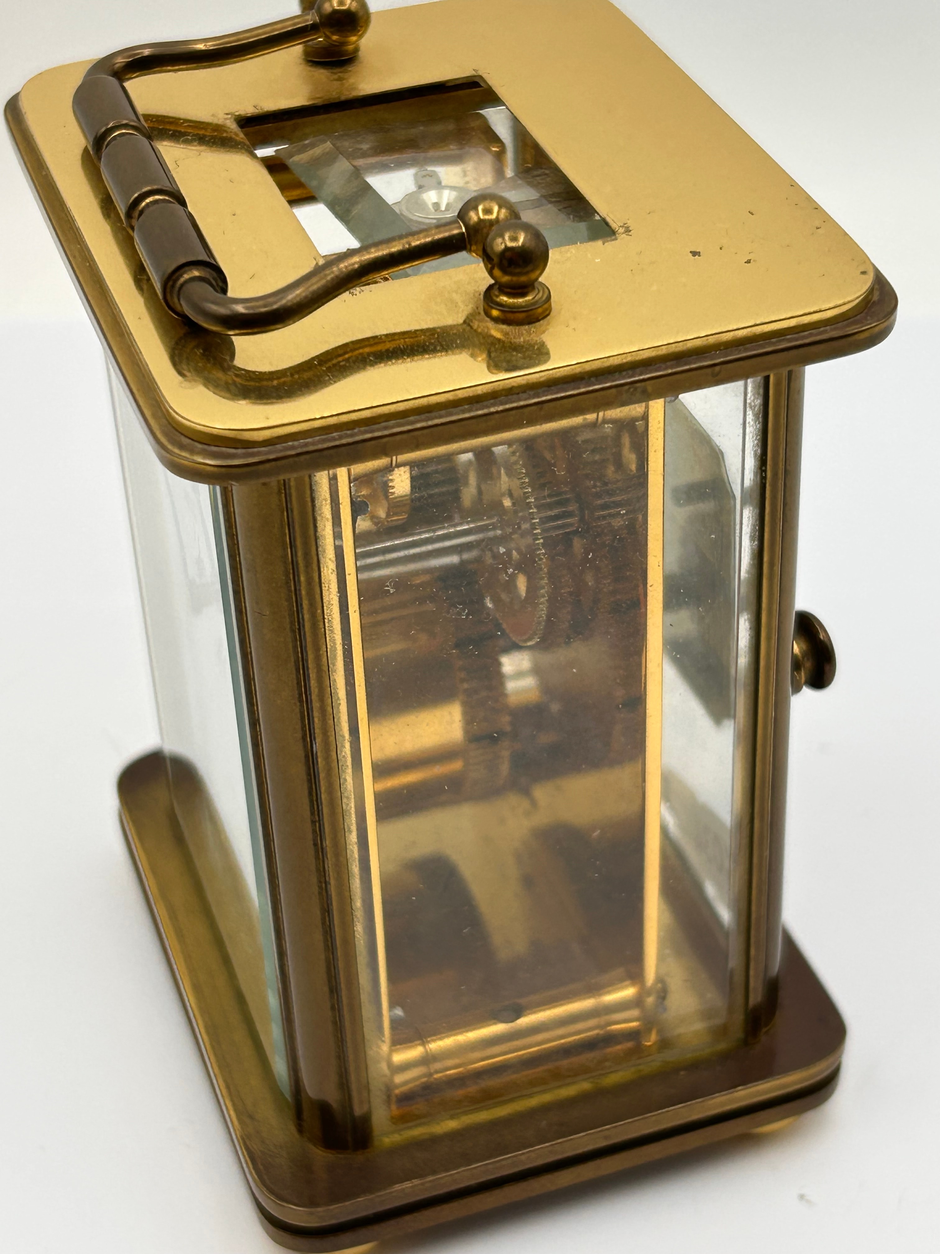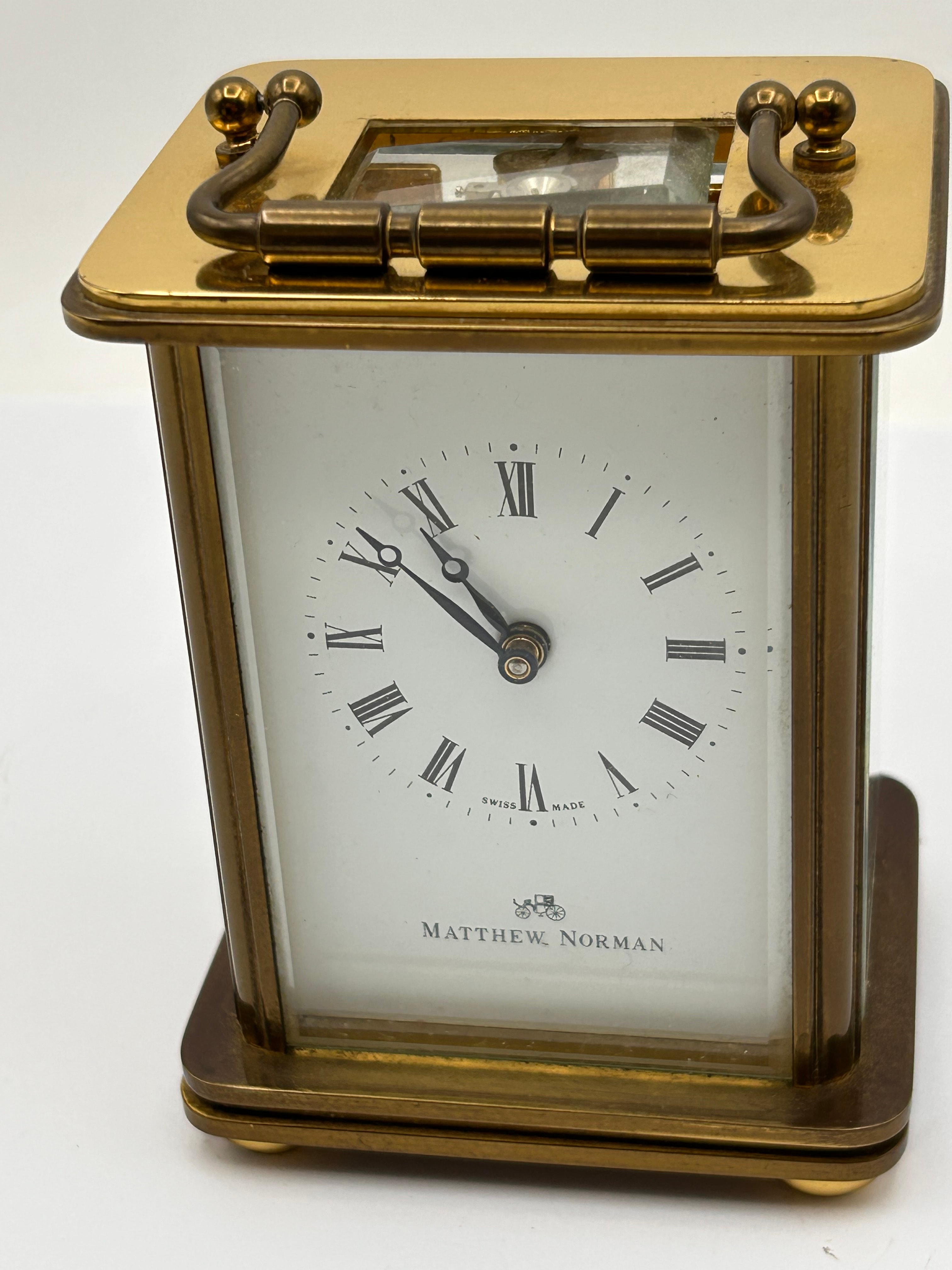 A Matthew Norman Brass and Glass Carriage Clock, featuring a rectangular case with five clear beveled glass panels and a hinged brass carrying handle. The white dial displays Roman numerals and black spade hands, with “MATTHEW NORMAN” and a carriage logo printed below the center, and “SWISS MADE” visible at the six o’clock position. The visible movement can be seen through the glass panels and a rectangular viewing window on the top plate.