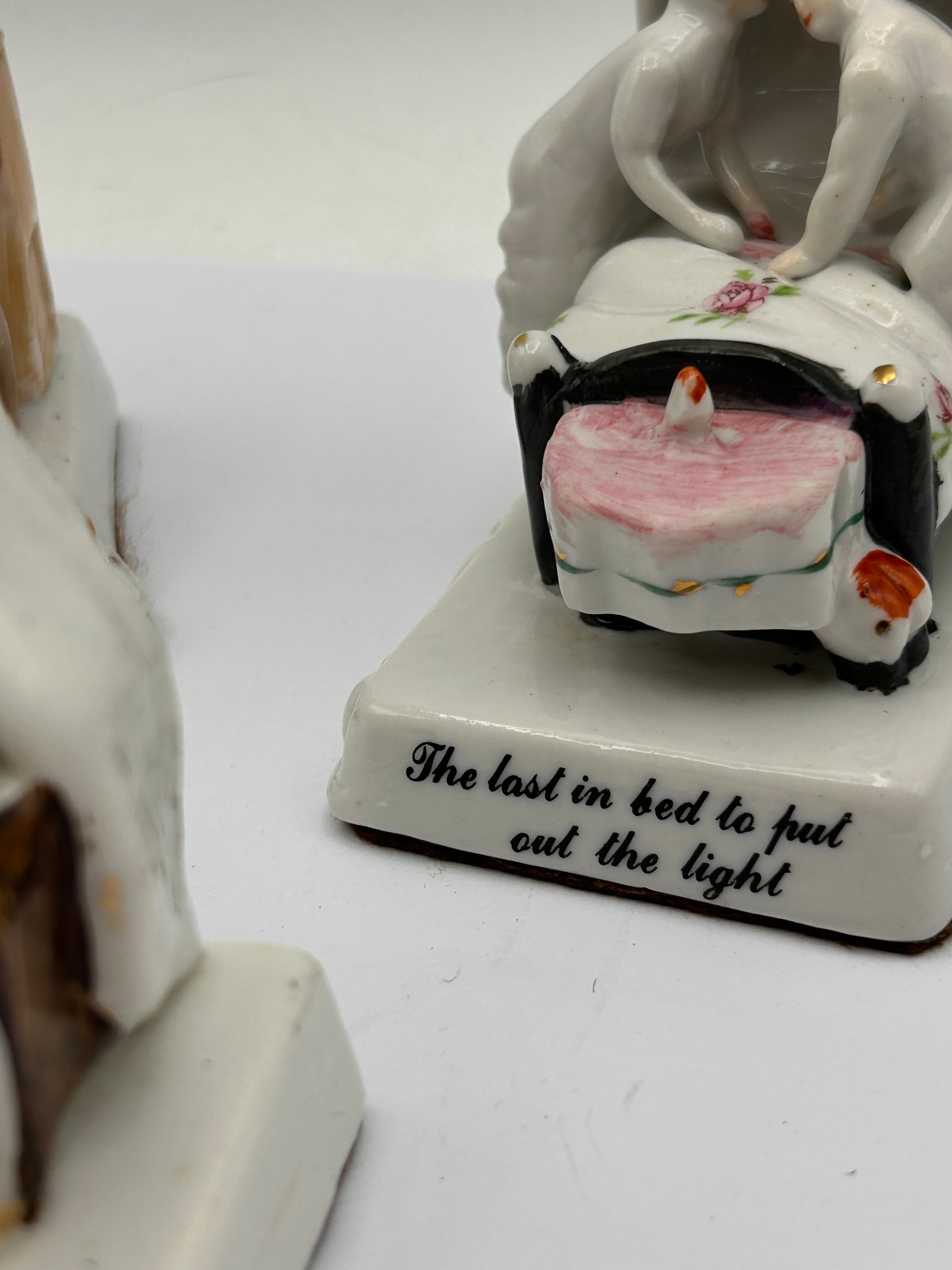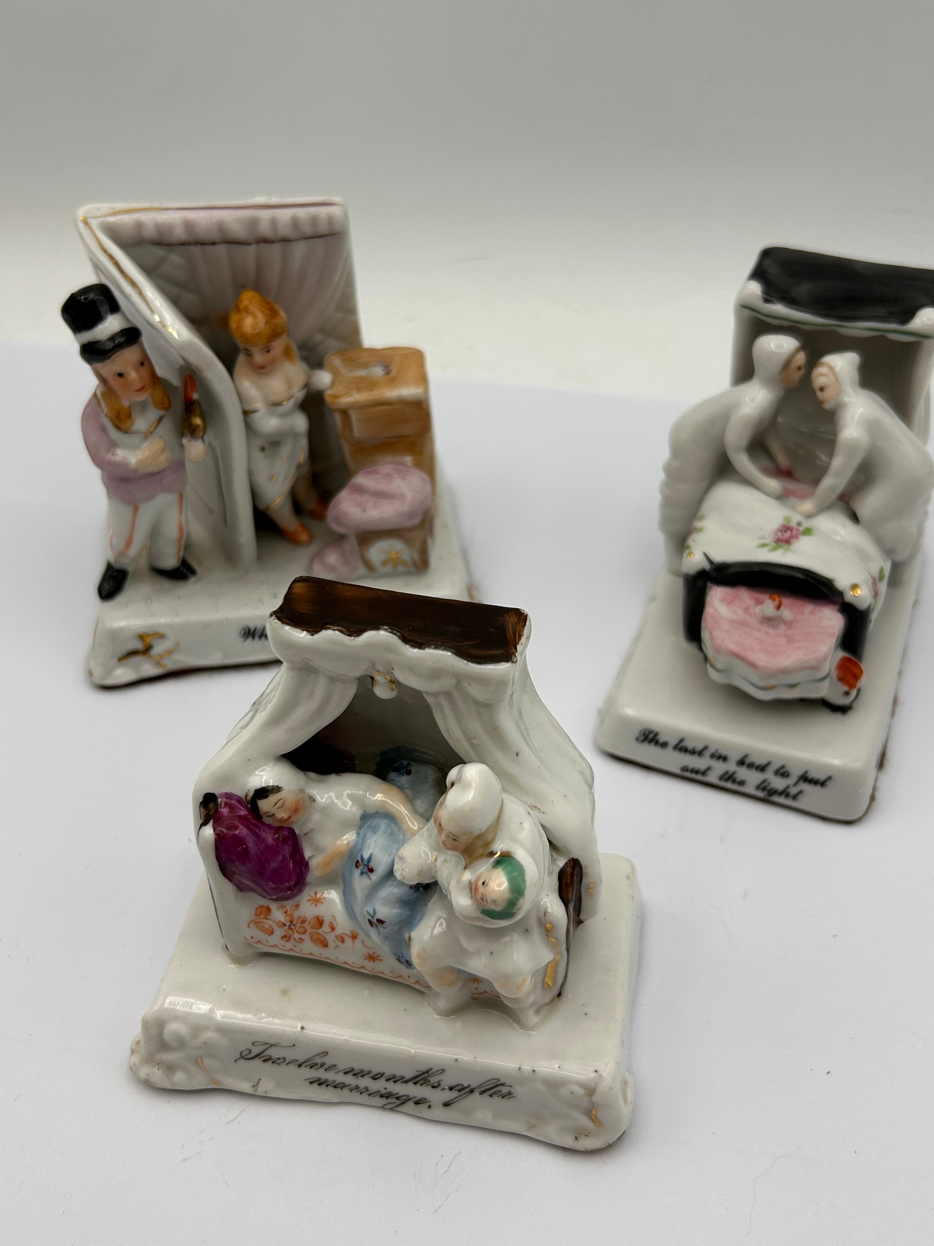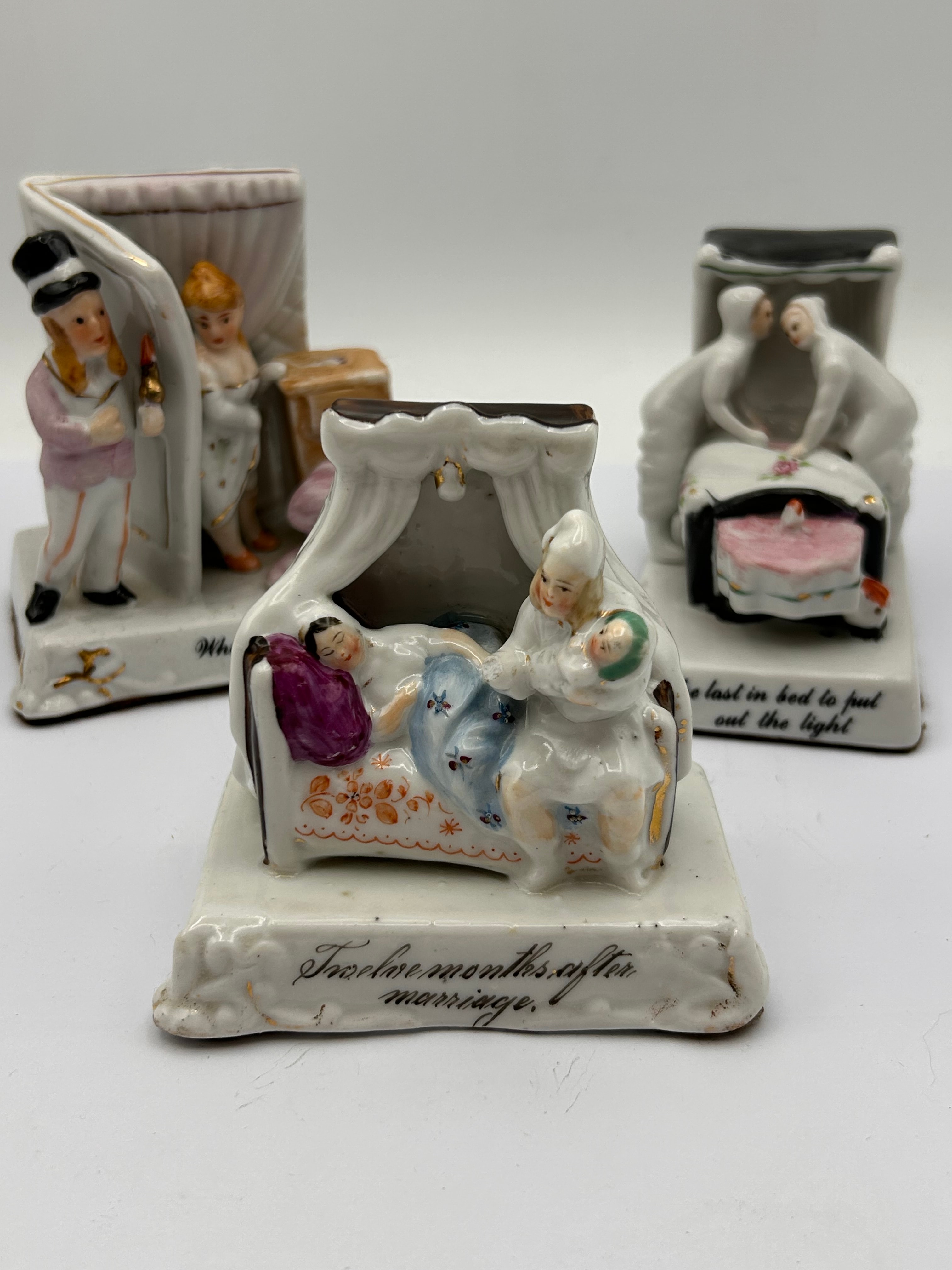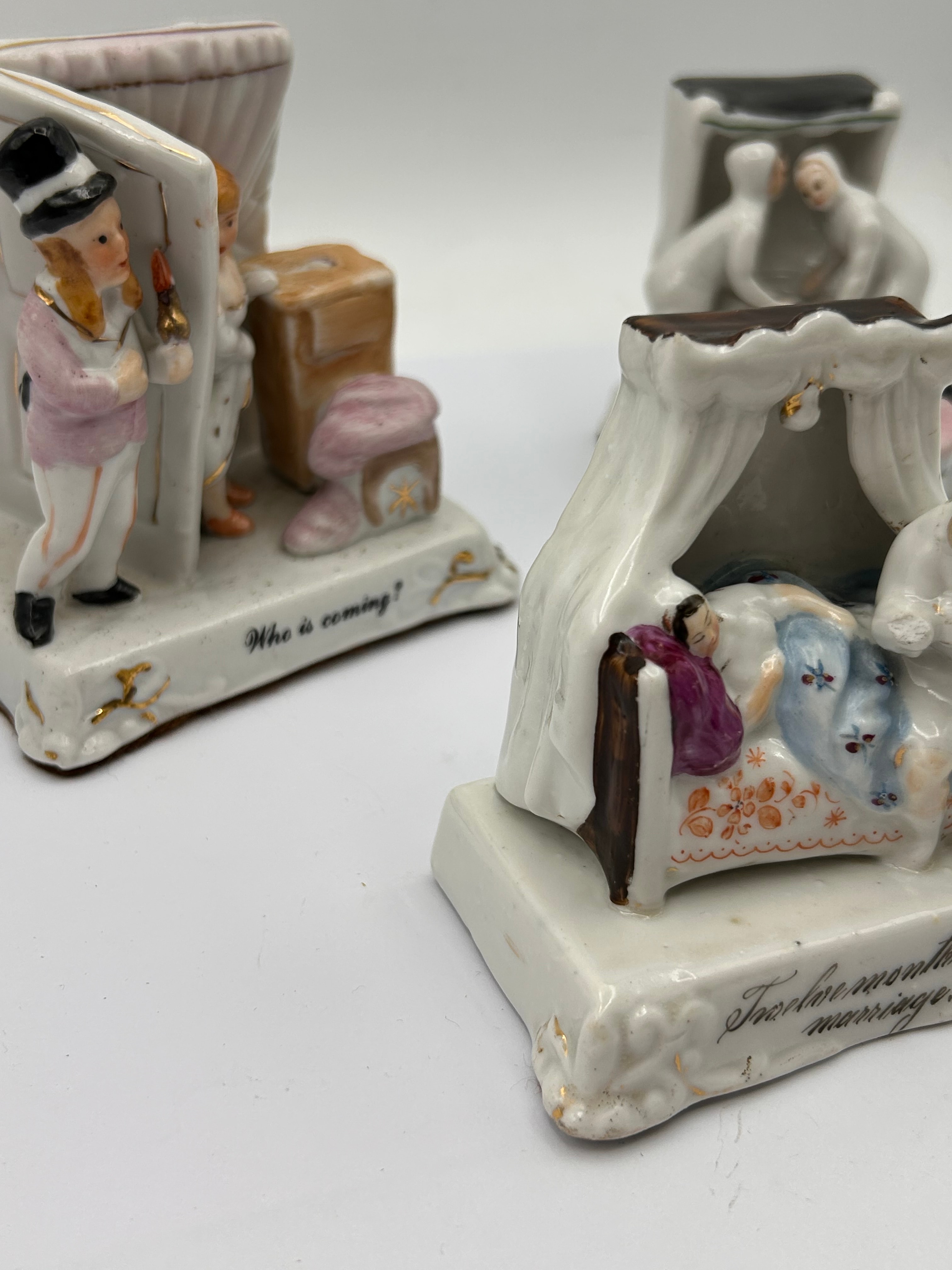A group of three Victorian German porcelain fairings, each designed as a hand-painted ceramic spill vase or match holder. Each piece depicts a distinct domestic vignette related to marriage and family life, executed in a sentimental, figurative style suggestive of the late 19th to early 20th century. Each features a rectangular base with gilded accents and an open back. The scenes include: a man with a candle near a curtain, captioned ‘Who is coming?’; a couple in bed reaching for a candle, captioned ‘The last in bed to put out the light’; and a woman in a canopy bed with a nurse holding an infant, captioned ‘Twelve months after marriage.’