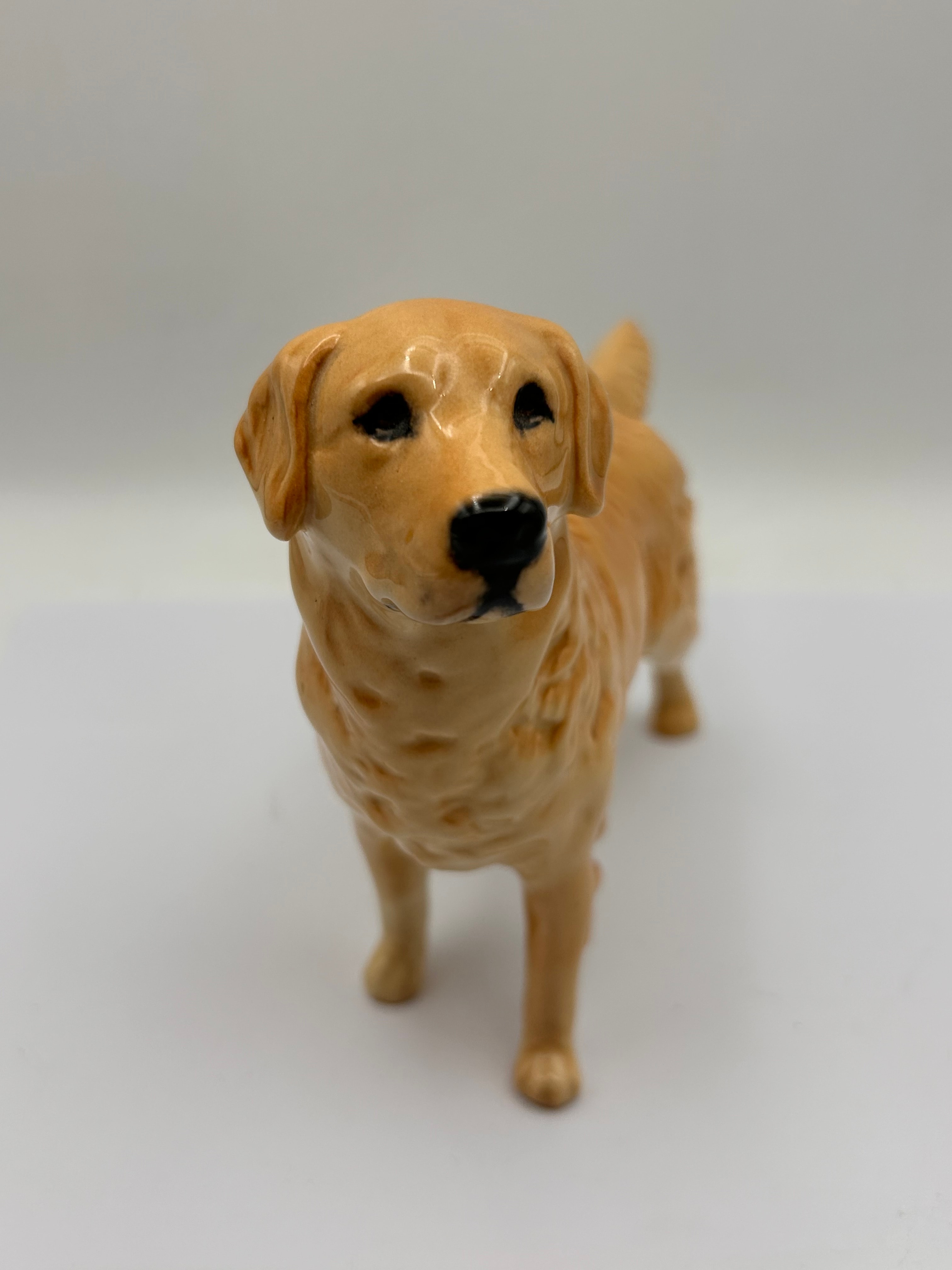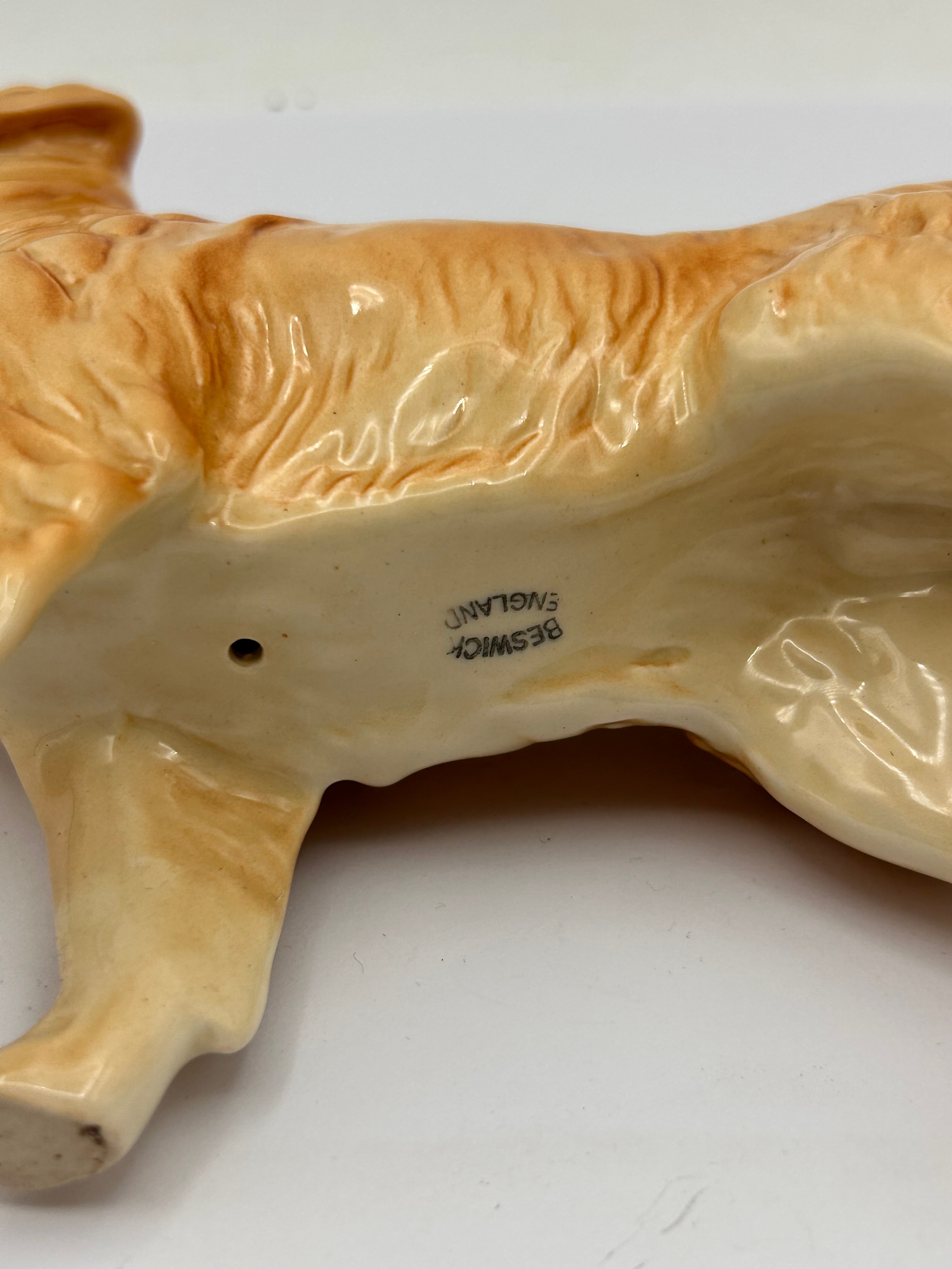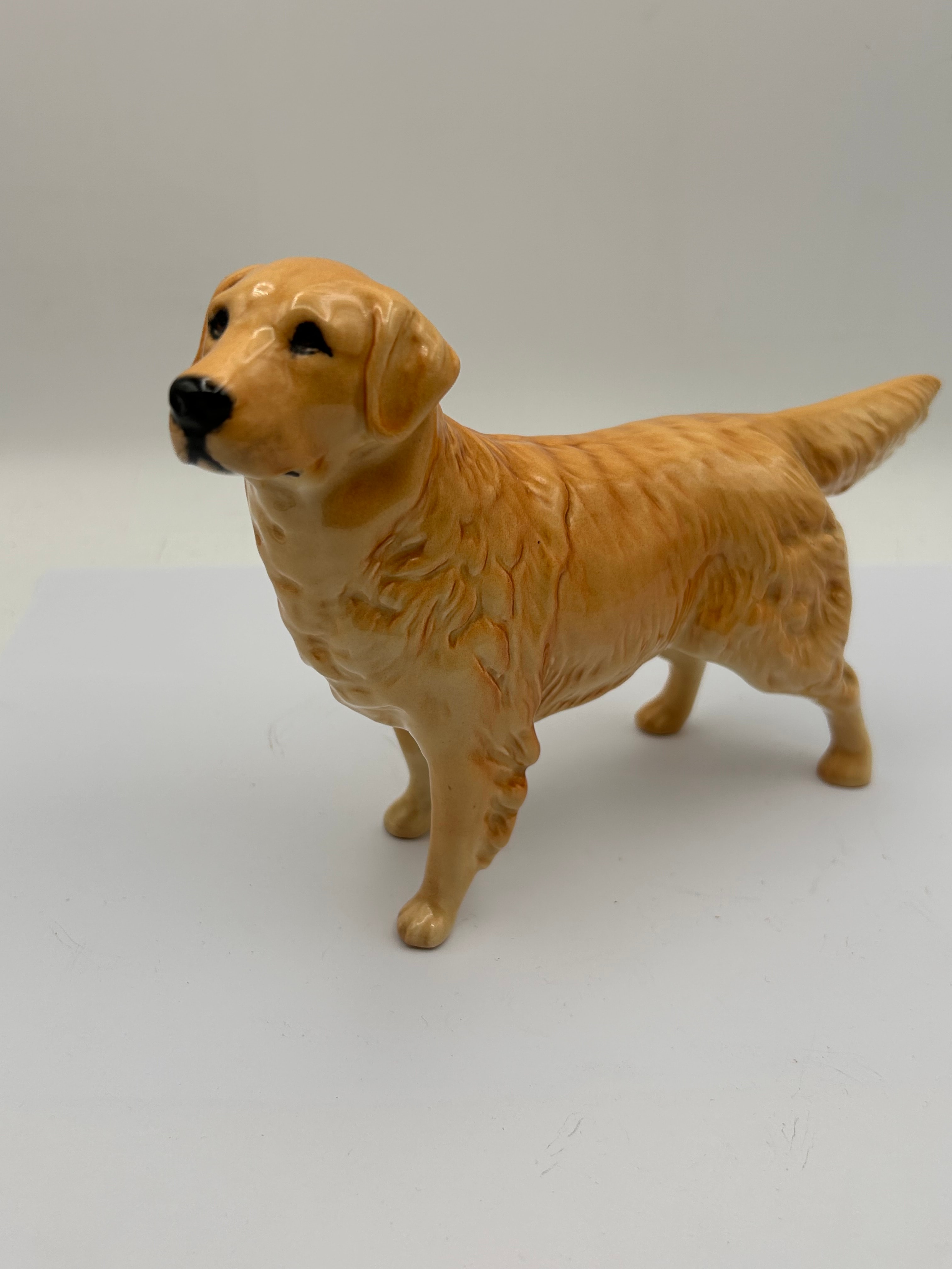 A Beswick ceramic figurine depicting a Golden Retriever, known as ‘Cabus Cadet’, Model No. 2287. The standing dog is rendered in a realistic style with a glossy finish, primarily in an amber or golden-brown color, accented with black detailing for the eyes and nose. The underside bears the impressed mark ‘BESWICK ENGLAND’.