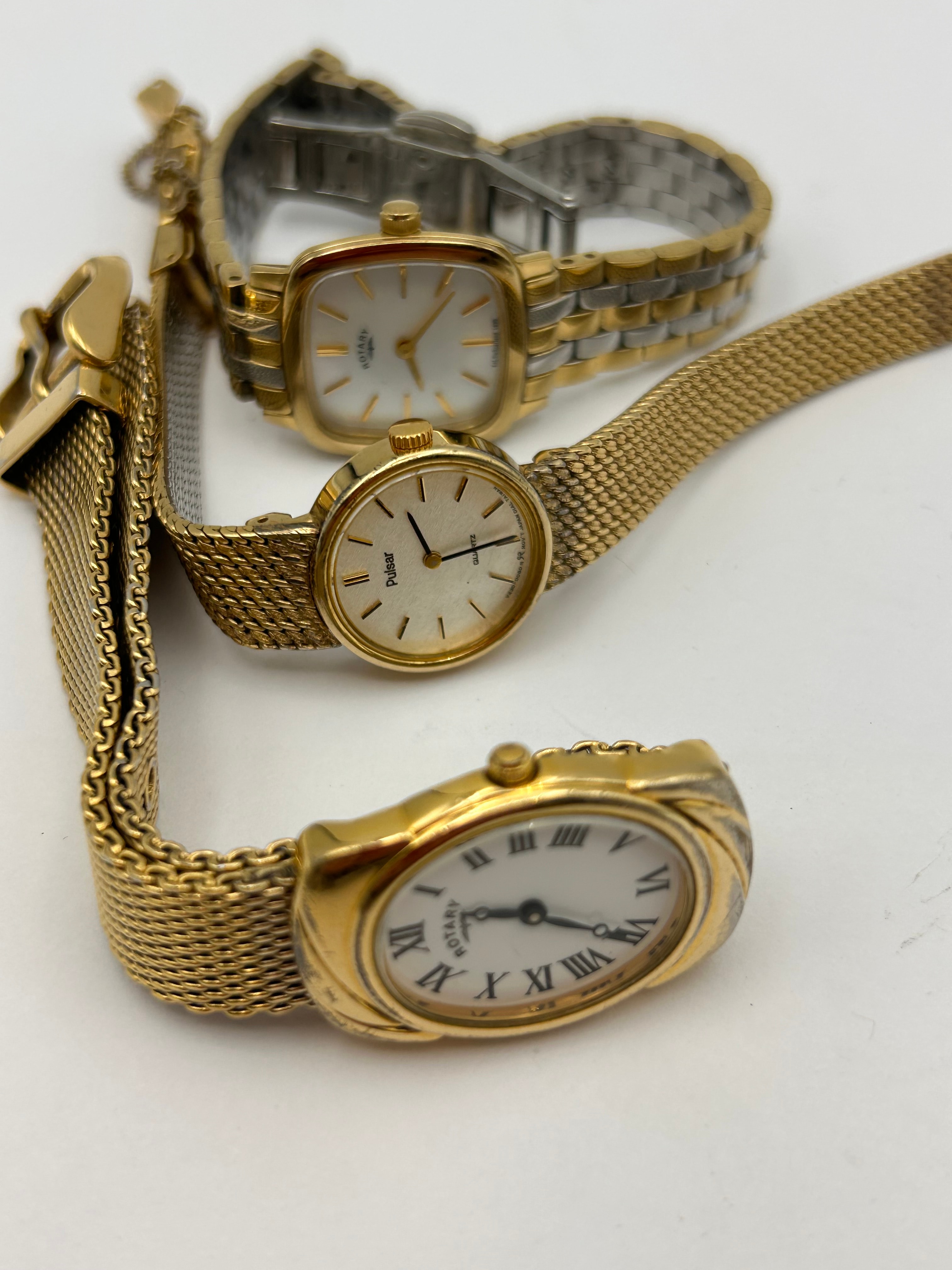 A group of three ladies’ quartz wristwatches, likely dating from the late 20th to early 21st century, predominantly featuring gold-tone metal construction. The lot includes an oval gold-tone ROTARY timepiece with a white dial and Roman numerals, fitted with a gold-tone mesh bracelet. Also present is a round gold-tone Pulsar QUARTZ watch with a white dial and stick markers, on a gold-tone mesh bracelet. The third watch is a ROTARY QUARTZ GS.N 1000 with a square-cushion gold-tone case, a white dial with stick markers, and a two-tone gold-tone and stainless steel link bracelet.