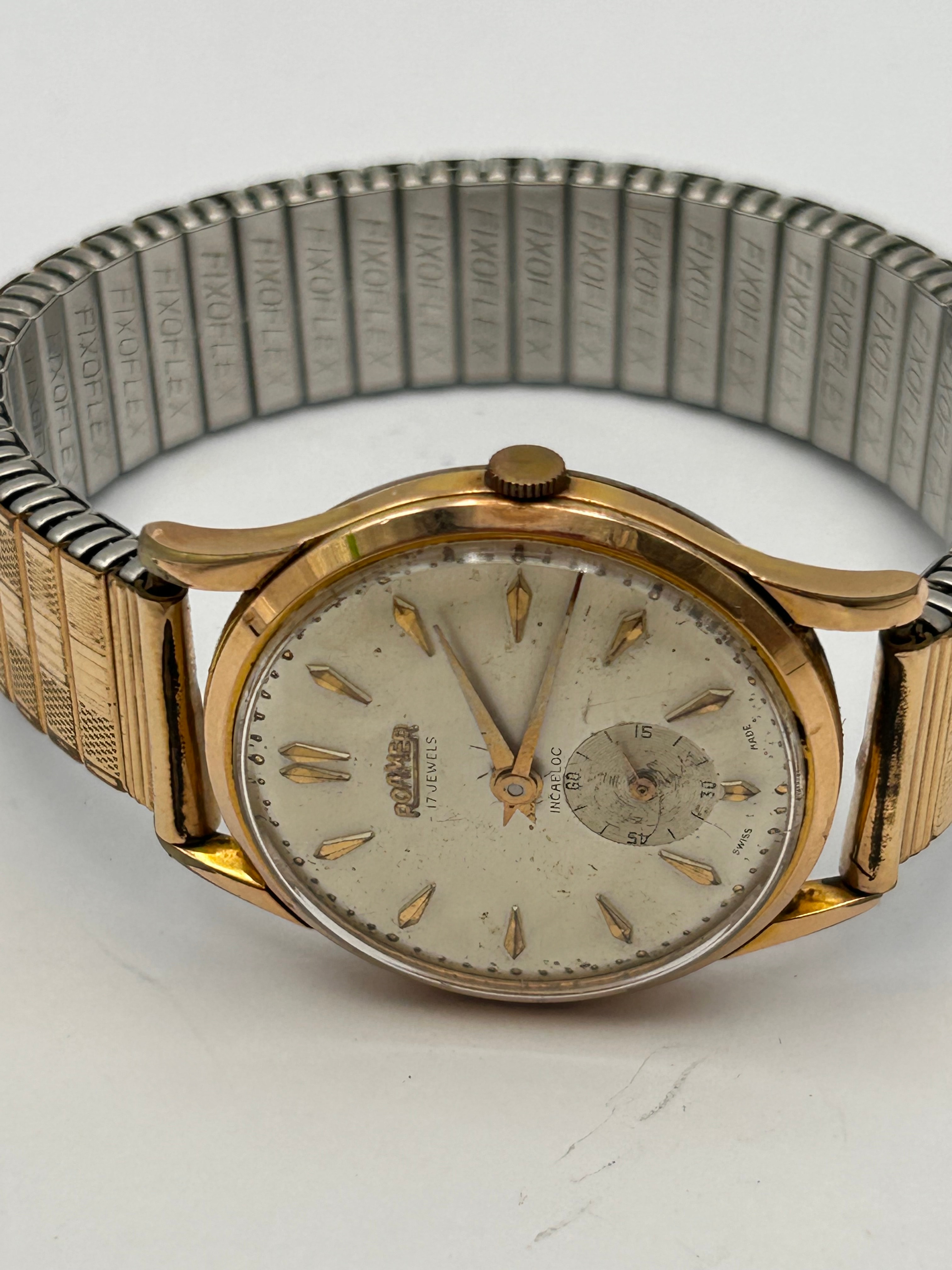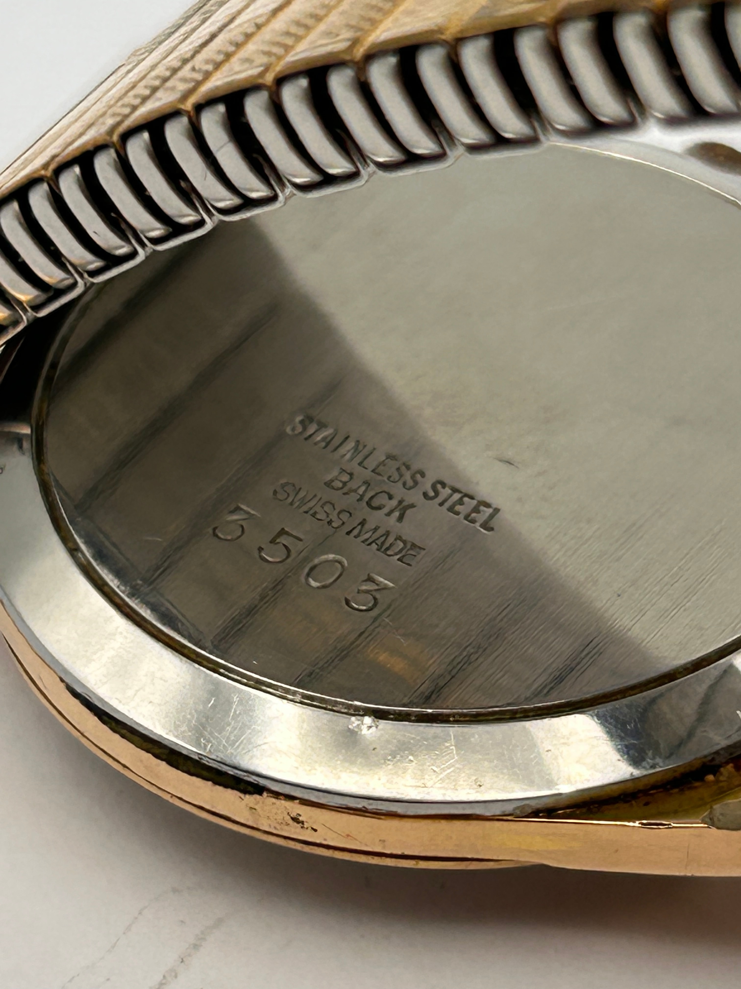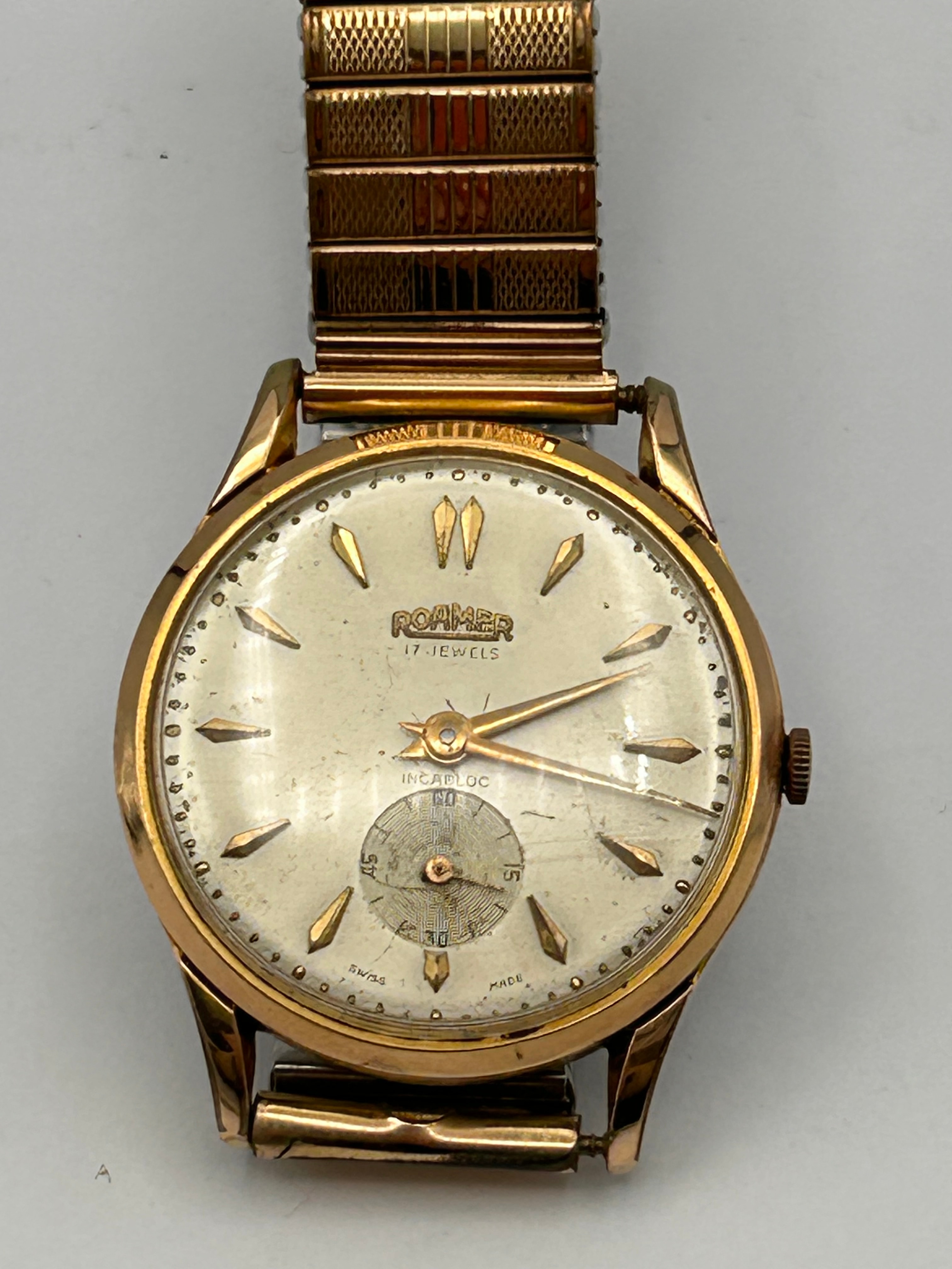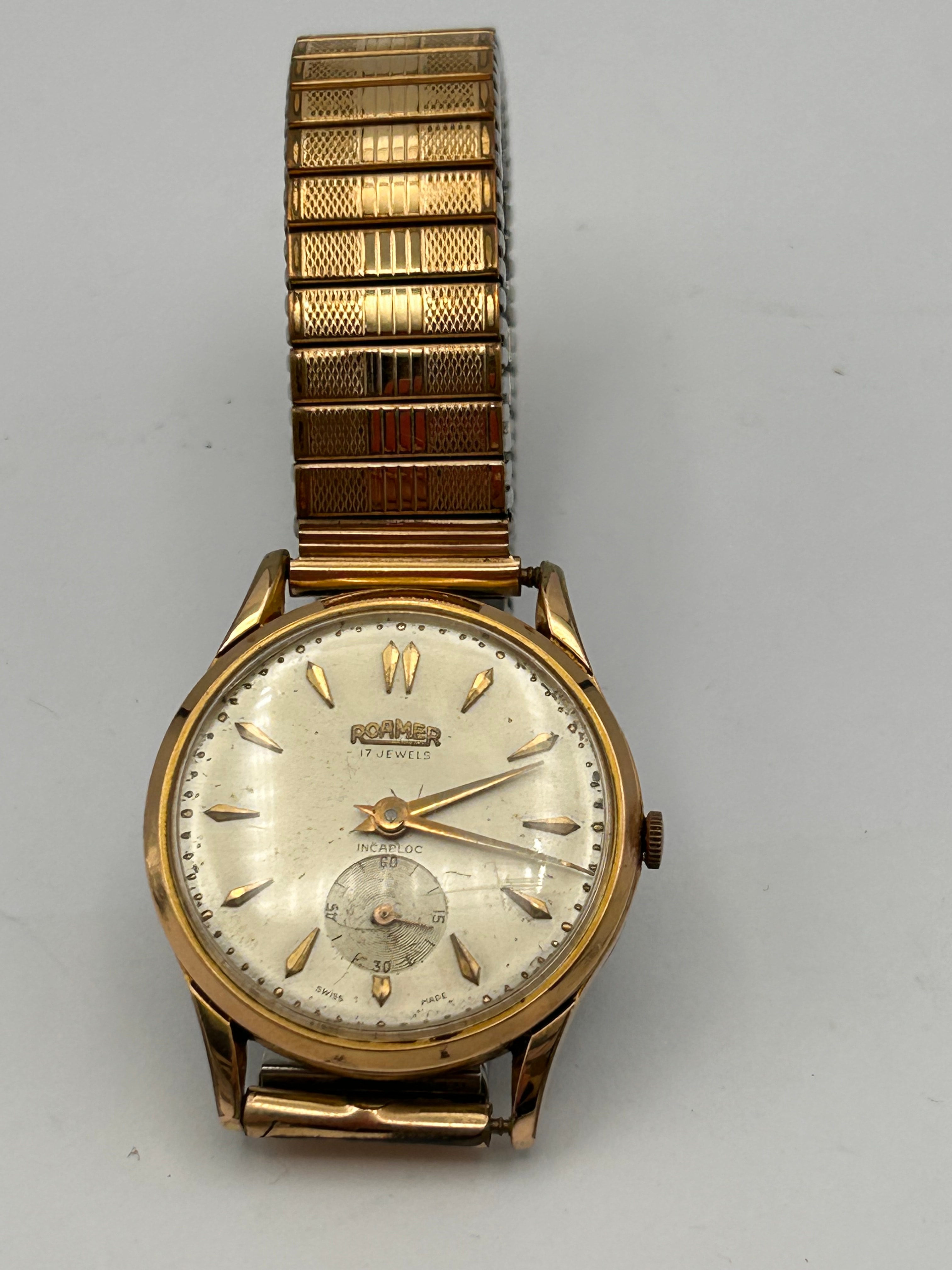 A Vintage Gentleman’s Roamer Gold Plated 17 Jewel Incabloc Wristwatch, circa 1950s-1960s, featuring a round case and a white or silver-tone dial with applied gold-tone markers, dauphine hands, and a sub-seconds register at 6 o’clock. The dial is marked “ROAMER”, “17 JEWELS”, “INCABLOC”, and “SWISS MADE”. The stainless steel case back bears inscriptions “STAINLESS STEEL BACK”, “SWISS MADE”, and the number “3503”. The watch is fitted with a gold-tone metal expansion bracelet repeatedly marked “FIXOFLEX”. The case size is approximately 38mm.