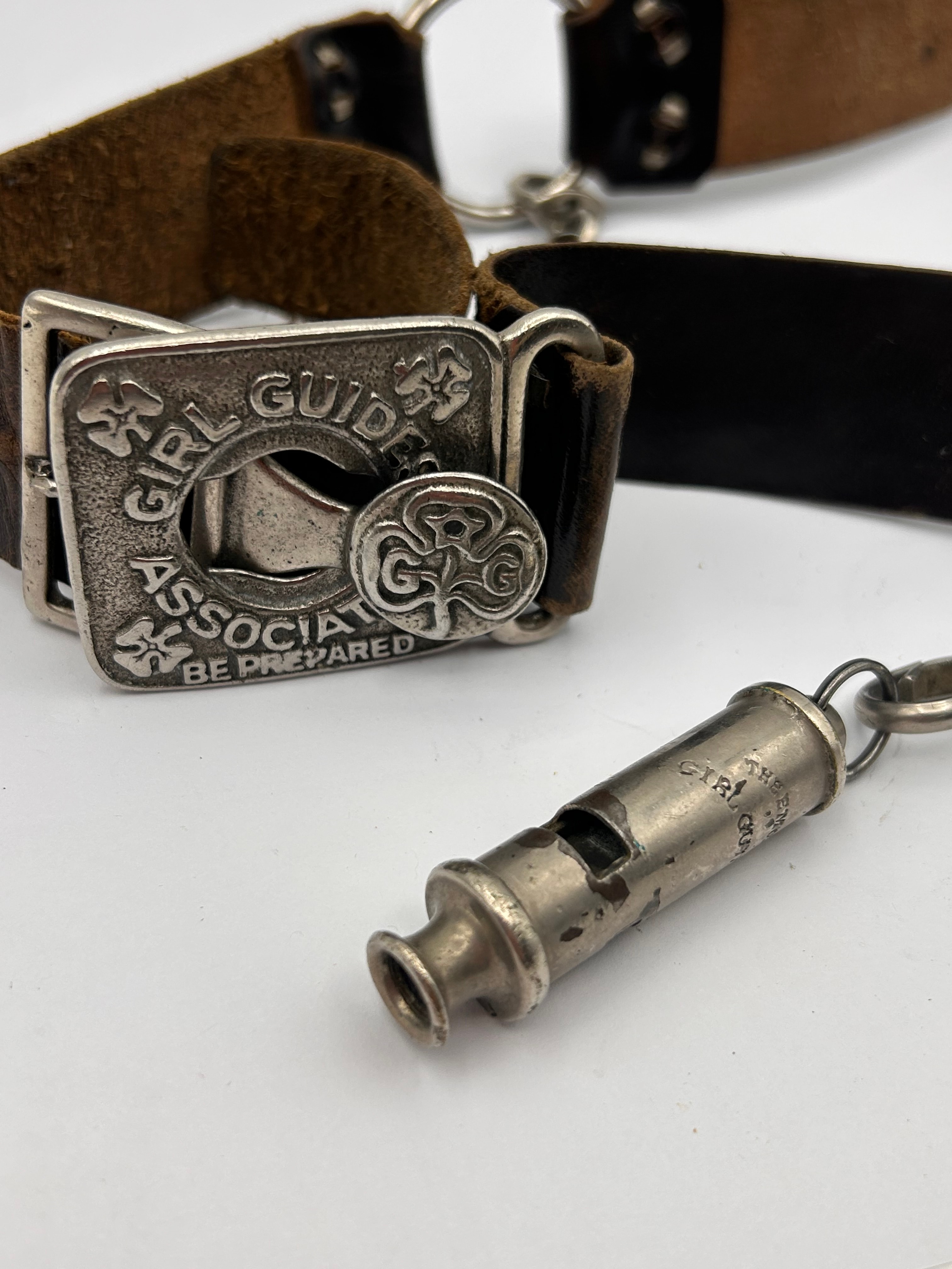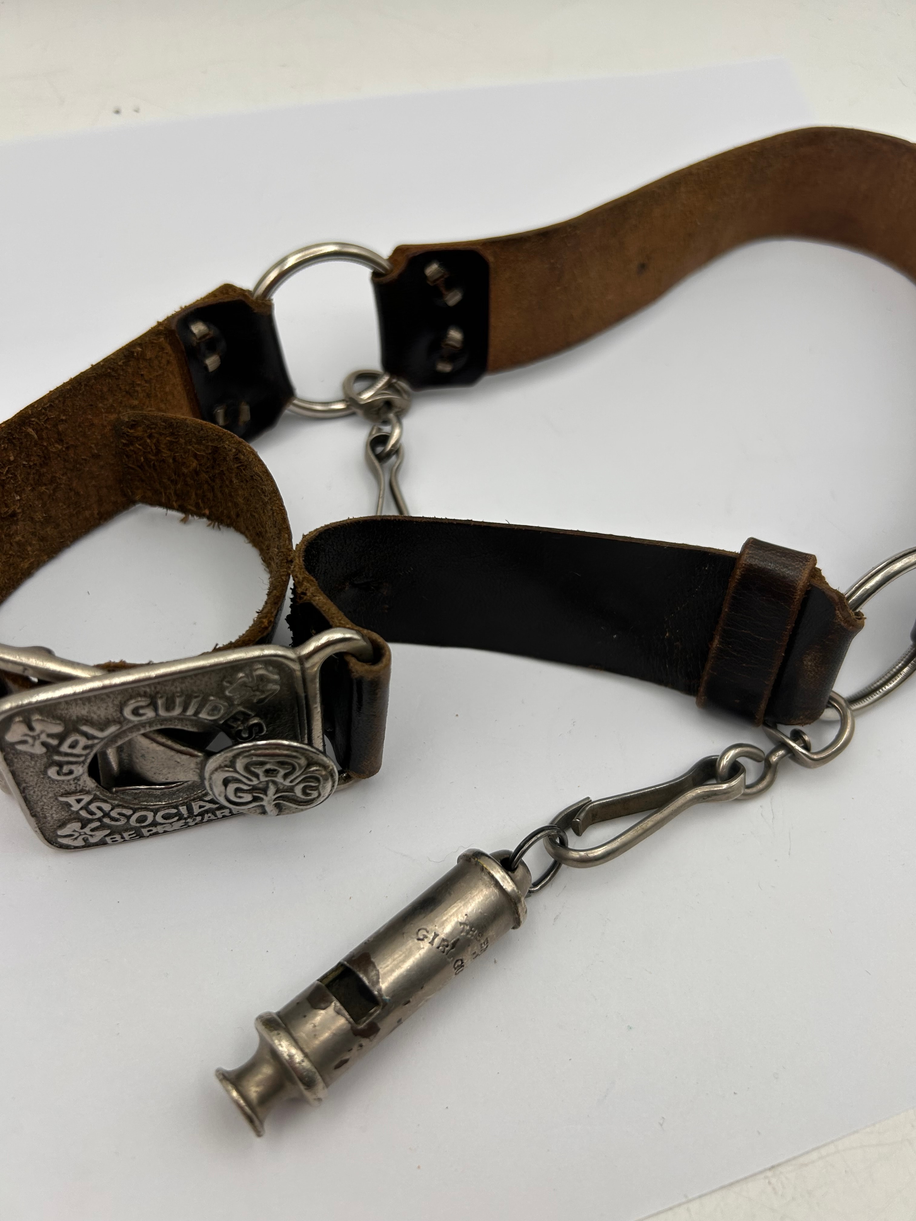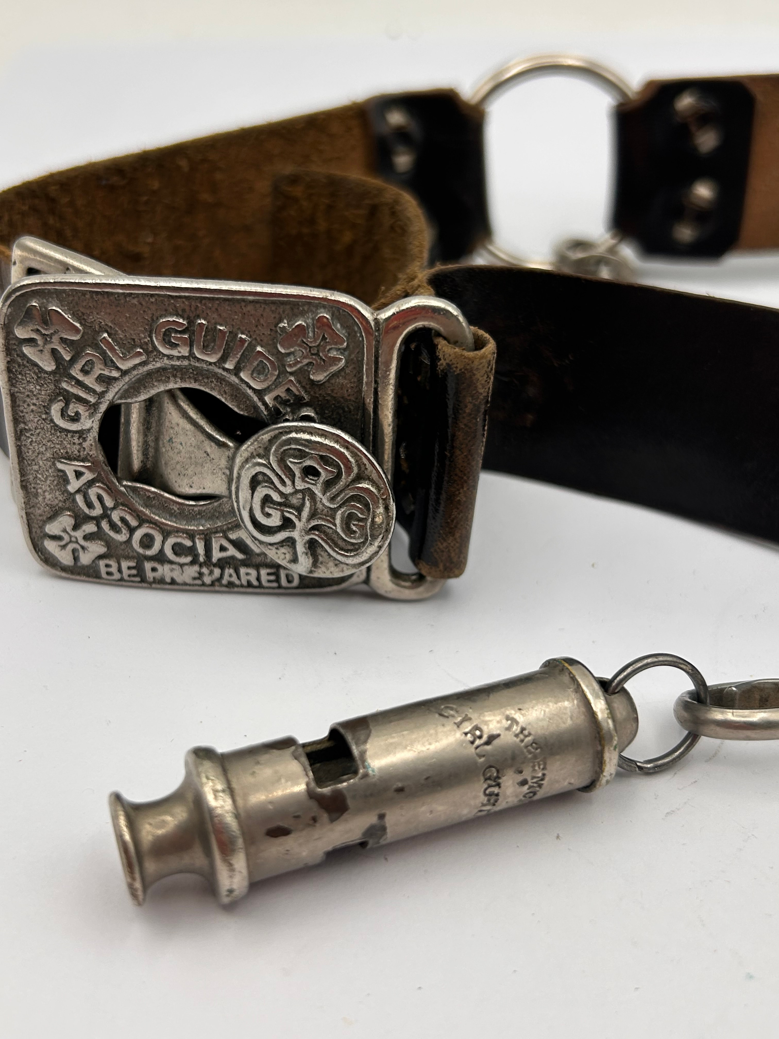 A vintage Girl Guides uniform belt assembly with original whistle. The assembly comprises brown leather sections, featuring both lighter and darker tones, connected by silver-tone metal rings. A prominent silver-tone metal buckle is deeply embossed with “GIRL GUIDE ASSOCIATION” and the motto “BE PREPARED,” encircling a trefoil emblem containing the initials “G.G.” Attached to the belt via a chain and clasp is a silver-tone metal whistle, which is engraved with “THE GIRL GUIDE WHISTLE” on its side.