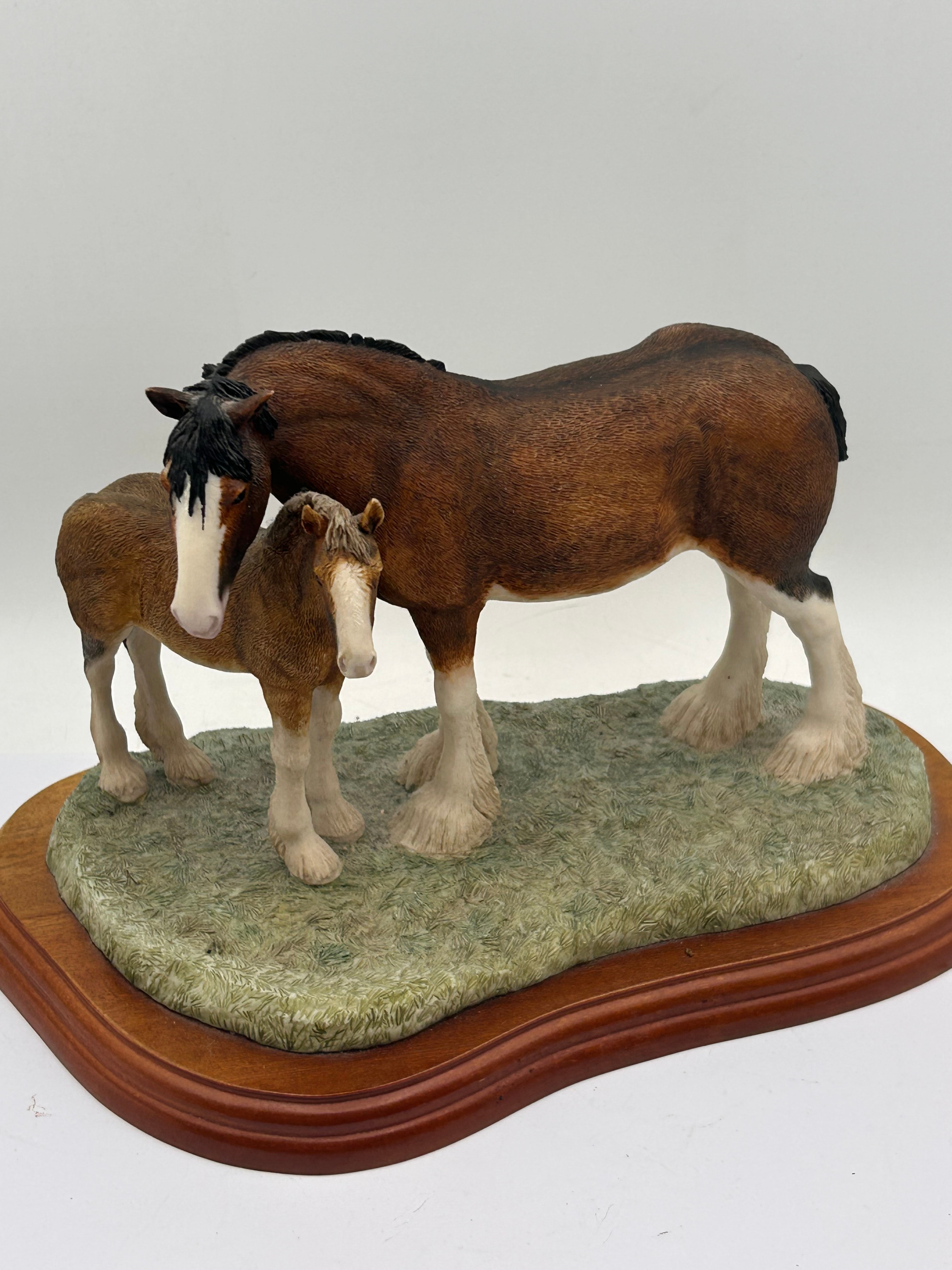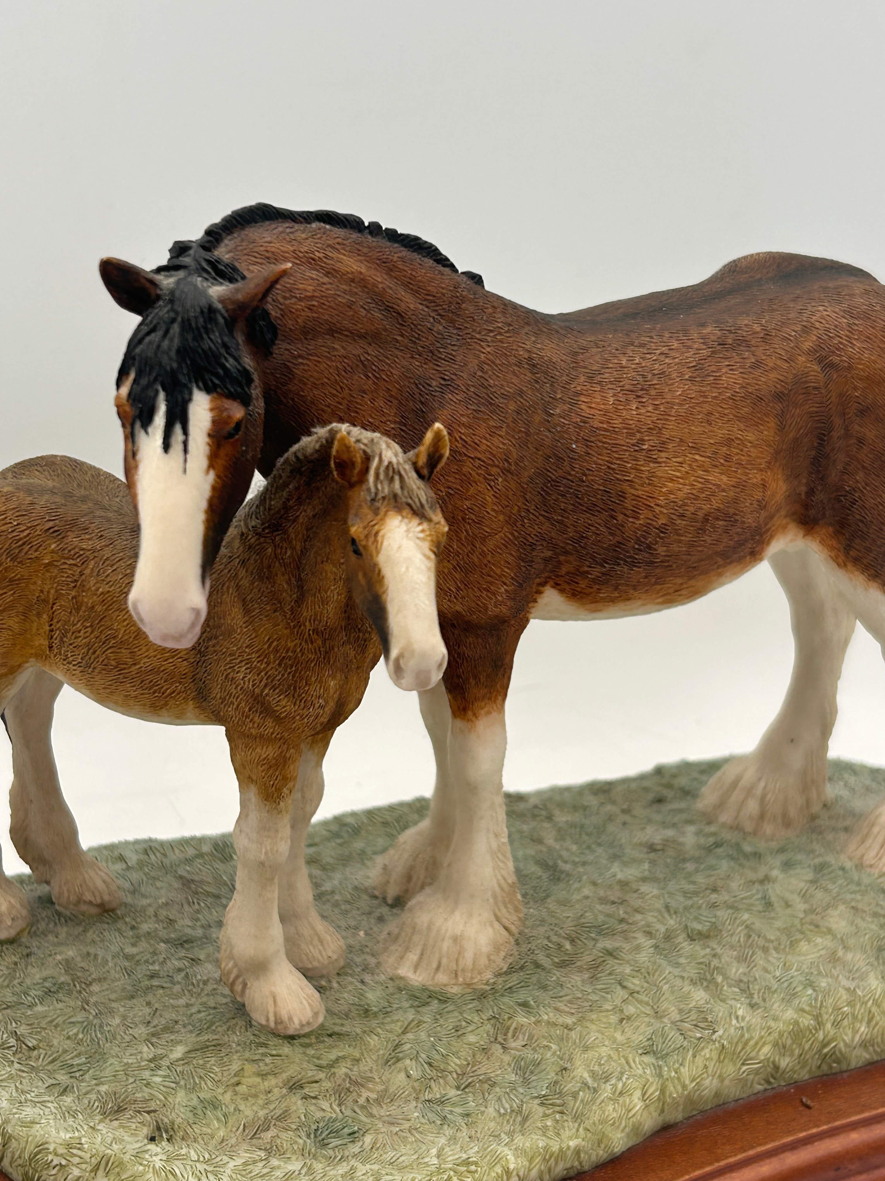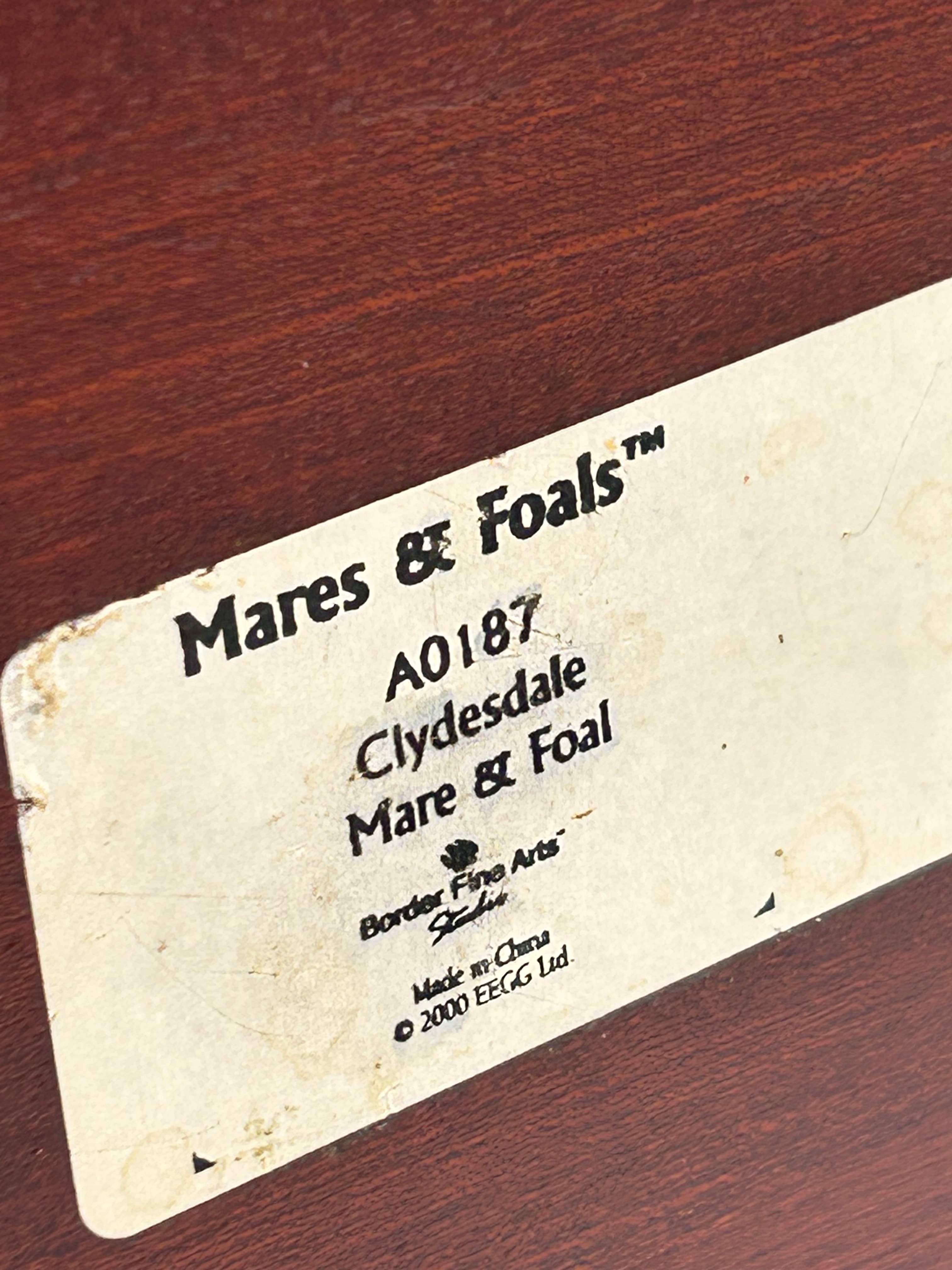 A Border Fine Arts ‘Mares & Foals’ series figurine, depicting a Clydesdale mare and foal. Crafted from a resin or composite material with hand-painted details, showcasing their distinctive brown coats, white blazes, and feathered legs. The horses stand on a textured, grass-like base, which is mounted on a polished, reddish-brown wooden plinth. The underside bears a label identifying the piece as ‘Clydesdale Mare & Foal’, item A0187, copyrighted © 2000 by EEGG Ltd., and made in China.