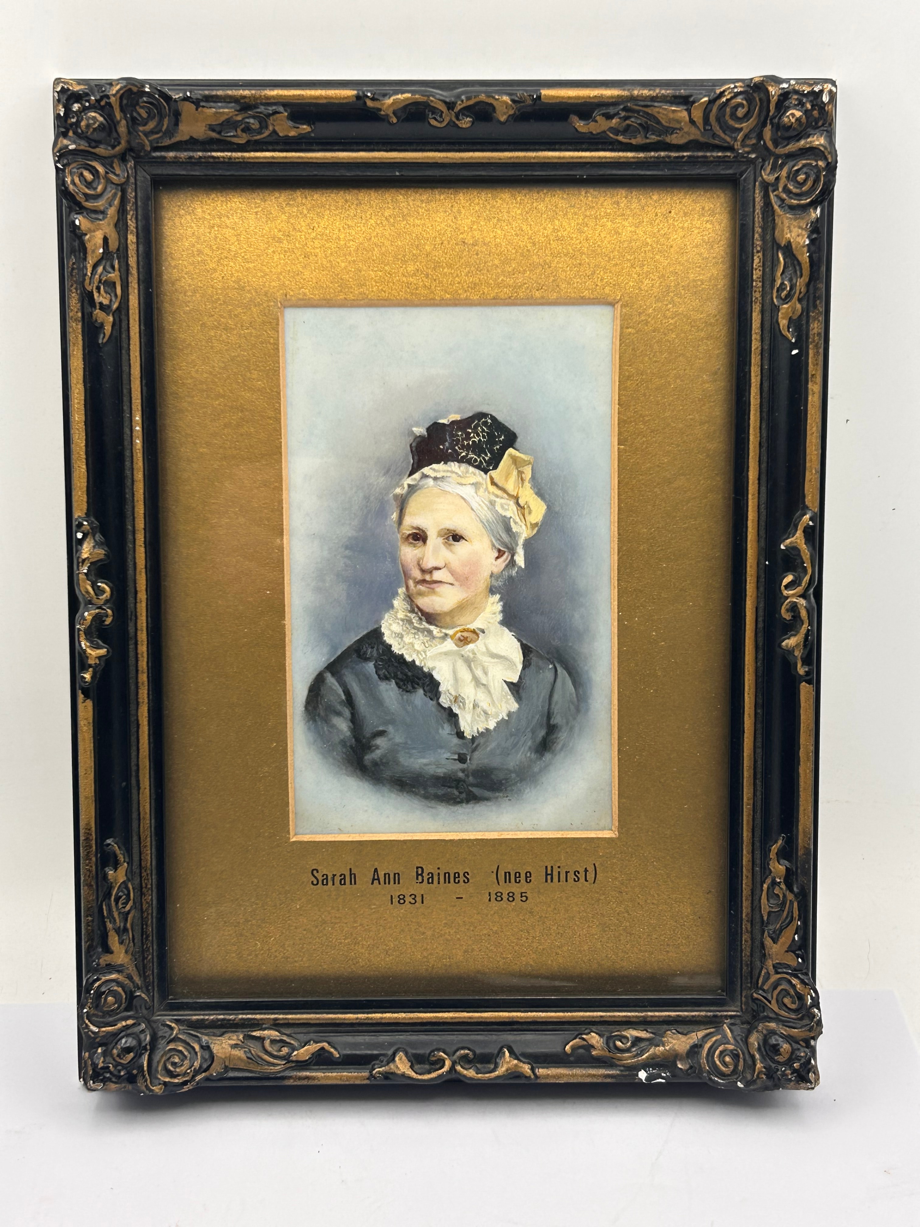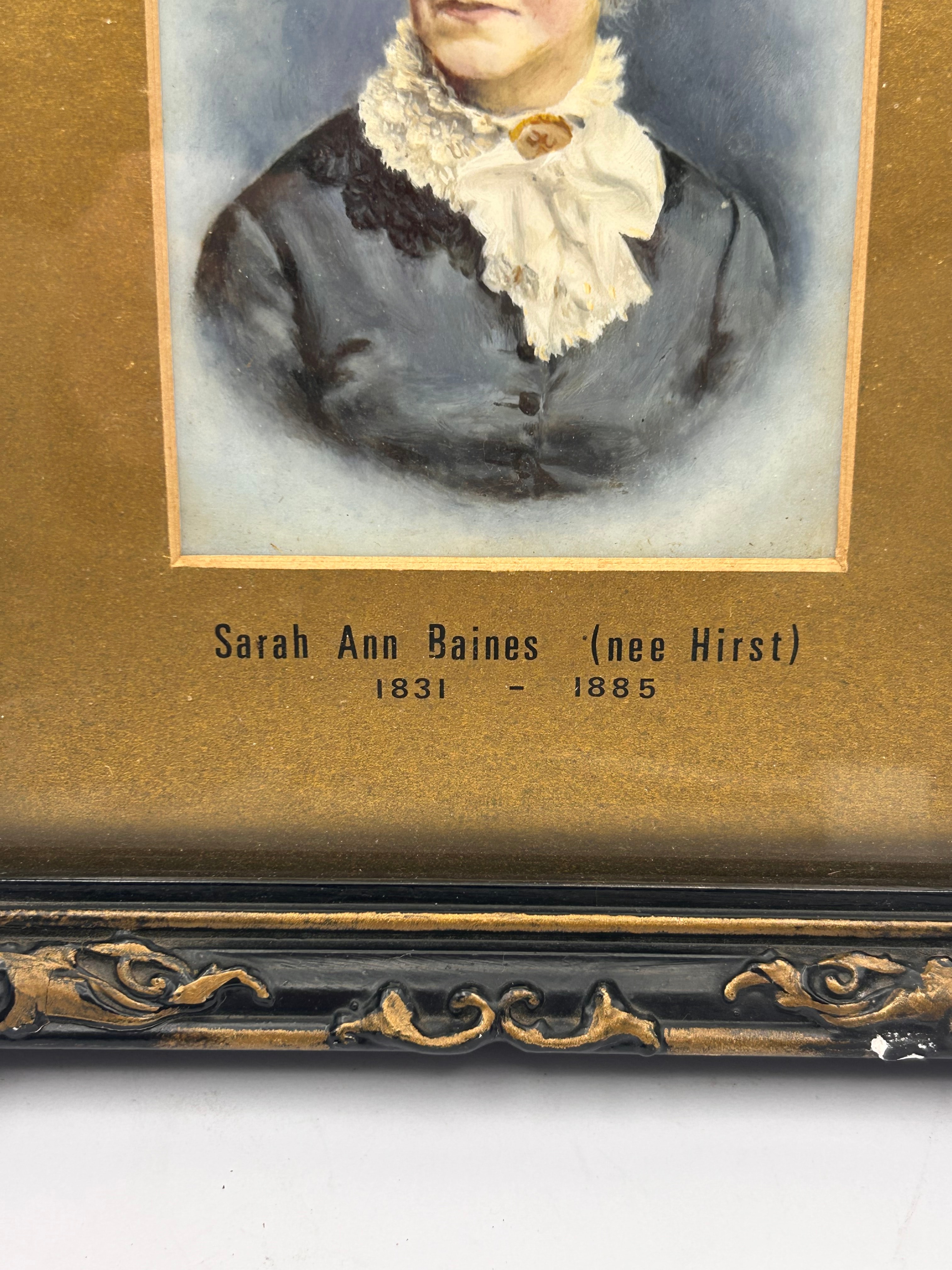 A framed Victorian portrait miniature, likely watercolor or gouache, depicting Sarah Ann Baines (nee Hirst) in mid-19th-century attire. The artwork is set within a gold-toned mat, which bears the printed inscription ‘Sarah Ann Baines (nee Hirst)’ and the life dates ‘1831 – 1885’. The miniature is housed under glass in an ornate, dark-colored frame with gilded accents.
