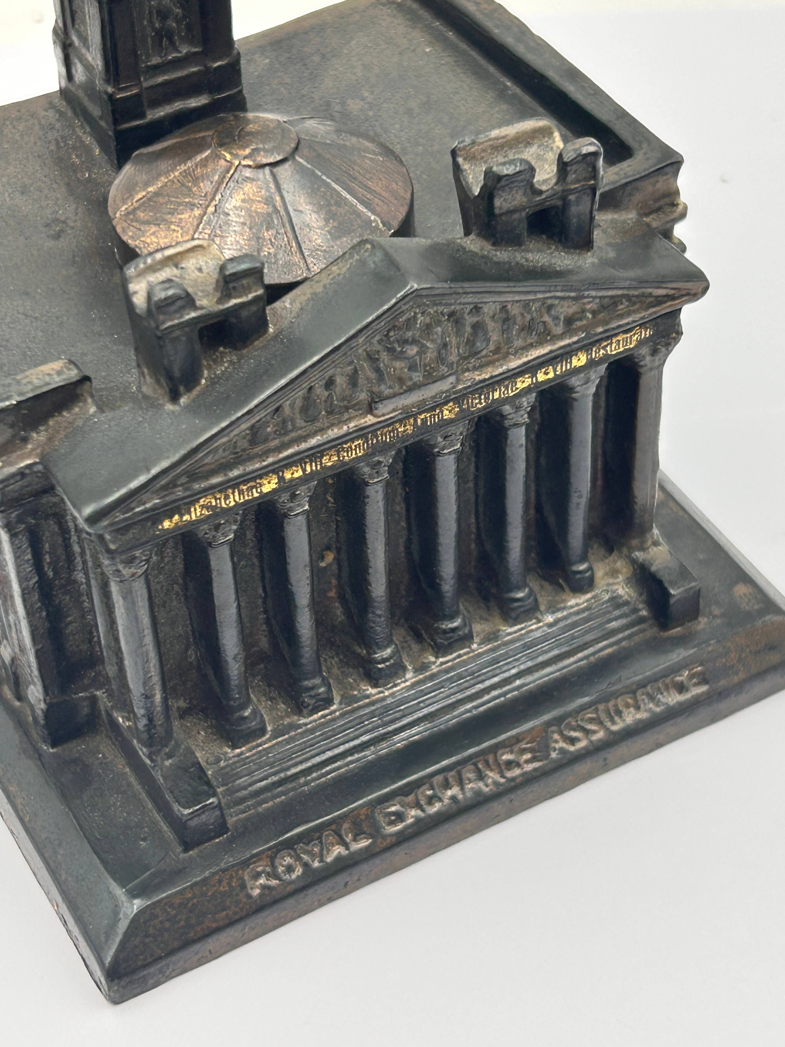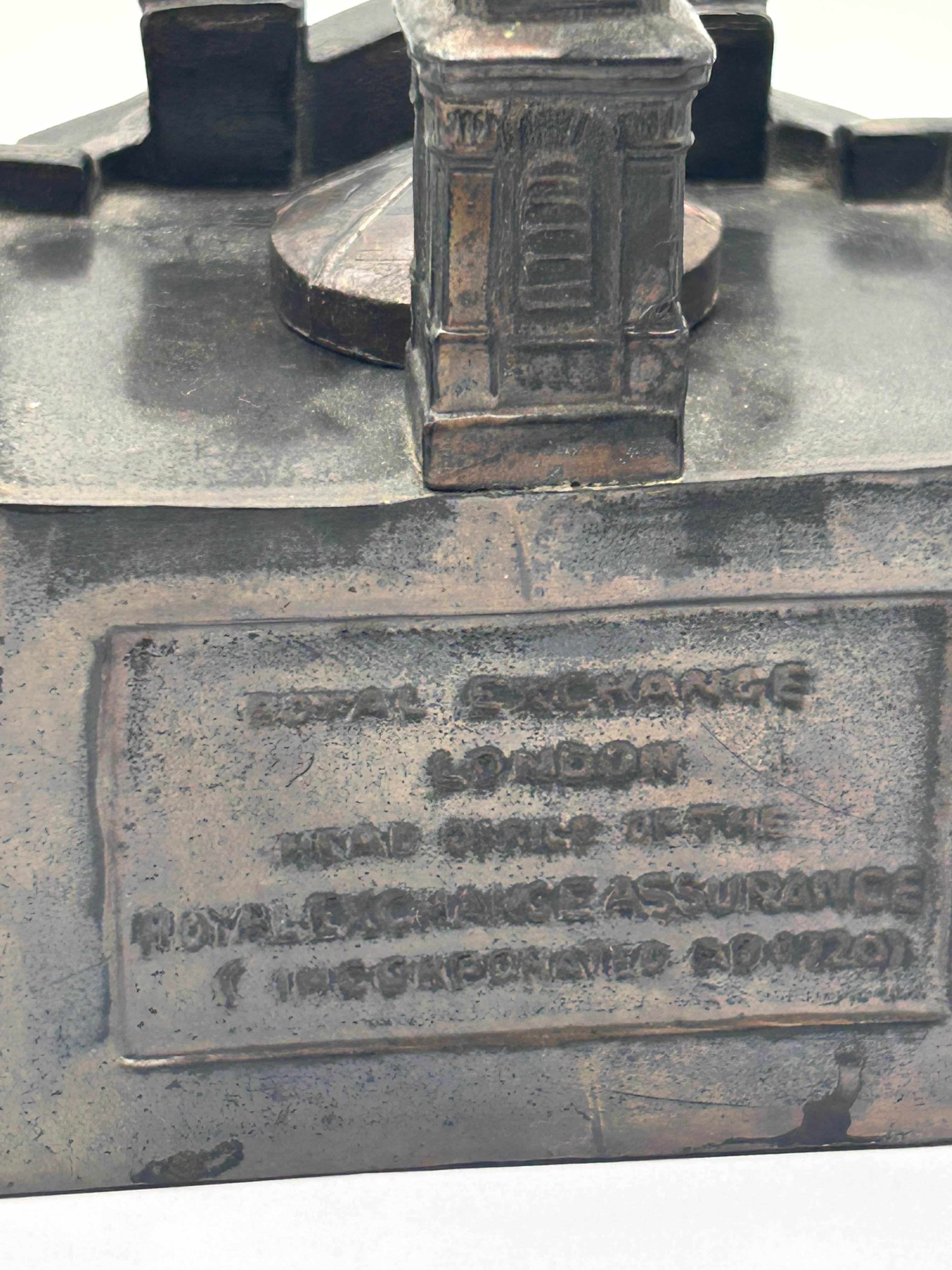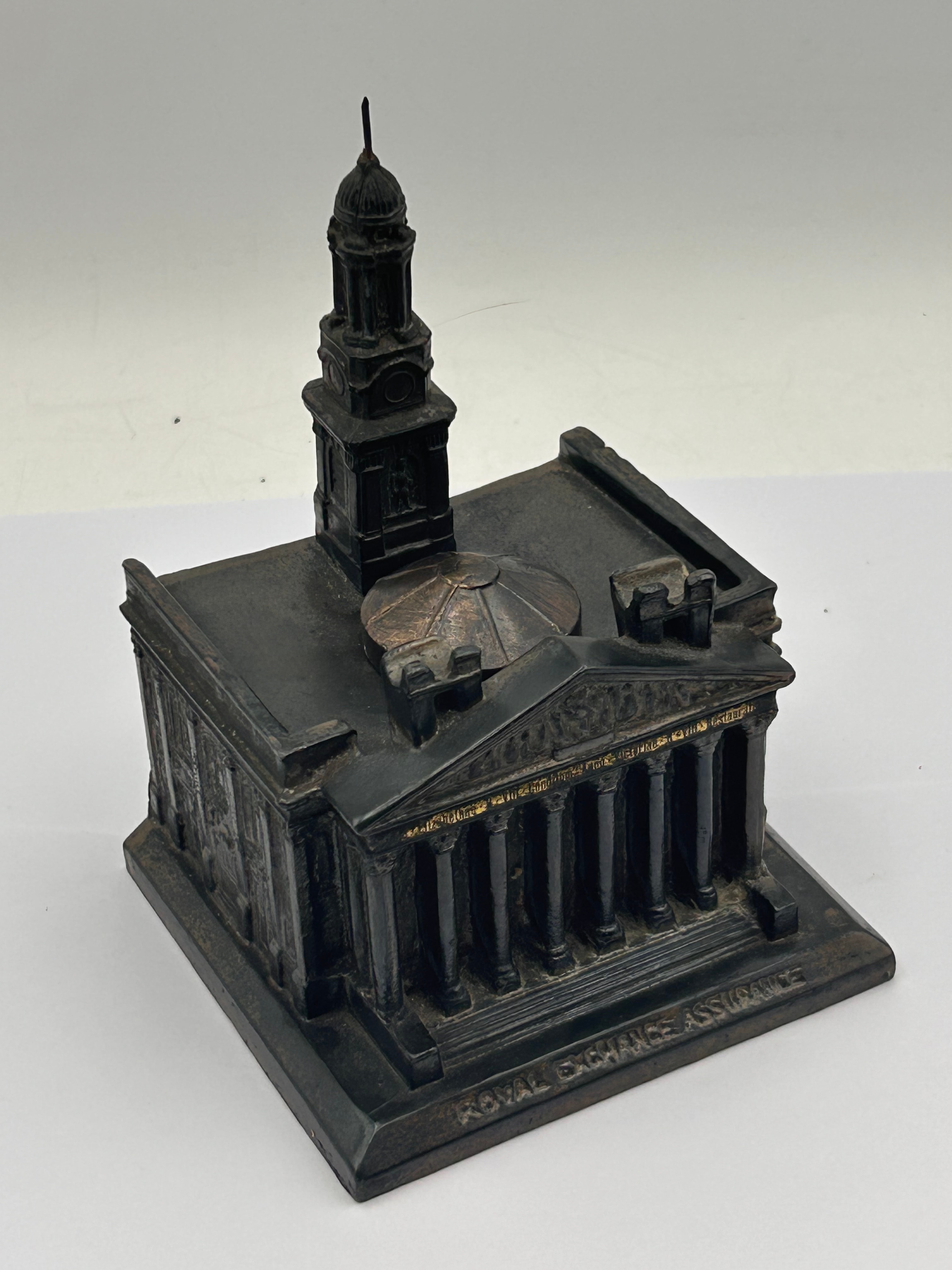 A vintage metal architectural model of The Royal Exchange Assurance building, London, functioning as an inkwell, dating to the circa 1930s. The model depicts a classical-style building with a prominent portico featuring columns and a pediment, a central dome, and a multi-tiered clock tower/spire. It is crafted from a cast metallic material, likely bronze or spelter, and exhibits a dark, somewhat uneven patina. Inscriptions on the base include ‘ROYAL EXCHANGE ASSURANCE’ on one side, and on another, more detailed text reads: ‘ROYAL EXCHANGE’, ‘LONDON’, ‘HEAD OFFICE OF THE’, ‘ROYAL EXCHANGE ASSURANCE’, and ‘INCORPORATED AD1720’. The building’s frieze also clearly displays ‘ROYAL EXCHANGE’.