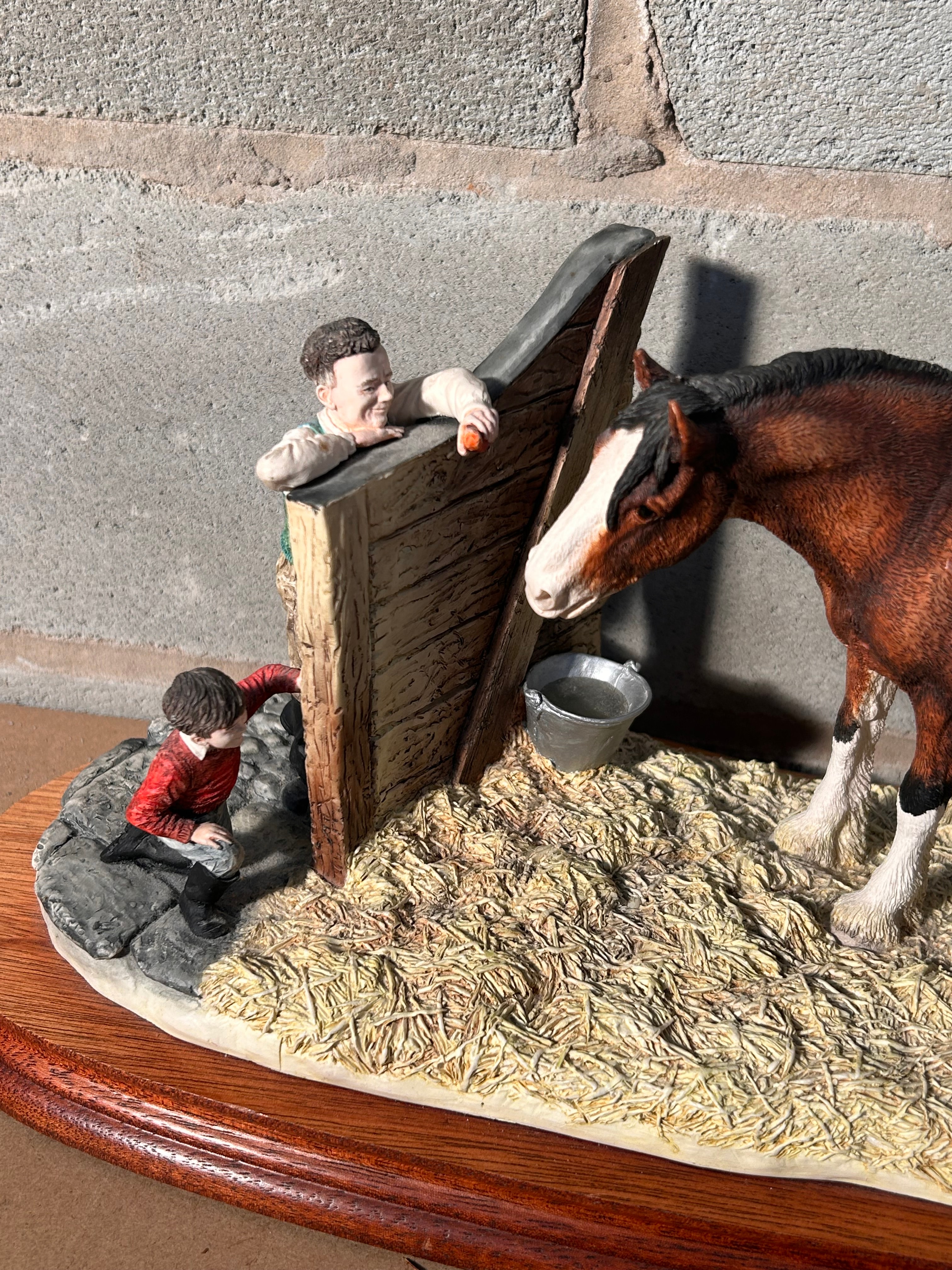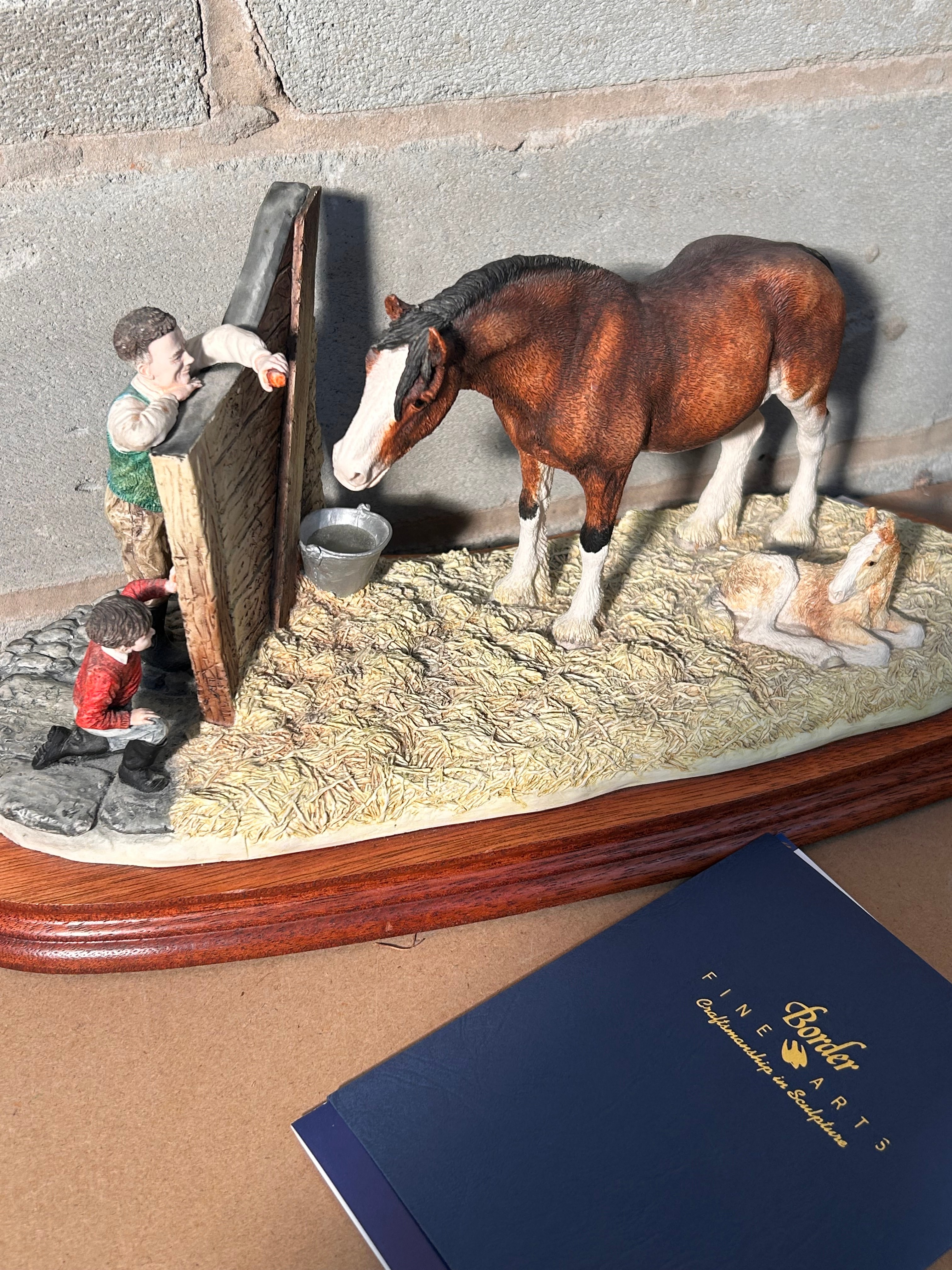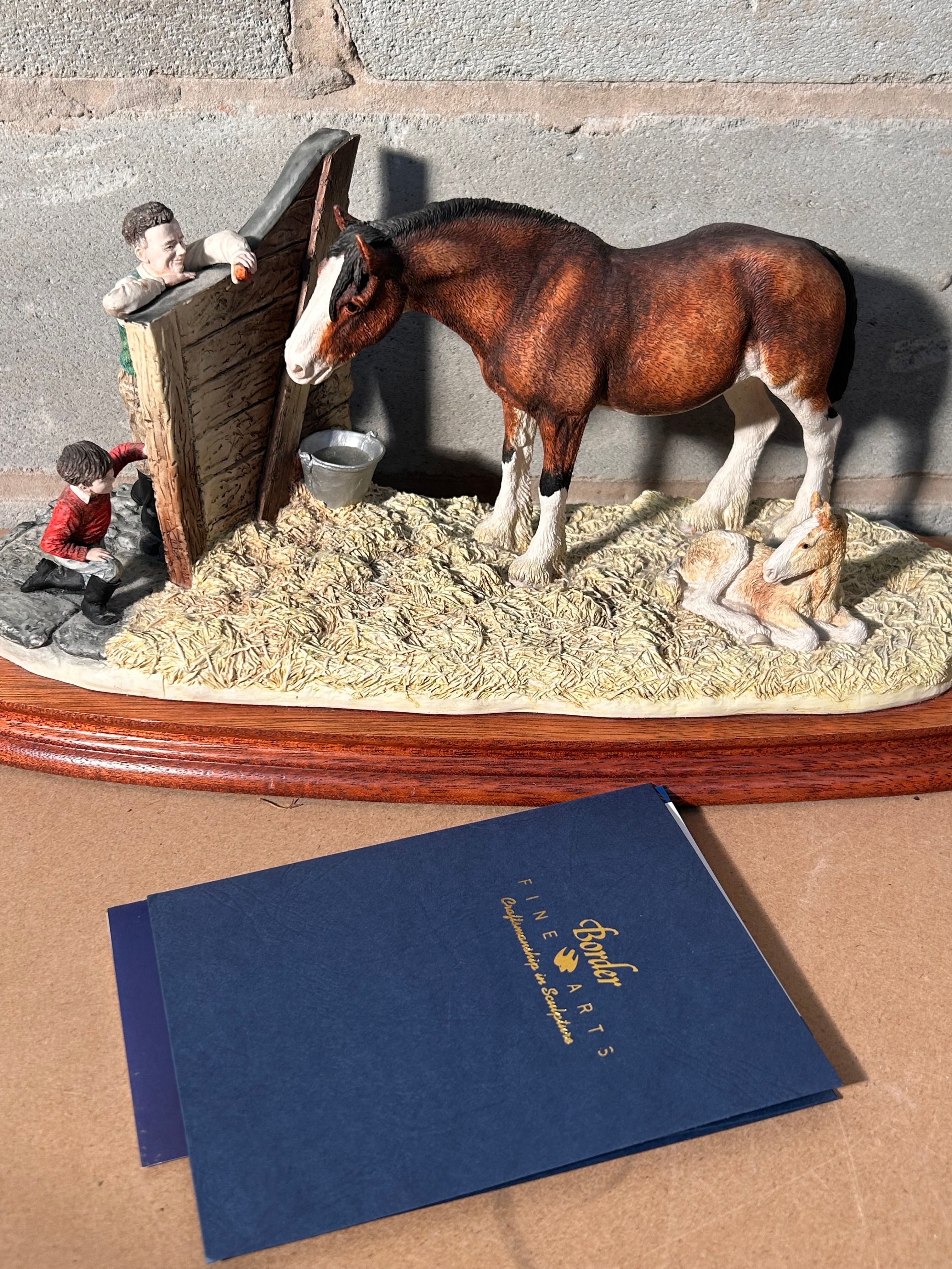 A Border Fine Arts ‘Next Generation’ limited edition figurine group, dated 1997. This hand-painted resin or composite sculpture depicts an equestrian stable scene, featuring a brown horse standing over a recumbent foal, with two male figures interacting near a stable door. The group is mounted on a polished wooden base. An accompanying dark blue booklet with ‘Border FINE ARTS’ and ‘Craftsmanship in Sculpture’ is present. This piece is from a limited edition of 1500.