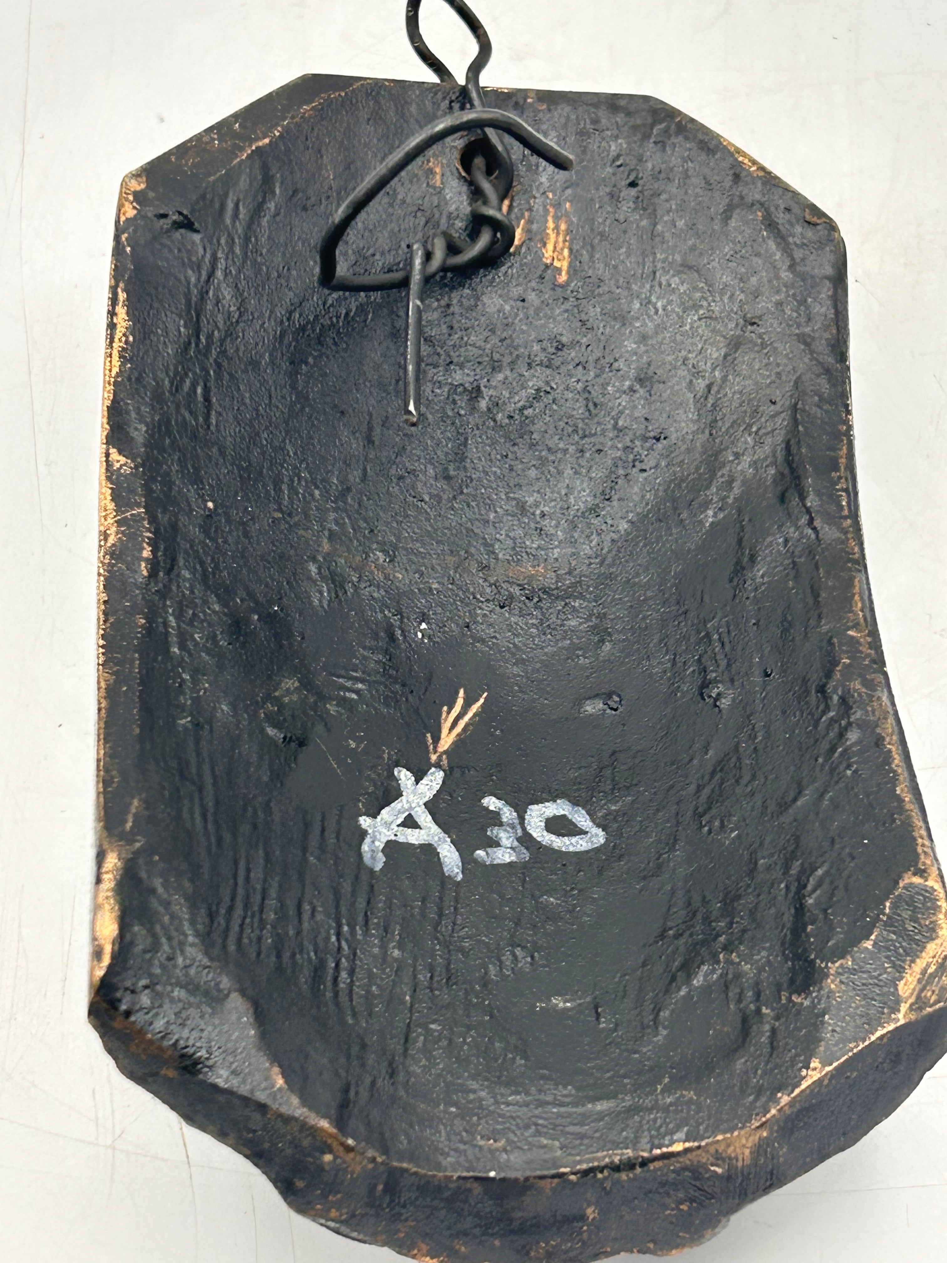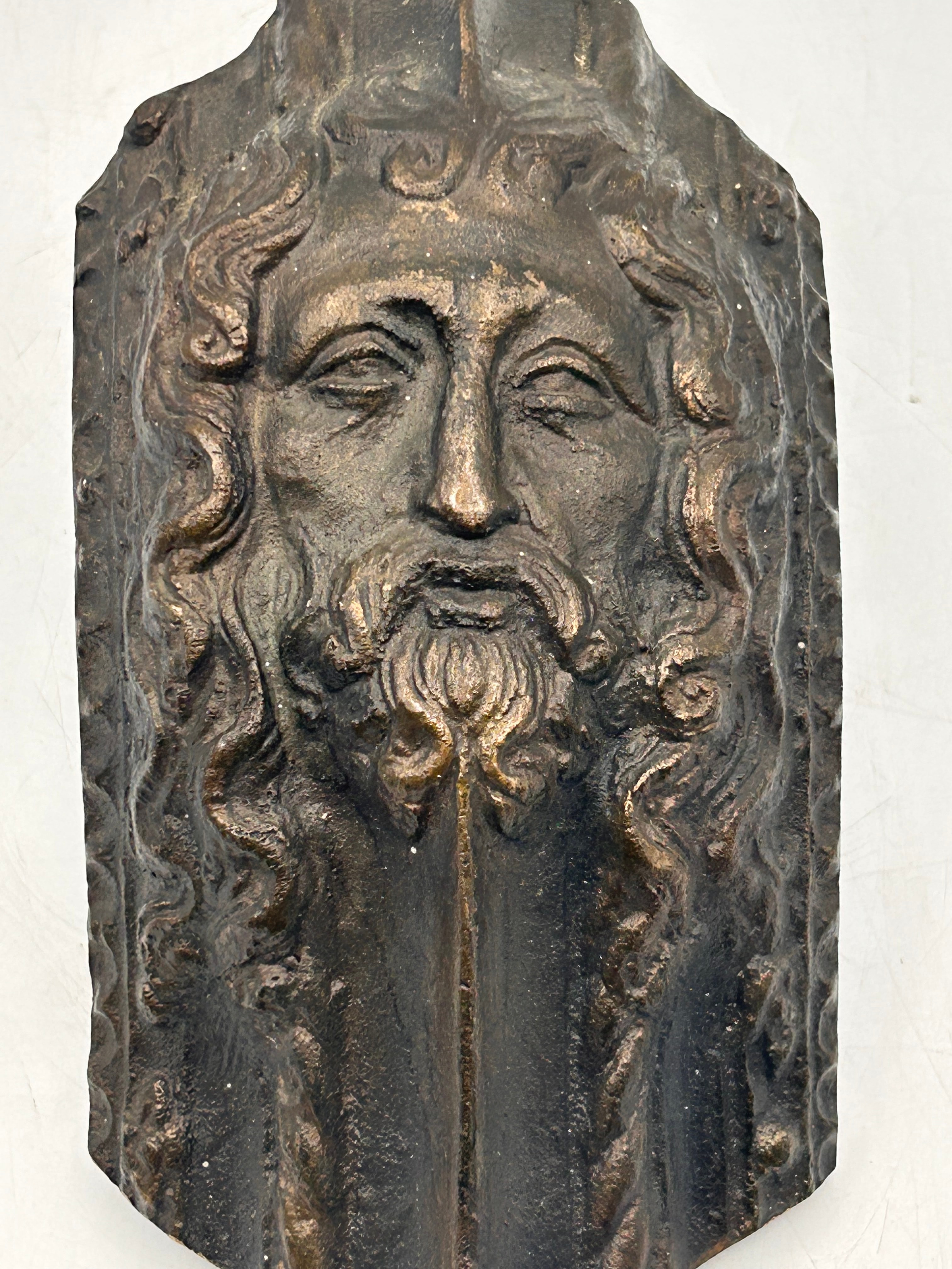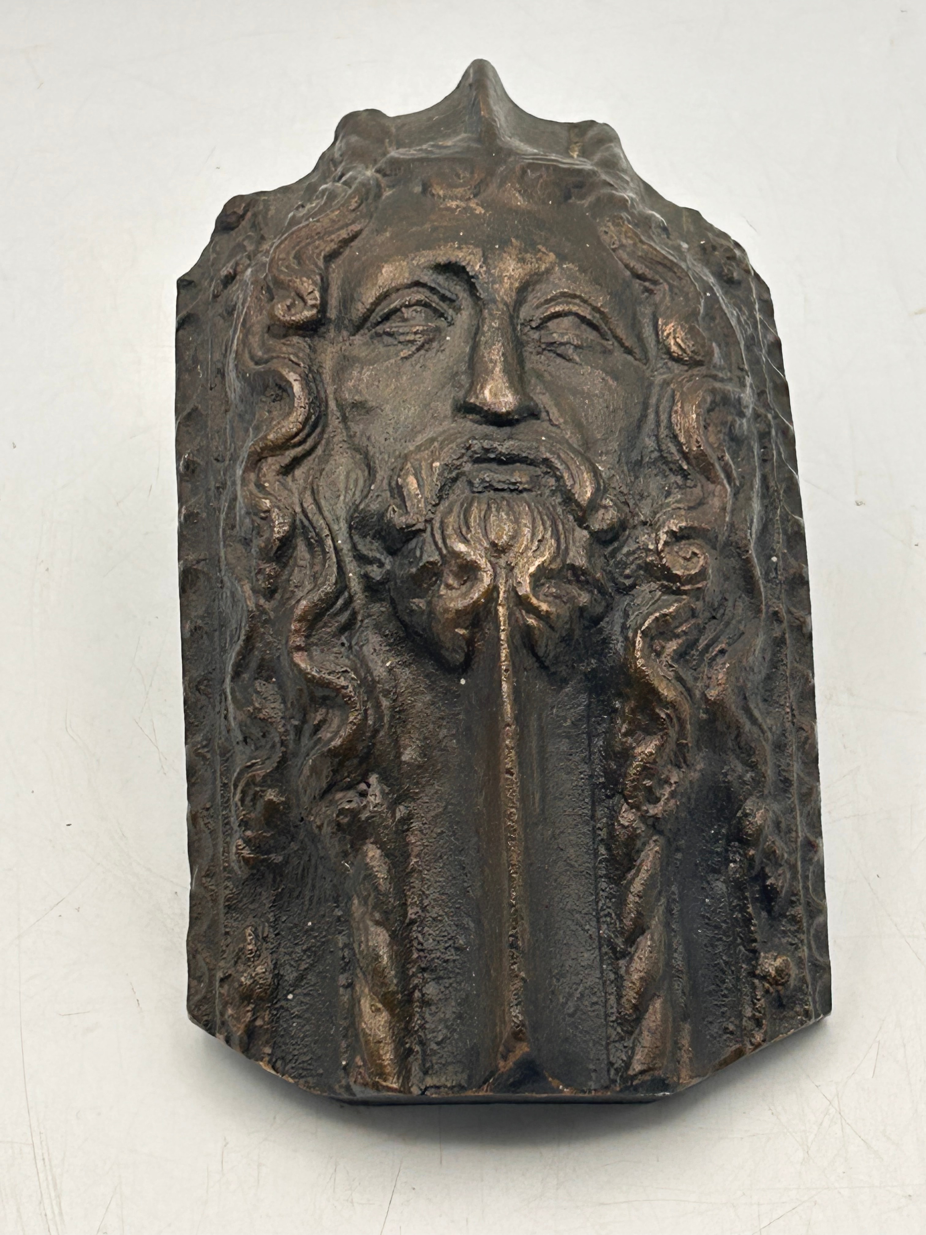 A cast bronze relief plaque depicting the ‘Head of Christ’, featuring the bust of a bearded man with long, flowing hair, indicative of a religious depiction. The object has an irregular rectangular shape, tapering slightly towards the top, and presents a dark, patinated bronze-toned finish. The reverse is painted black and fitted with a simple wire hanging loop, along with the white hand-painted inscription “A30”.