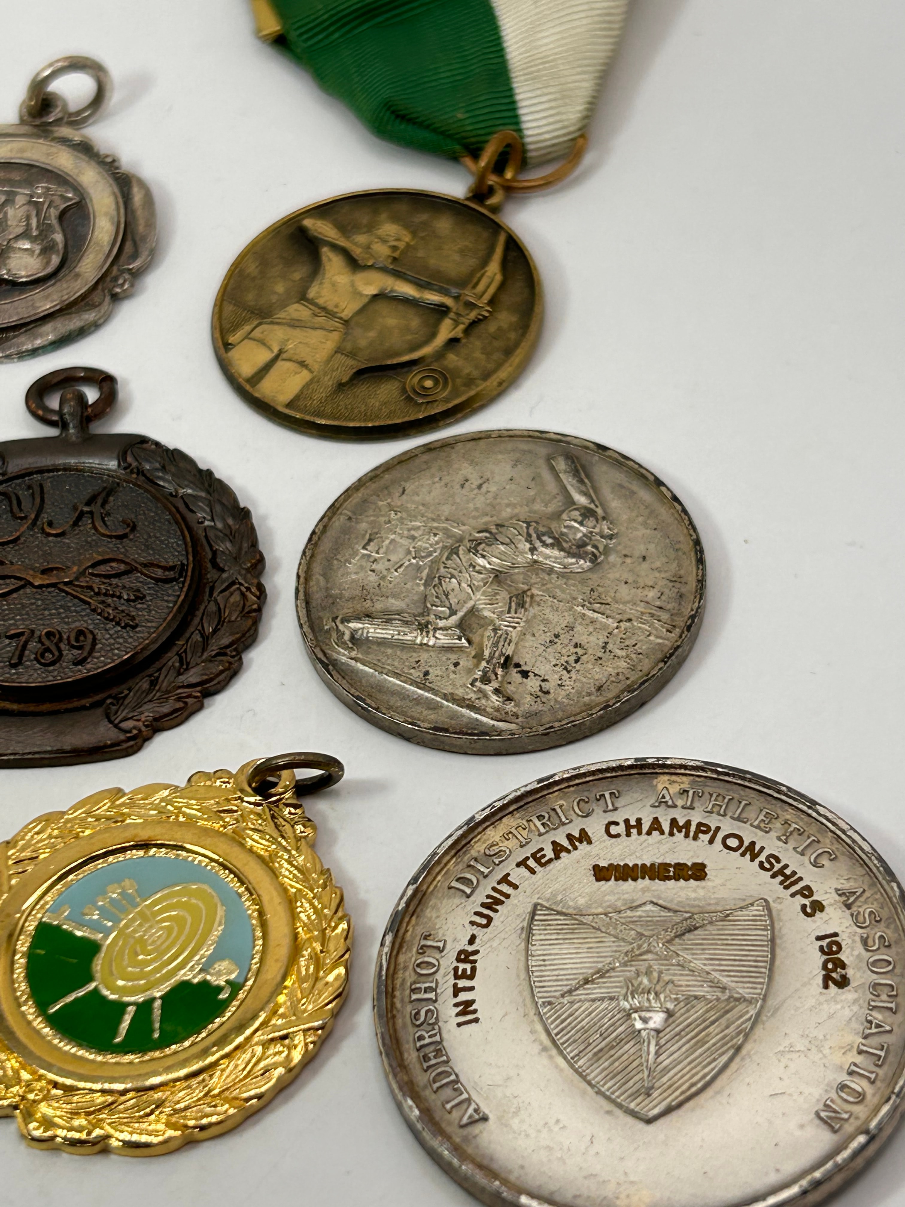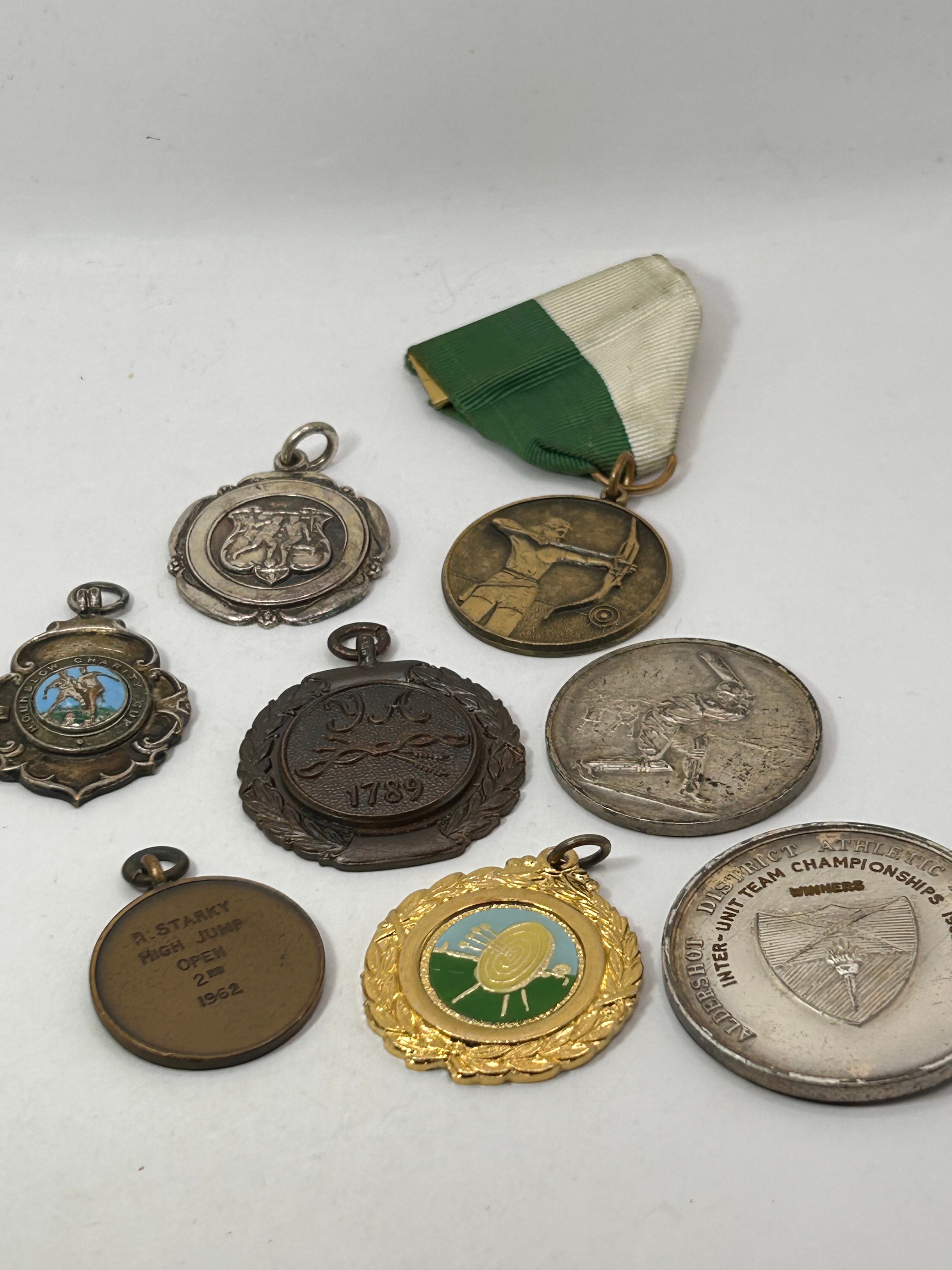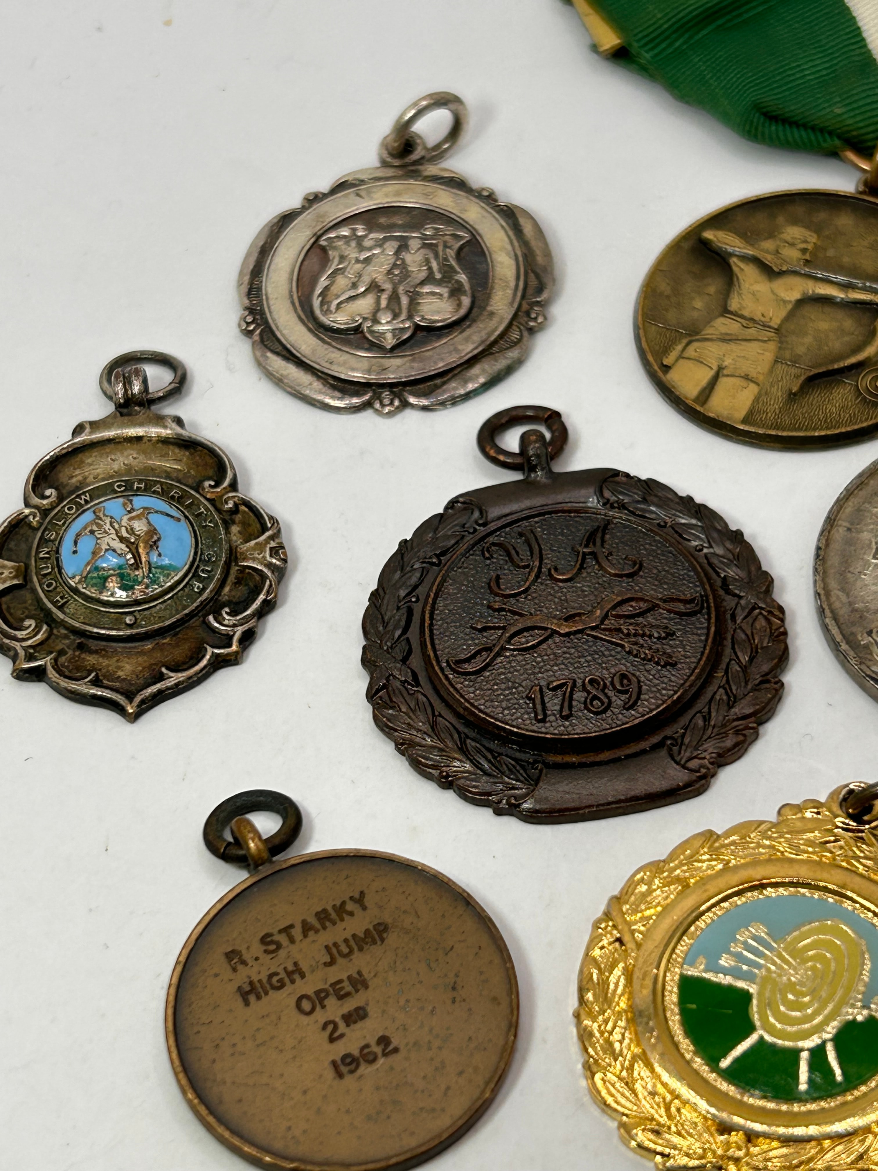 A group of eight assorted metallic medals and charms, exhibiting a mix of silver-tone, bronze-tone, and gold-tone finishes, with some featuring enamel details. The styles vary, presenting athletic themes such as an archer, a high jumper, and a horse and rider, alongside more decorative crests and motifs. Visible inscriptions include “R. STARKY HIGH JUMP OPEN 2ND 1962”, “YA 1789”, “HOLLOW CHARITY CUP”, and “ALDERSHOT INTER-UNIT TEAM CHAMPIONSHIPS ASSOCIATION WINNERS 1982”. One medal is attached to a discolored green and white striped ribbon.