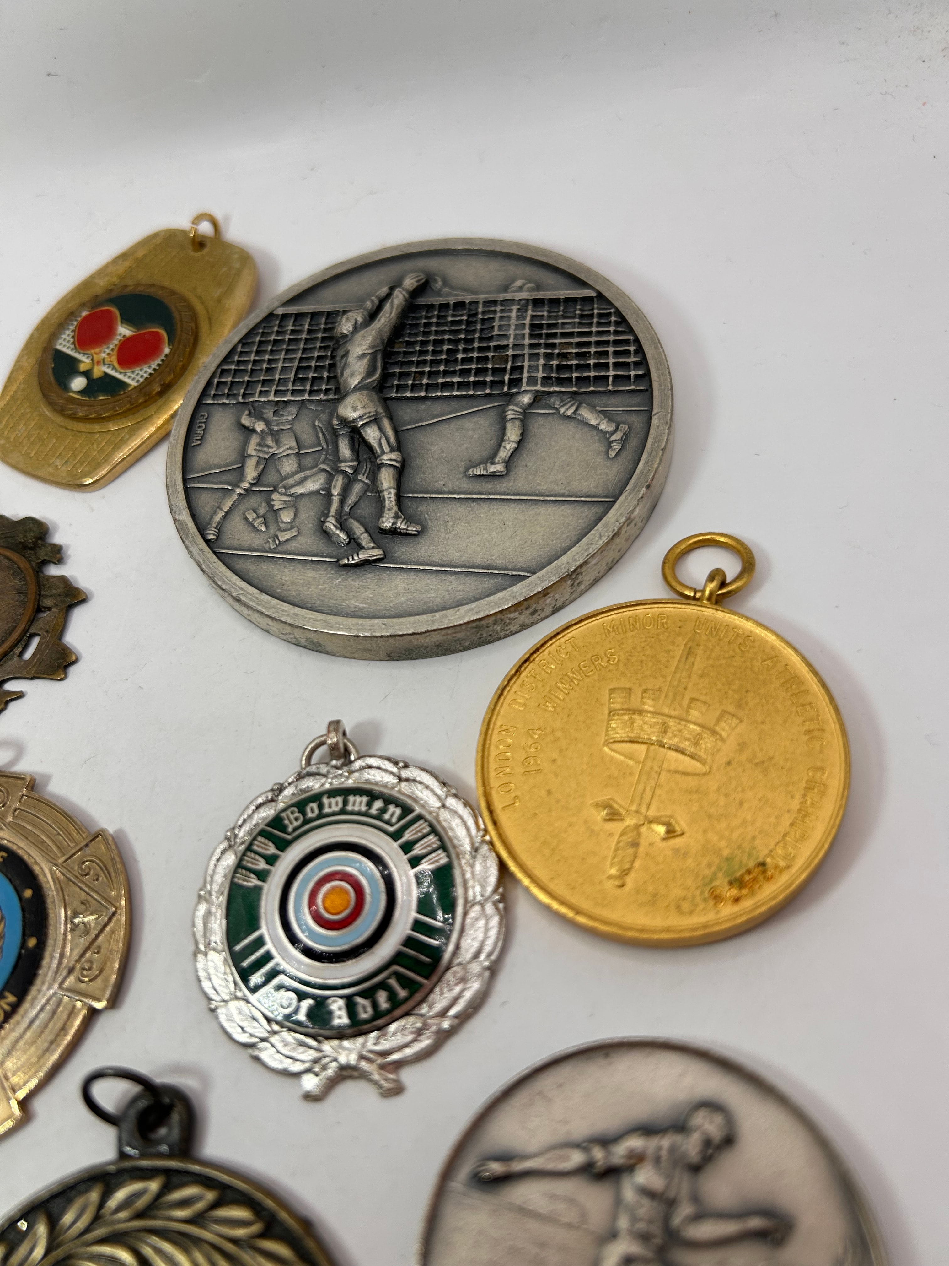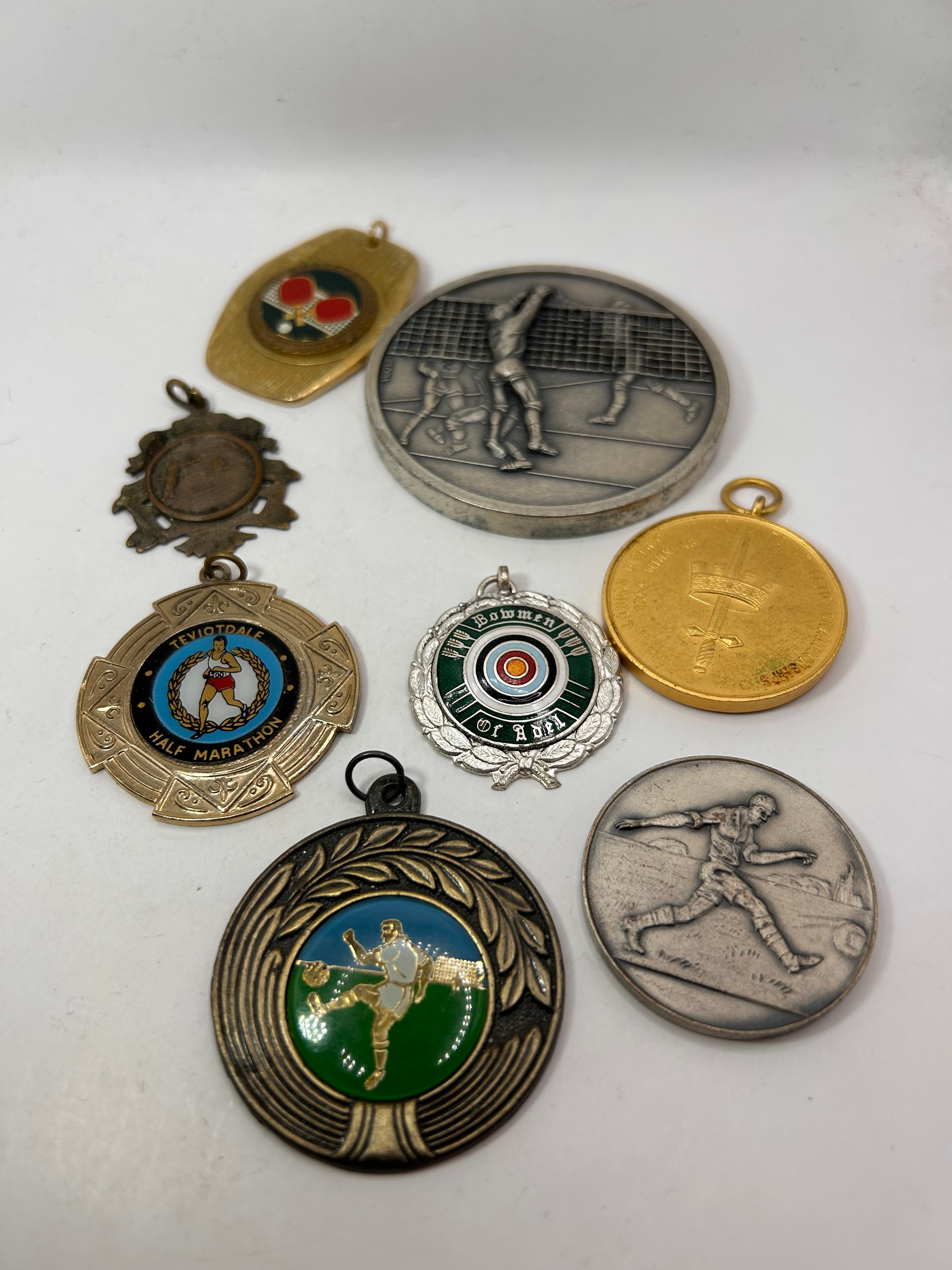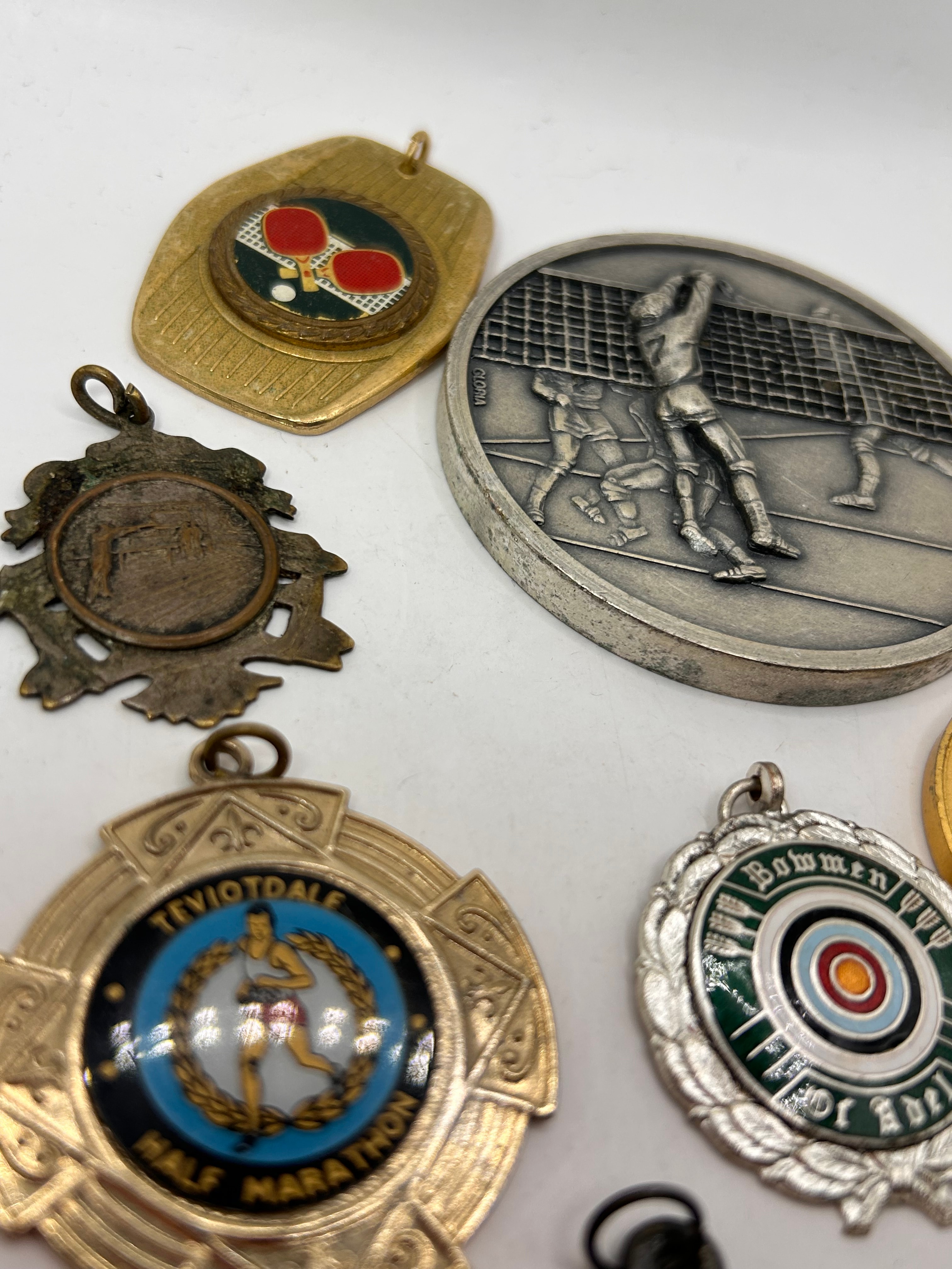 A collection of eight vintage and commemorative sporting medals and medallions. Primarily crafted from base metals, these items feature gold-tone, silver-tone, and bronze-tone finishes, with some incorporating enamel or painted details. The assortment includes a large silver-tone medal depicting volleyball players, marked “VOLLEYBALL”; a gold-tone oval medal featuring table tennis bats; a gold-tone circular medal with a runner and the text “TEVIOTDALE HALF MARATHON”; and a silver-tone circular medal displaying an archery target with the text “BOWMEN OF ADEL”. Also present are a gold-tone circular medal showing a crown and sword, inscribed “LANSDALE HILL CLIMB 1968 WINNER”; a bronze-tone medal depicting a golfer on a green field; a silver-tone oval medal portraying a runner, dated “1977”; and a small, ornate bronze-tone medal with an unidentifiable or worn obverse design.