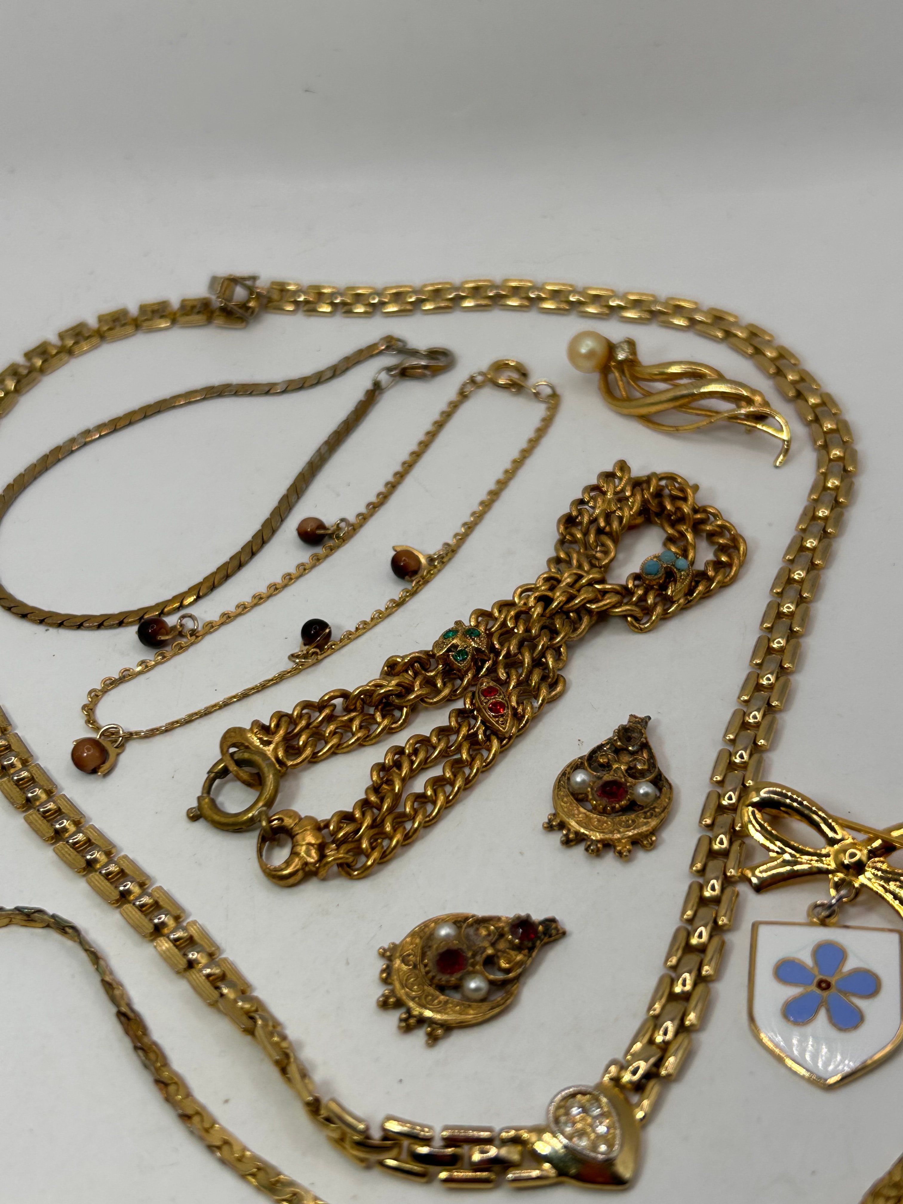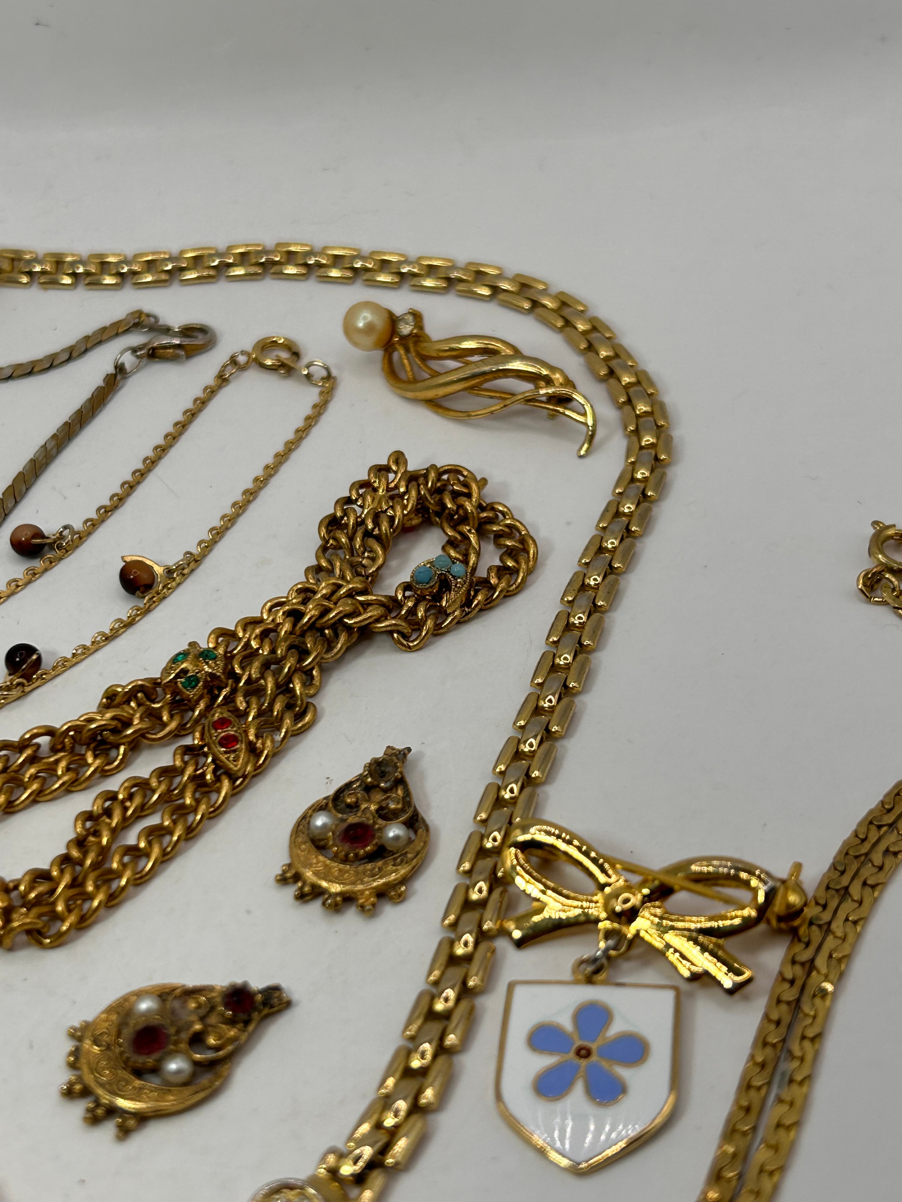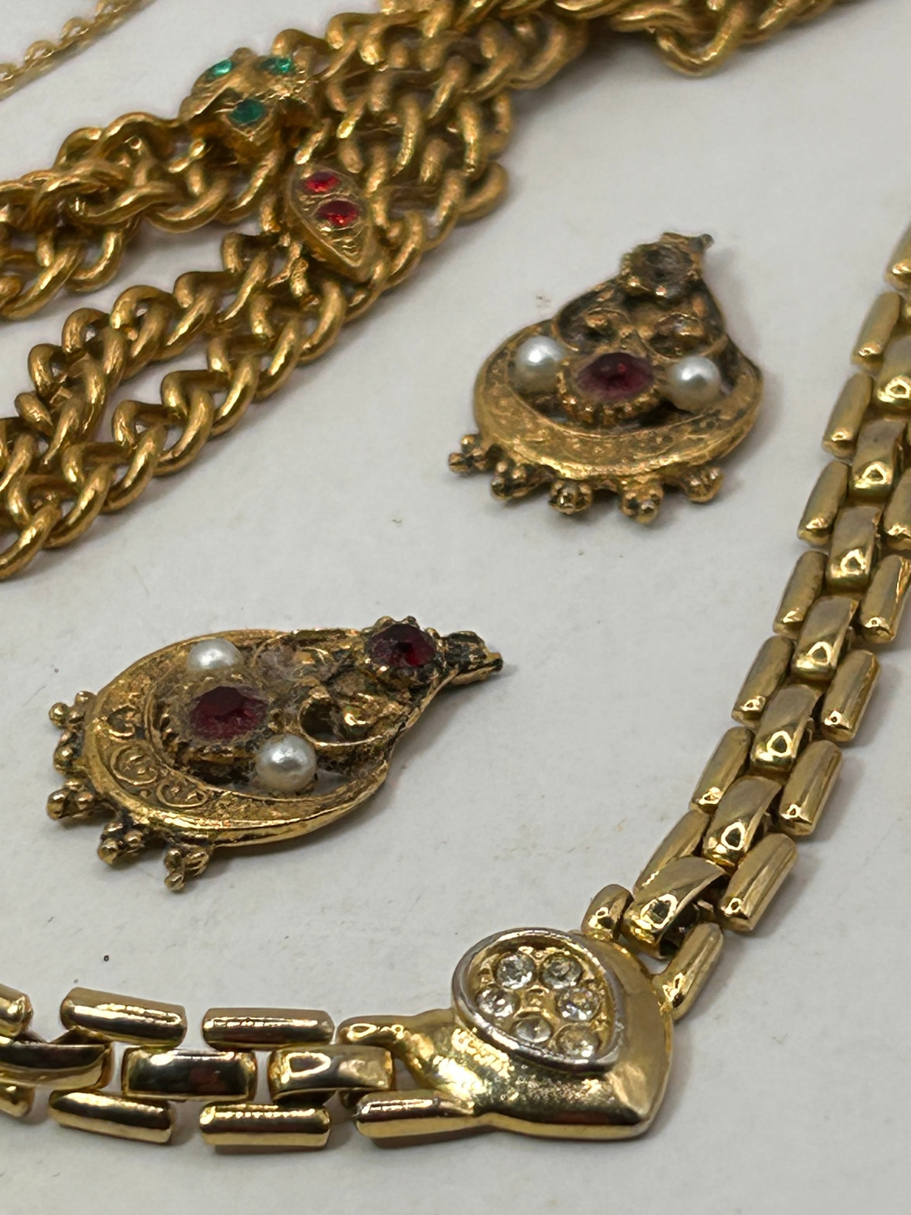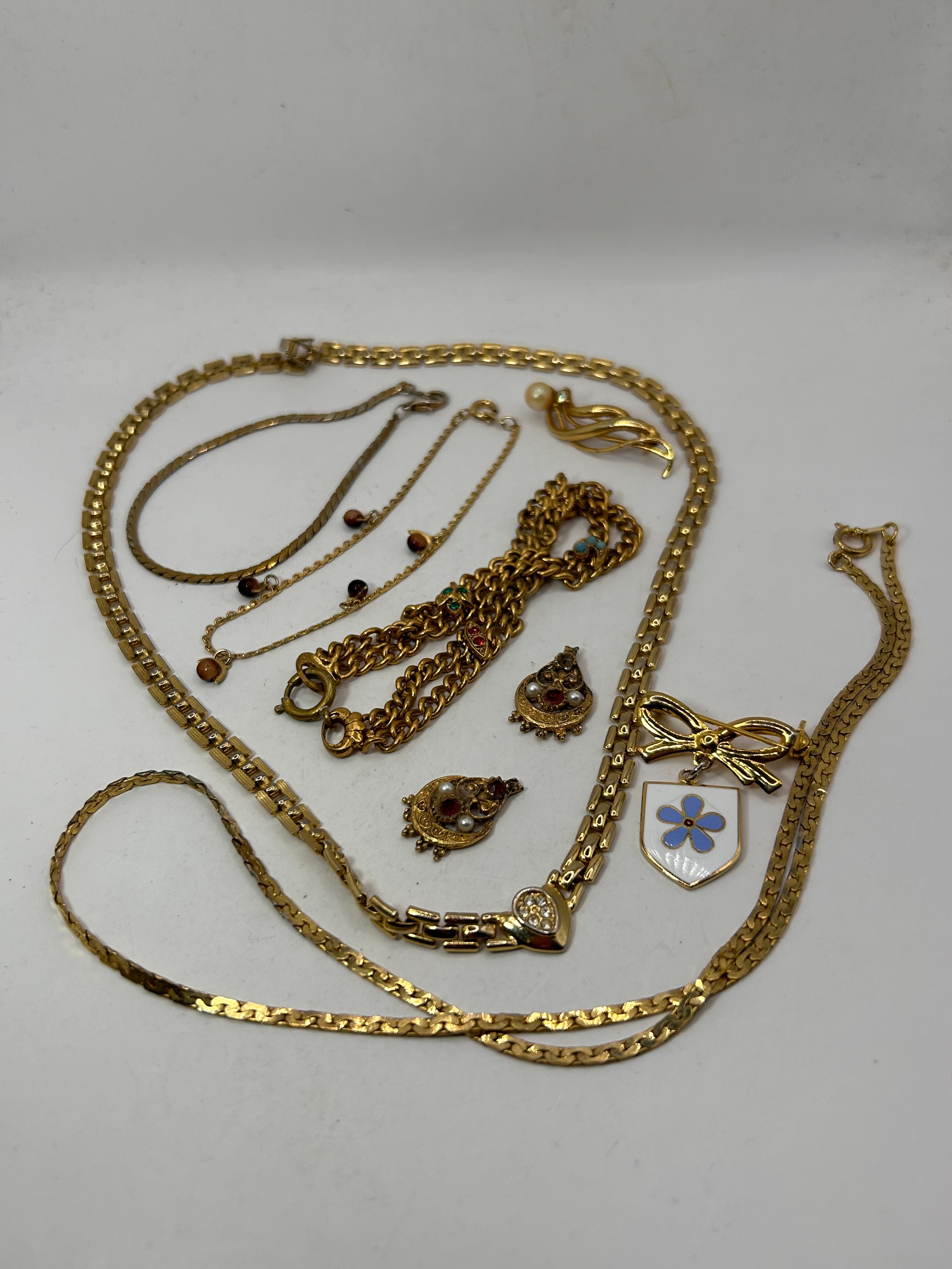 A group of approximately ten pieces of gold-tone costume jewelry, exhibiting a mixed vintage style likely dating from the mid-to-late 20th century. The collection includes several necklaces and chains of varying link styles, such as flat, serpentine, curb, and rope-like designs. Some pieces are embellished with small multi-colored beads or clear rhinestones. Also present are a pair of ornate drop earrings featuring faux pearls and red stones, and three brooches: one abstract curvilinear form with a faux pearl, a bow-shaped design, and a white enamel shield-shaped pin depicting a light blue four-petal flower and the initials ‘OHS’ or ‘CHS’ below.