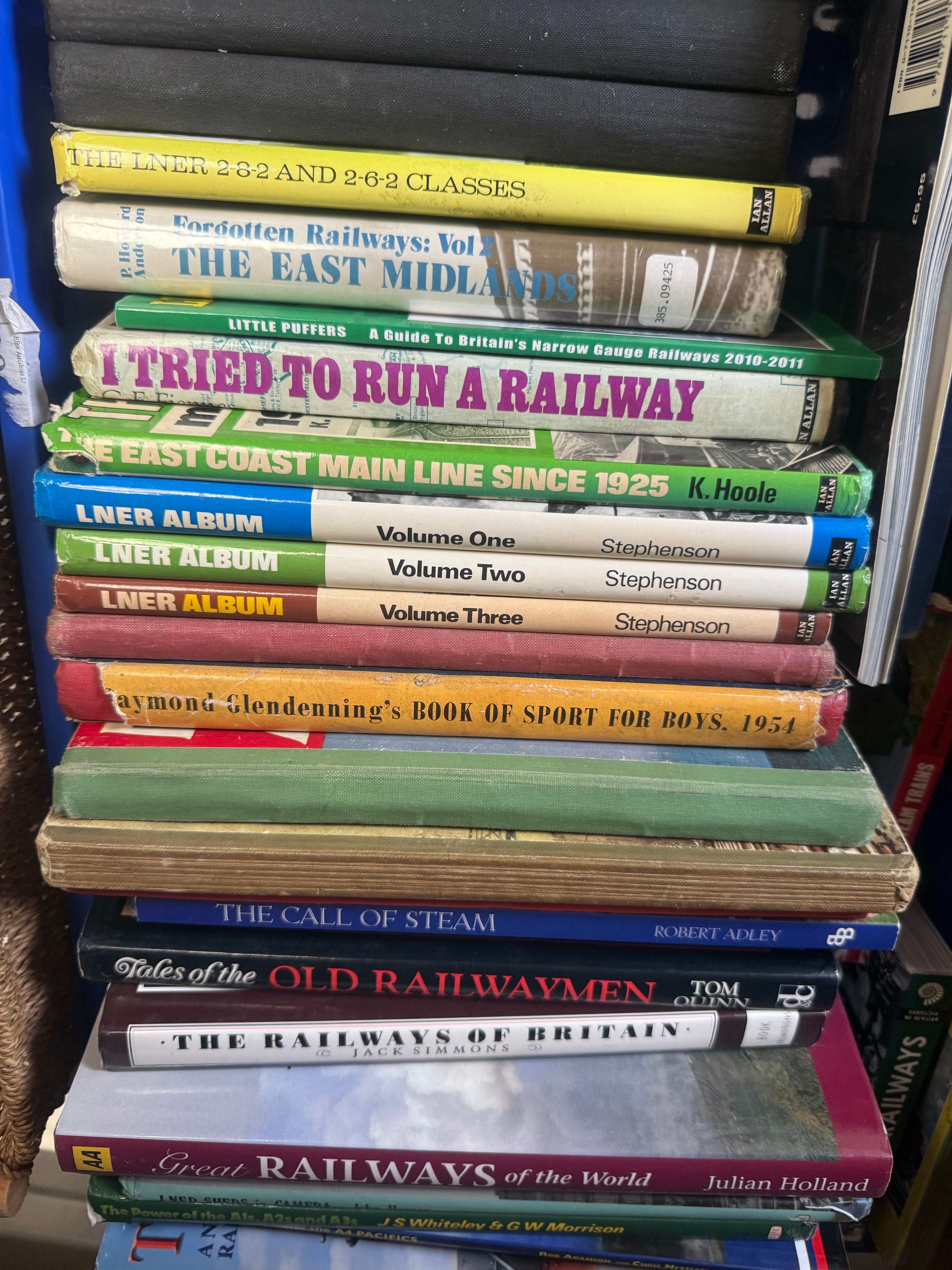 A collection of approximately eighteen hardback books, predominantly focused on British railway history and enthusiast subjects. Titles include ‘THE LNER 2-8-2 AND 2-6-2 CLASSES’, the three-volume ‘LNER ALBUM’ series by Stephenson, ‘Forgotten Railways: Vol 2 THE EAST MIDLANDS’, and ‘THE EAST COAST MAIN LINE SINCE 1925 K. Hoole’. Several volumes are published by Ian Allan. Also included is ‘Raymond Glendenning’s BOOK OF SPORT FOR BOYS’, dated 1954. The books are constructed with standard hardback bindings, featuring various colored cloth or paper-covered boards and printed spines.