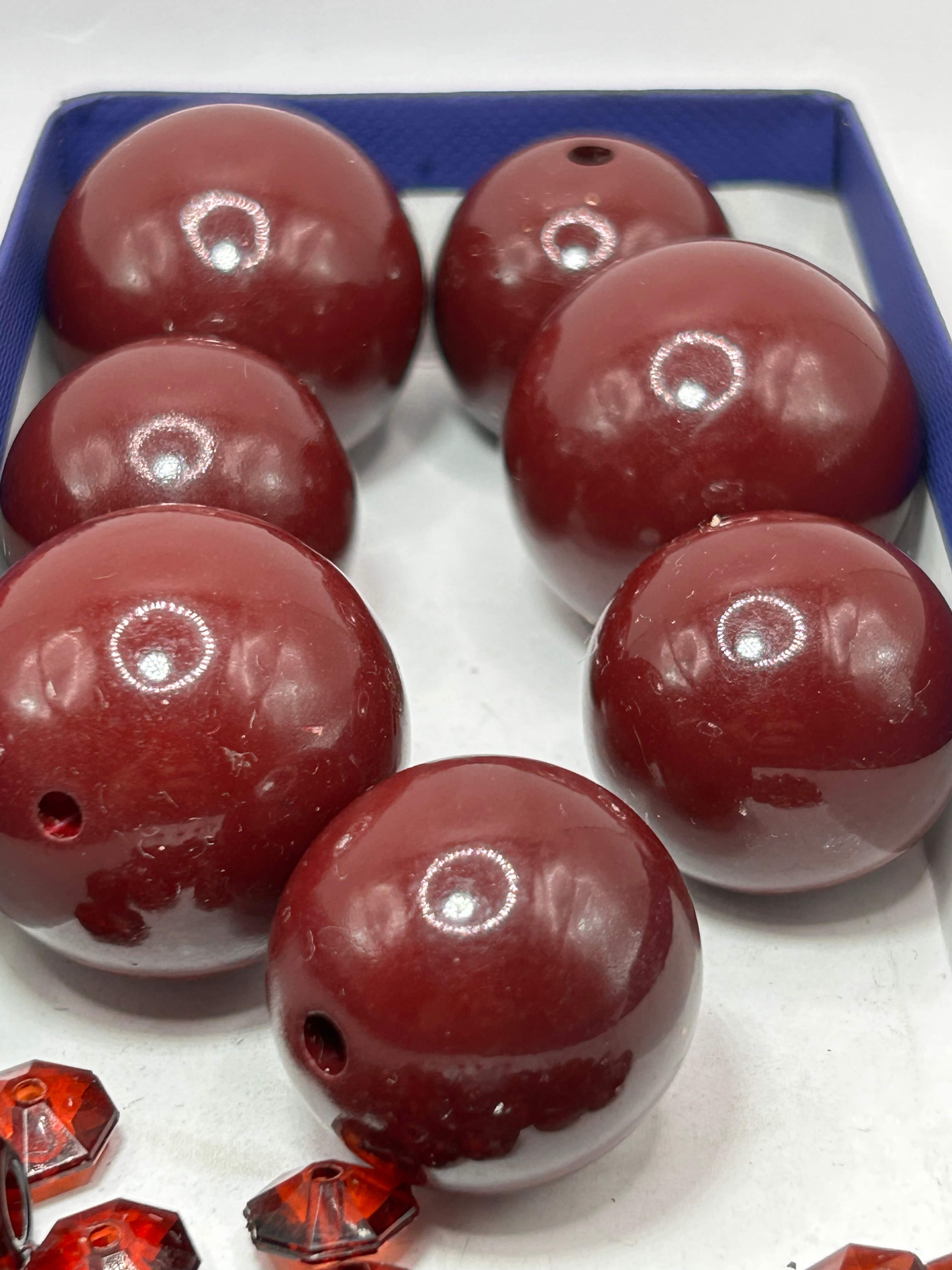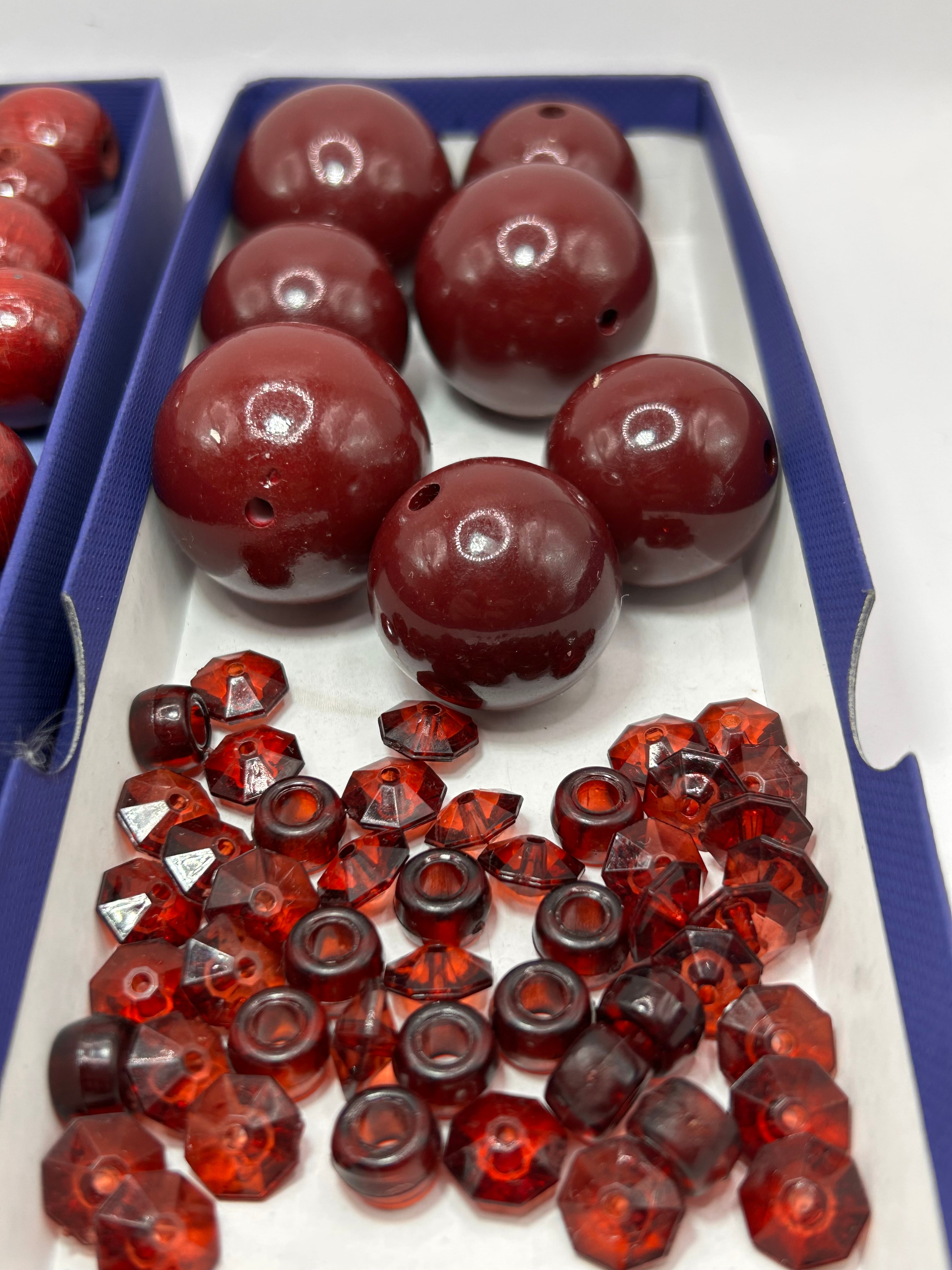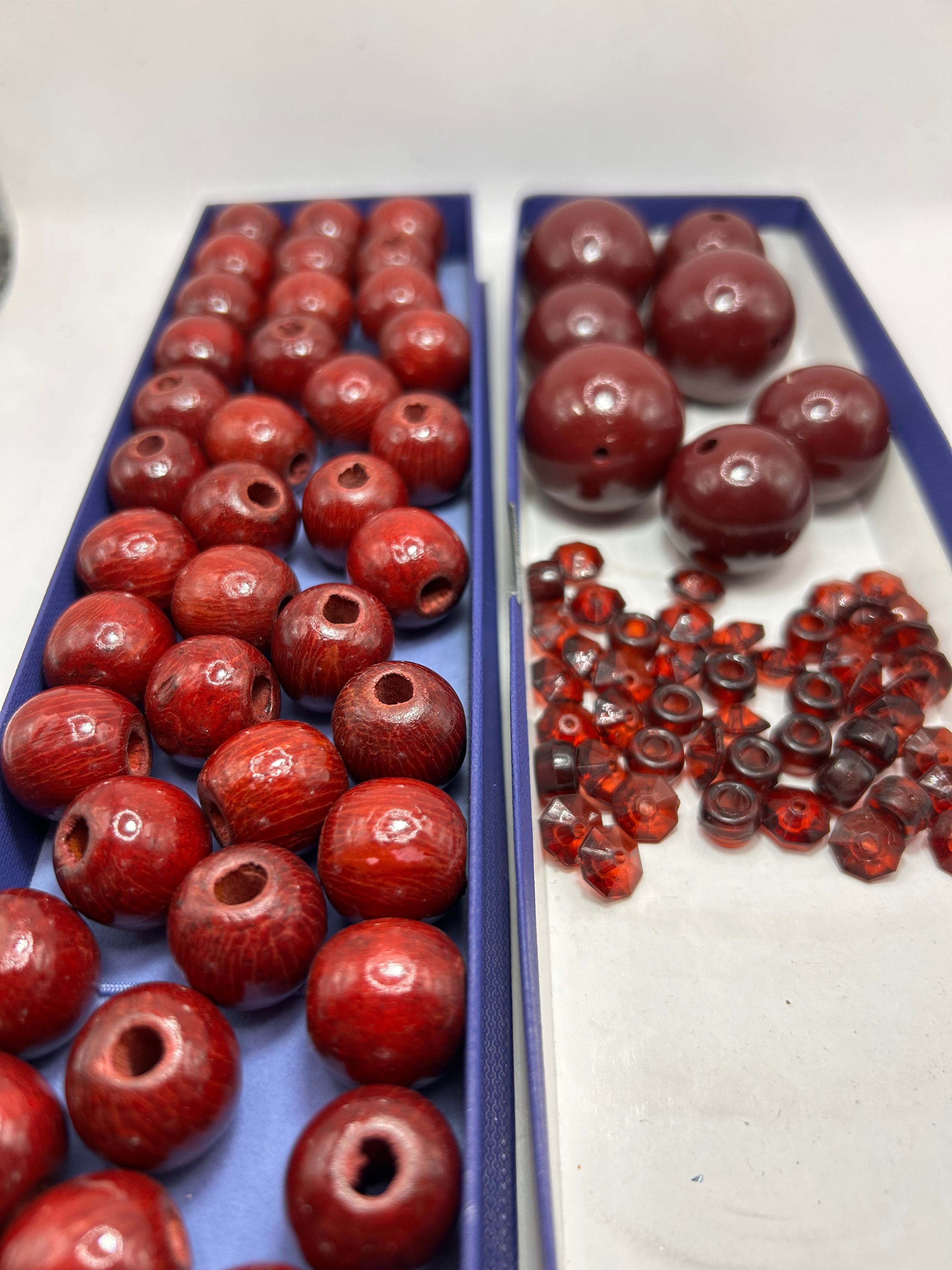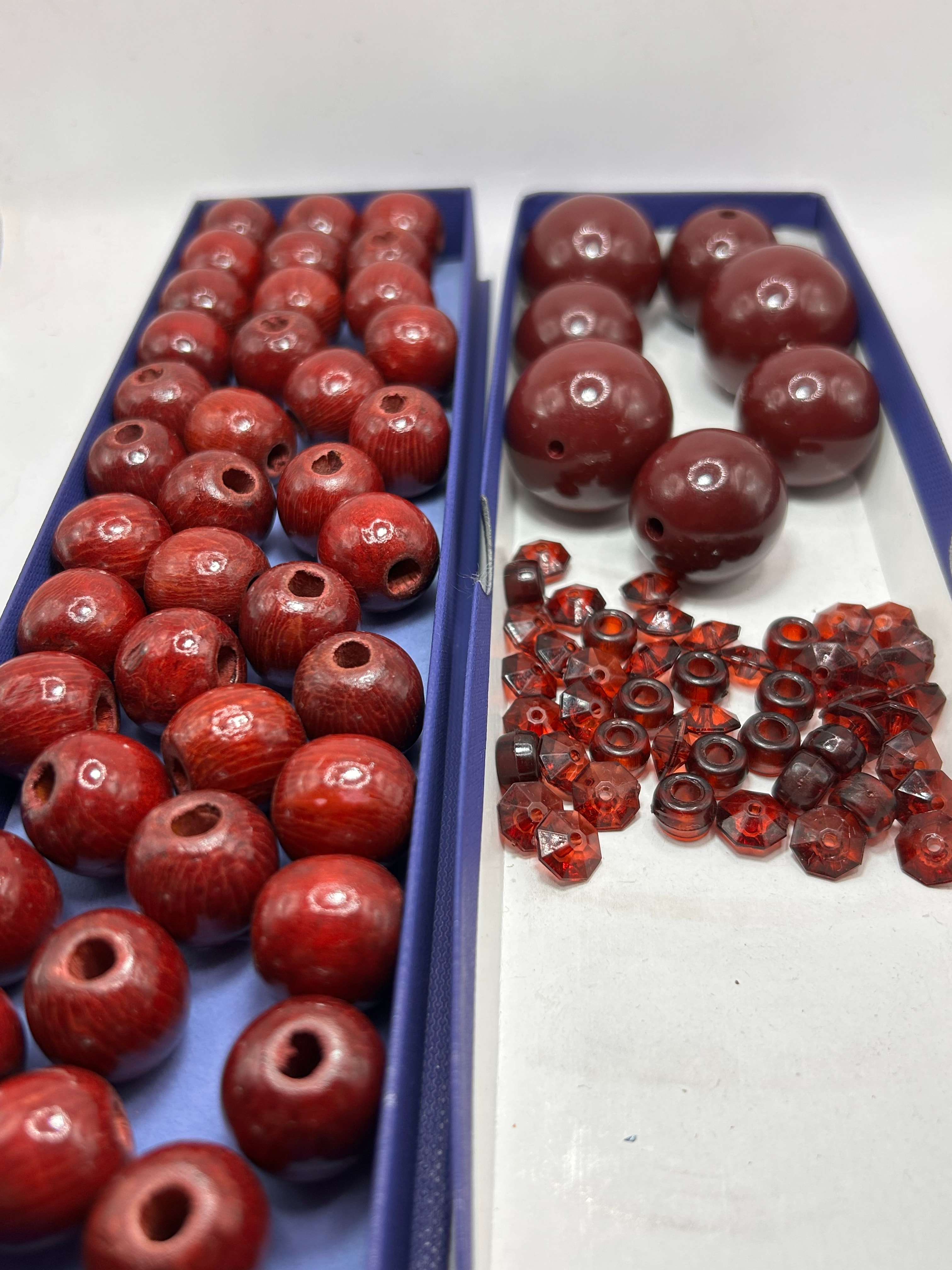 This item comprises a collection of assorted beads presented within two blue-lined compartmentalized boxes. The left box contains numerous uniform spherical beads, approximately 1-1.5 cm in diameter, exhibiting a reddish-brown stain or finish, consistent with stained wood. These beads align with market listings for “Craftdady Large Hole Round Wood Beads.” The right box is divided, featuring eight larger, glossy spherical beads, approximately 3-4 cm in diameter, in a deep reddish-burgundy hue, appearing to be crafted from a polymer material. Below these are numerous smaller, translucent red beads, predominantly faceted into geometric shapes or ring-like forms, suggesting plastic or glass.
