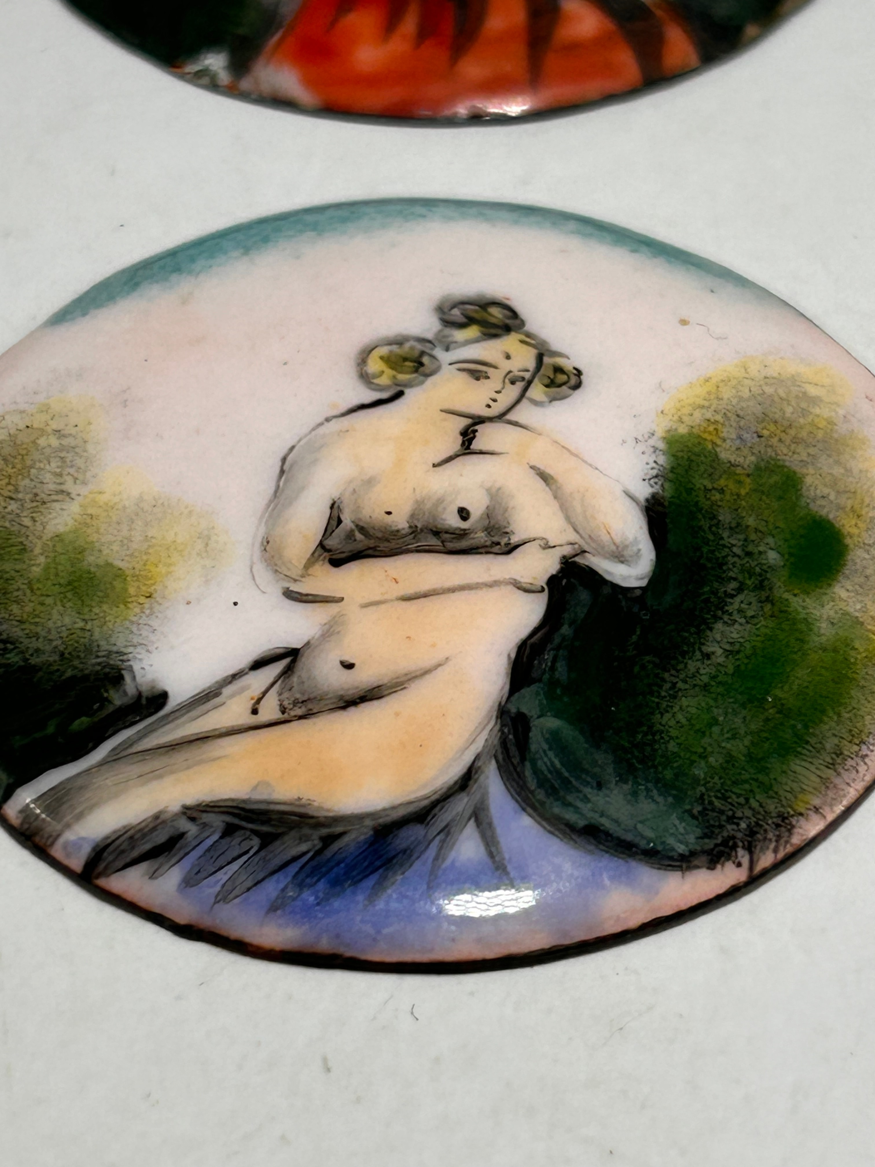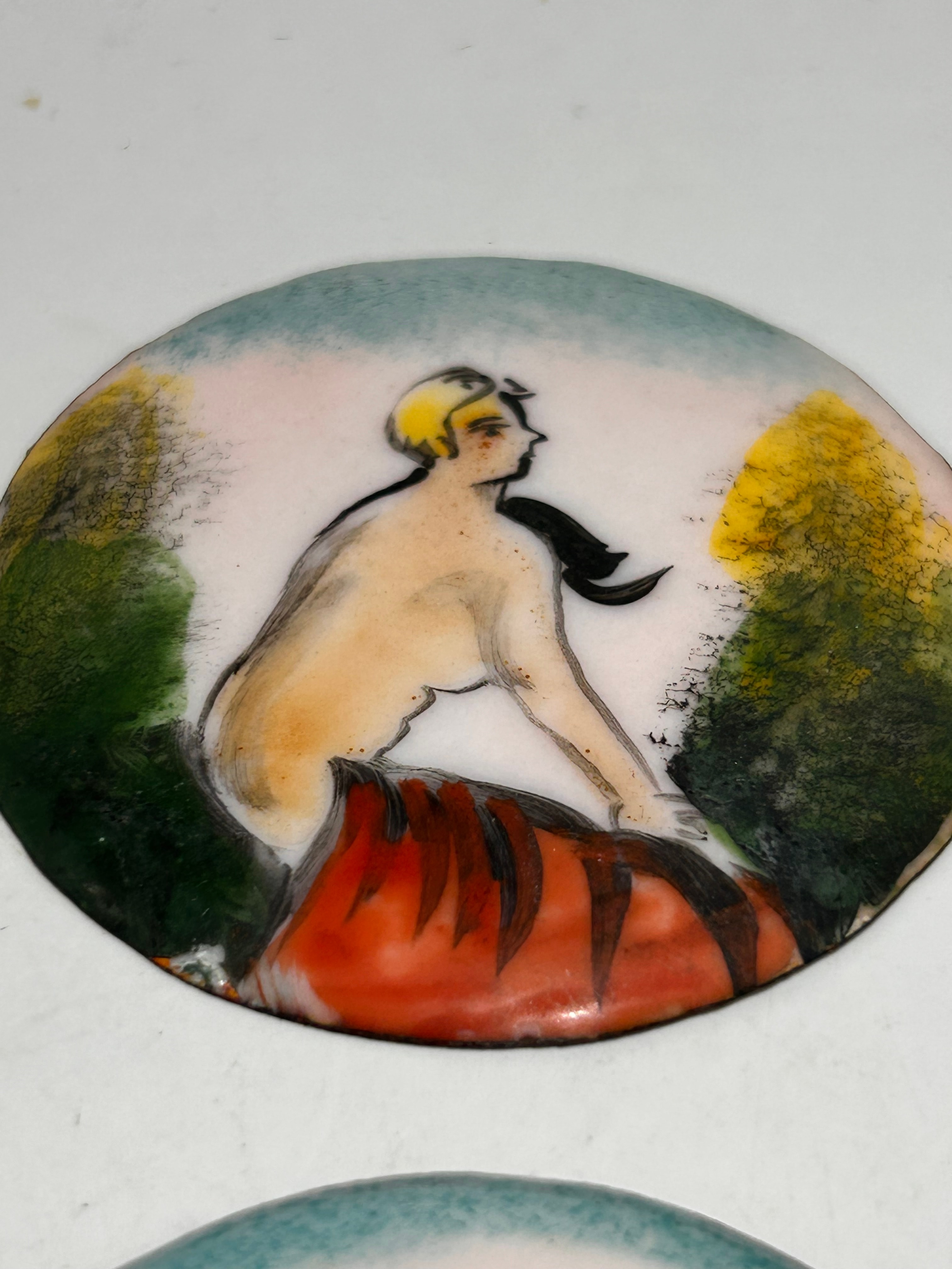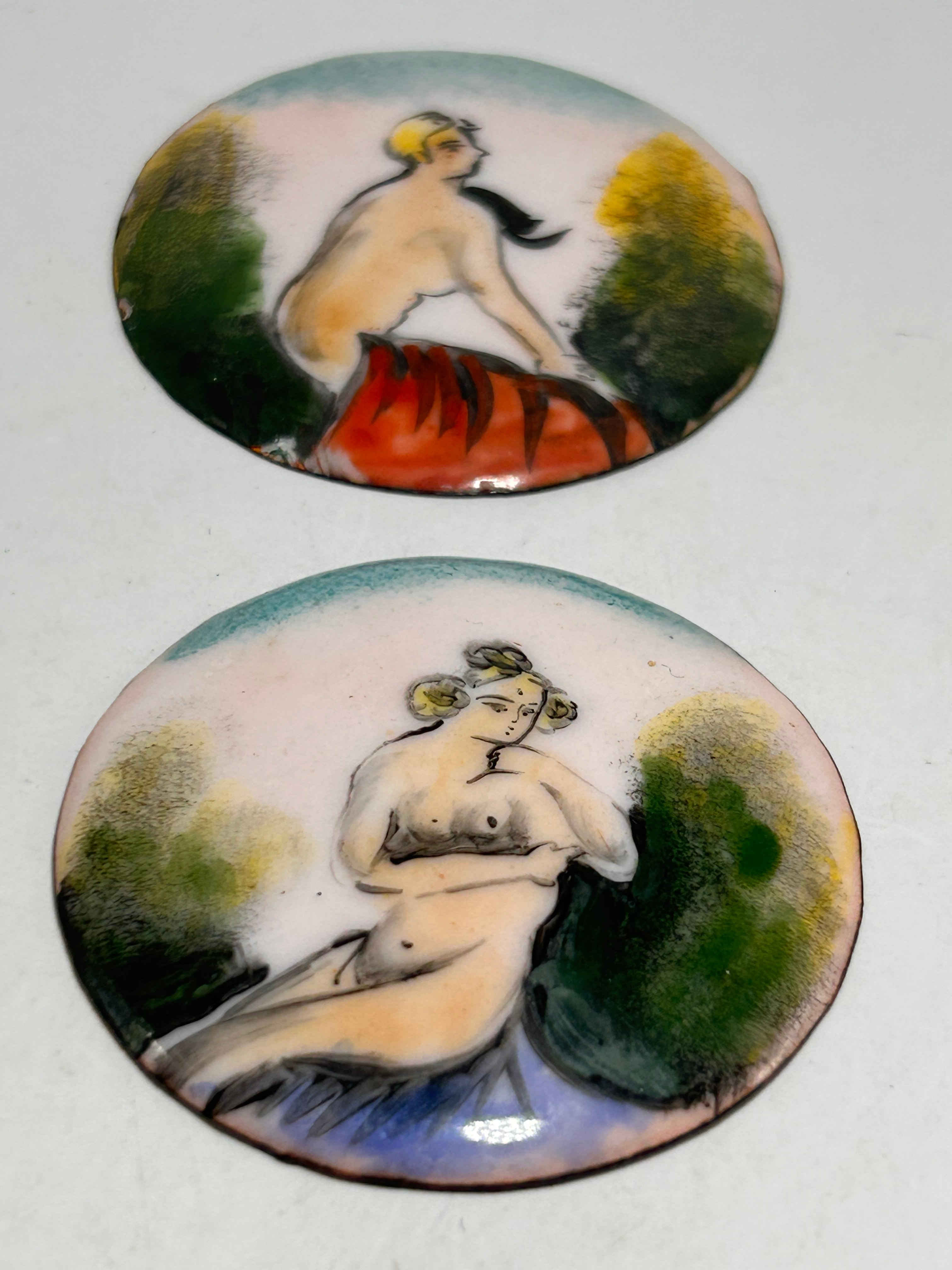 A pair of 1800s Victorian Nude Bohemian Style enamel plaques, likely on a metal substrate. Each circular, convex plaque depicts a nude female figure in a stylized natural setting. The first portrays a blonde woman seated in profile on a red striped form, while the second depicts a blonde woman with styled hair, seated or reclining with crossed arms on a blue draped form amidst foliage. Both pieces feature prominent dark outlines and a vibrant color palette including skin tones, yellow, green, blue, and red against an off-white ground. The artistic style, while described as Victorian in market listings, also shows influences of early to mid-20th-century Art Nouveau or Art Deco aesthetics. No visible text or markings are present.