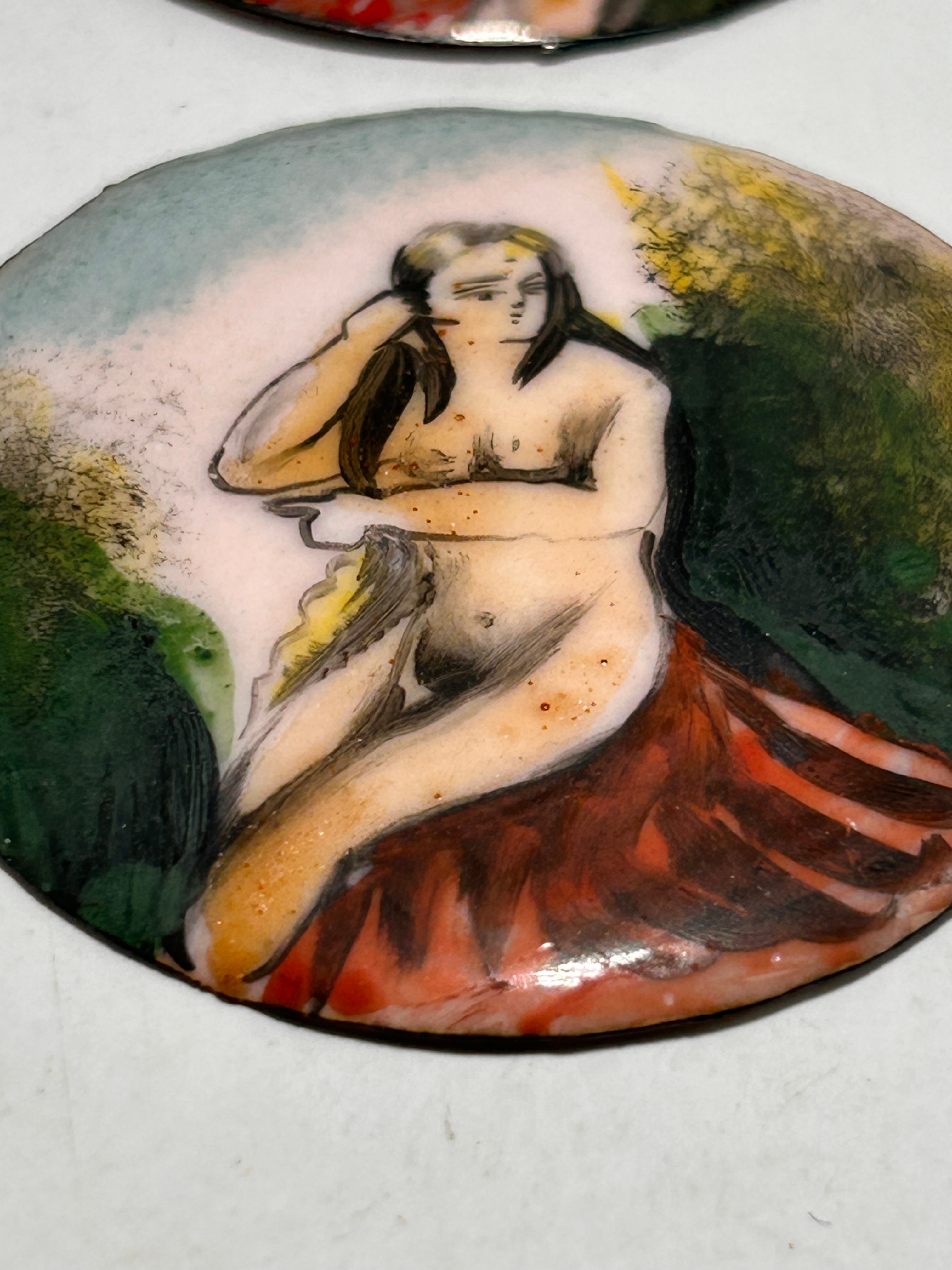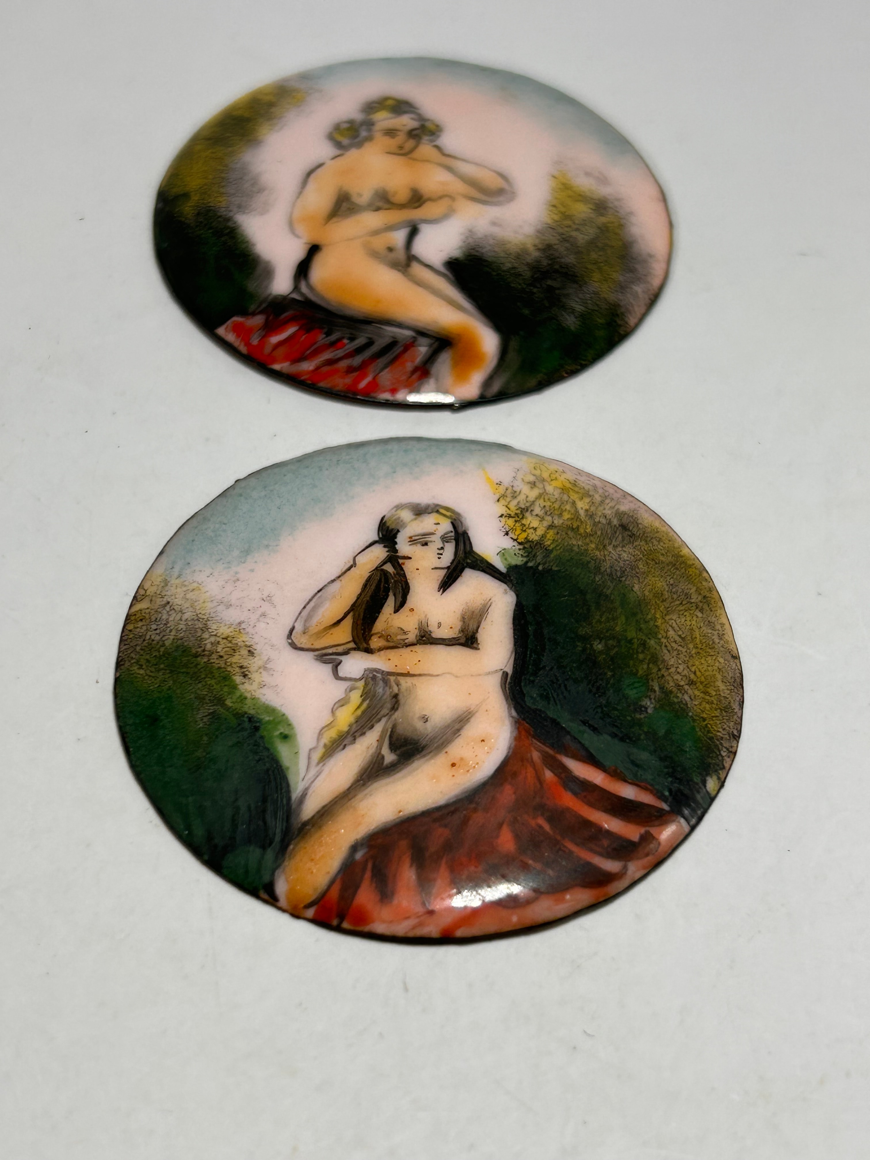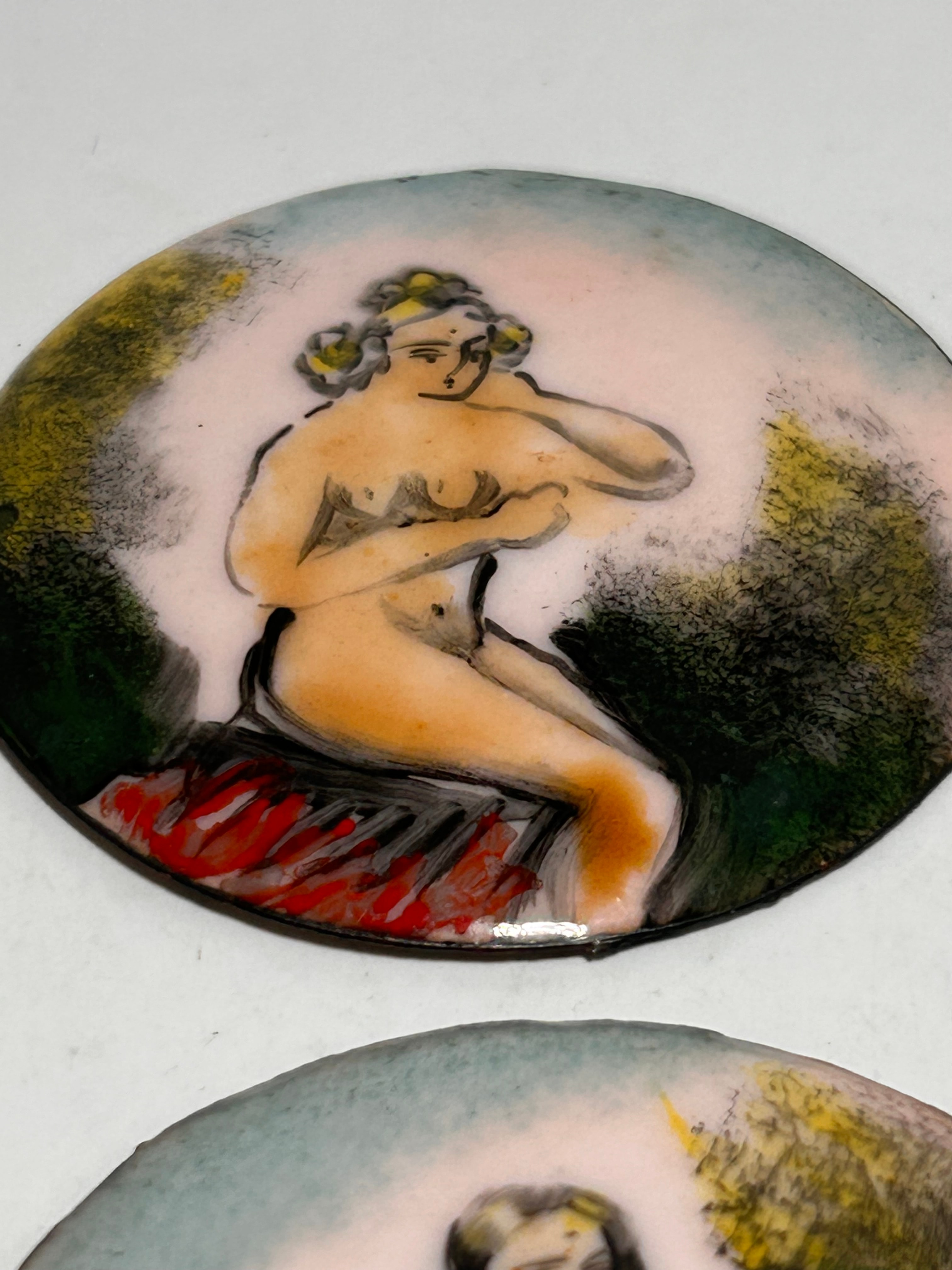 A pair of circular, convex painted enamel plaques, each depicting a classical or allegorical nude female figure in a landscape setting, indicative of a Neoclassical or Romantic era aesthetic. Both figures are rendered with outlined forms and a palette of flesh tones, blues, greens, and reds against a pale pink background, with one figure covering her chest and the other her head and chest.