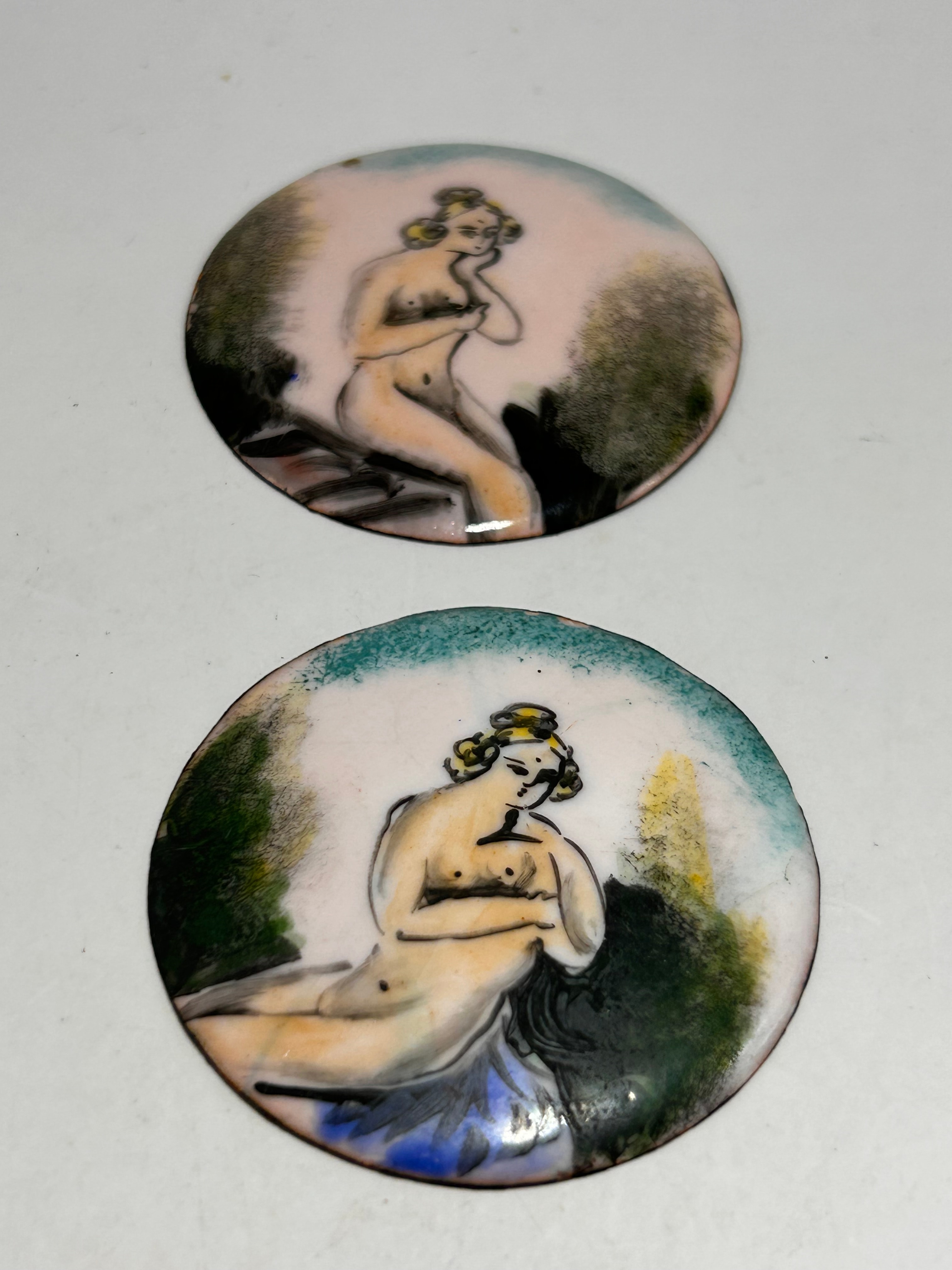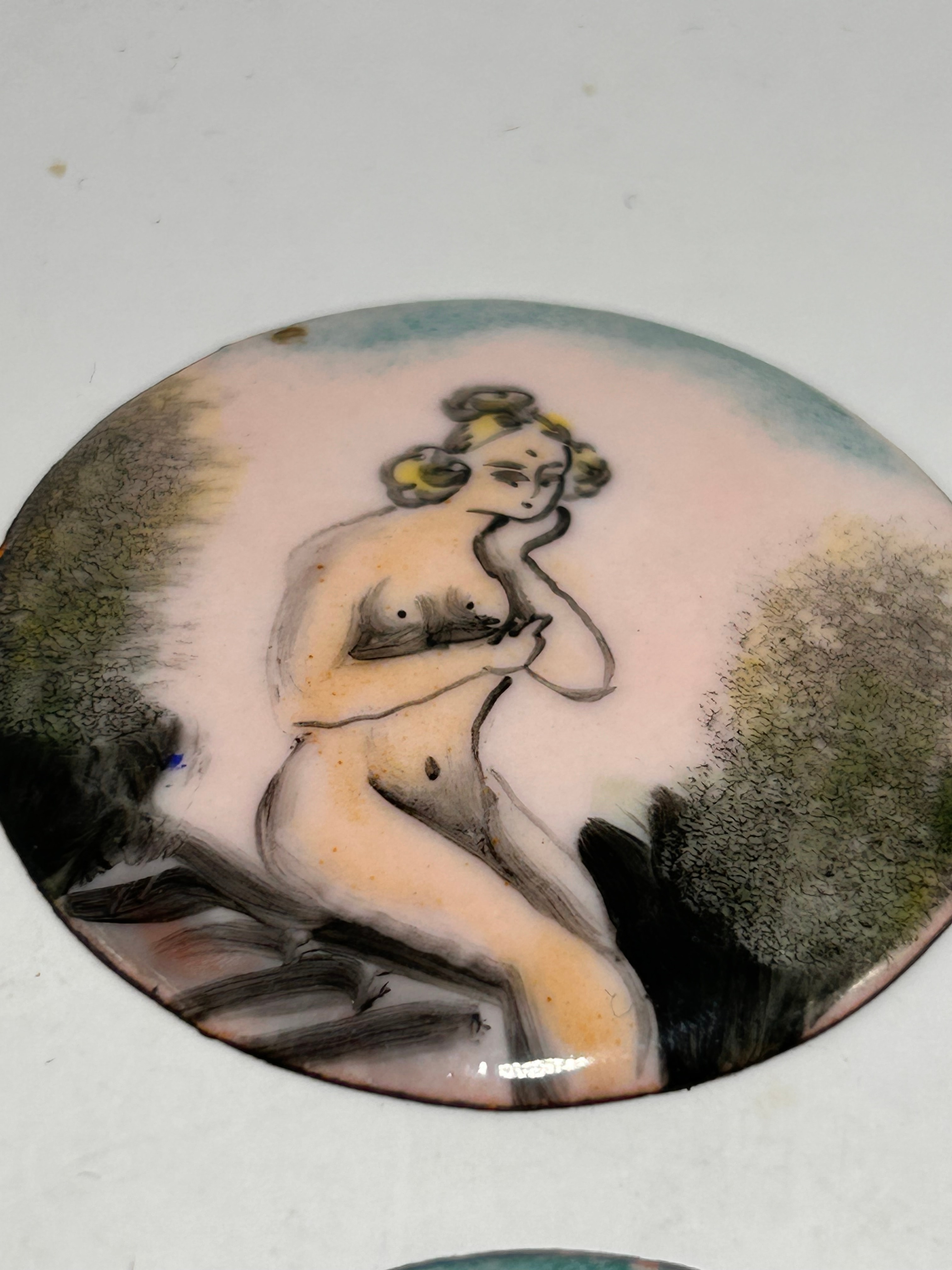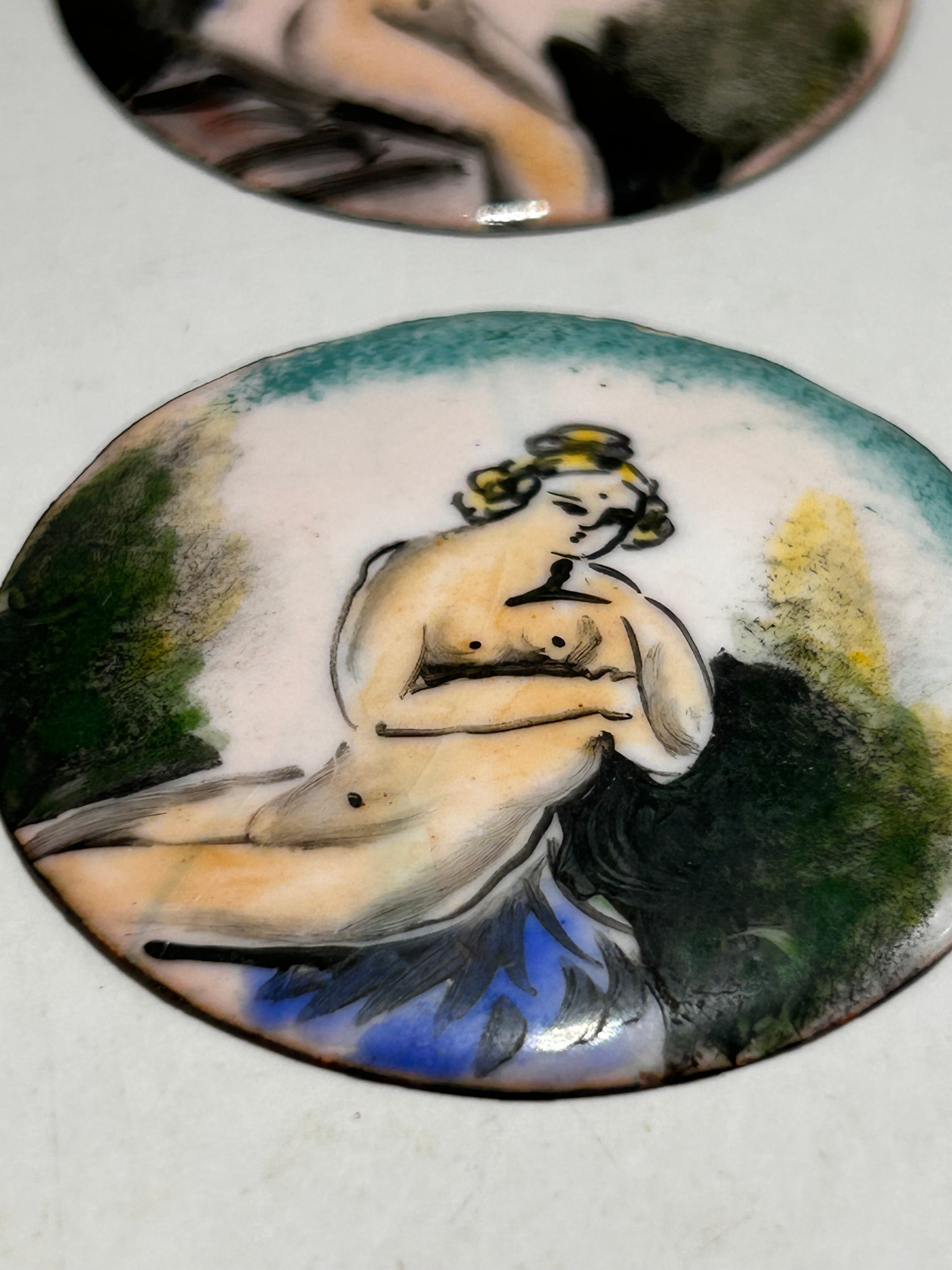 A pair of circular enamel plaques, each depicting a classical-style female nude figure in a landscape setting. One plaque features a seated figure with a pensive pose, while the other shows a reclining figure. Both exhibit an illustrative drawing style with prominent outlines and a subdued color palette, including pink, green, yellow, and blue hues. The enamel is applied to a dark metal base, likely copper or steel, which is visible along the slightly uneven edges. No visible text or markings are present.