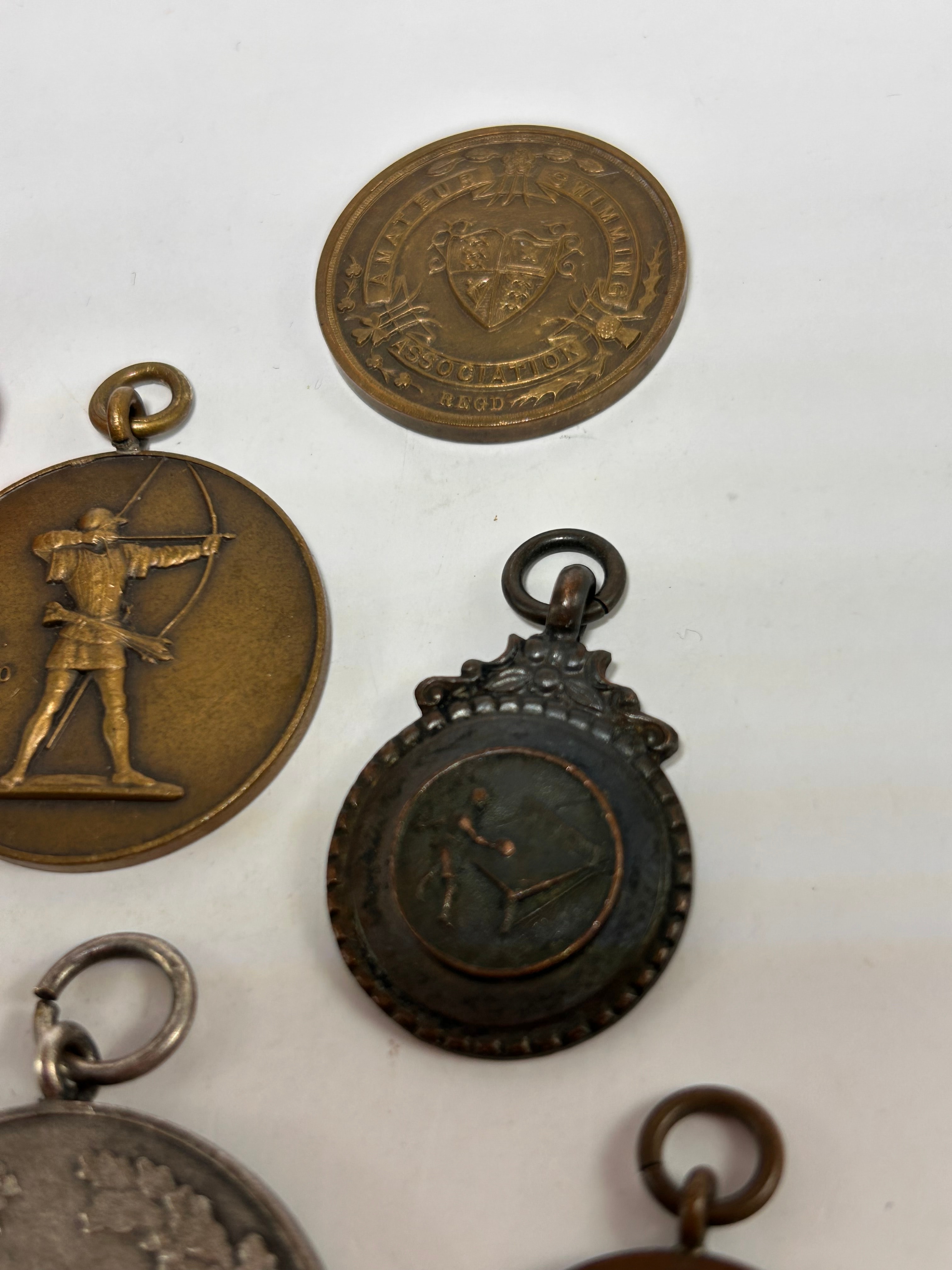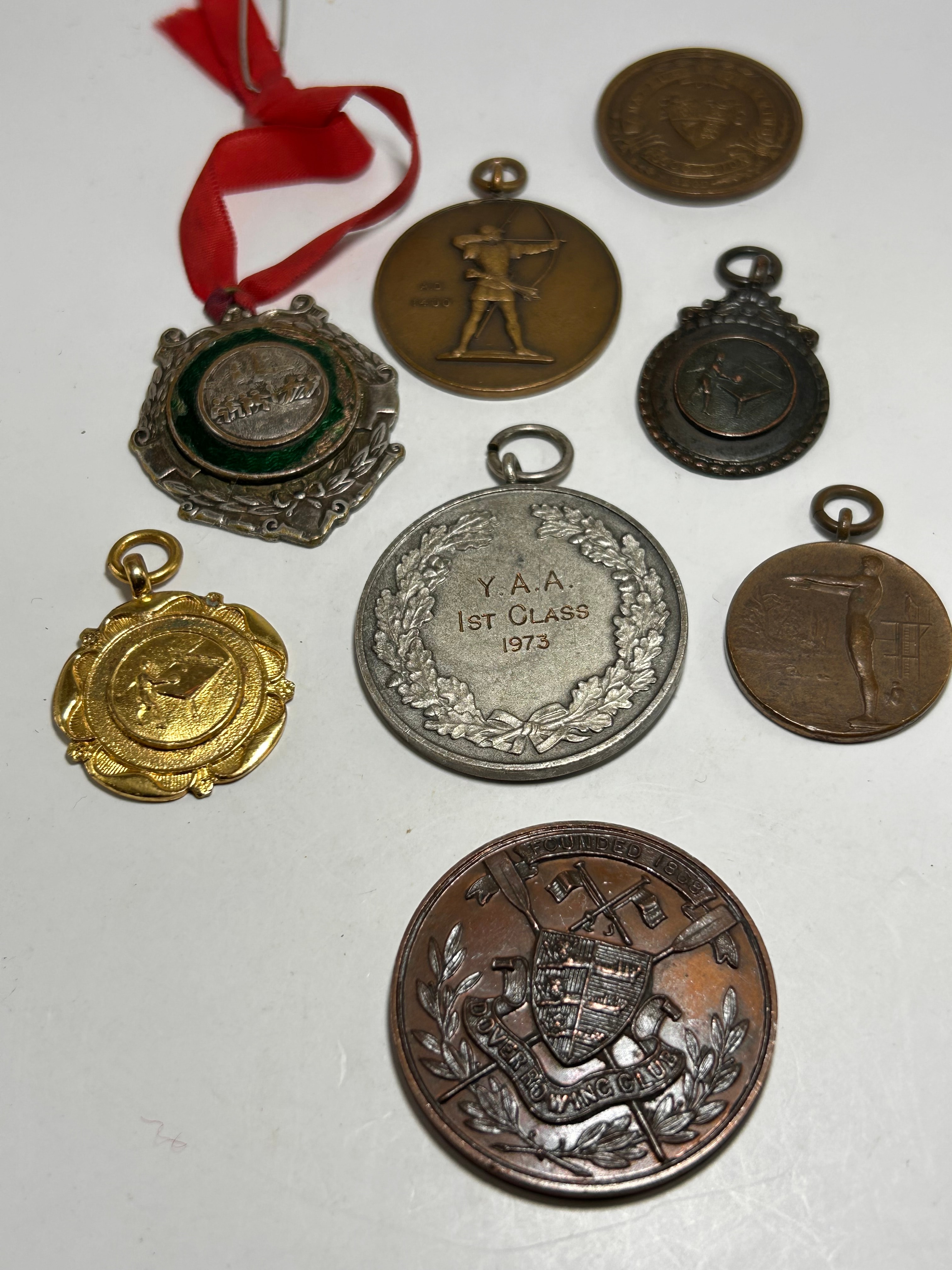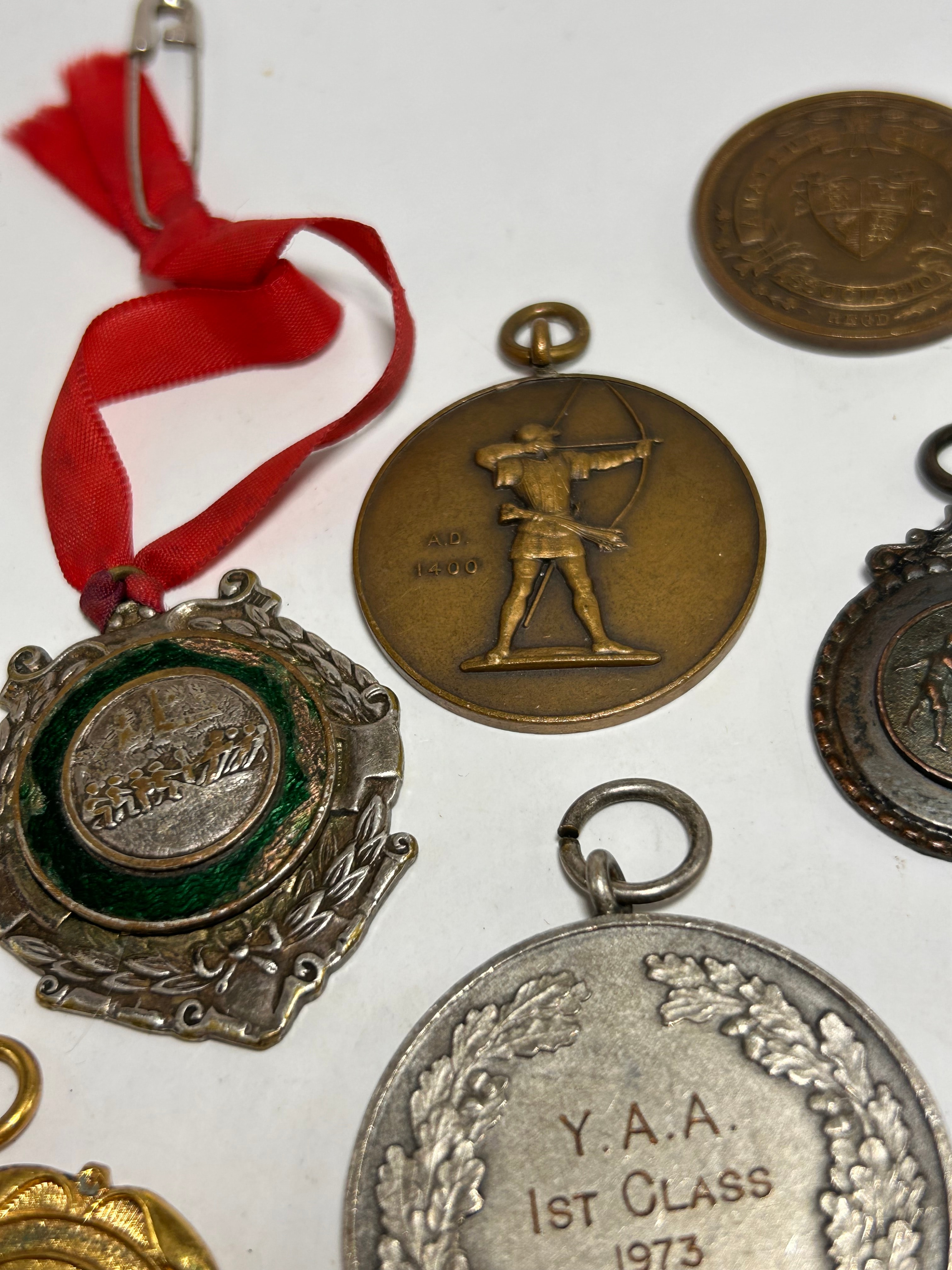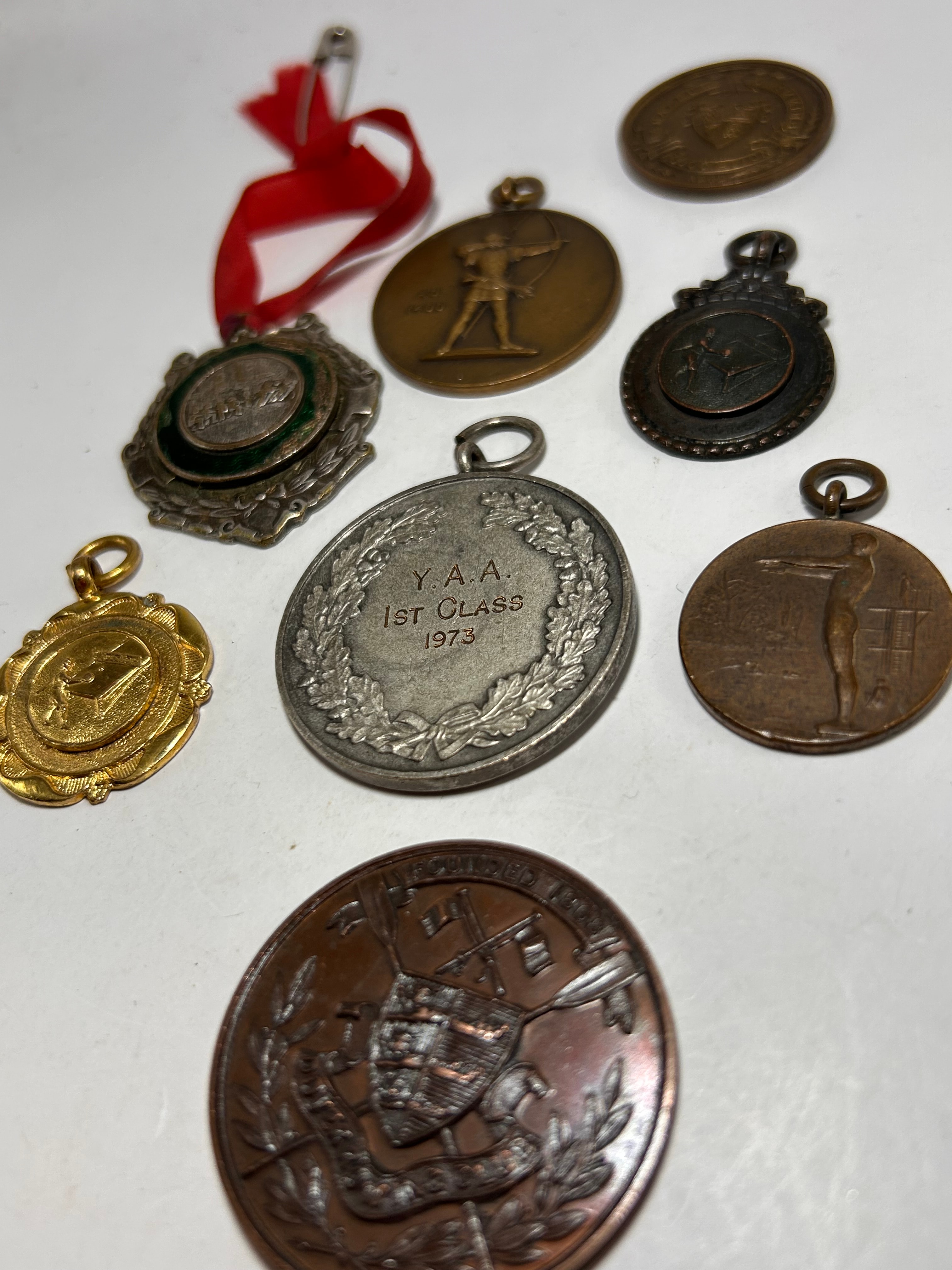 This collection comprises eight circular medals and awards, varying in size and finish, primarily crafted from bronze, copper-toned, silver-toned, and gold-toned metals. One medal is suspended from a creased red fabric ribbon attached with a safety pin, while others feature integrated suspension loops. Visible motifs include an archer drawing a bow, a standing female figure, and intricate heraldic crests often framed by laurel wreaths. Several pieces bear inscriptions such as “Y.A.A. 1ST CLASS 1973,” “A.P. 1400,” “ASSOCIATION REG D,” and the Latin motto “VINCIT QUI SE VINCIT” (He conquers who conquers himself).
