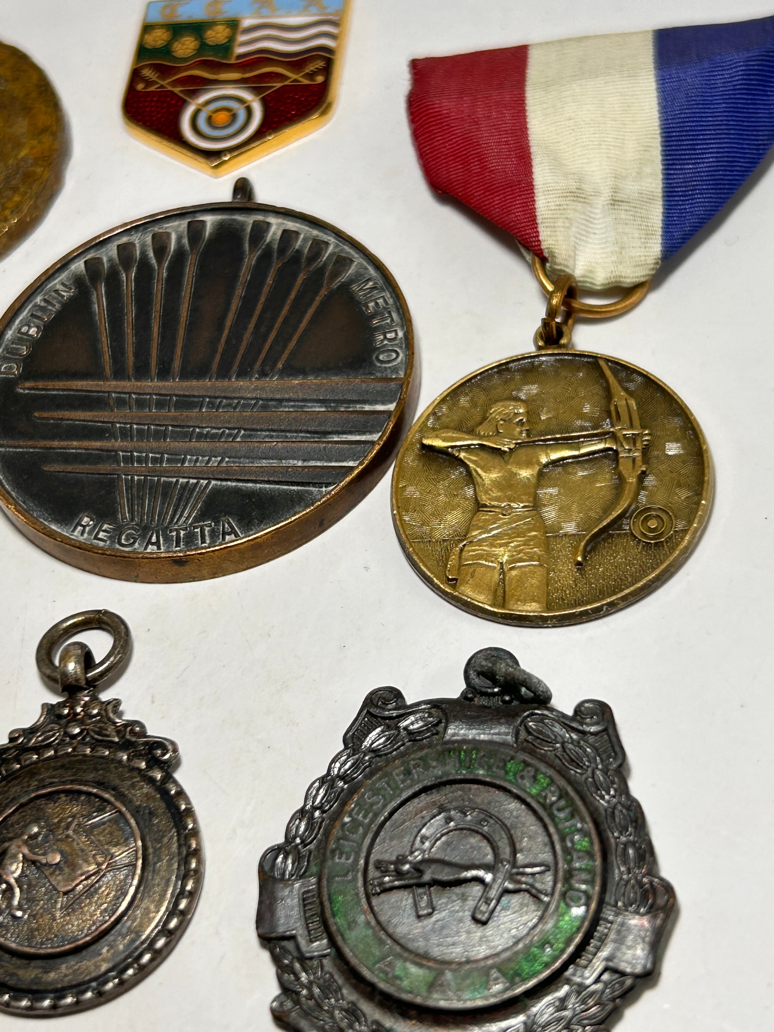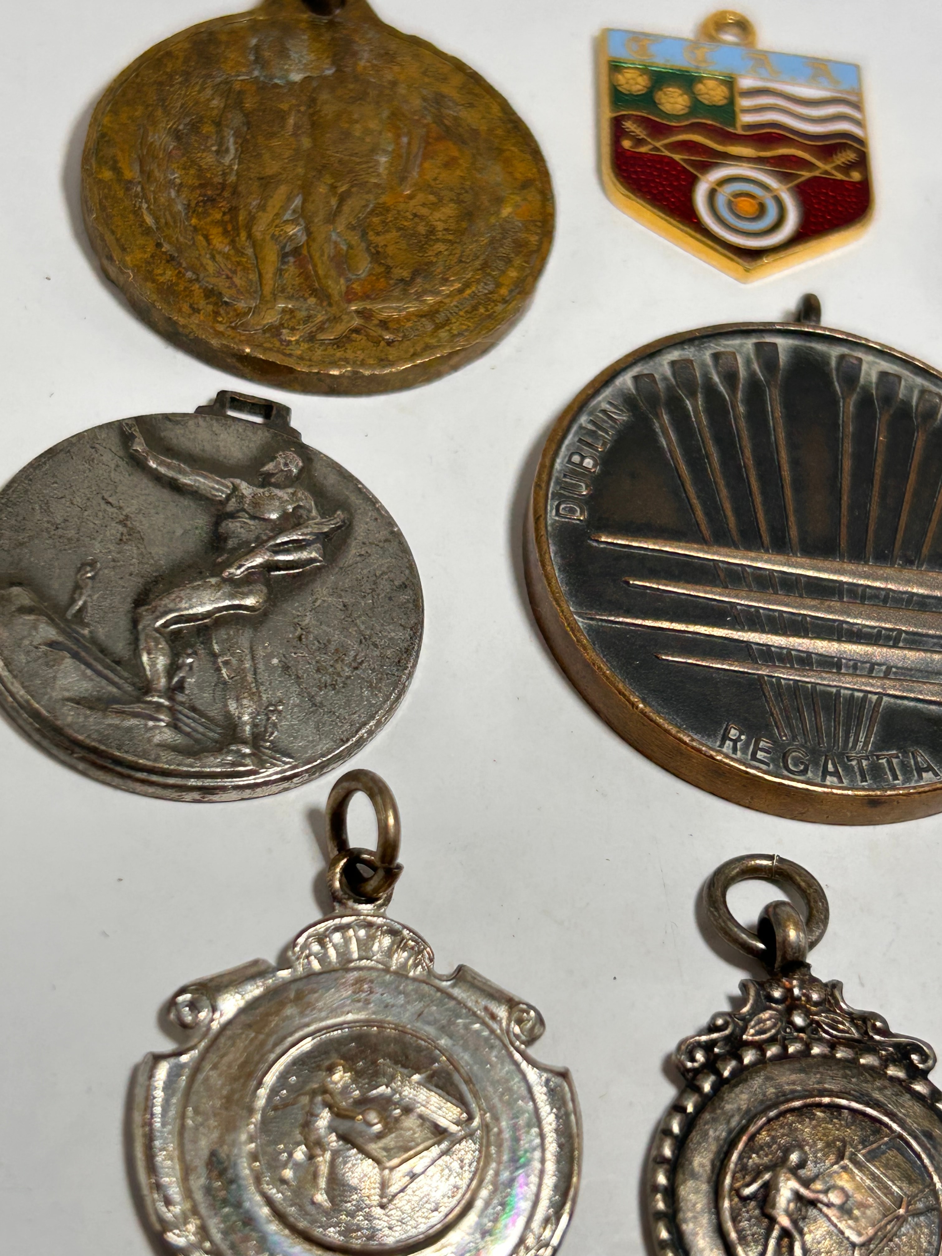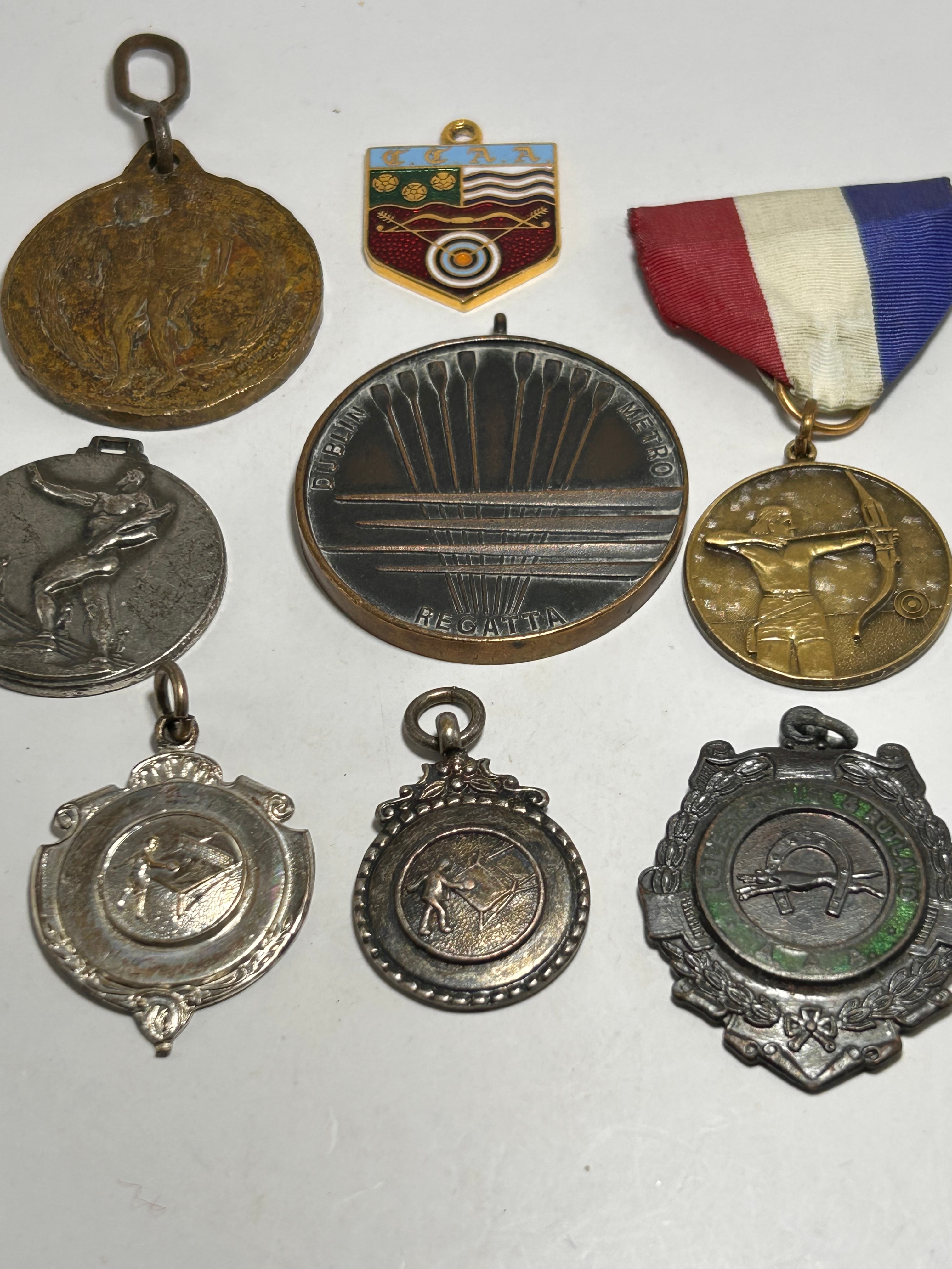 A collection of 8 vintage fob medals and pendants, crafted from various metals including bronze-tone, silver-tone, and dark patinated alloys. While examples of similar items are often found in sterling silver, and some by makers such as Fattorini, specific hallmarks are not visible on all pieces within this lot. The medals and pendants are predominantly circular or ornate shield-shaped. One smaller shield-shaped item features colorful enamel with a multi-part design including waves and a target. The depictions on the medals cover a range of activities and figures, including a classical-style draped figure, an archer, a diver or swimmer, multiple rowing sculls, and figures engaged in racket sports. One medal displays a prominent horseshoe motif with green enamel, inscribed ‘LEICESTER RURAL’. Another large rowing medal is inscribed ‘DUBLIN METRO REGATTA’. One medal is suspended from a red, white, and blue tricolor ribbon.