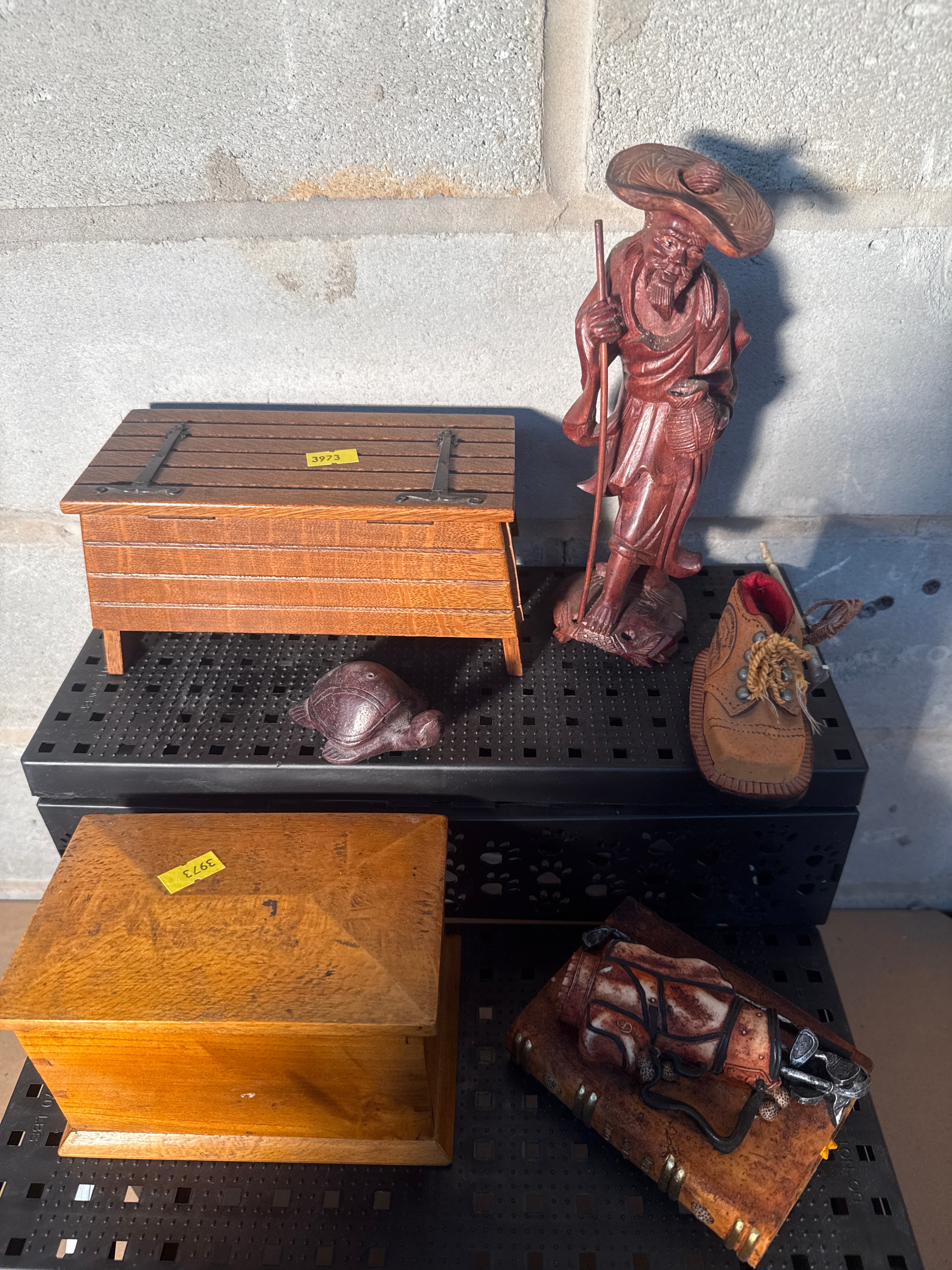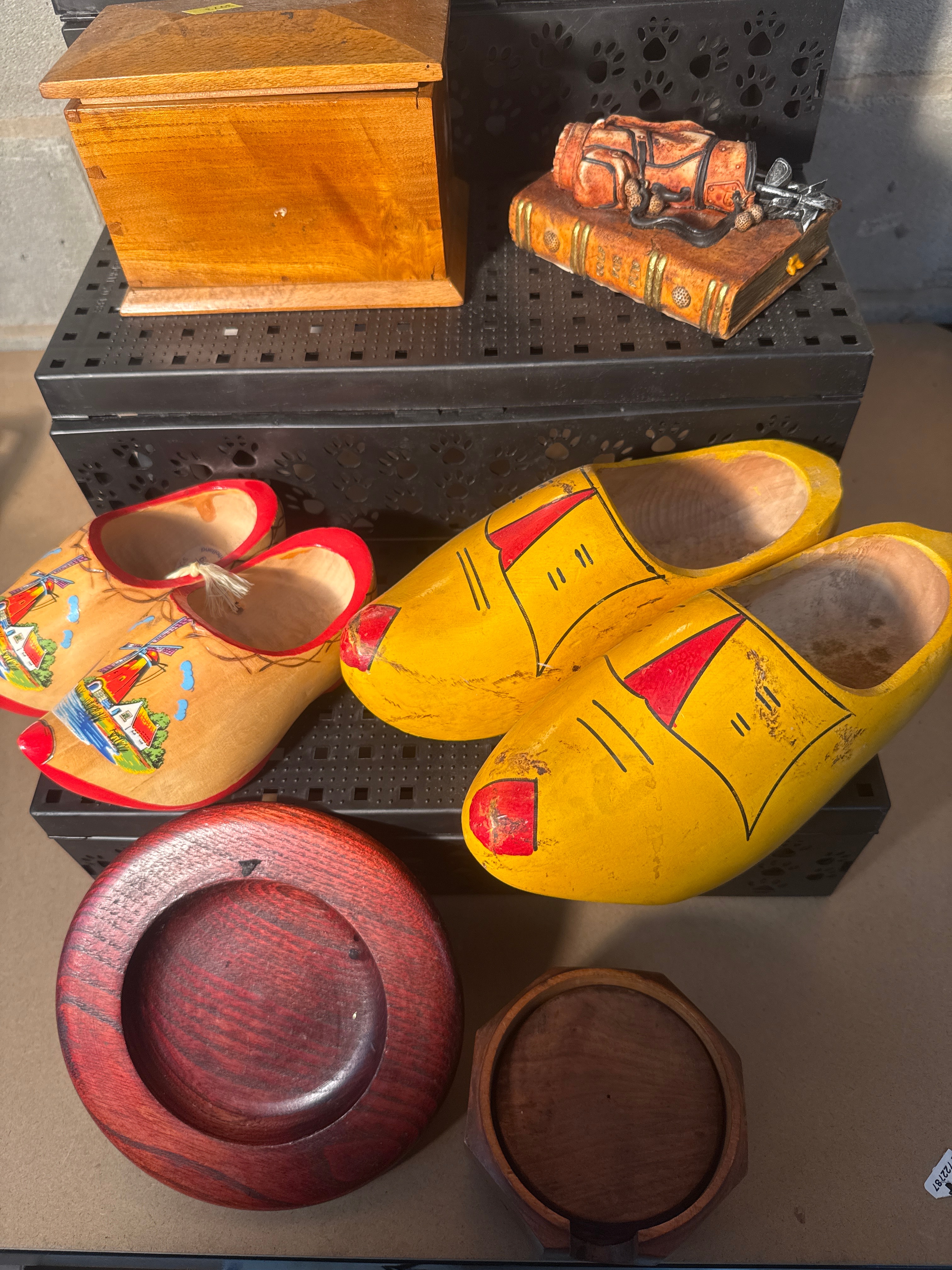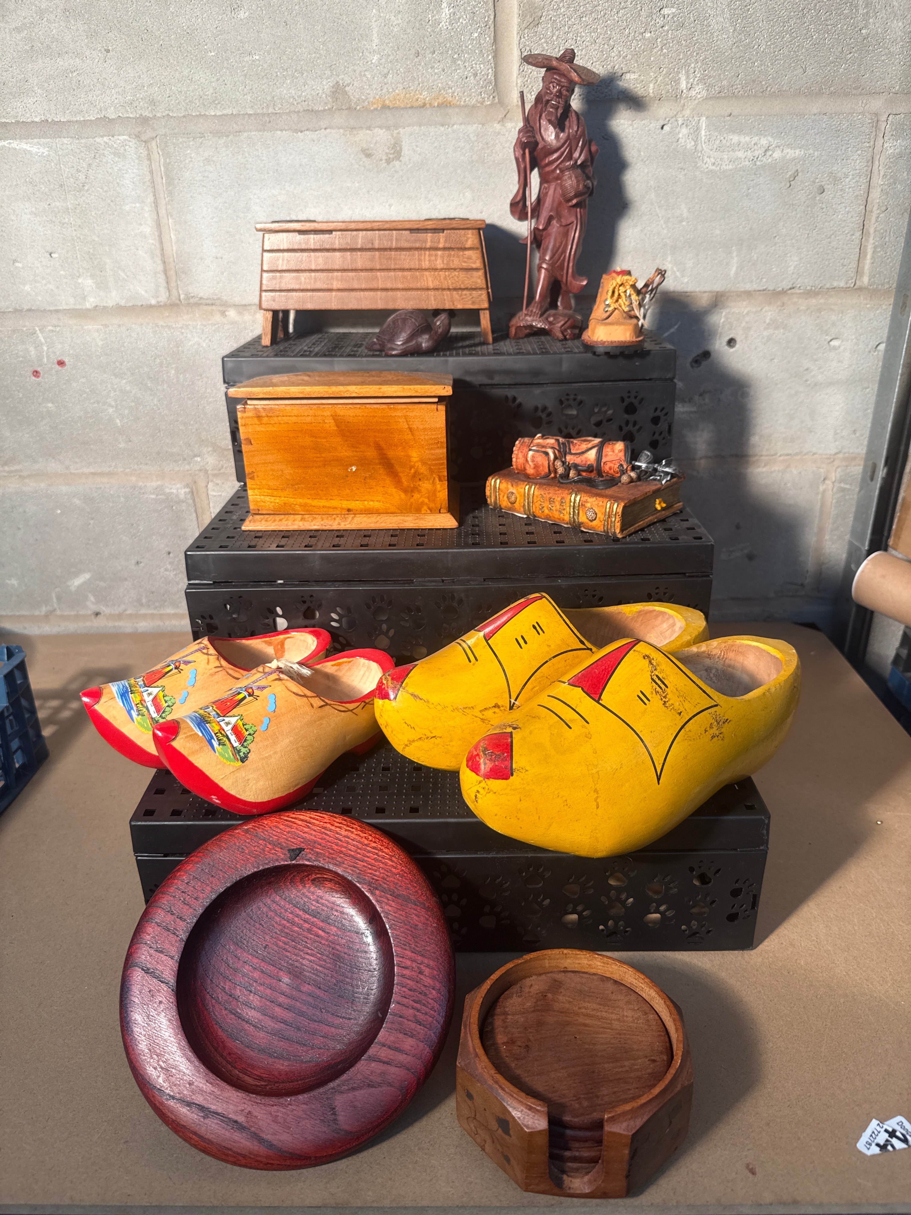 A collection featuring two pairs of Dutch wooden clogs (klompen). One pair is crafted from natural wood with hand-painted Dutch windmill scenes and red trim. The second pair is painted yellow with red and black geometric designs, with one clog internally marked “37”. Accompanying these are two light-colored wooden boxes, one with a hinged lid and the other with a simple lid, both bearing “3973” stickers. Also included are a dark carved wooden figurine depicting an Asian-style man with a wide-brimmed hat and staff, a small dark wooden turtle figurine, a single decorative boot-shaped object, a stack of faux leather-bound books with a metal accent, a large circular dark reddish-brown wooden dish, and an octagonal wooden coaster holder.