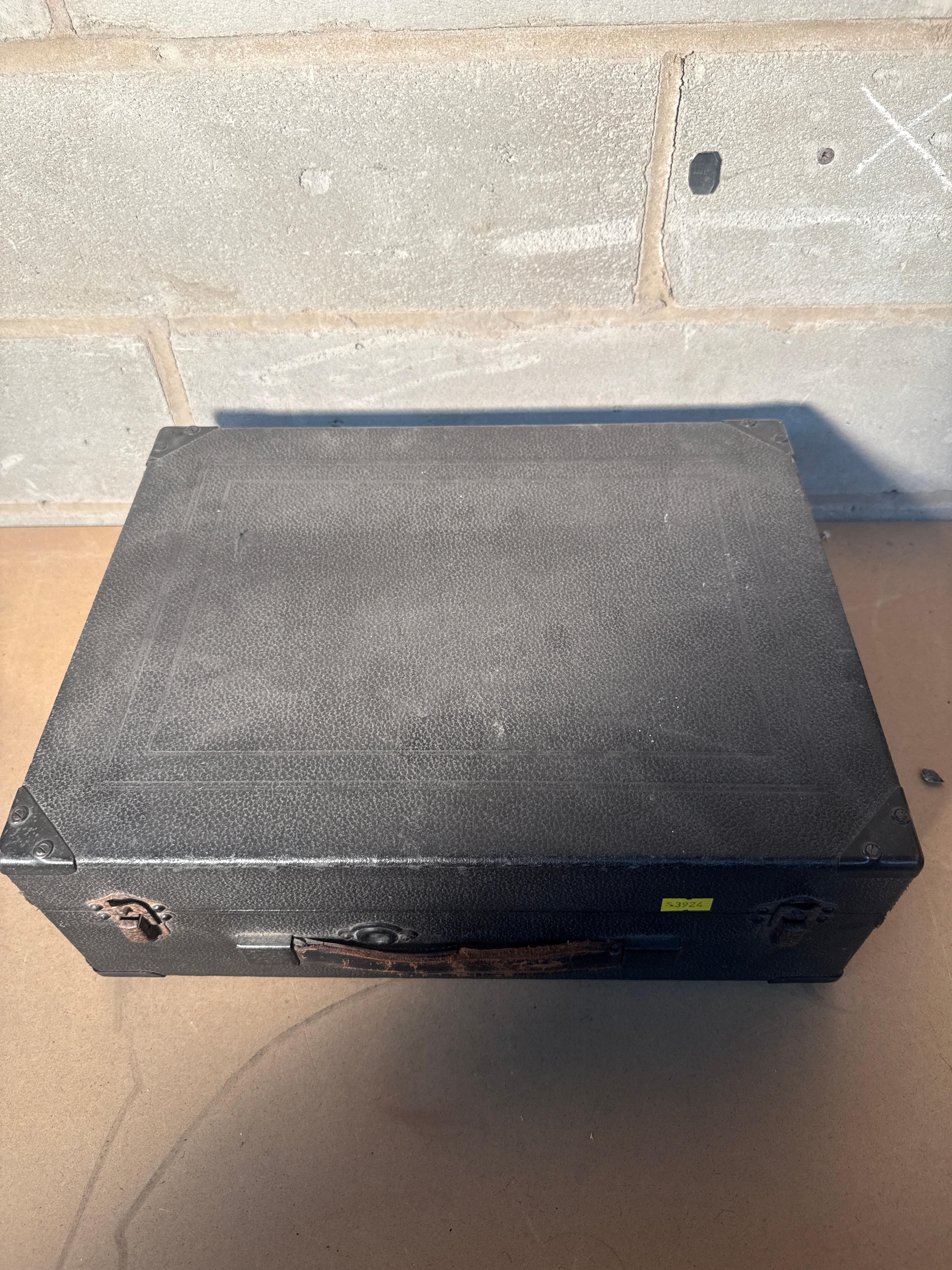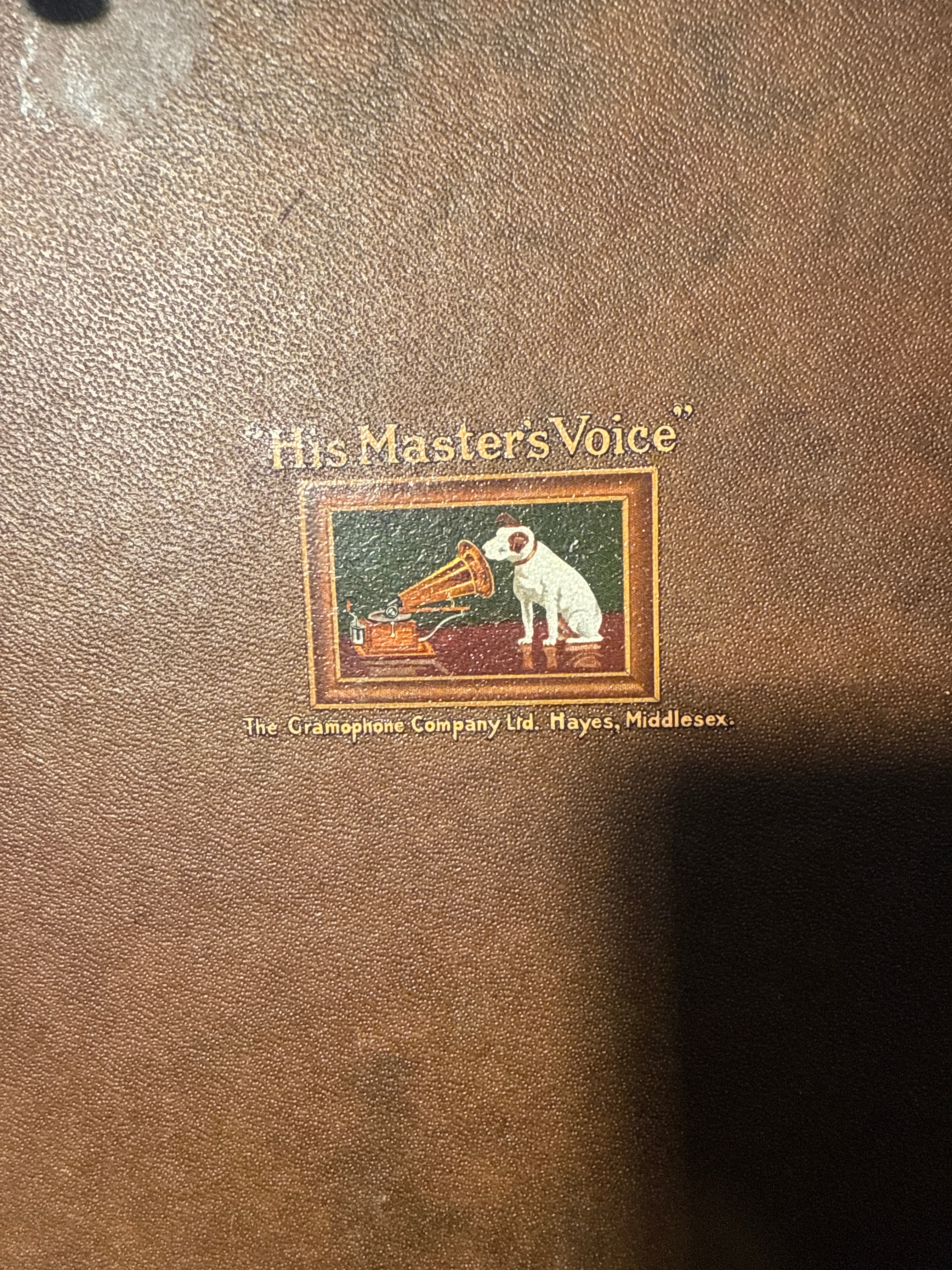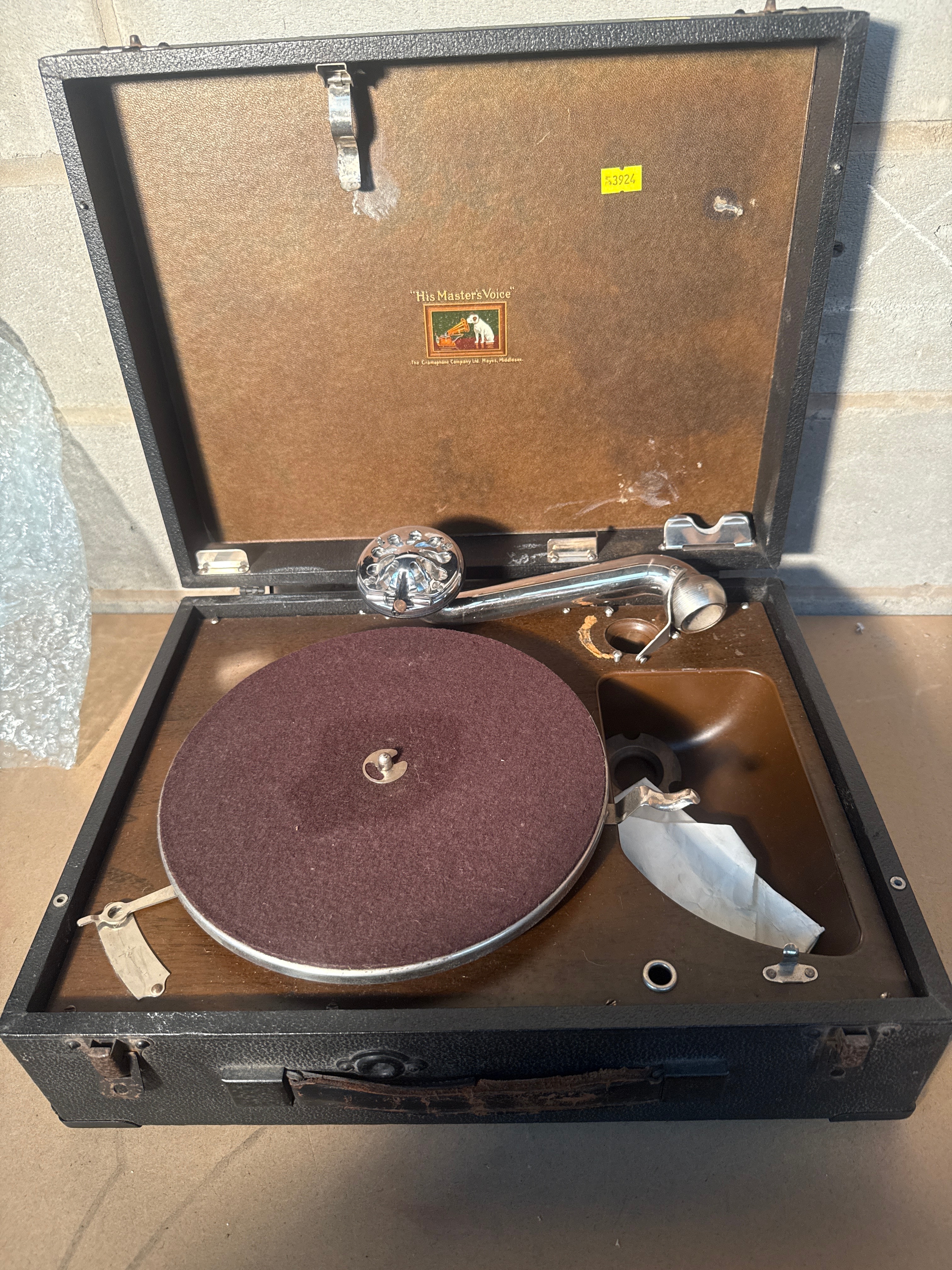 A ‘His Master’s Voice’ portable gramophone, identifiable as an early to mid-20th-century model. The instrument is housed within a dark, textured, suitcase-style wooden case with metal hardware. The interior features a maroon felt-covered turntable and a chrome-plated tone arm with soundbox. The lid’s interior proudly displays the iconic “His Master’s Voice” logo featuring Nipper the dog, accompanied by the manufacturer’s inscription: “The Gramophone Company Ltd. Hayes, Middlesex.” A yellow sticker marked “50/00” is also present.