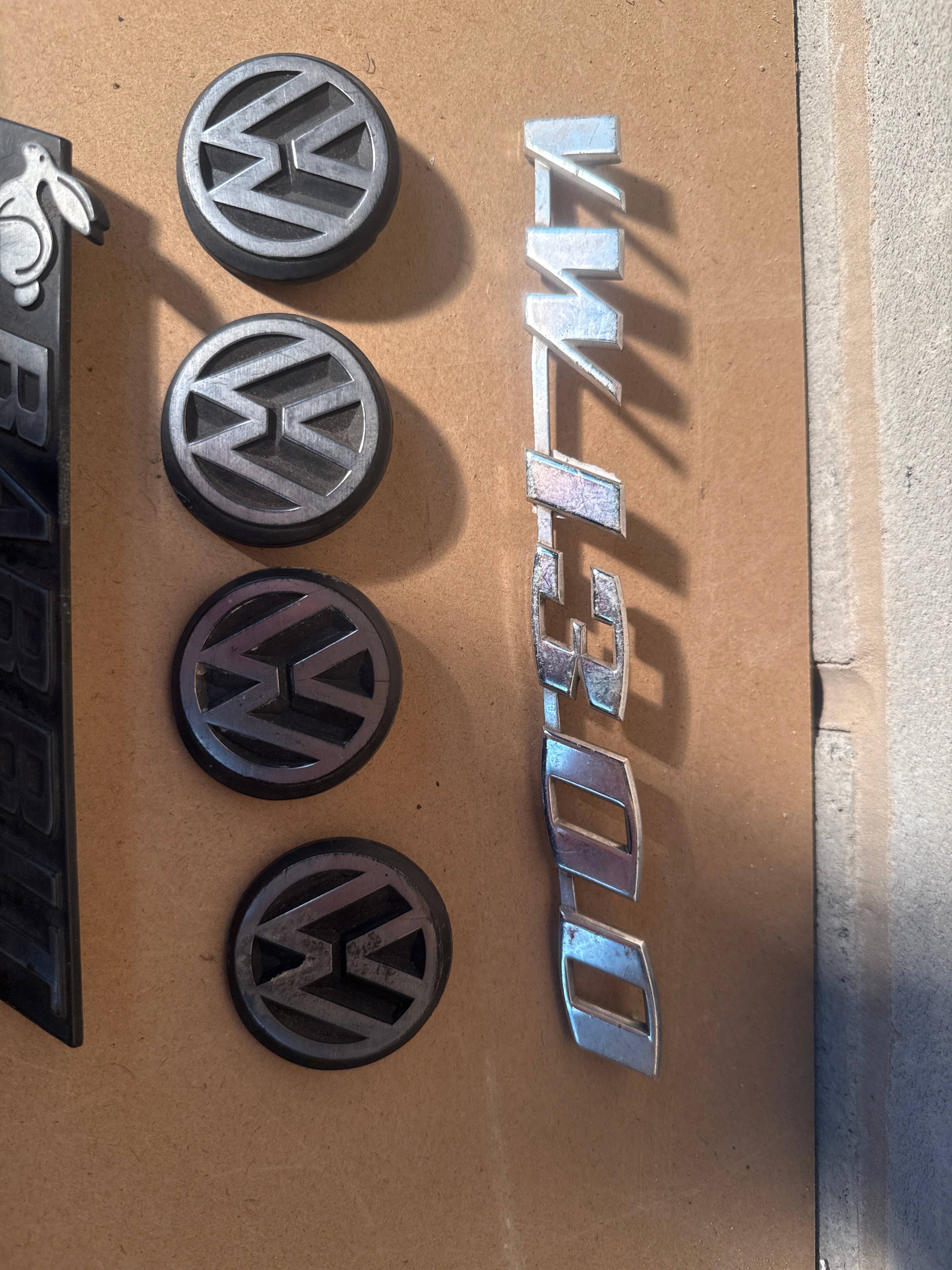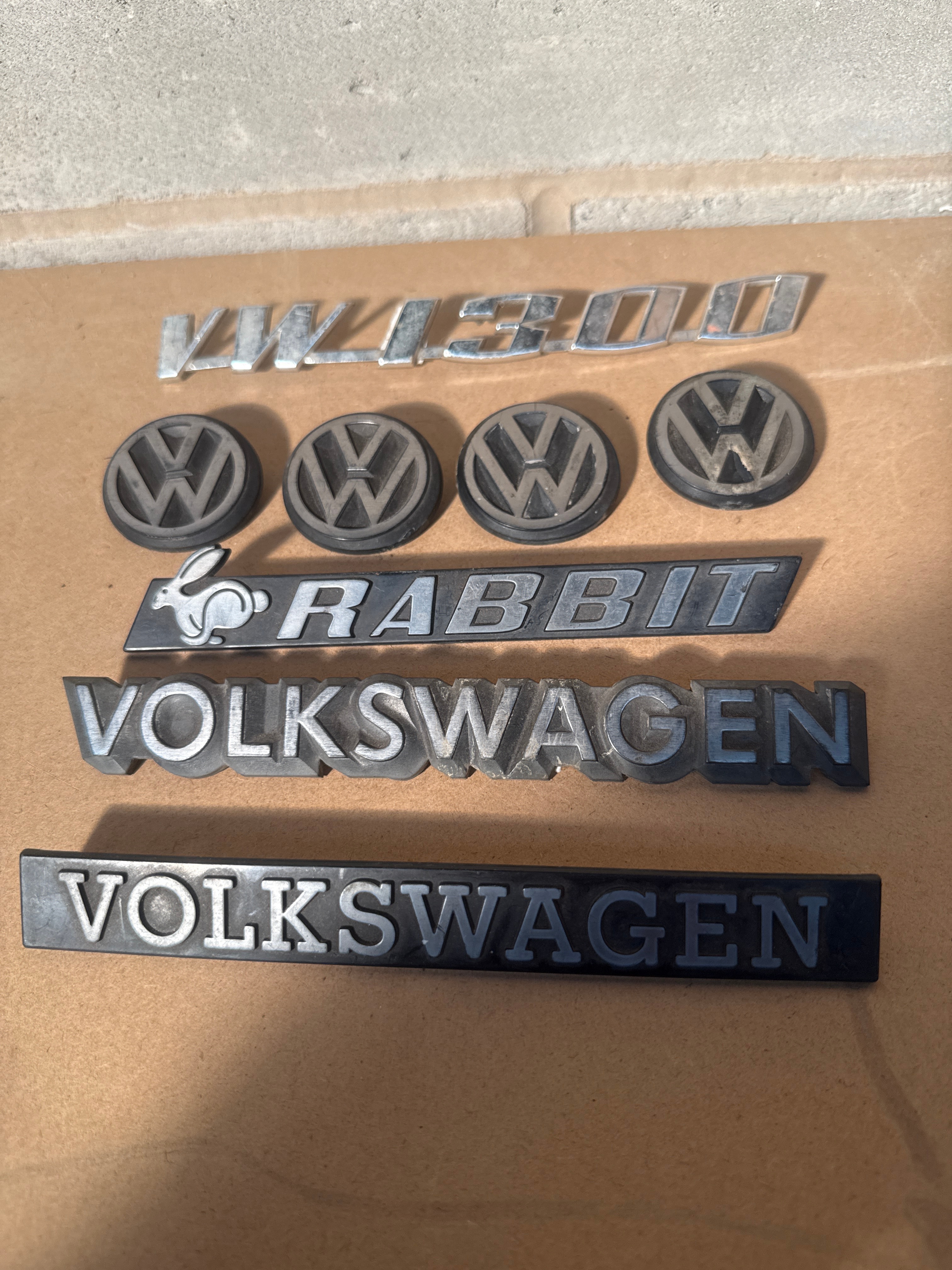 A collection of seven vintage and classic Volkswagen automotive emblems and badges. These exterior badges are primarily associated with Volkswagen vehicles. The lot comprises a horizontal ‘VW 1300’ badge, four circular ‘VW’ logos, a ‘RABBIT’ badge featuring a rabbit silhouette (consistent with Mk1 Rabbit/Golf models), an older-style ‘VOLKSWAGEN’ script, and a more modern ‘VOLKSWAGEN’ script on a rectangular black plate. Materials appear to be metal, likely chrome-plated or brushed, with some pieces incorporating black backings or insets.