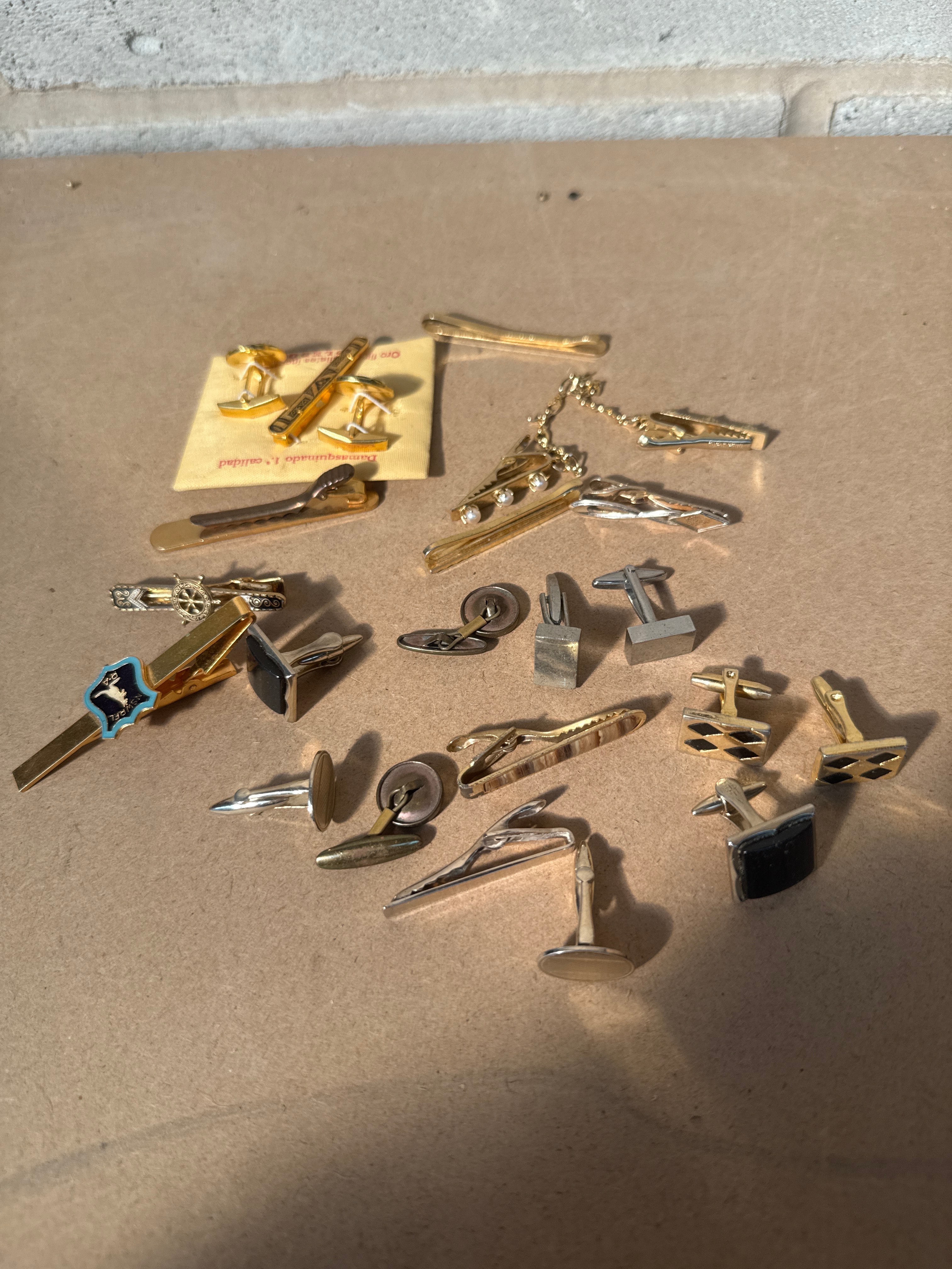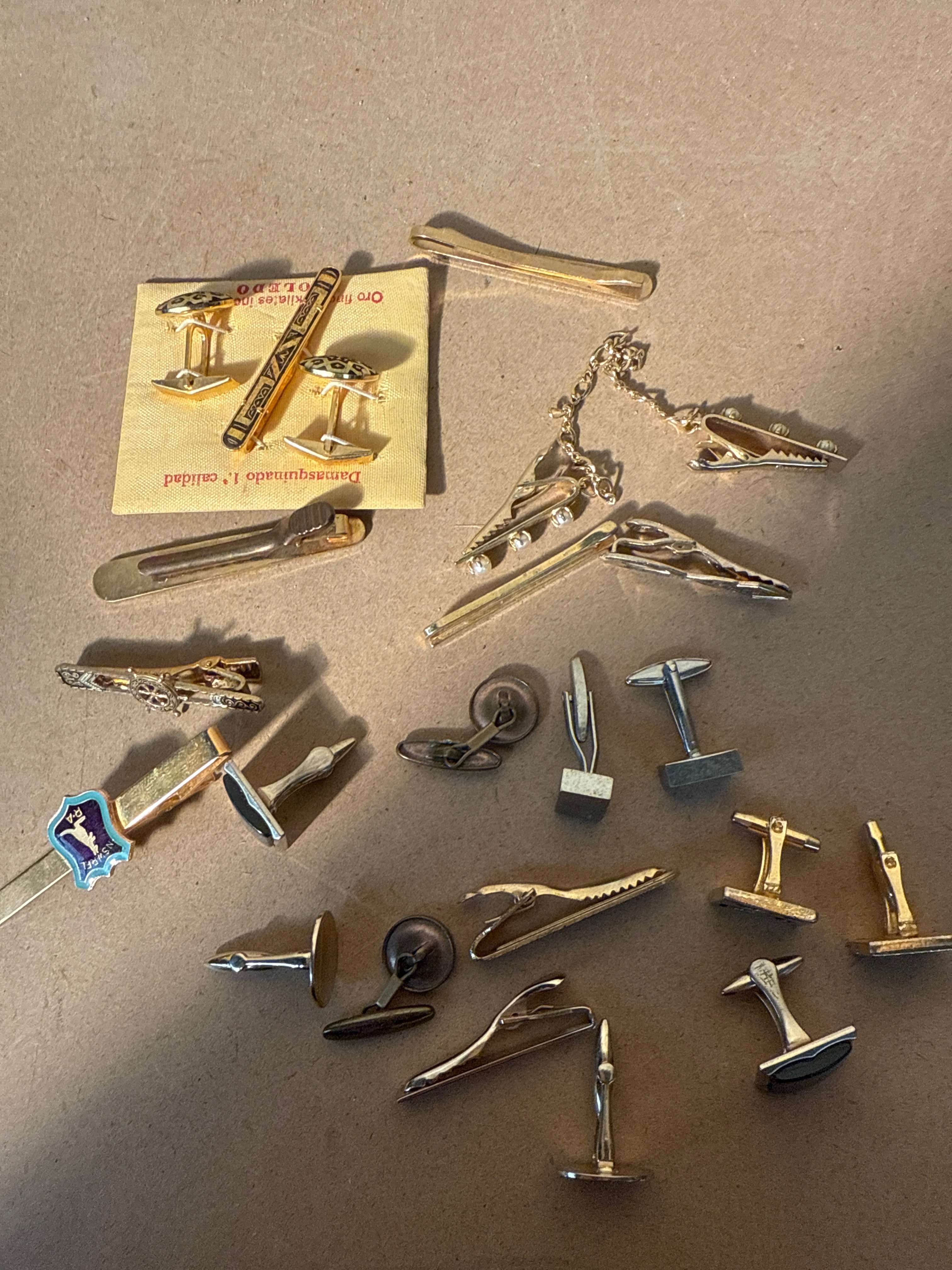 A collection of vintage men’s accessories, primarily comprising cufflinks and tie clips, with many attributed to Swank. The group includes approximately two dozen items, also featuring one collar pin. Crafted from metallic materials, they display both gold-toned and silver-toned finishes. Decorative elements include black inserts, intricate patterns, and enamel detailing, such as a blue and white crest and a stylized deer on separate tie clips. One set of cufflinks and a matching tie bar are presented on a yellow card, bearing partial text “Oro” and “Damascquinado I.° calidad,” indicating a Damascene, 1st quality metalwork style for that specific set. The designs suggest a manufacturing period spanning the mid-to-late 20th century.