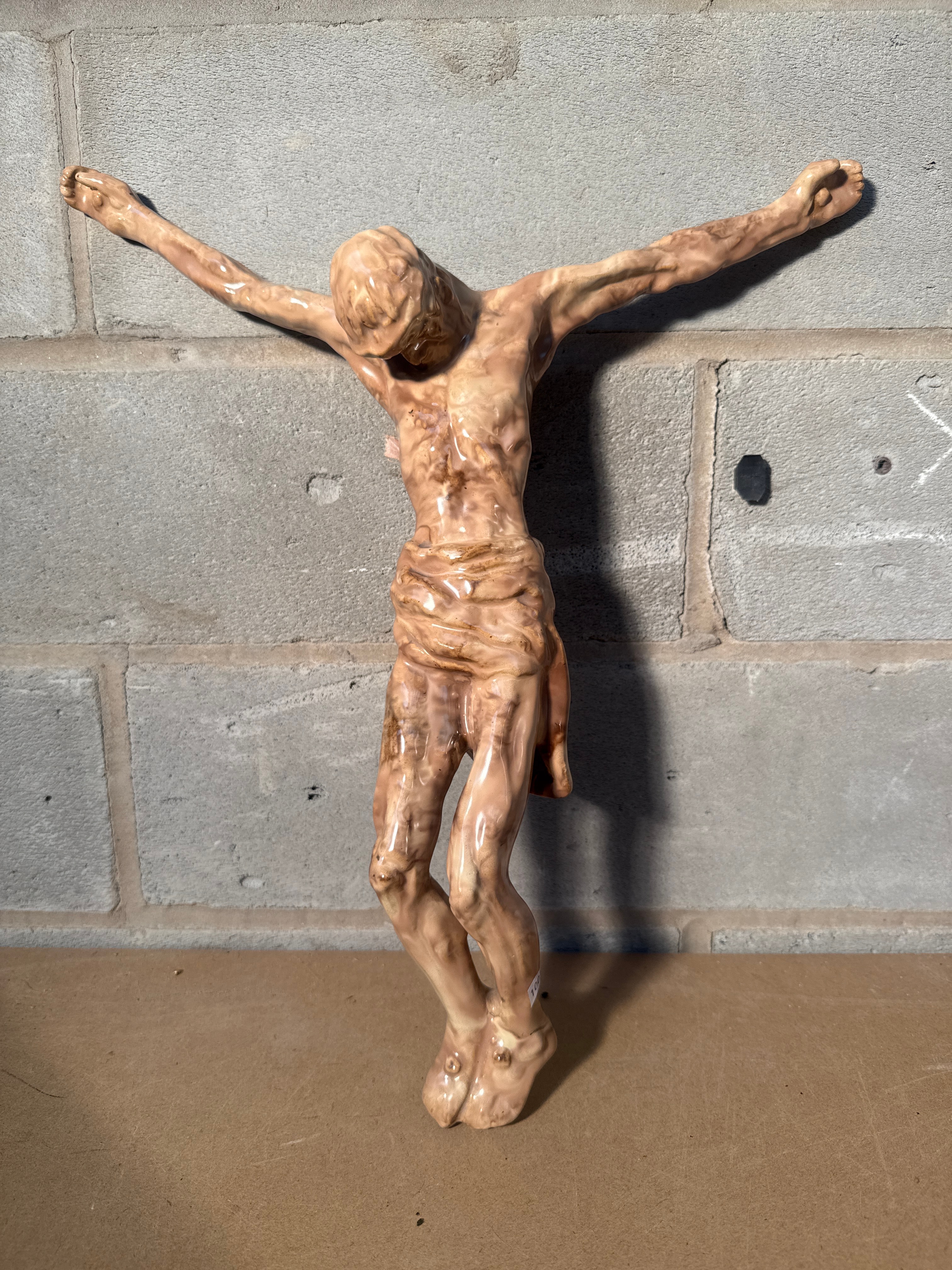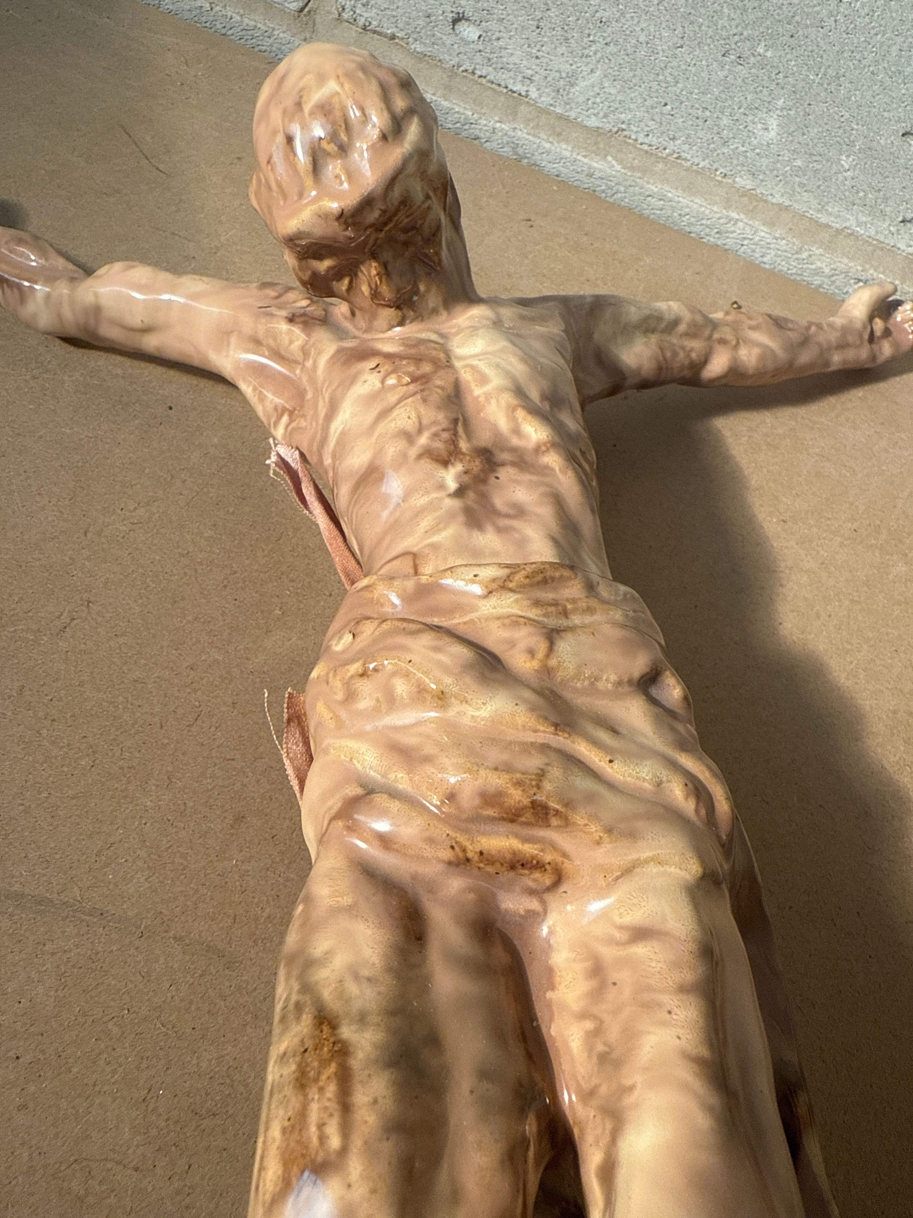 A glazed ceramic corpus, depicting the figure of Christ in a traditional, naturalistic style with detailed anatomy and an emaciated form. The piece exhibits a glossy, variegated glaze primarily in cream and brown tones, featuring darker reddish-brown accents that create an effect of bruising or dried blood in the recesses and on the lower limbs. A small, light-colored fabric or paper element is adhered near the left hip. No identifying text or maker’s marks are visible.