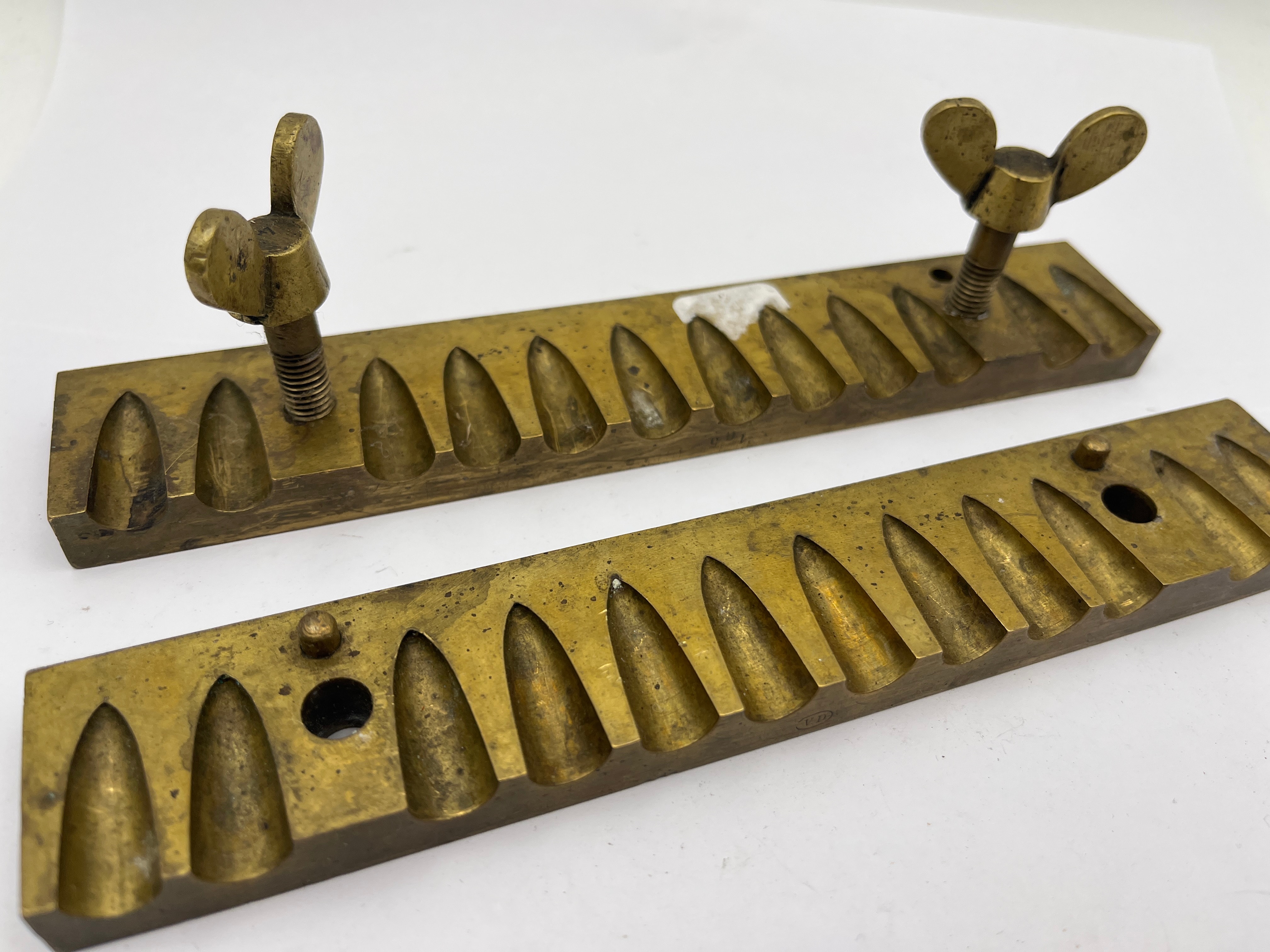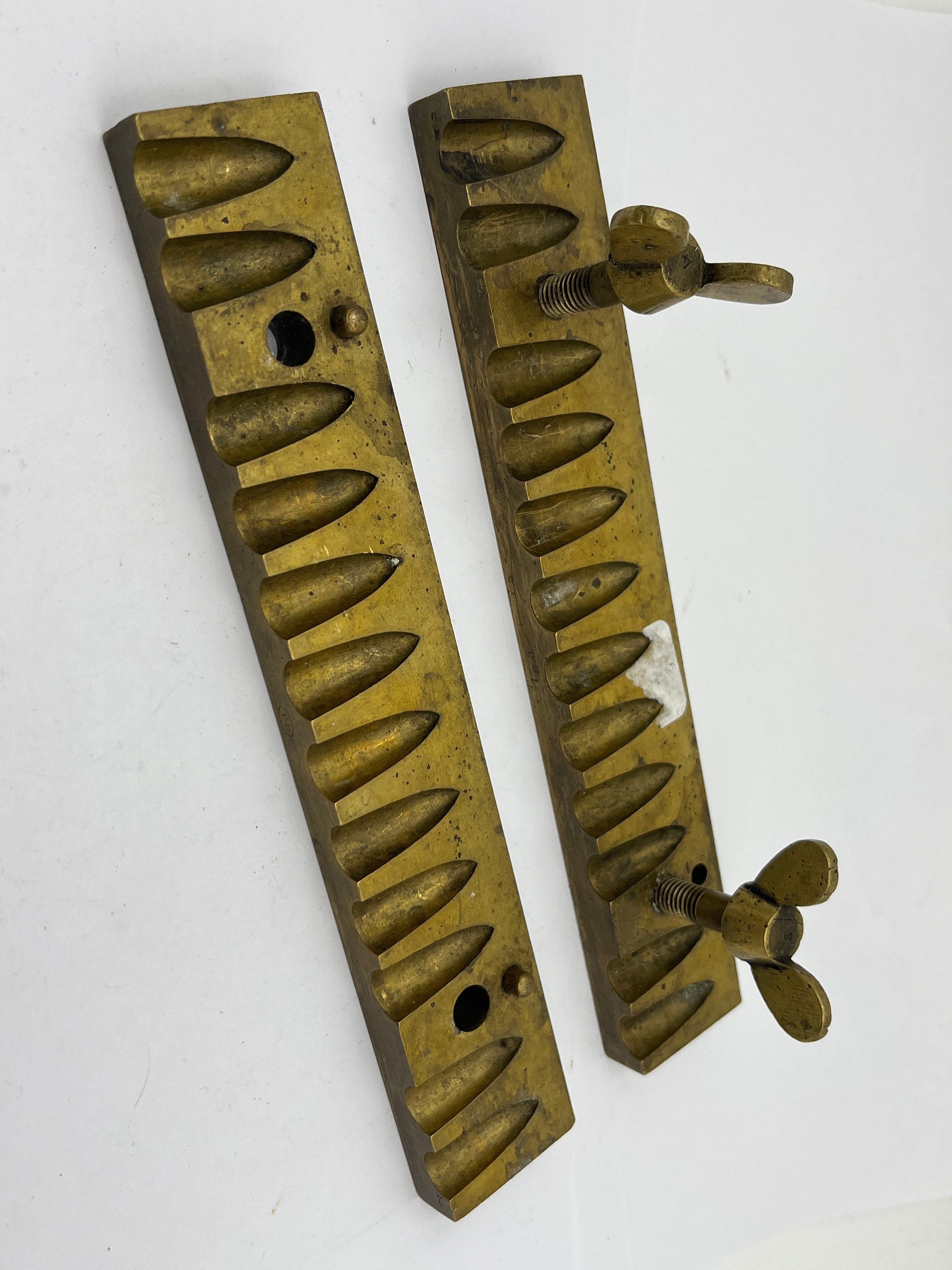 A brass suppository mold, comprising two rectangular halves designed to form a single clam-shell mold when assembled. Each half features eighteen uniform, conical-ogival cavities, consistent with the production of multiple suppositories simultaneously. The mold halves exhibit an aged patina and surface wear. One half is fitted with two threaded posts and brass wingnuts, which align with corresponding holes on the second half for secure closure. No legible manufacturer’s marks or textual inscriptions are visible.