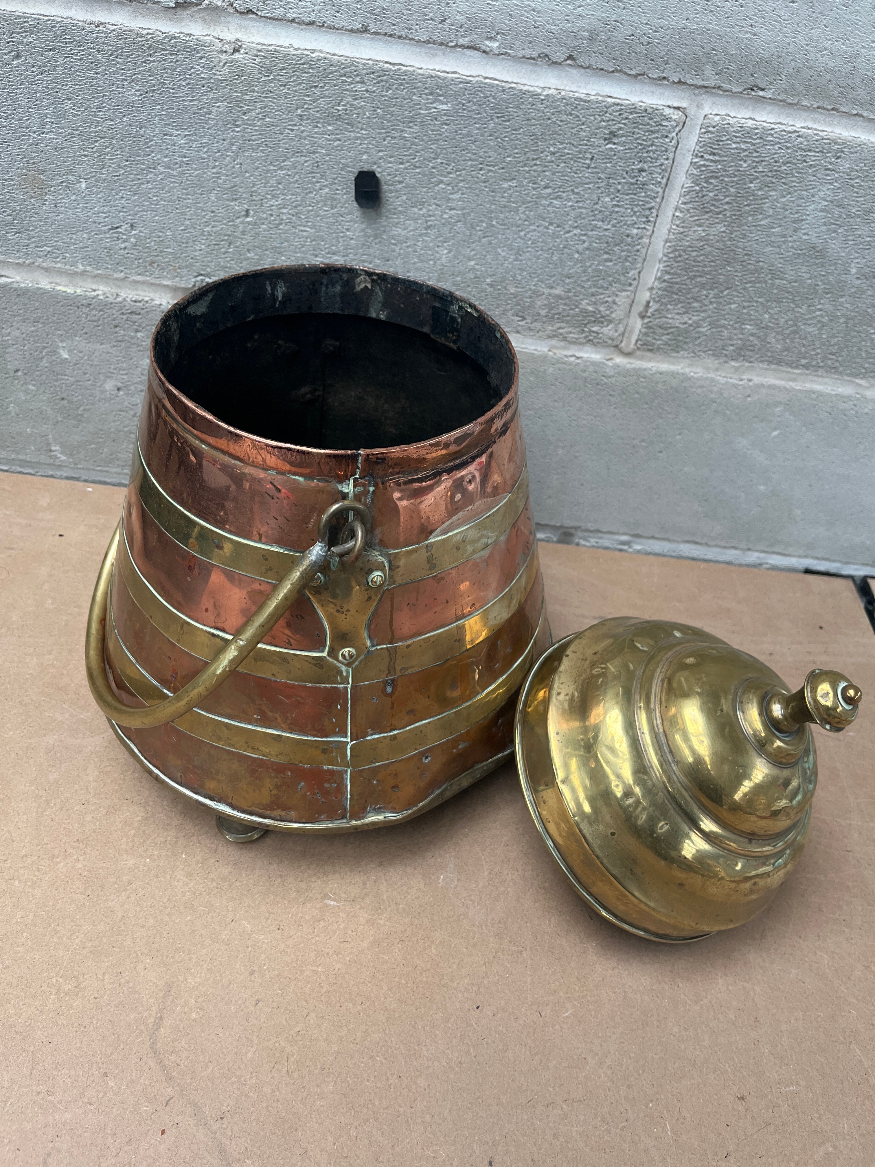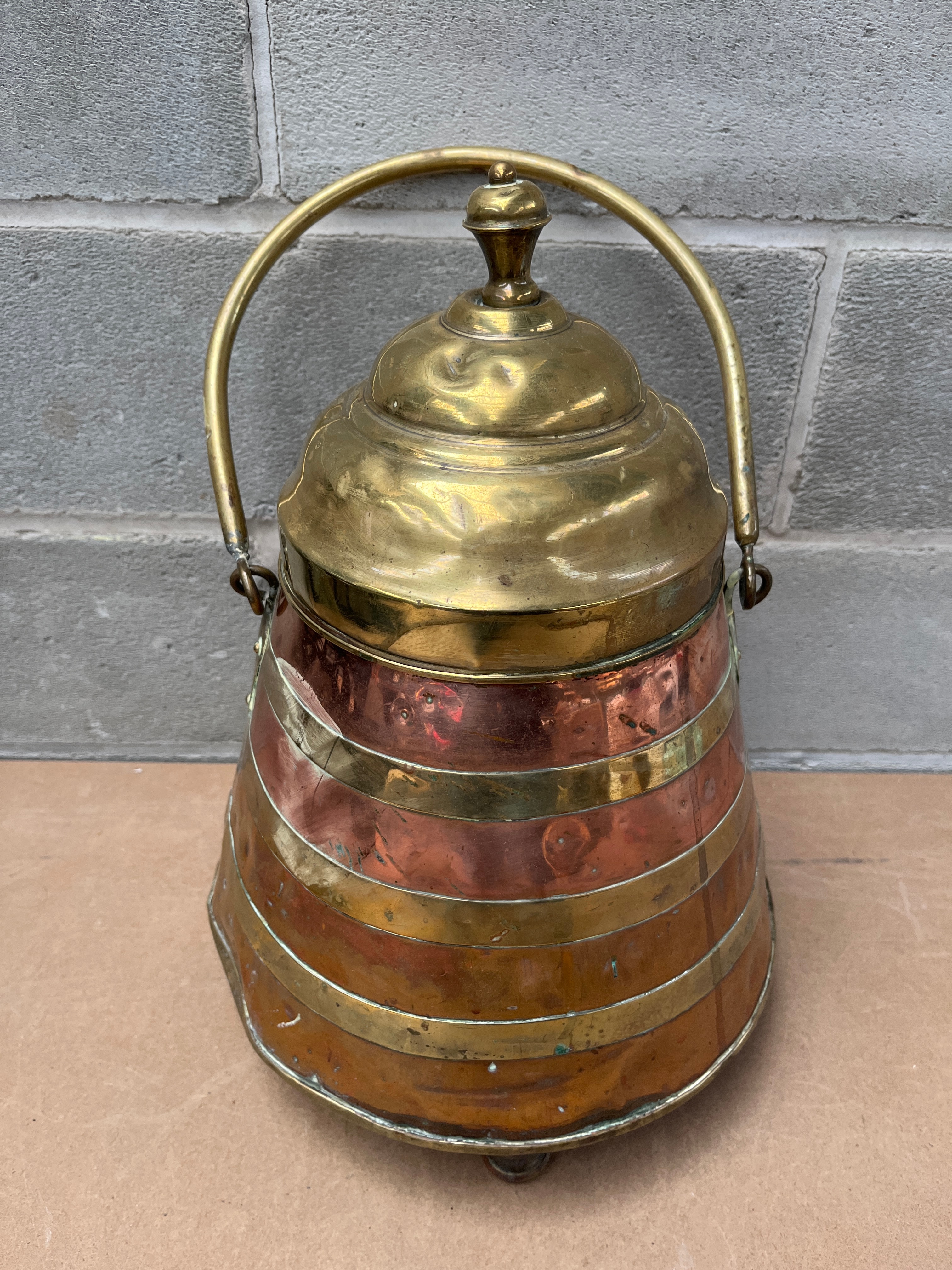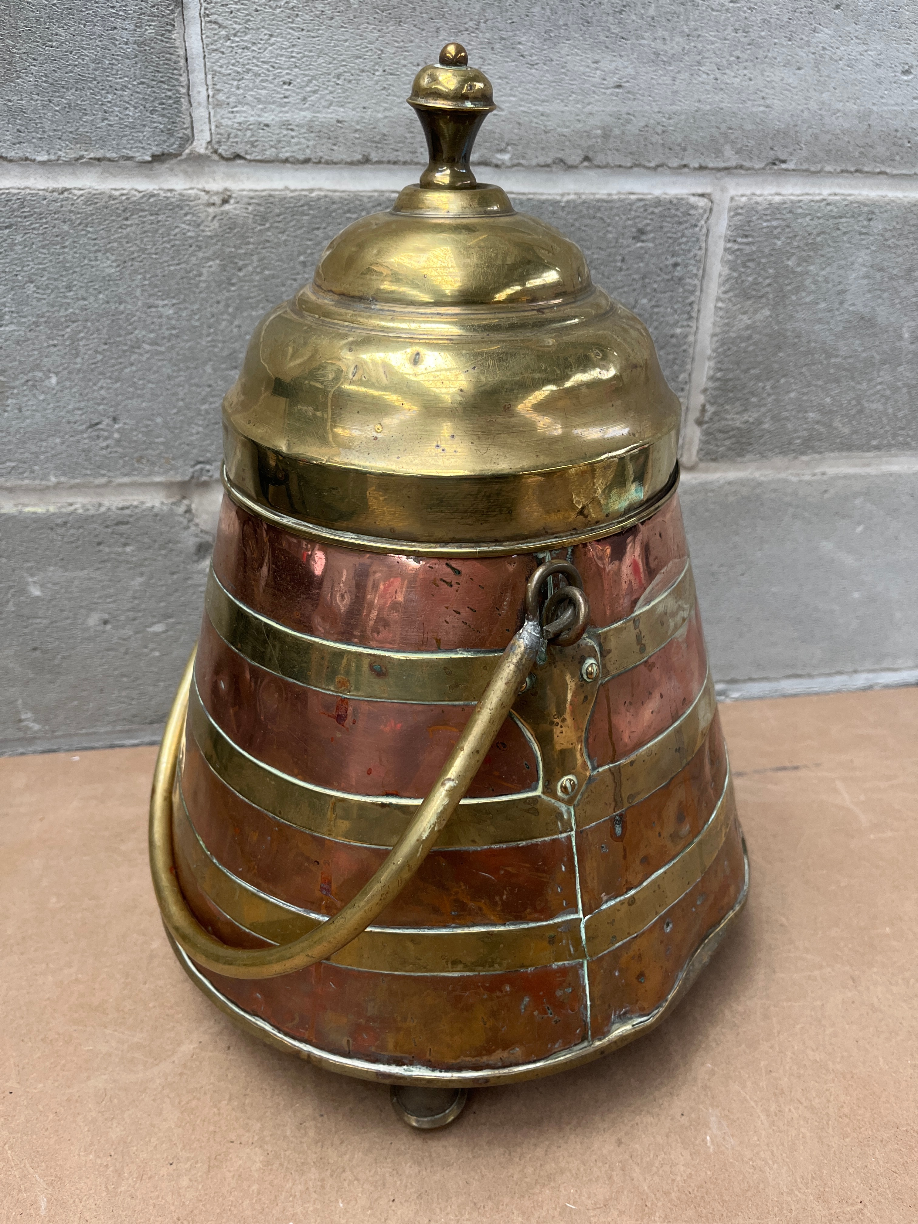 An antique 19th Century Dutch doofpot, constructed from alternating horizontal bands of copper and brass, secured with rivets. It features a domed brass lid with a turned finial, a brass swing handle, and stands on three small brass feet. The interior appears dark and oxidized.