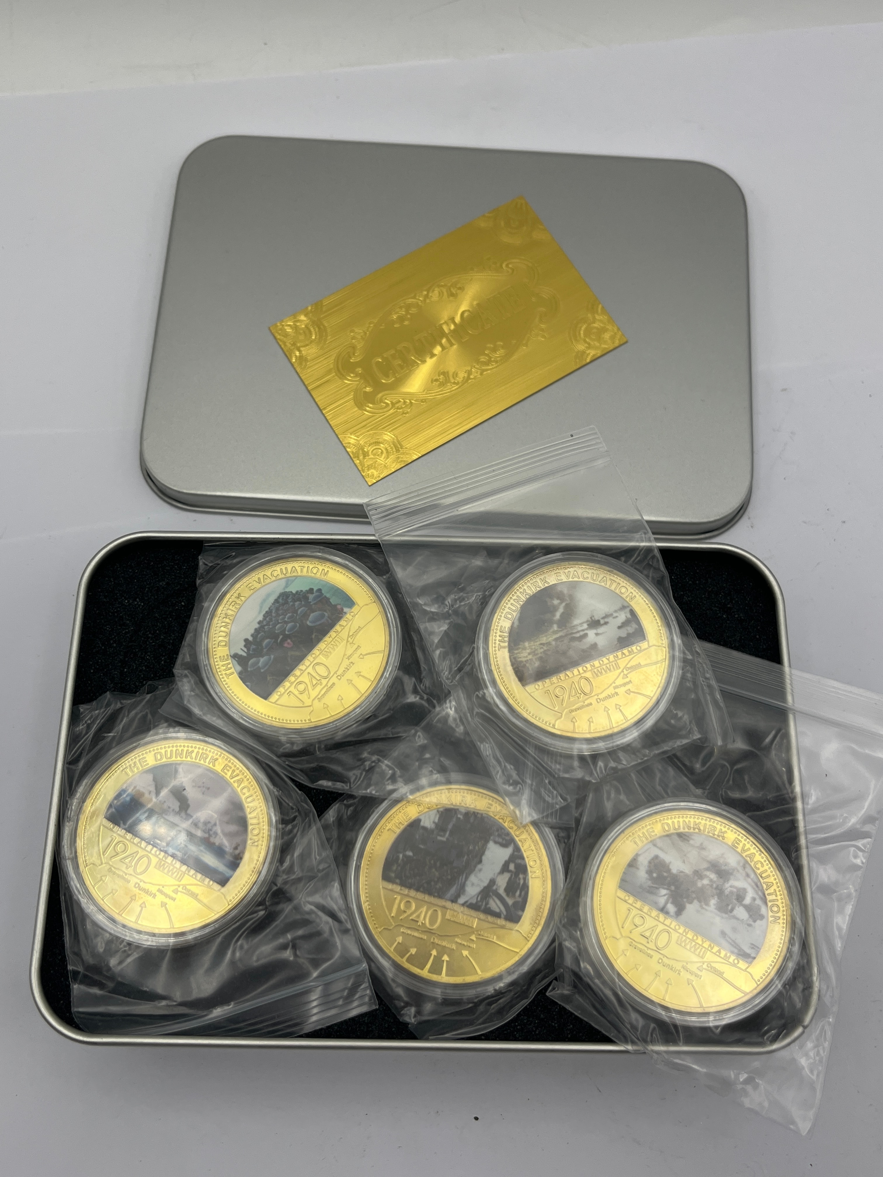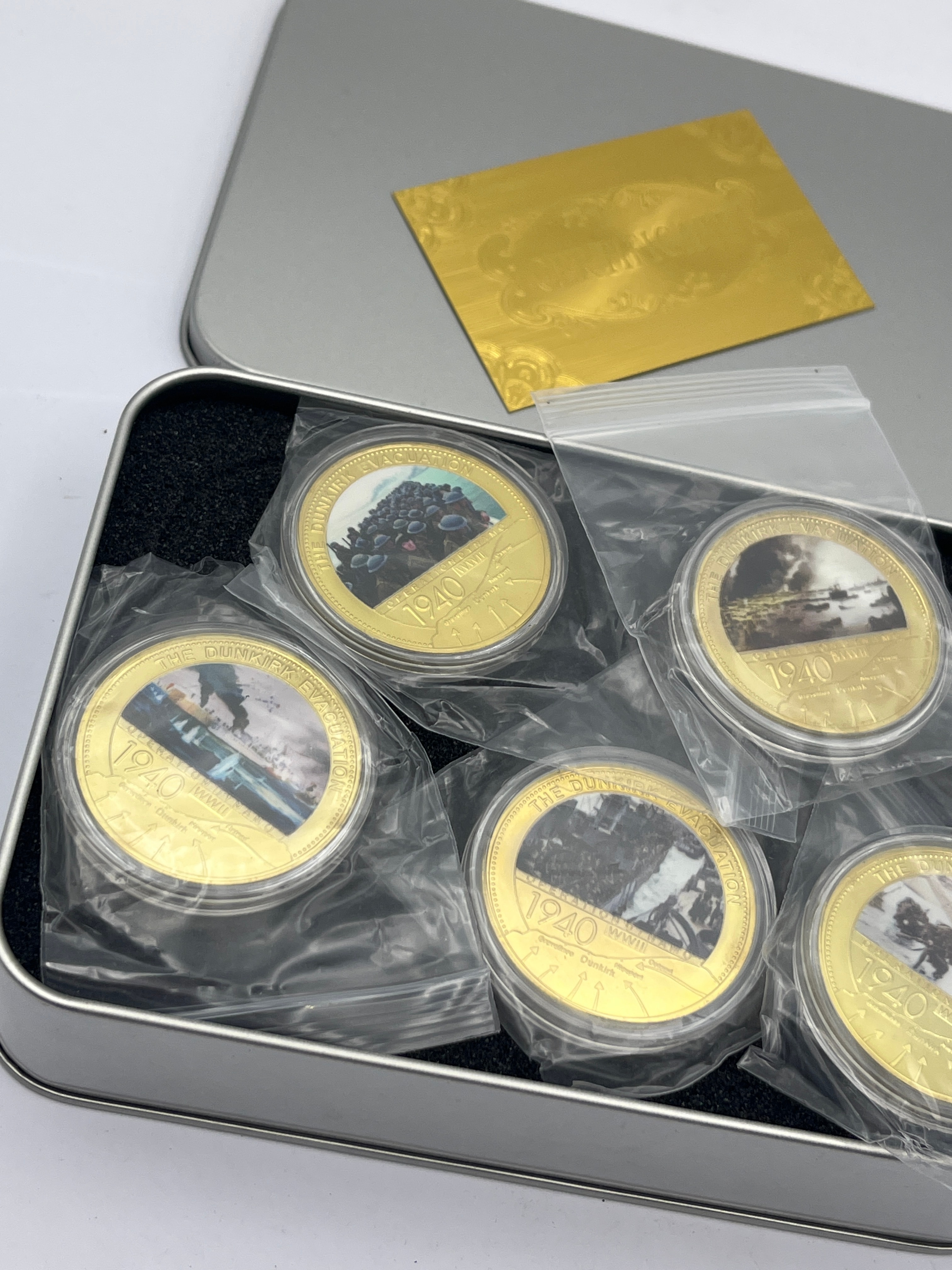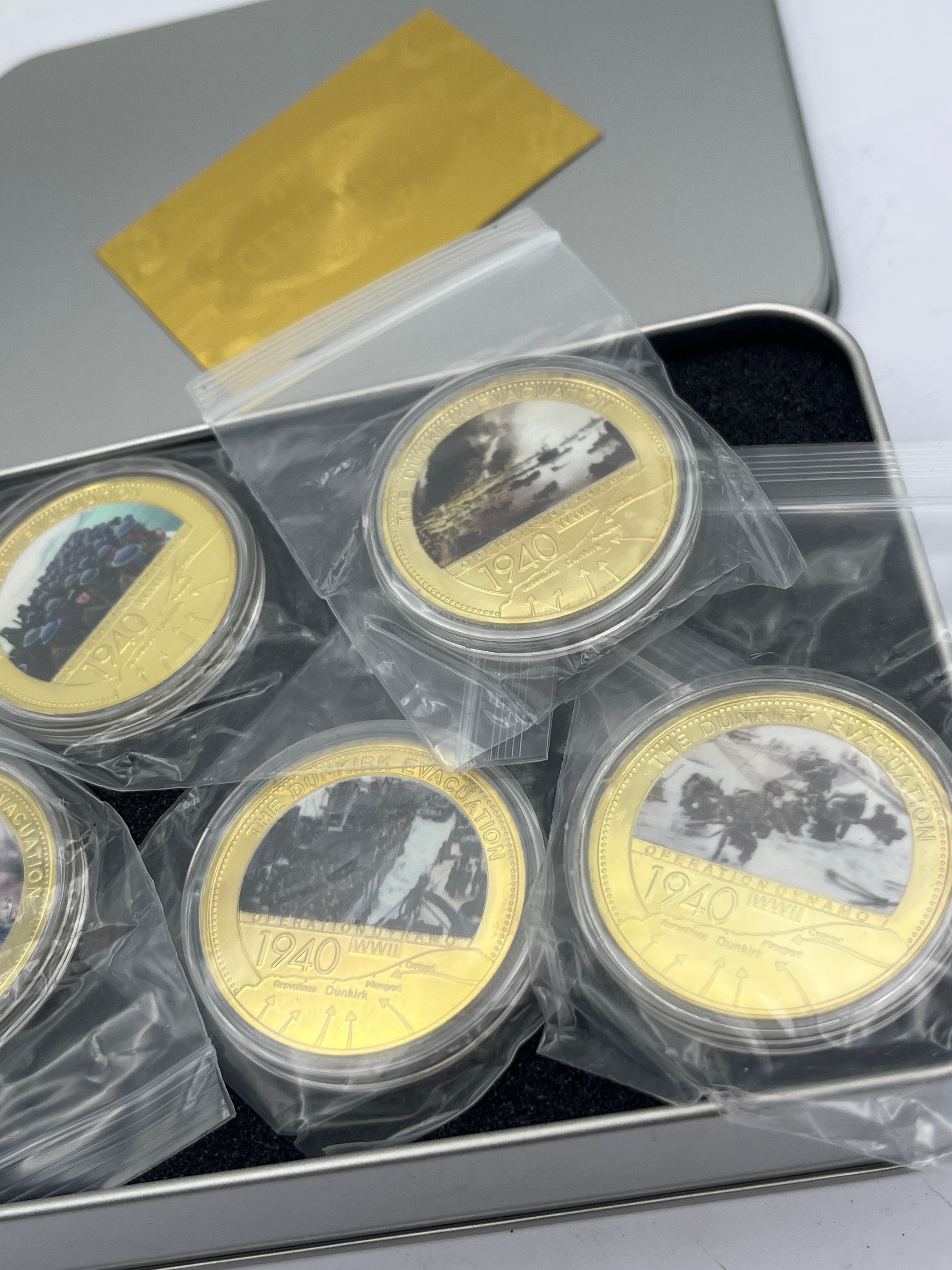 A set of five gold-plated commemorative medallions depicting scenes from ‘The Dunkirk Evacuation.’ Each medallion is prominently marked with the year ‘1940 WWII’ and the phrase ‘Operation Dynamo Dunkirk.’ The imagery includes various wartime scenes such as soldiers on beaches, ships, and naval operations. The medallions are individually sealed in clear plastic capsules and presented in a rectangular silver-tone metal tin with a black foam interior. Also included is a smaller rectangular gold-colored card with an embossed ornate border and indiscernible central text.
