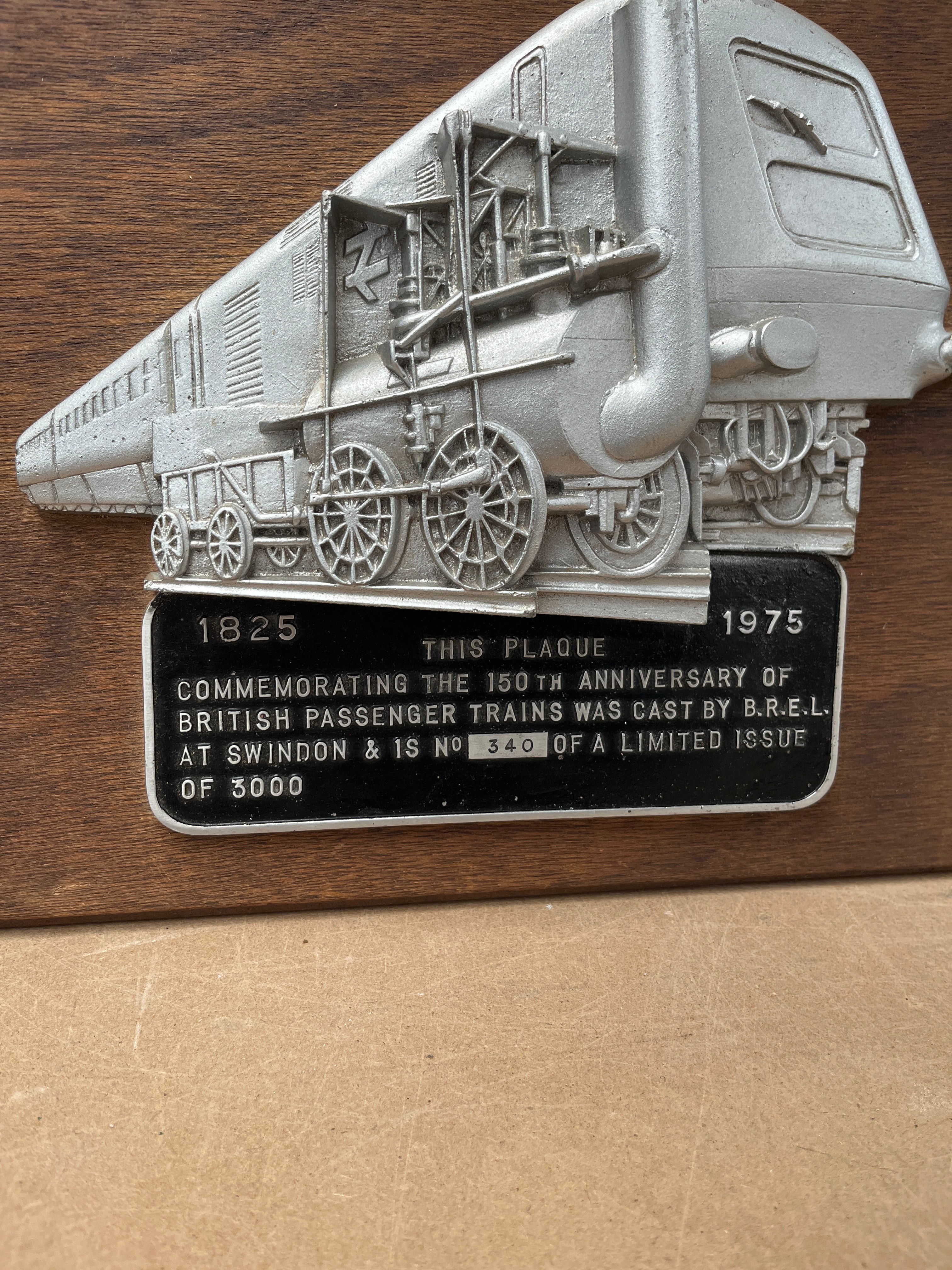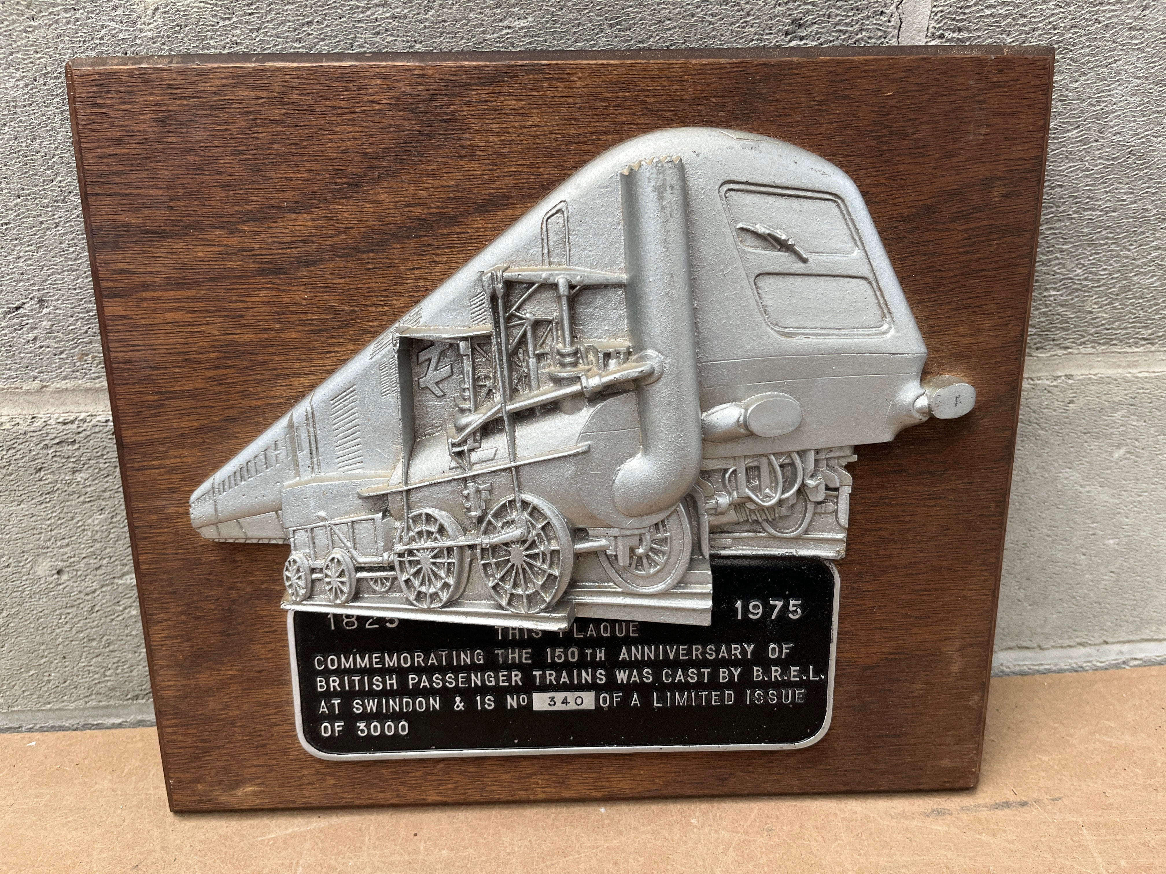 A commemorative wall plaque from 1975, featuring a silver-toned metal relief depicting an early steam locomotive superimposed with a more modern, streamlined train, mounted on a rectangular dark wood backing. A black metal plate below the relief reads: “1825 1975 THIS PLAQUE COMMEMORATING THE 150TH ANNIVERSARY OF BRITISH PASSENGER TRAINS WAS CAST BY B.R.E.L. AT SWINDON & IS NO 340 OF A LIMITED ISSUE OF 3000.”