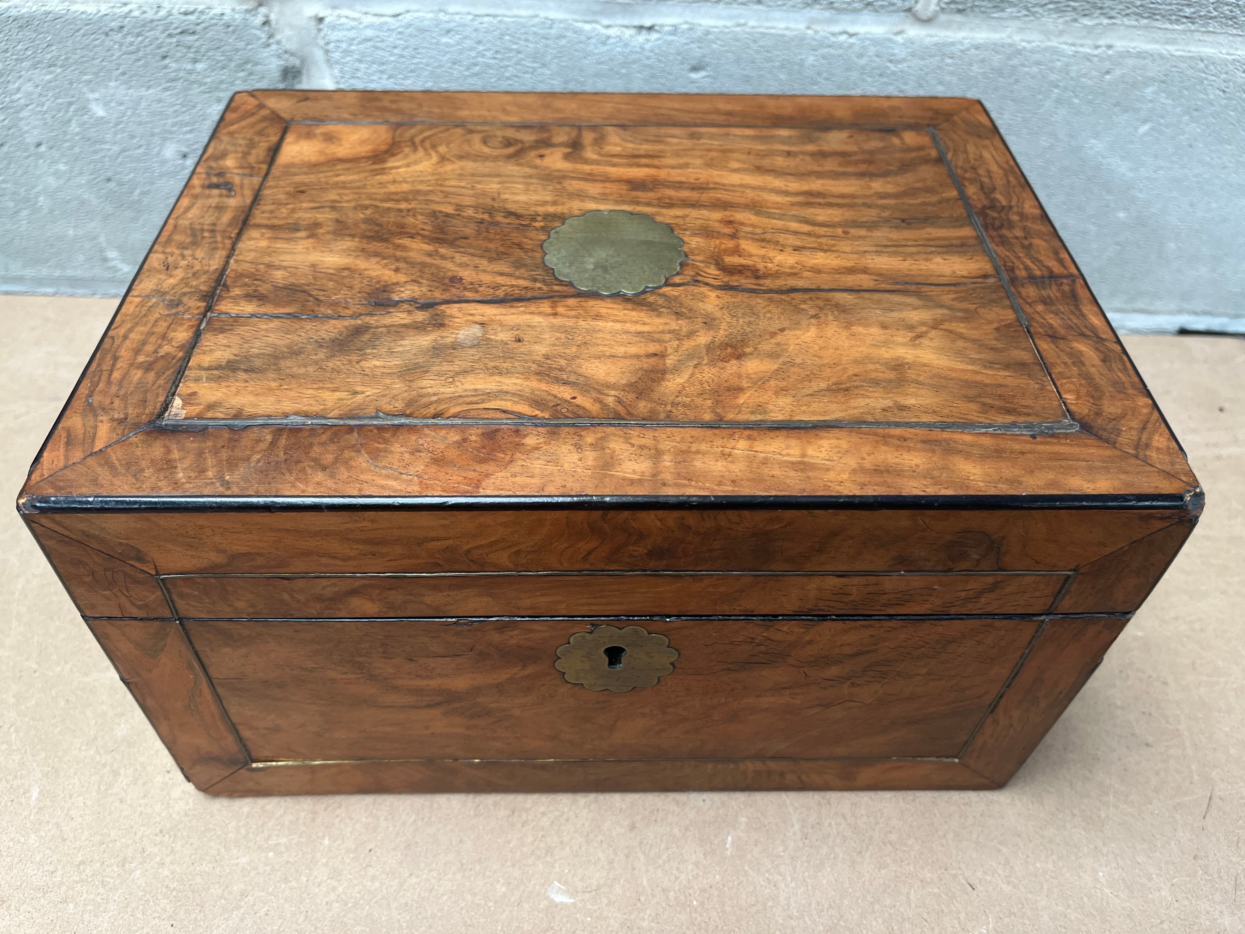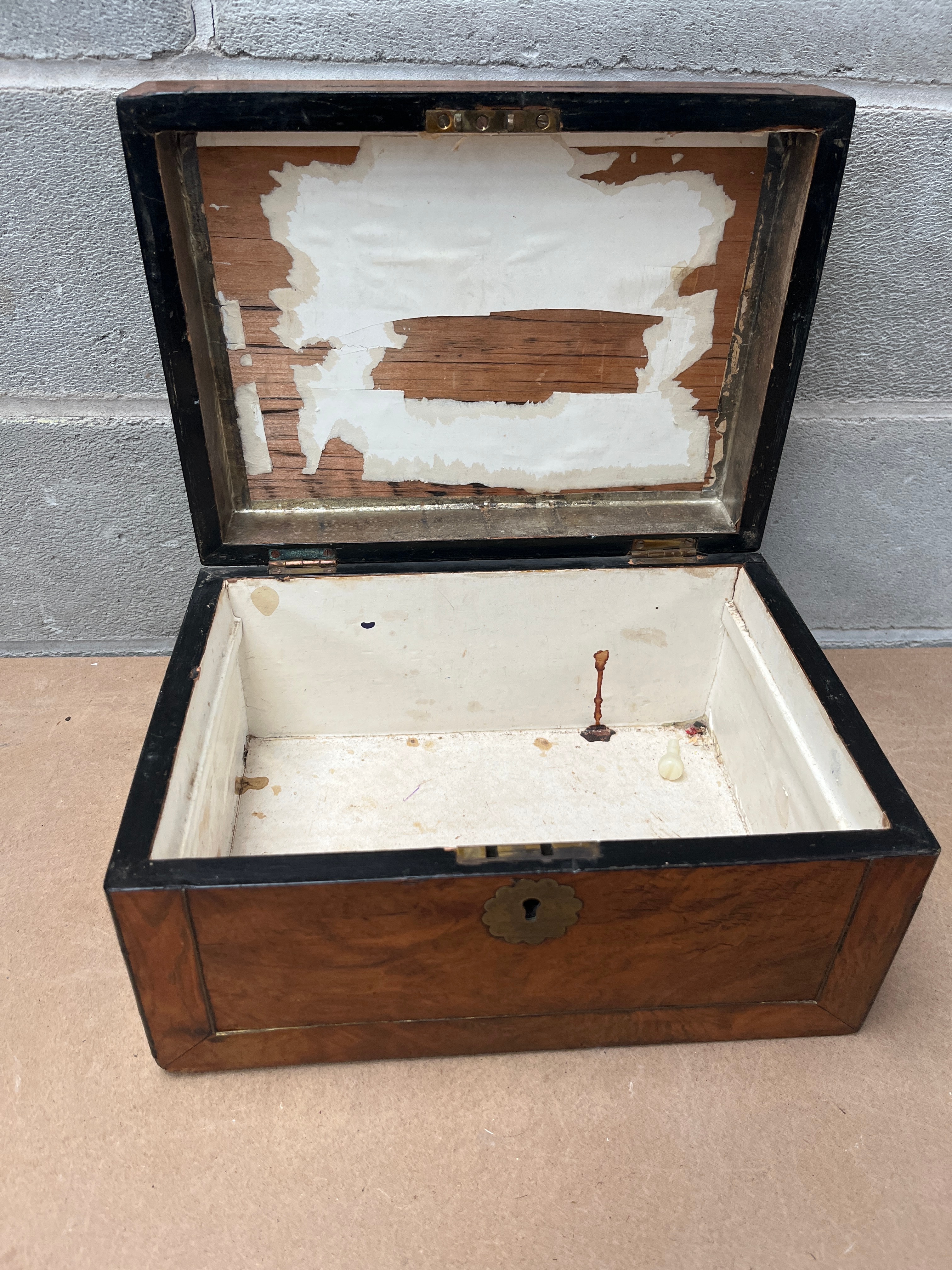 A 19th Century Burr Wood Veneer Travel Writing Box. This rectangular wooden box is veneered in burr wood, likely walnut, and features dark-stained or ebonized wood banding accentuating its edges. The hinged lid is adorned with a decorative, scalloped brass plate centrally, while the front panel displays a matching scalloped brass escutcheon around the keyhole. The interior is significantly compromised, with most of the original paper or fabric lining detached or missing, revealing the bare wooden structure. A small metal pin and a small, loose white object are present within the interior.