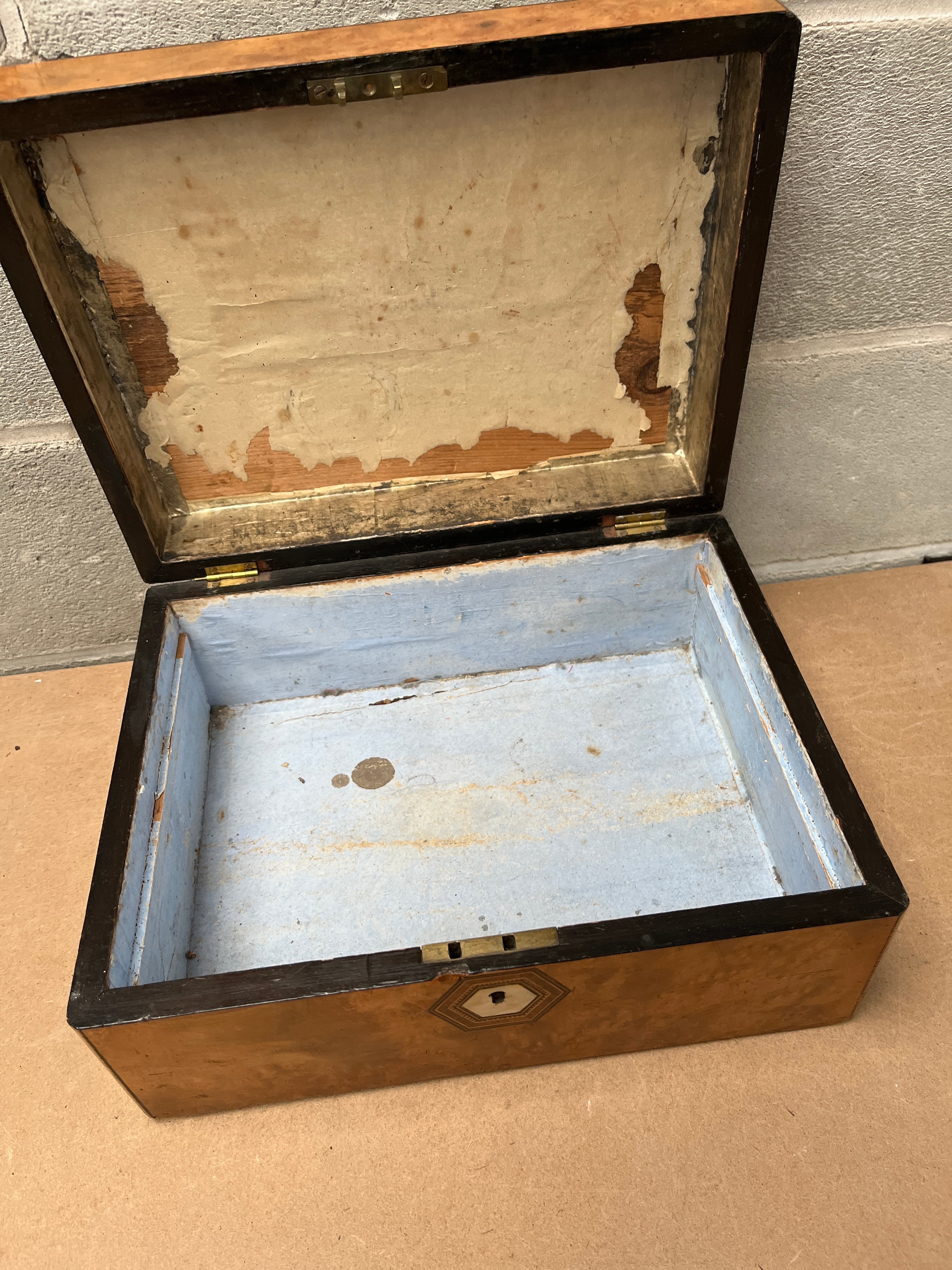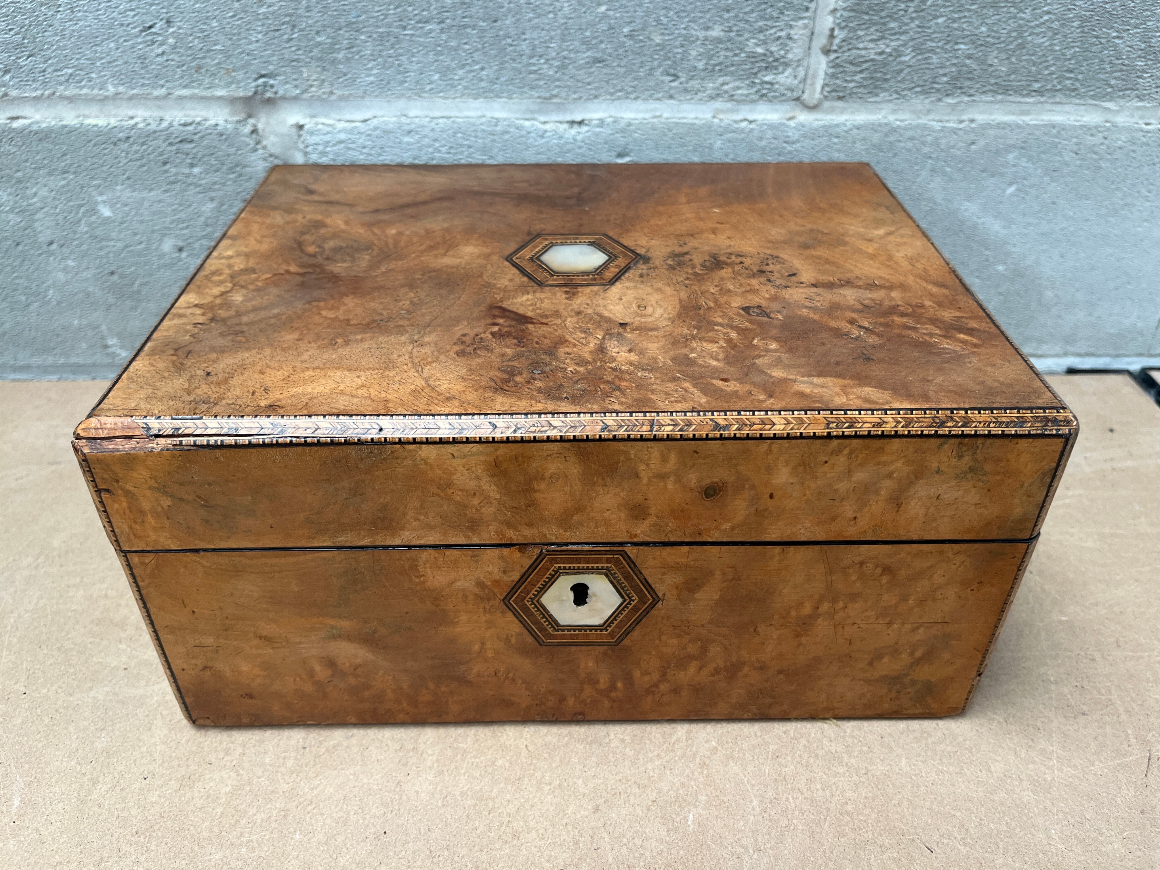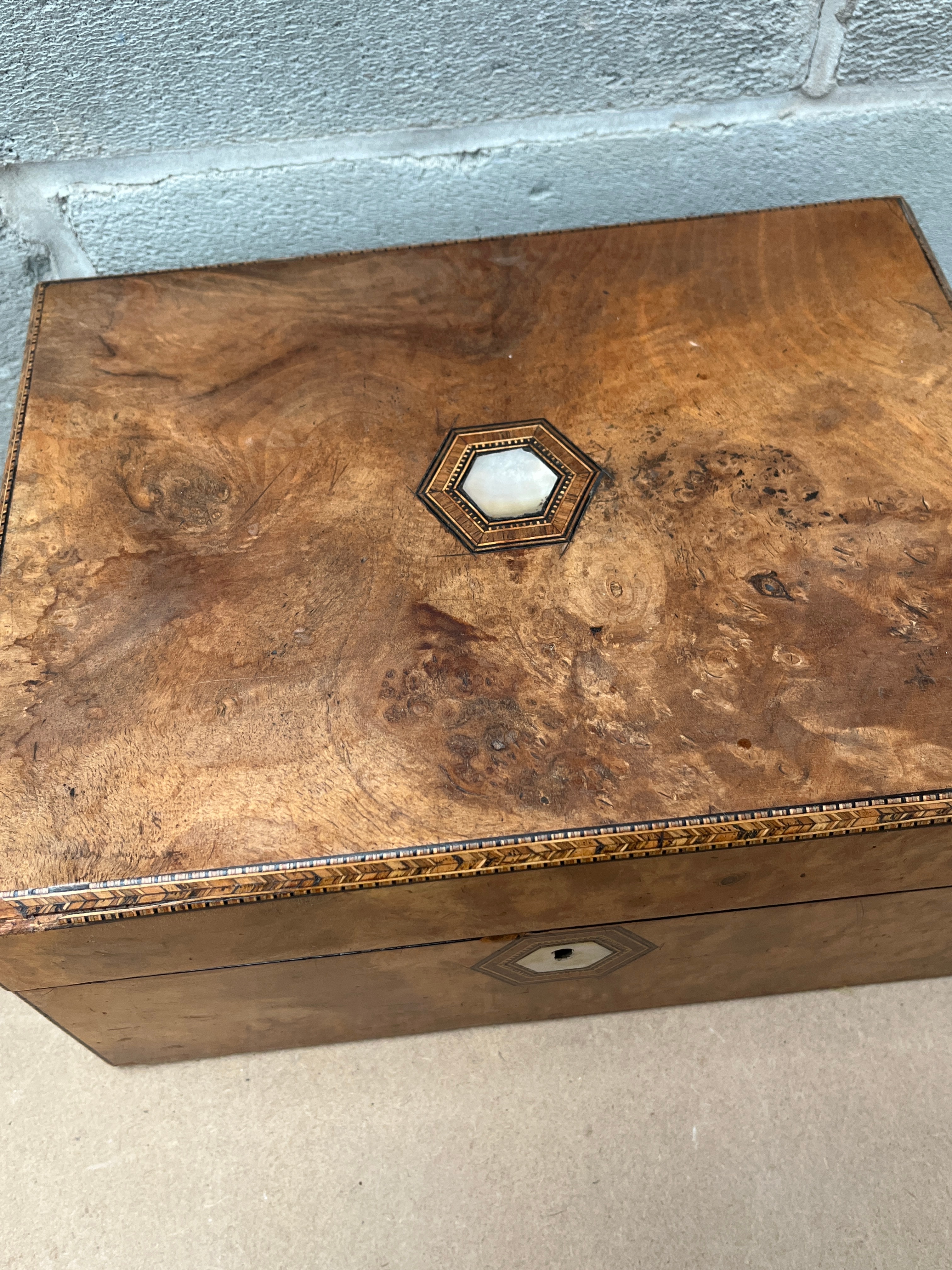 An antique wooden box, likely dating to the 19th century, possibly Victorian, constructed with burr wood veneer, likely walnut, and accented with darker wood crossbanding and geometric string inlay. The design features a central hexagonal escutcheon on the front and a matching inlay on the lid, both set with a material resembling mother-of-pearl or bone. It is possibly intended as a dressing or jewelry box.