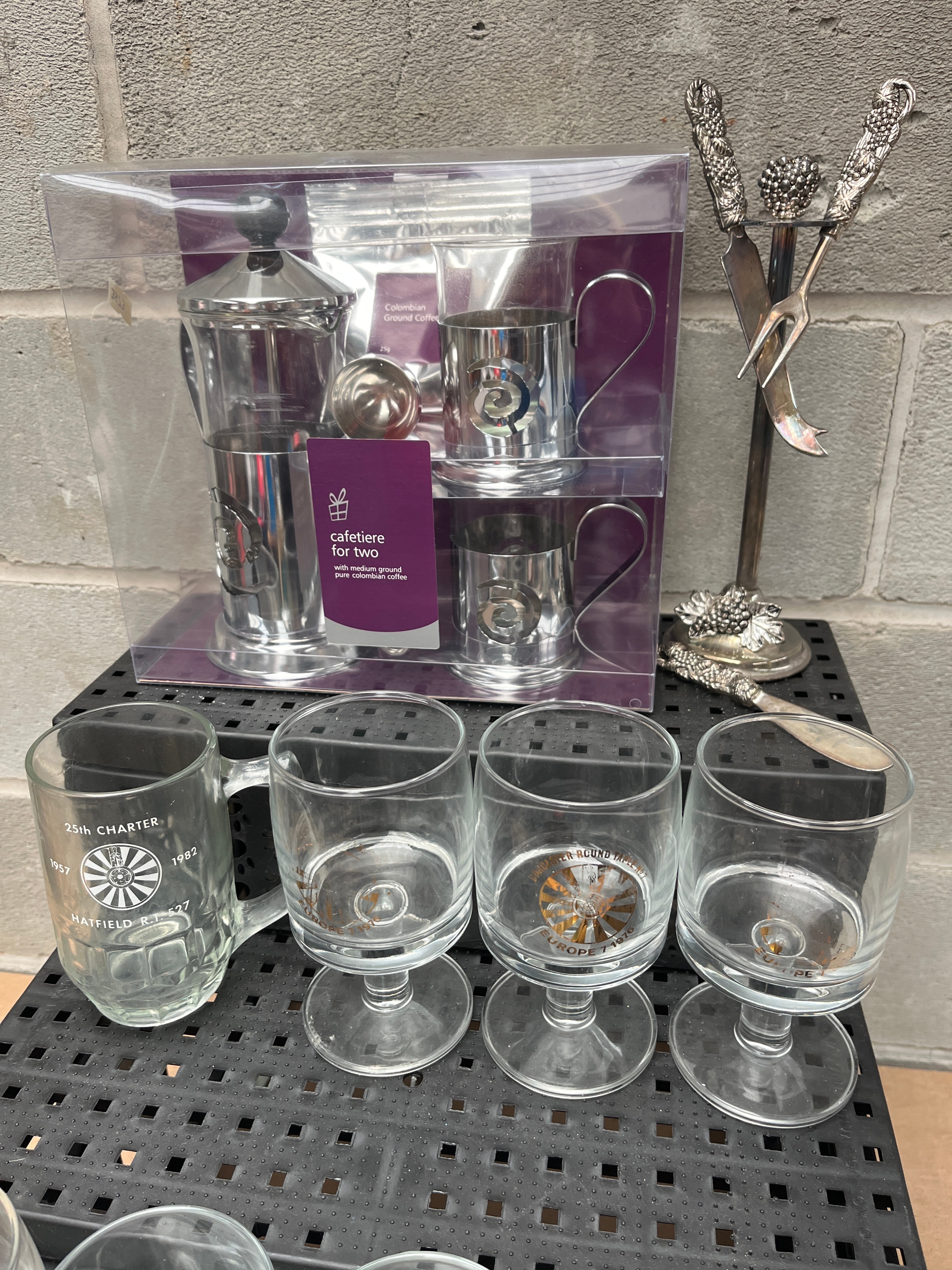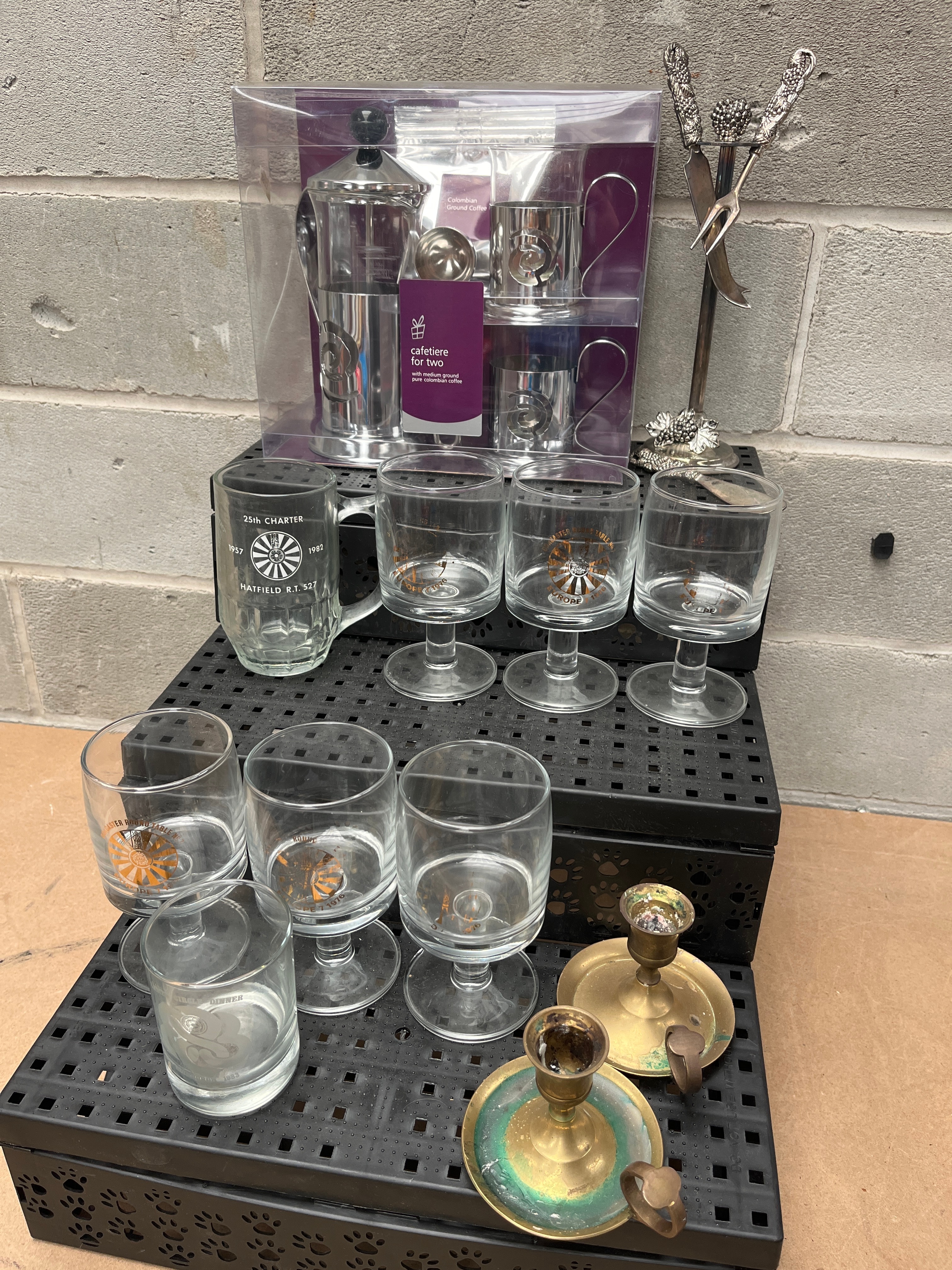 Further included is a new, packaged stainless steel and glass cafetiere (coffee press) set, complete with two accompanying stainless steel cups, labeled ‘Colombian Ground Coffee.’ The collection also features a used, ornate silver-toned metal decorative stand with three implements, possibly for a fireplace, and two used brass candlesticks.