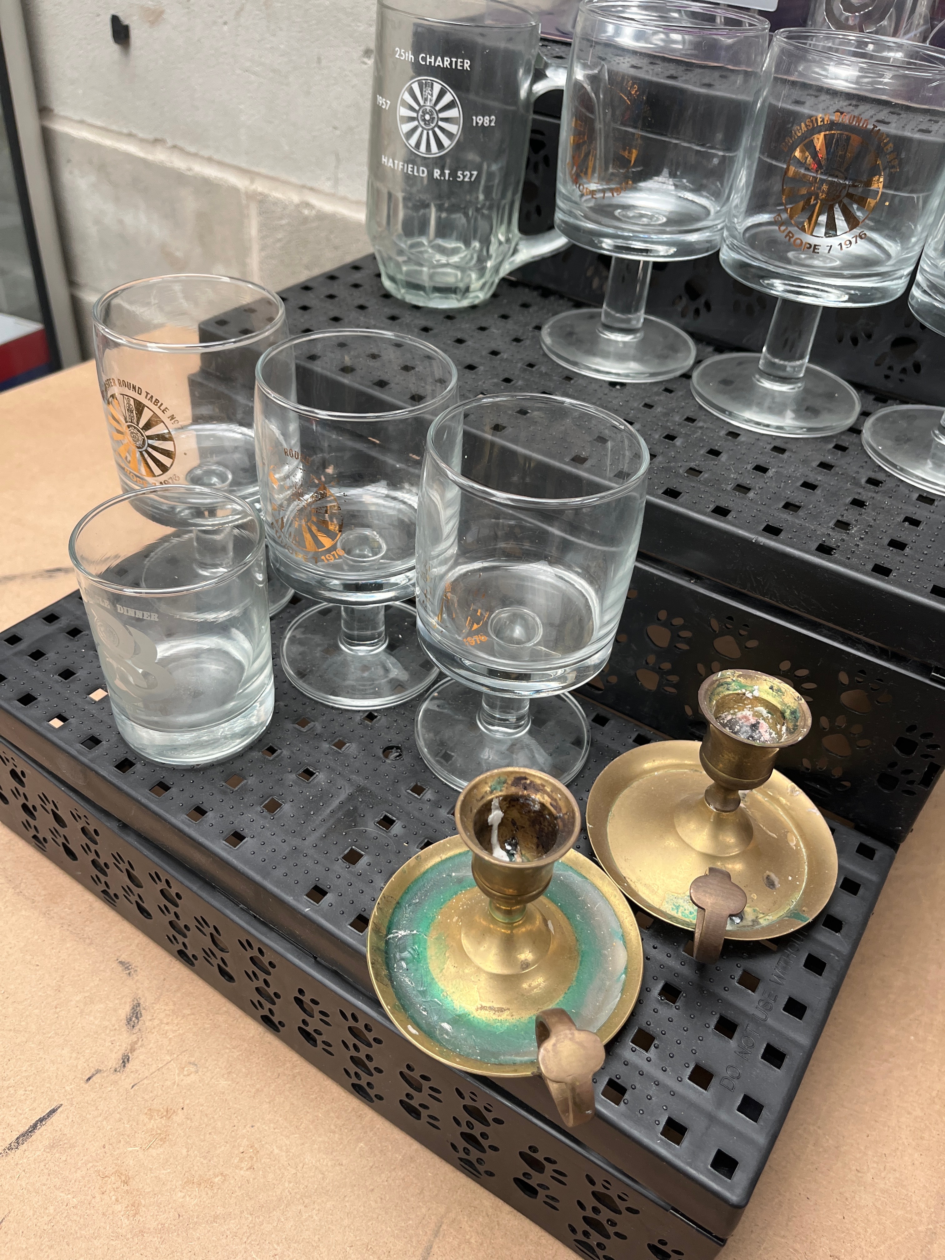 A diverse collection of household and decorative objects. The glassware component comprises a set of six stemmed glasses, some adorned with golden emblems and visible text such as ‘COPENHAGE’ and ‘BONN,’ consistent with Mid-Century Cera-style production. Also included is a clear glass beer mug commemorating ’25th CHARTER 1957 1982 HATFIELD R.T. 527,’ and two smaller clear glass tumblers, one marked ‘DINNER.’