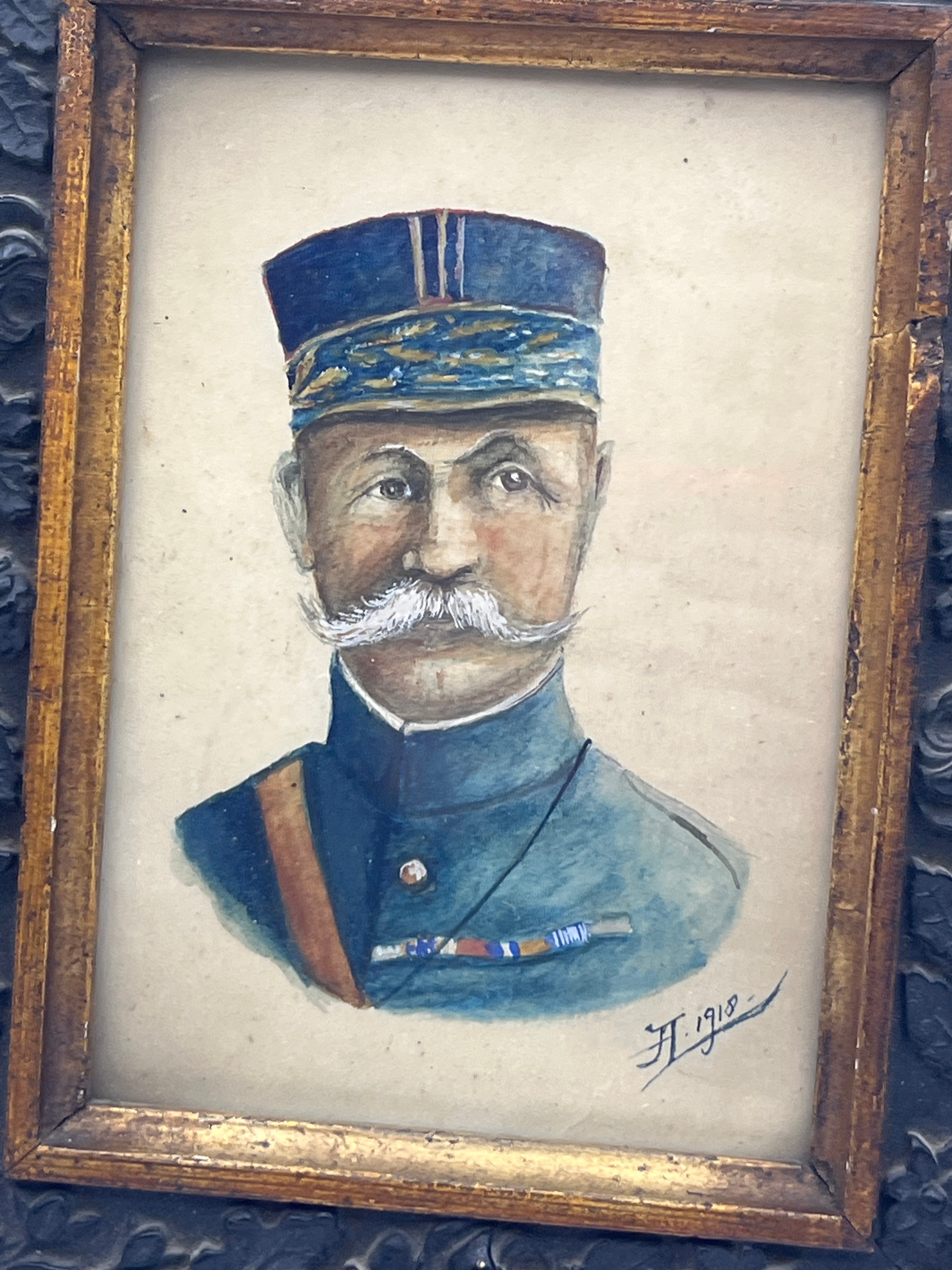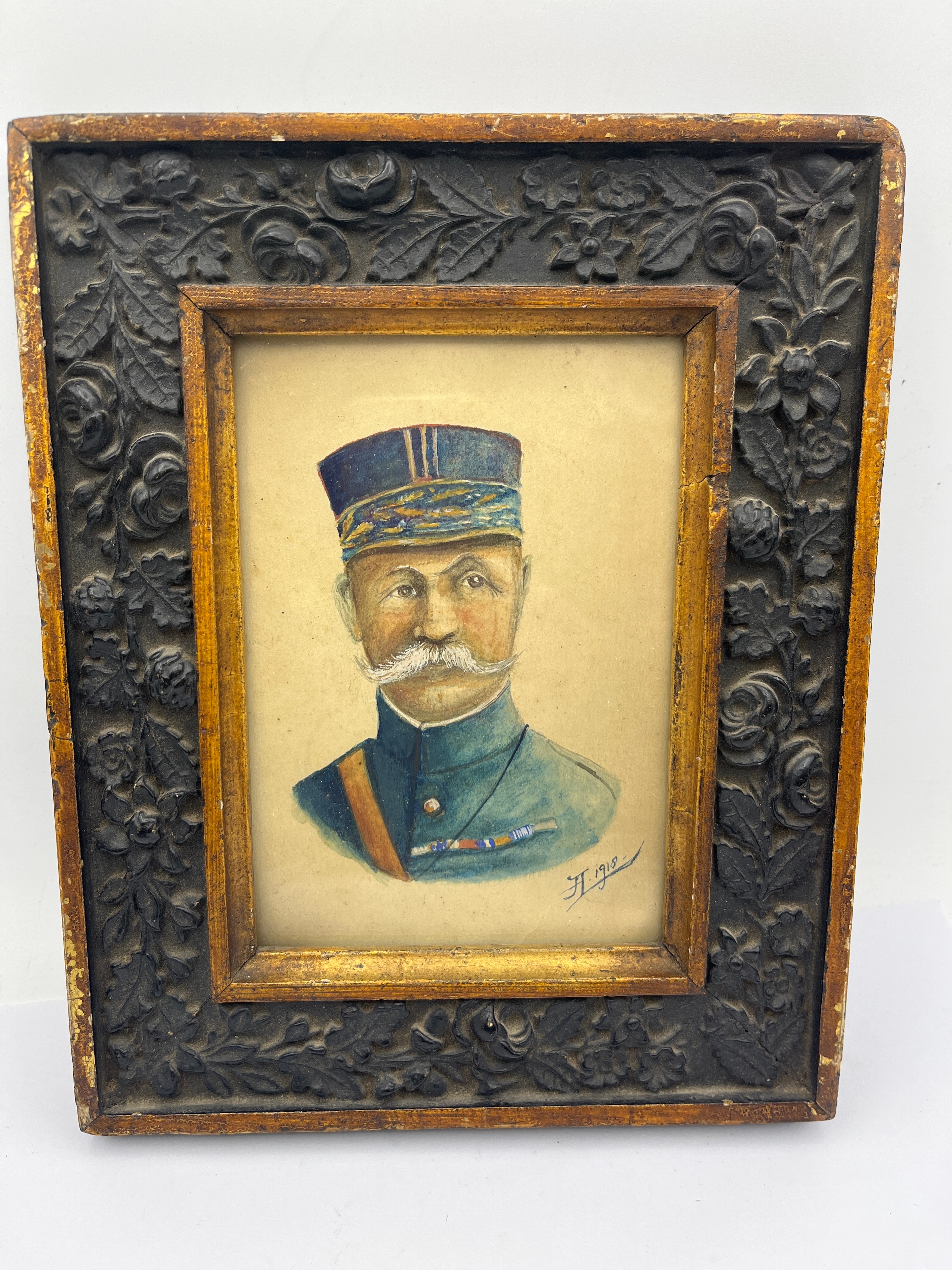 A WWI era naive folk art portrait, executed in watercolor or gouache on paper, depicting a male military figure, likely a French officer. The subject is rendered in a distinctive style, featuring a blue uniform with a unique cap, a prominent white mustache, a sash, and medal ribbons on his chest. The artwork is signed ‘H.’ and dated ‘1918’ in the lower right corner. It is presented in a heavily carved wooden frame, which exhibits a dark, possibly ebonized, finish with an underlying gold or gilt layer visible through wear.