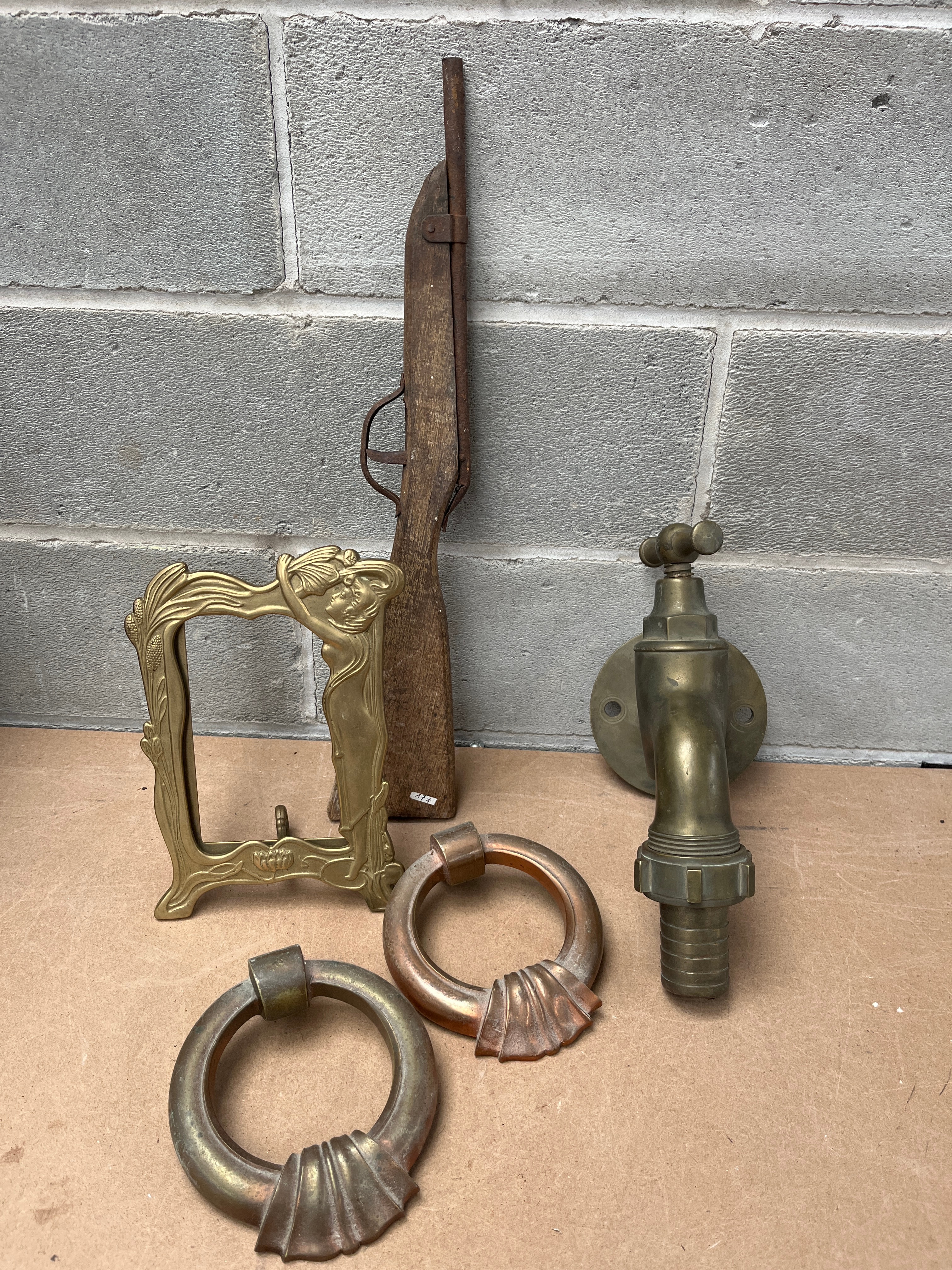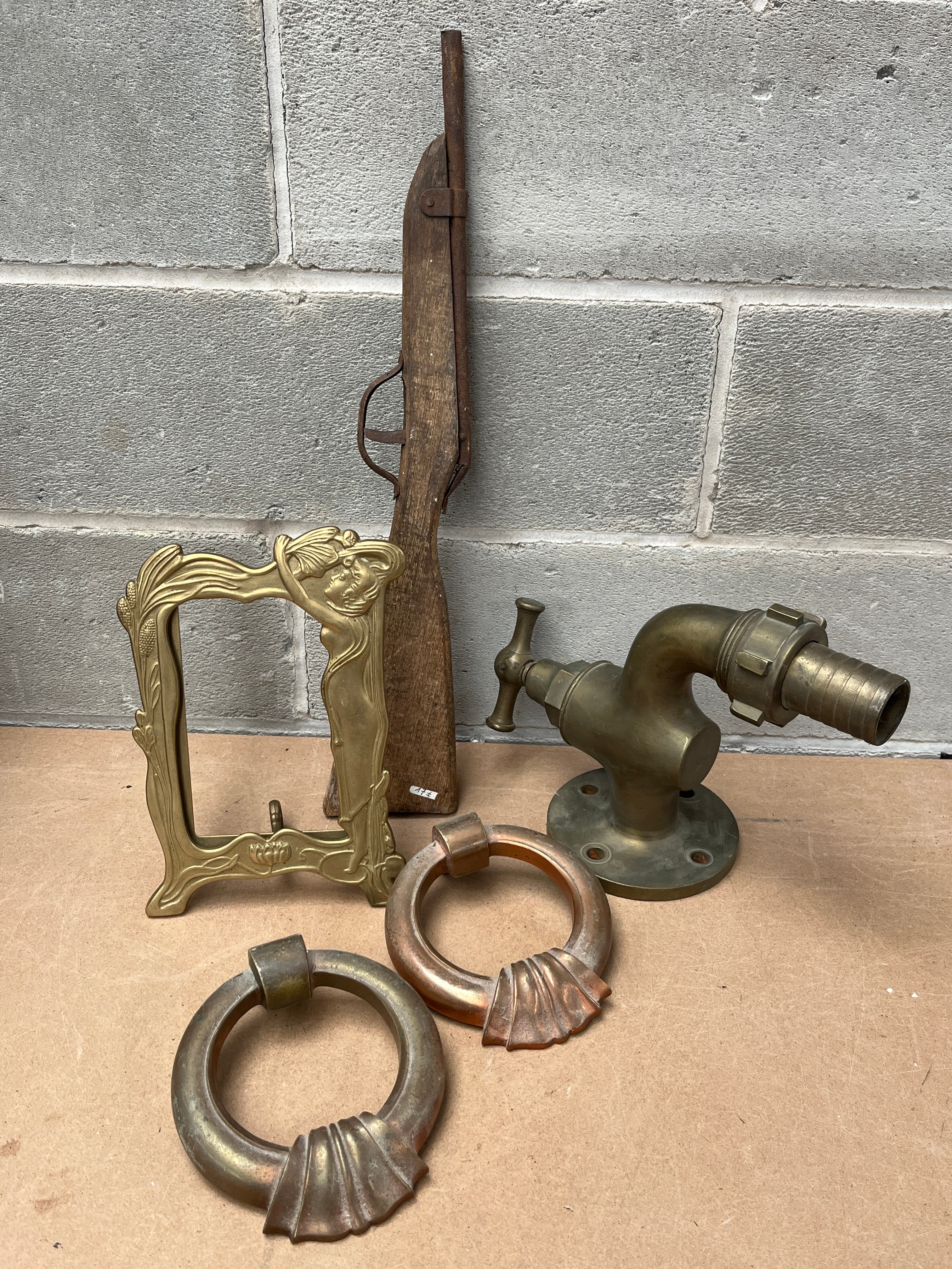 This lot comprises a collection of five vintage decorative items. It includes a slender, rustic wooden decorative rifle or musket, exhibiting considerable age and wear, with a small white sticker marked ’47’ affixed to its stock. Also present is a brass-toned picture frame featuring a relief of a classical or Art Nouveau-style female figure. A heavy brass spigot or faucet assembly with a large mounting flange and hose connection is part of the collection. Completing the lot are a pair of matching brass or bronze decorative rings, each featuring a fluted, shell-like element, consistent with vintage door knocker or pull hardware.