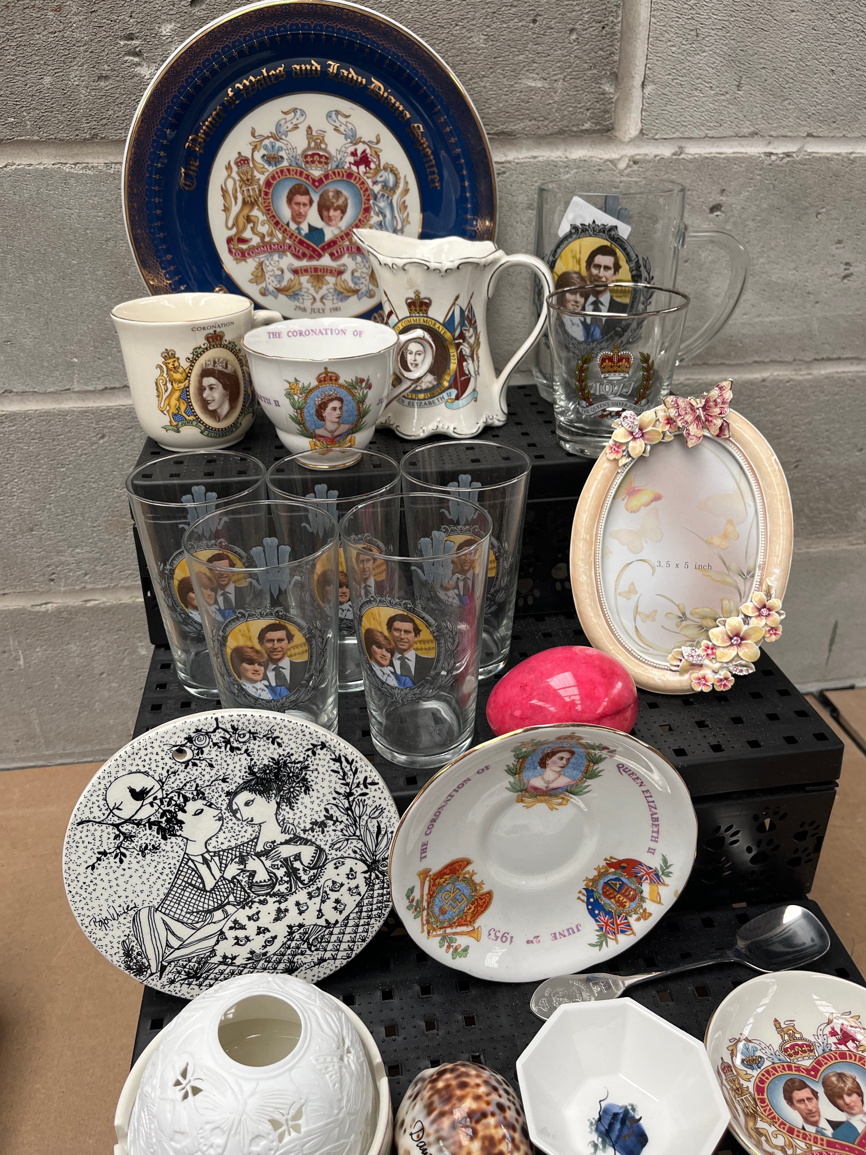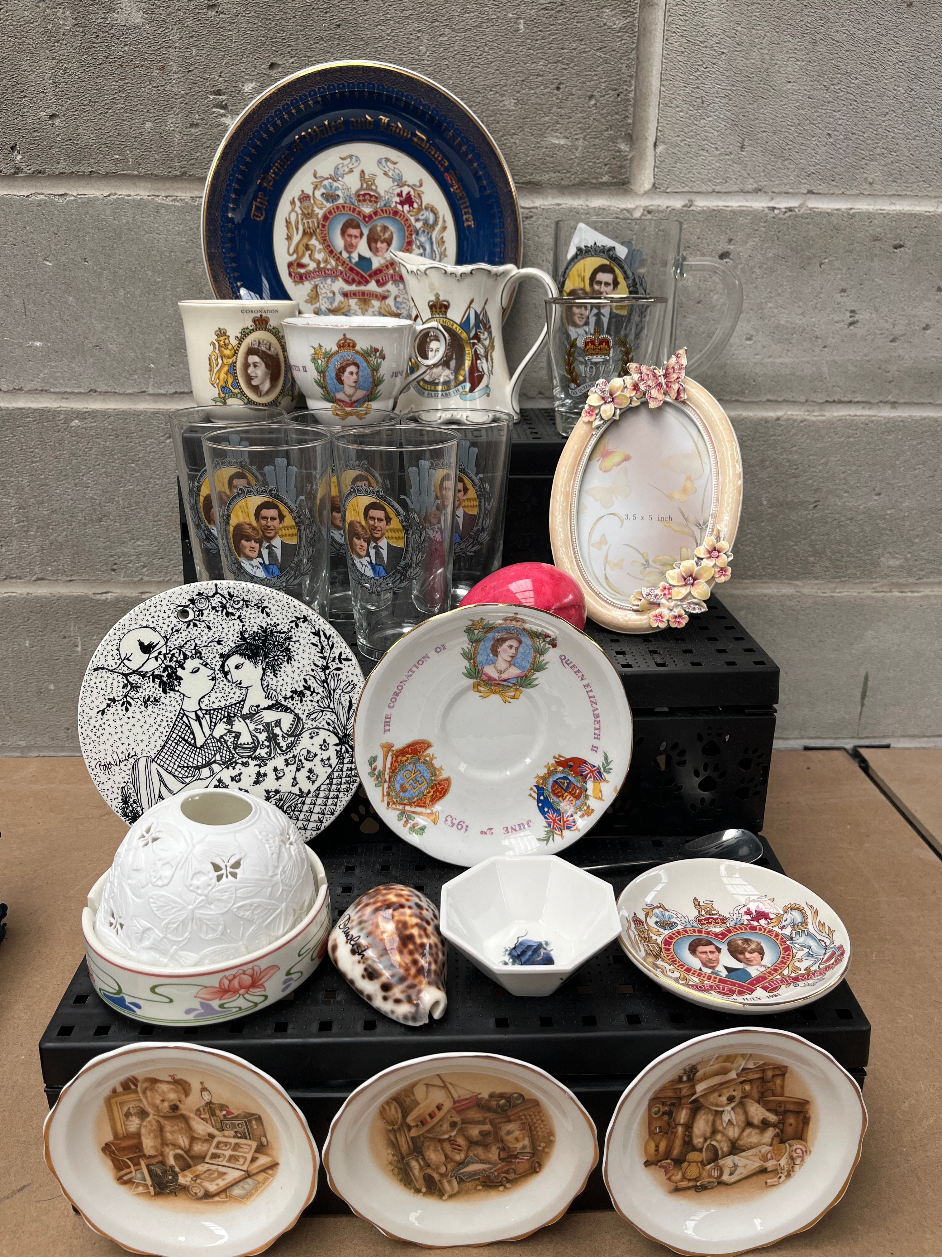 This lot features a Royal Stafford bone china teacup and saucer commemorating the Coronation of H.M. Queen Elizabeth II on June 2nd, 1953. Complementing this are two additional ceramic mugs and a ceramic jug, also celebrating the 1953 Coronation of Queen Elizabeth II. The collection further includes two plates commemorating “The Marriage of H.R.H. The Prince of Wales & Lady Diana Spencer 29th July 1981,” one large blue plate and one smaller decorative plate. A collection of glassware depicting H.R.H. The Prince of Wales & Lady Diana Spencer is also present. Also included are a cream-colored, floral-embellished oval photo frame, a black and white stylized ceramic plate, a white pierced lidded bowl, a natural seashell, a small octagonal bowl, and three small scalloped-edge ceramic dishes with scenes of teddy bears.